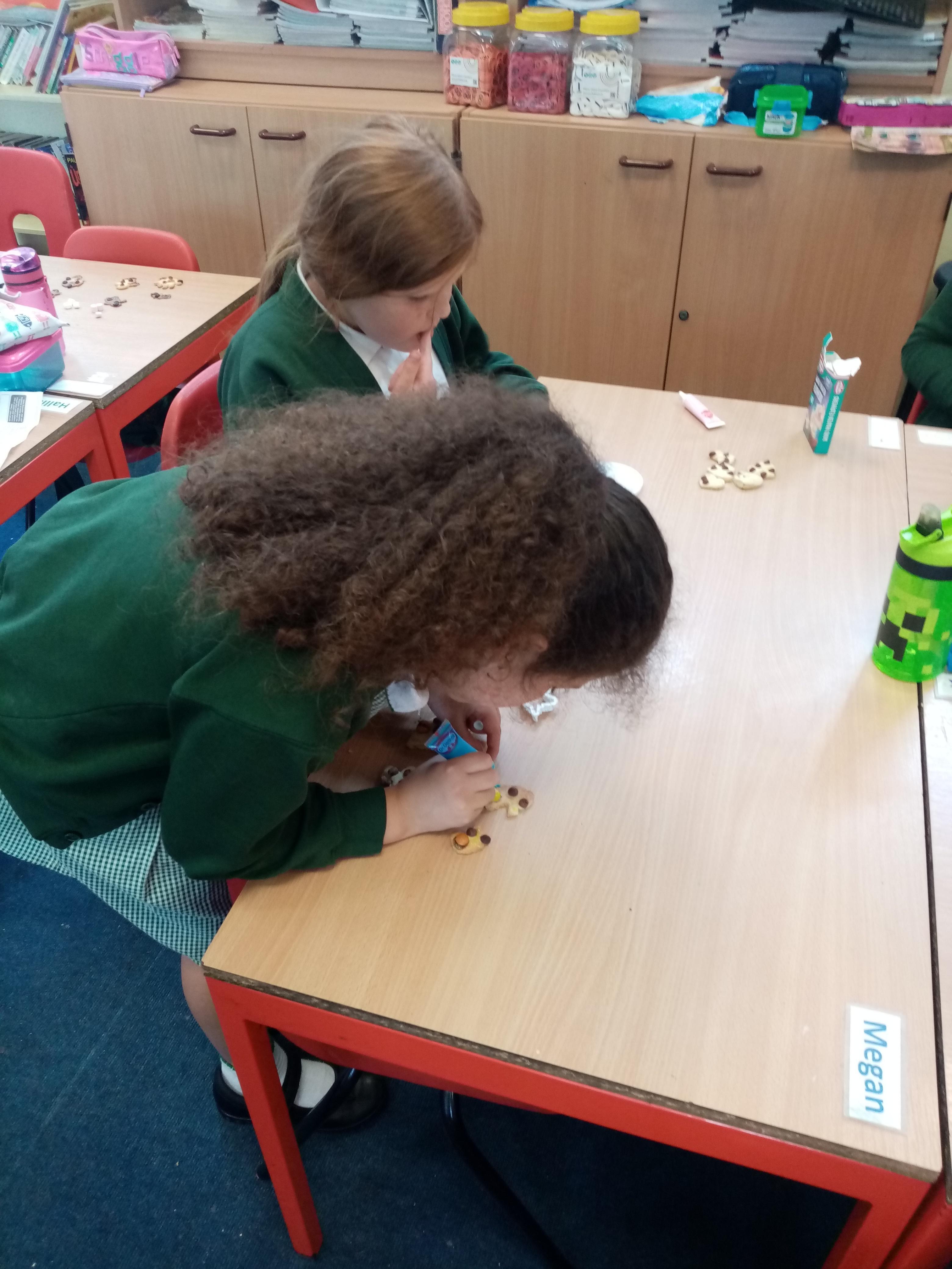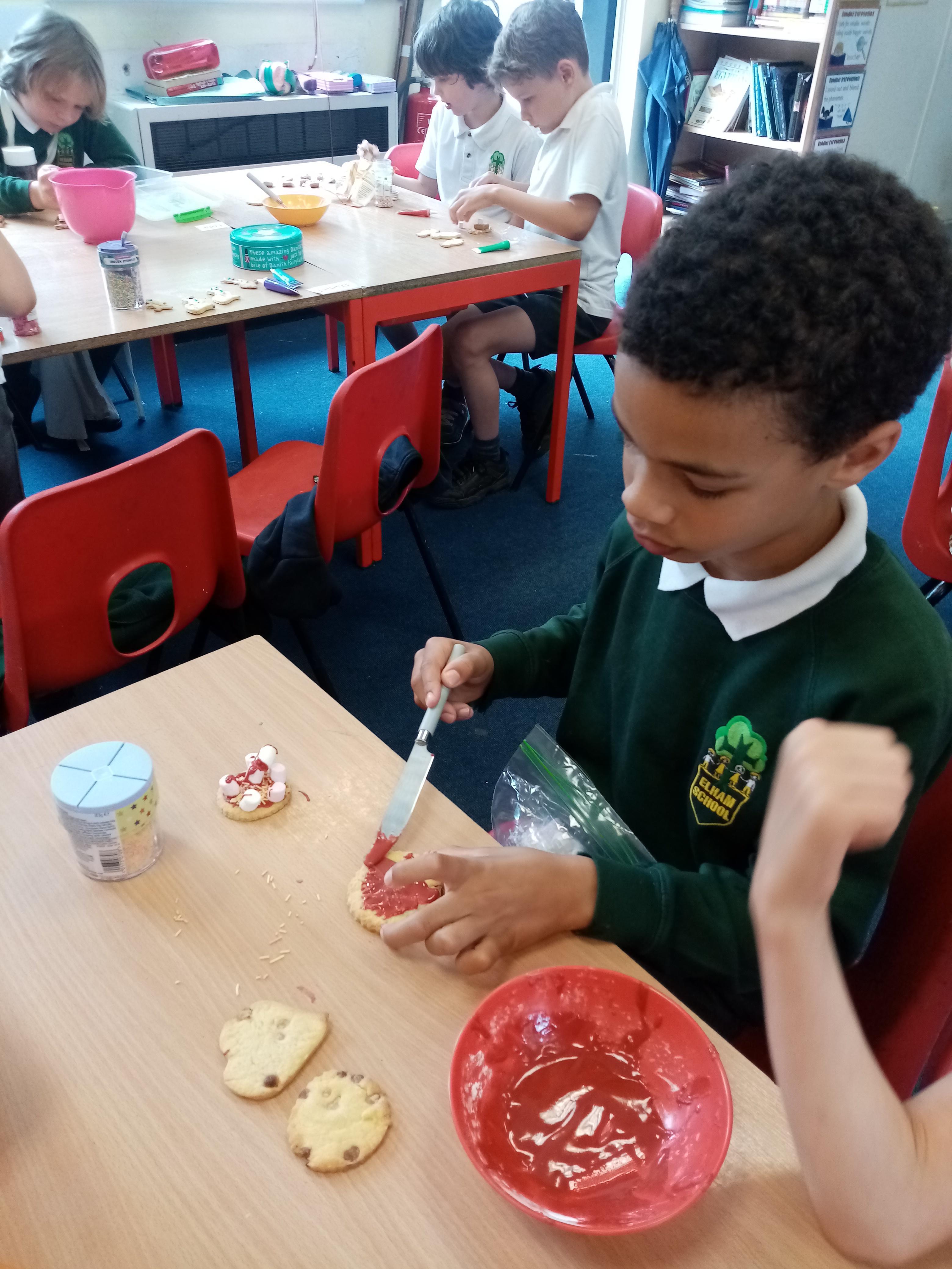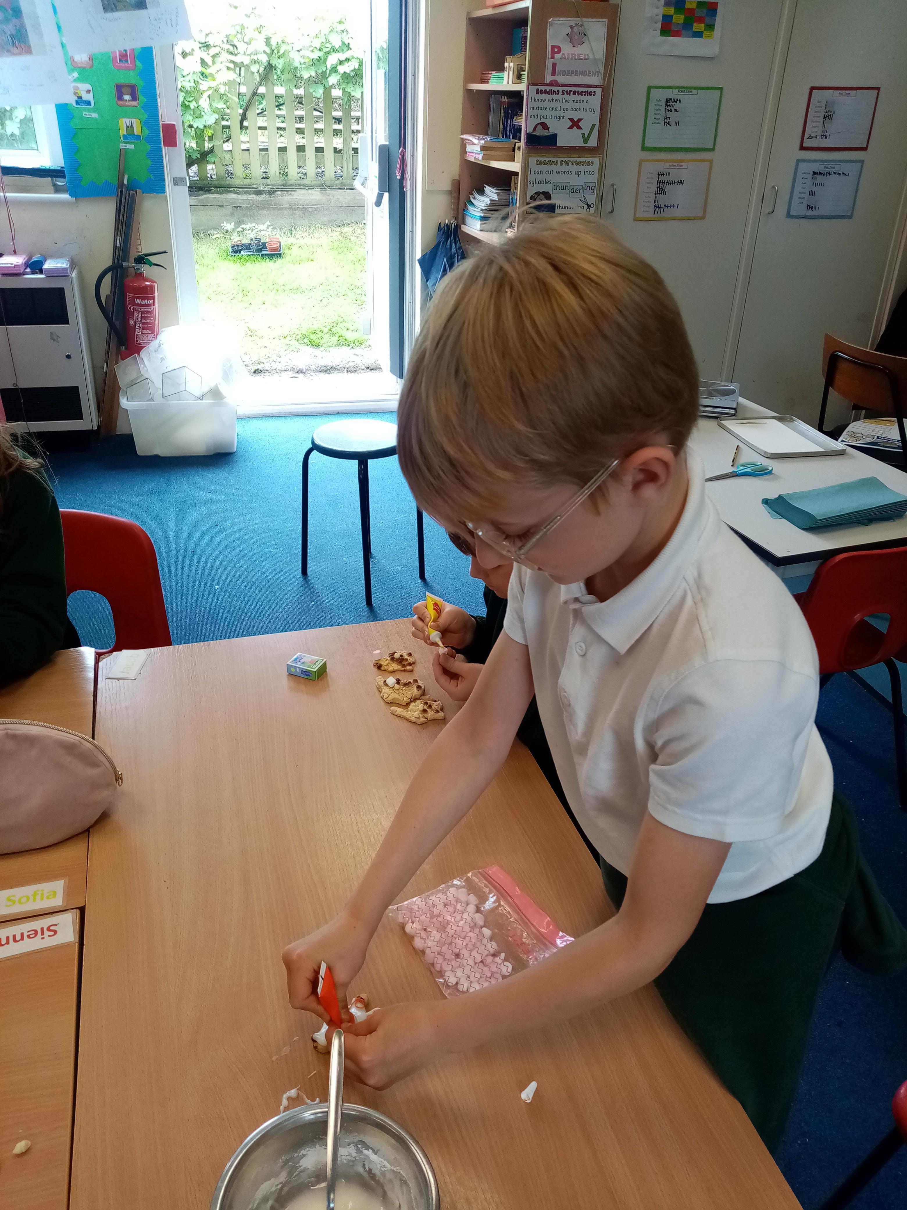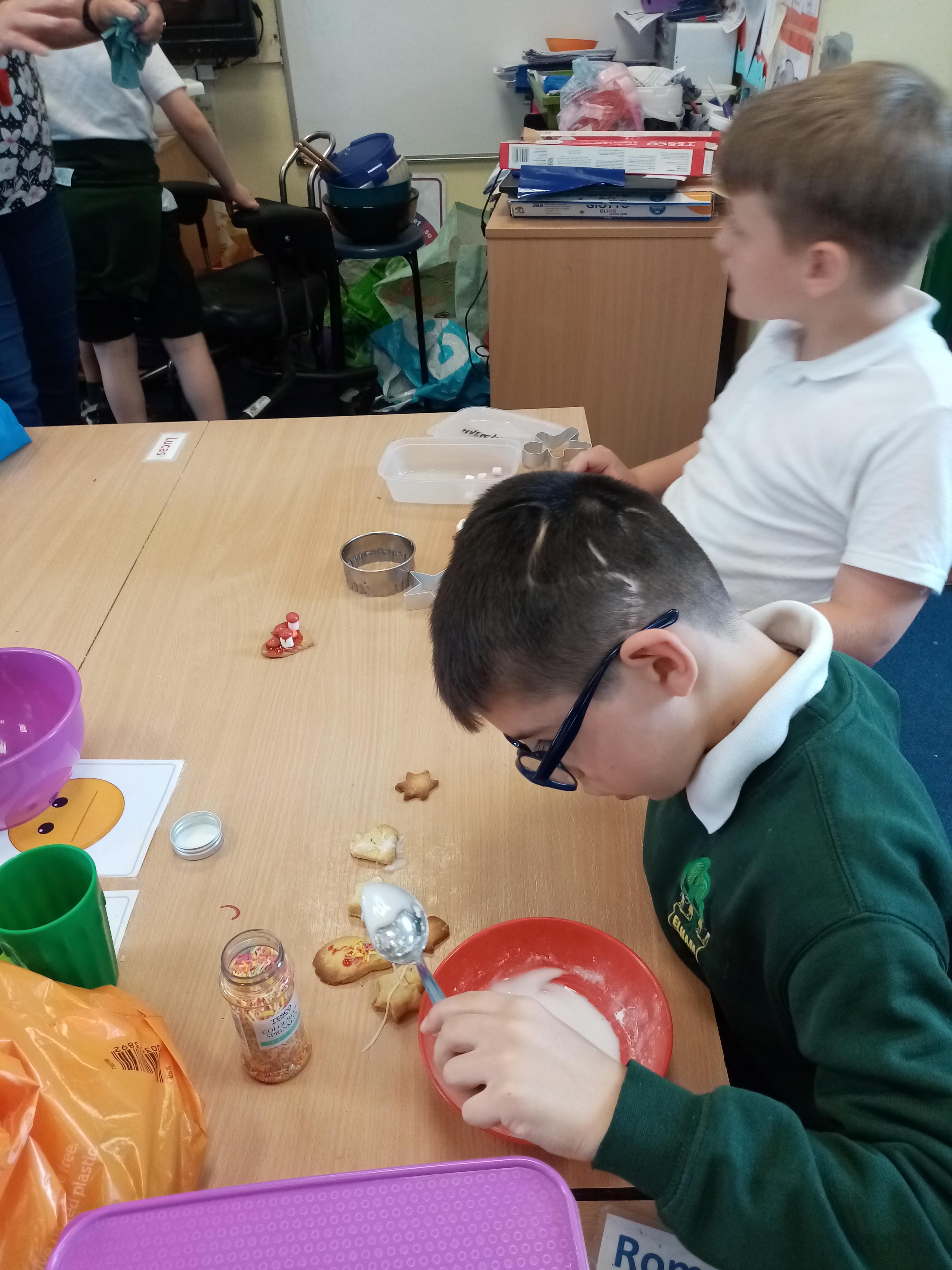 After lunch we then decorated our biscuits.  Some of us had never seen icing sugar before!  We used dyes to create different coloured  icing, and used many tasty toppings such as marshmallows and fudge!  Once we had completed our biscuits we evaluated their appearance, taste and the overall production process.  We then got to taste 2 other people's biscuits and commented on our opinions of them.  There were some great designs, including cats, lamas, penguins and Pokeballs!  Many of the biscuits were very lavish; covered in bright colours and textures.