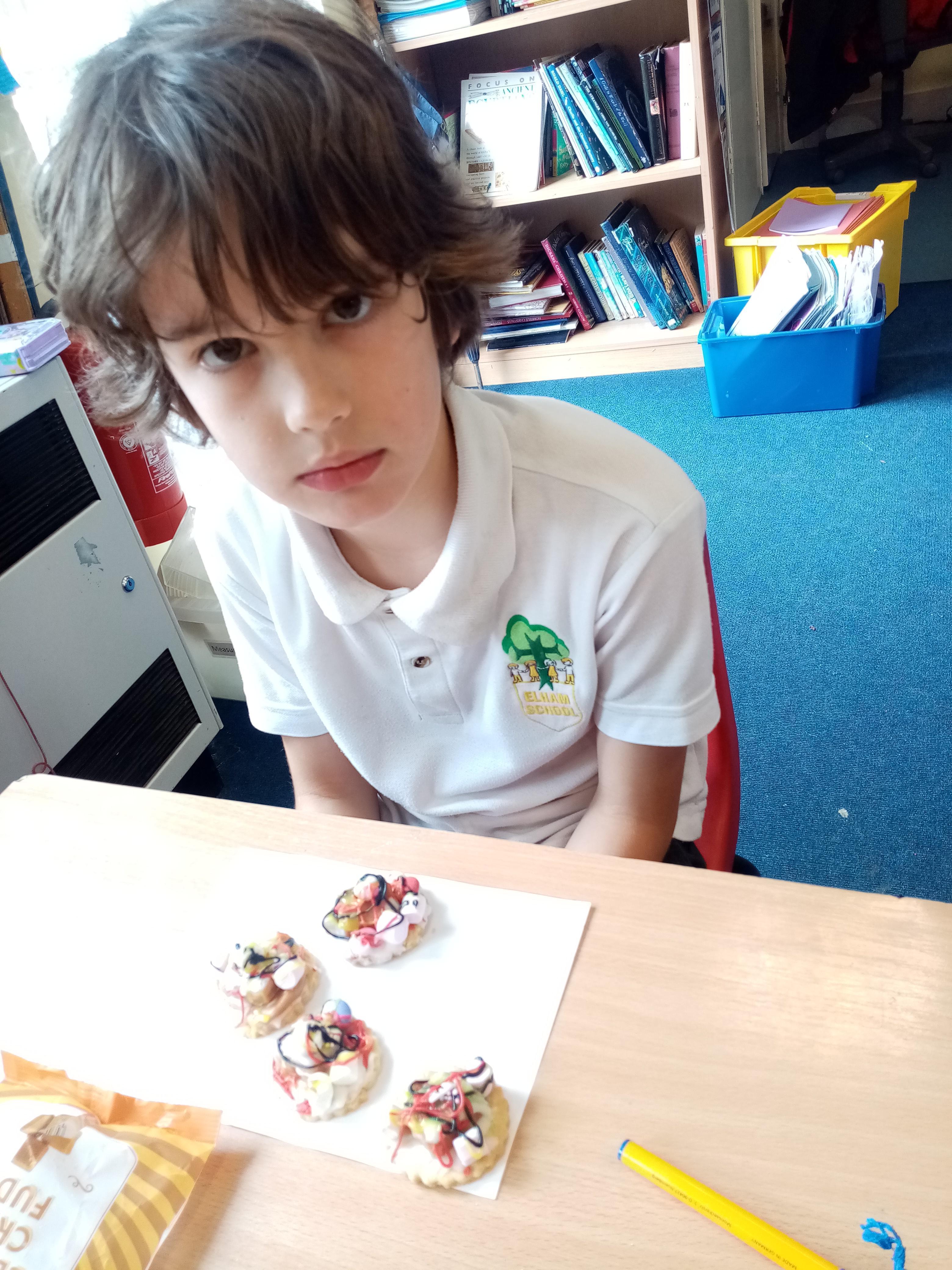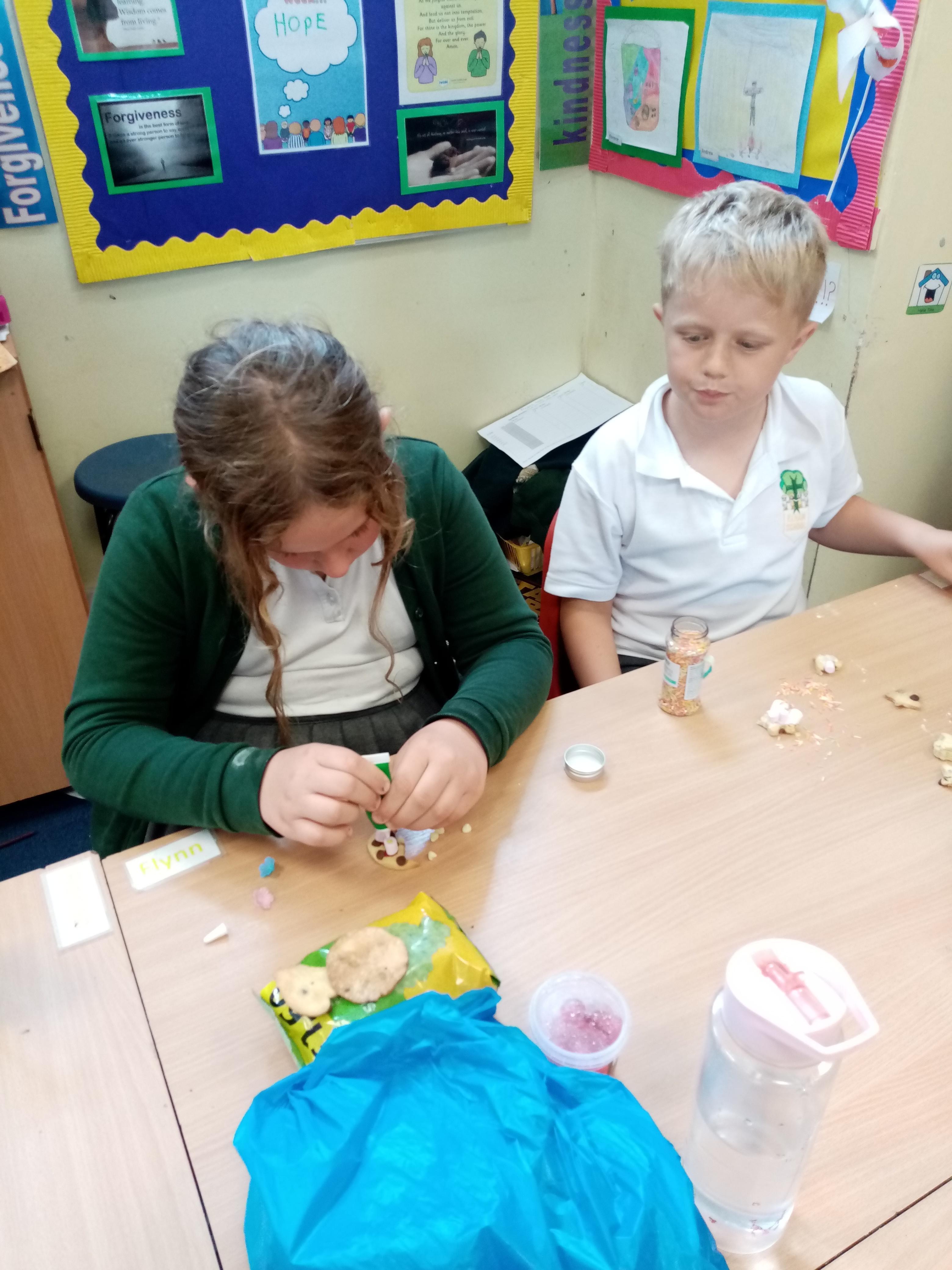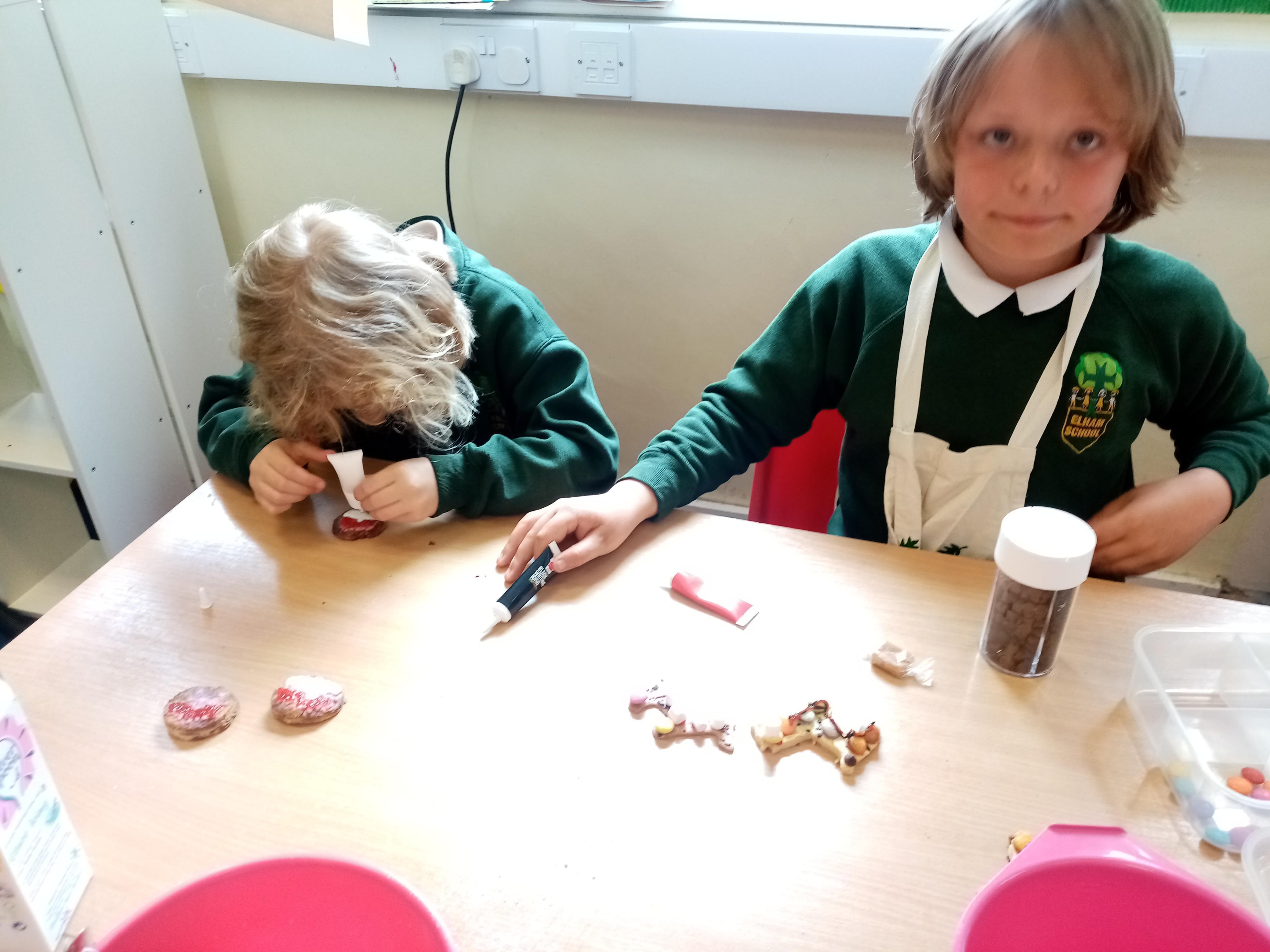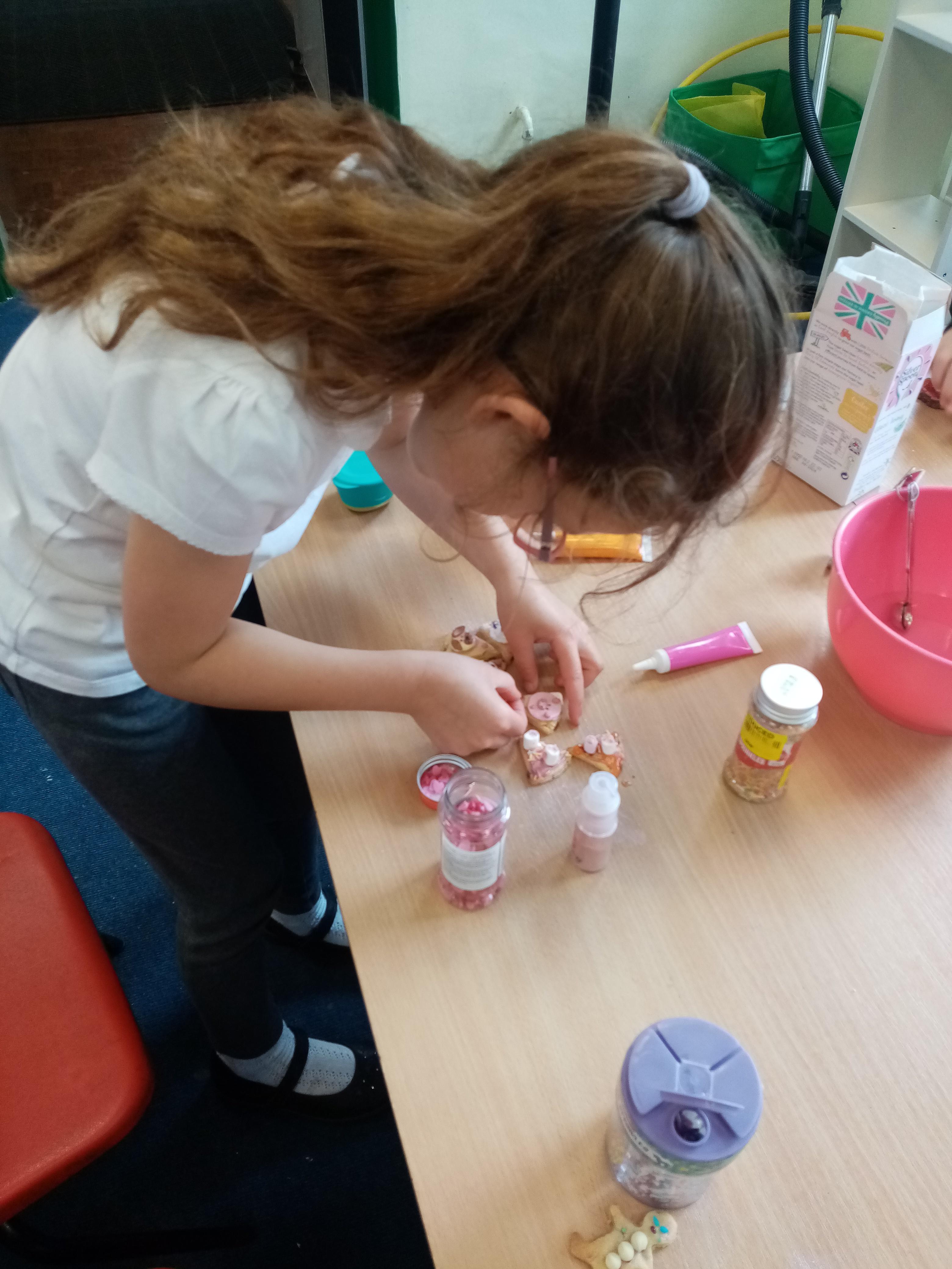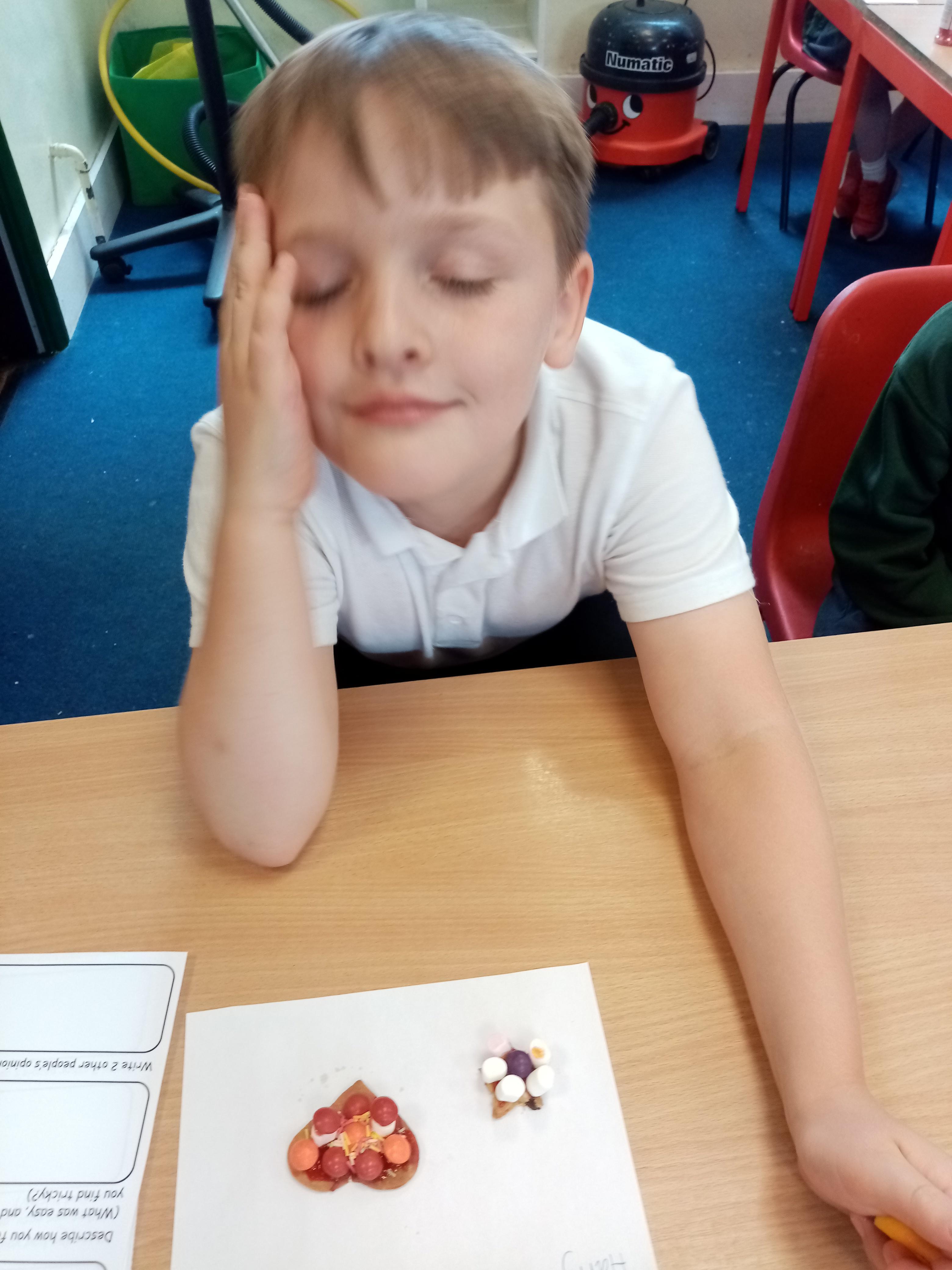 After lunch we then decorated our biscuits.  Some of us had never seen icing sugar before!  We used dyes to create different coloured  icing, and used many tasty toppings such as marshmallows and fudge!  Once we had completed our biscuits we evaluated their appearance, taste and the overall production process.  We then got to taste 2 other people's biscuits and commented on our opinions of them.  There were some great designs, including cats, lamas, penguins and Pokeballs!  Many of the biscuits were very lavish; covered in bright colours and textures.