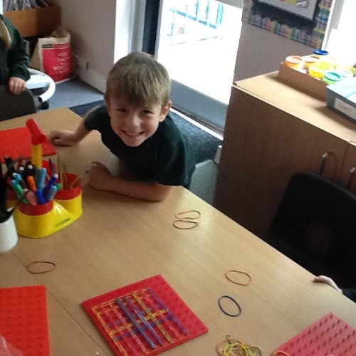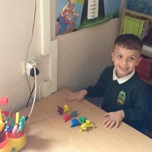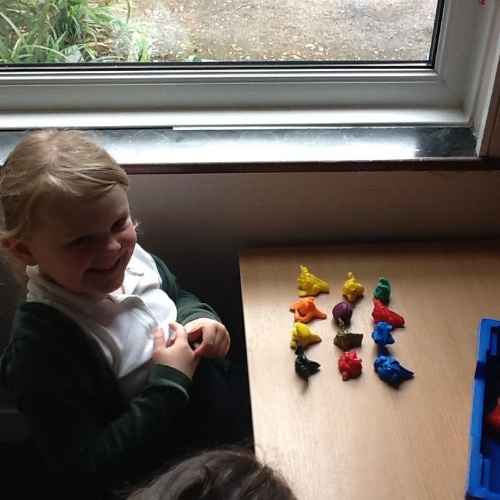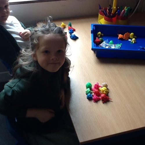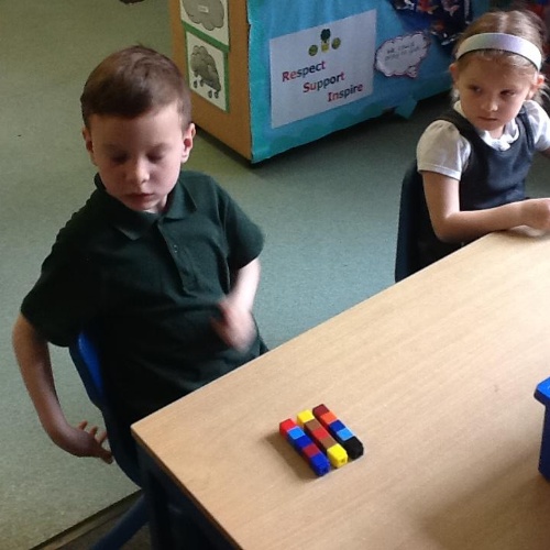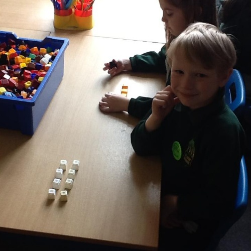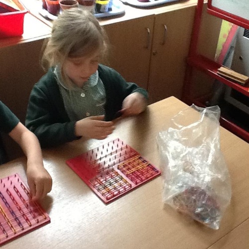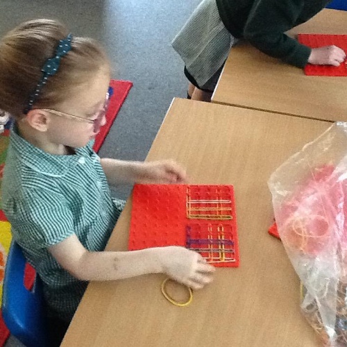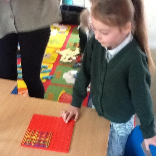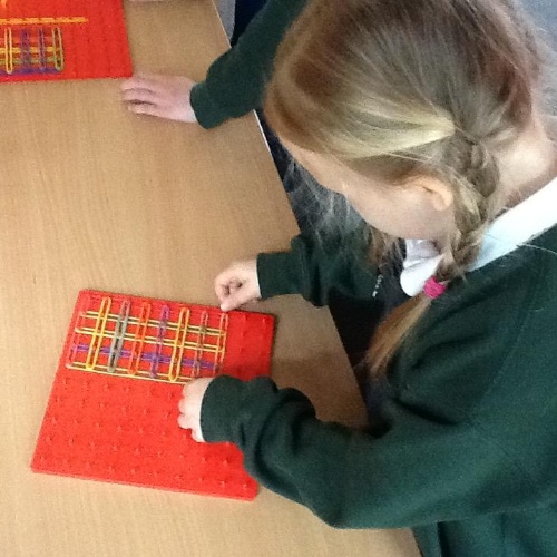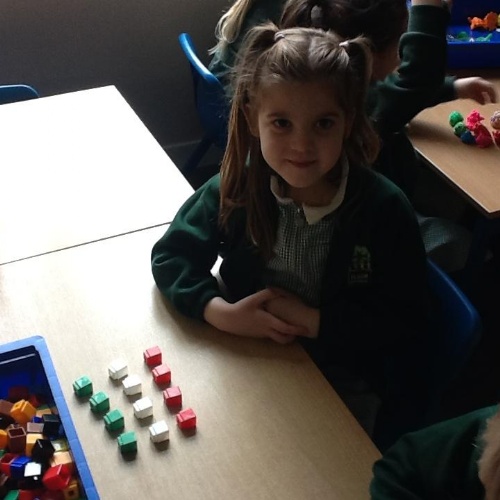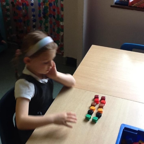 We are beginning to feel more confident when identifying the difference between rows and columns. We went on a search outside for 'arrays' that we could see in the environment. We came back to class and had a go at making our own arrays, some of us are still getting a little muddled between a column and a row.