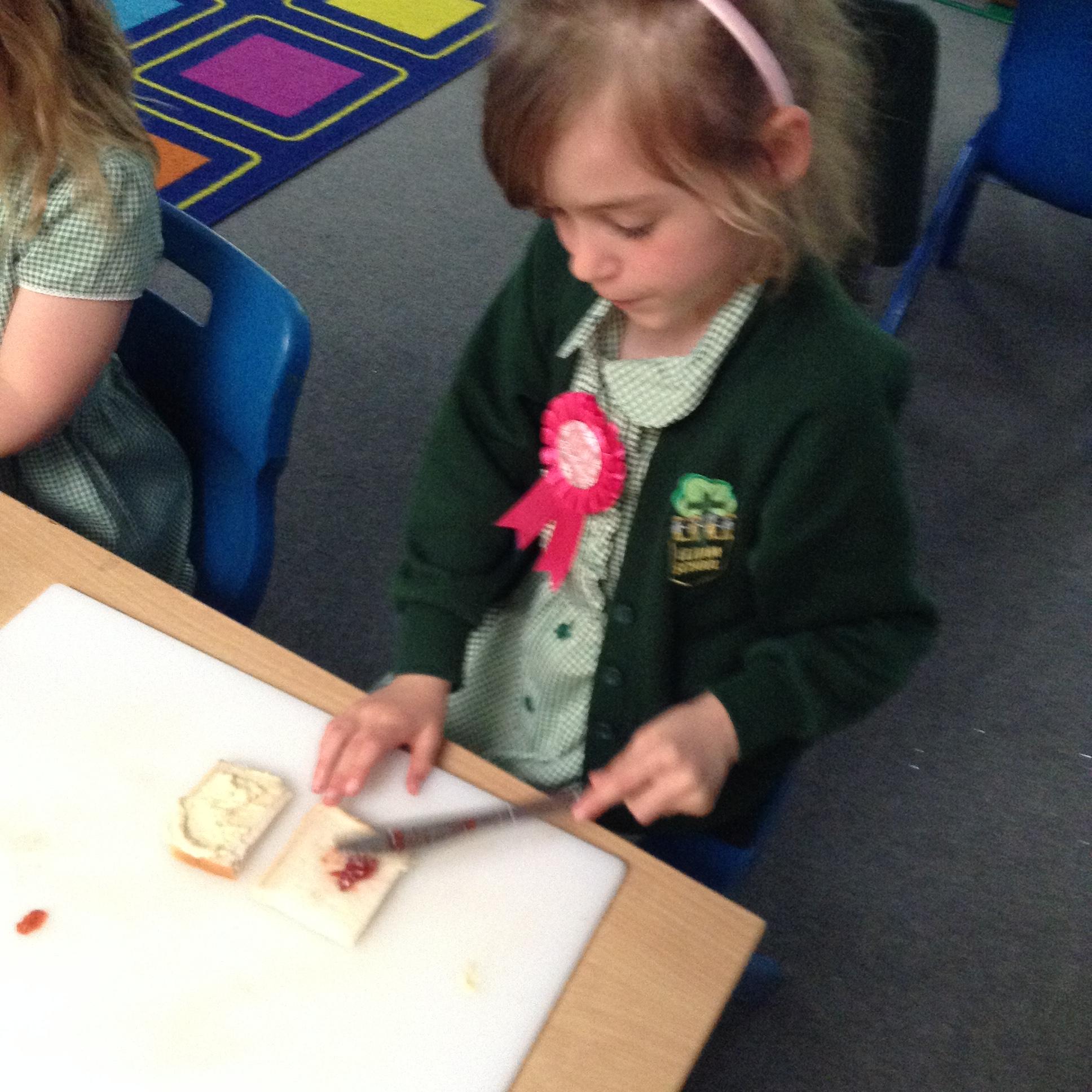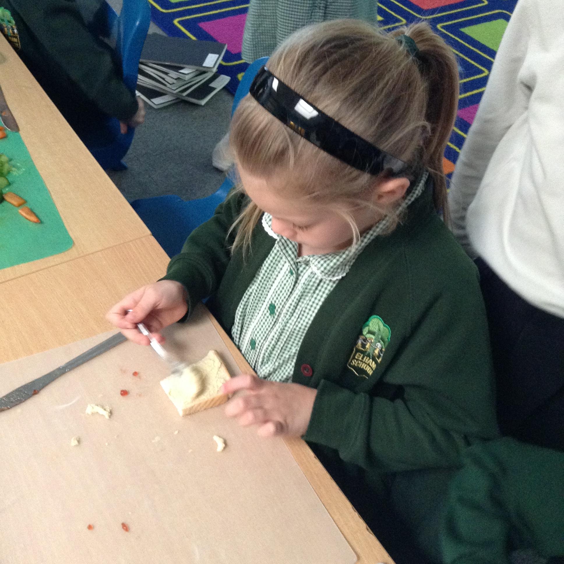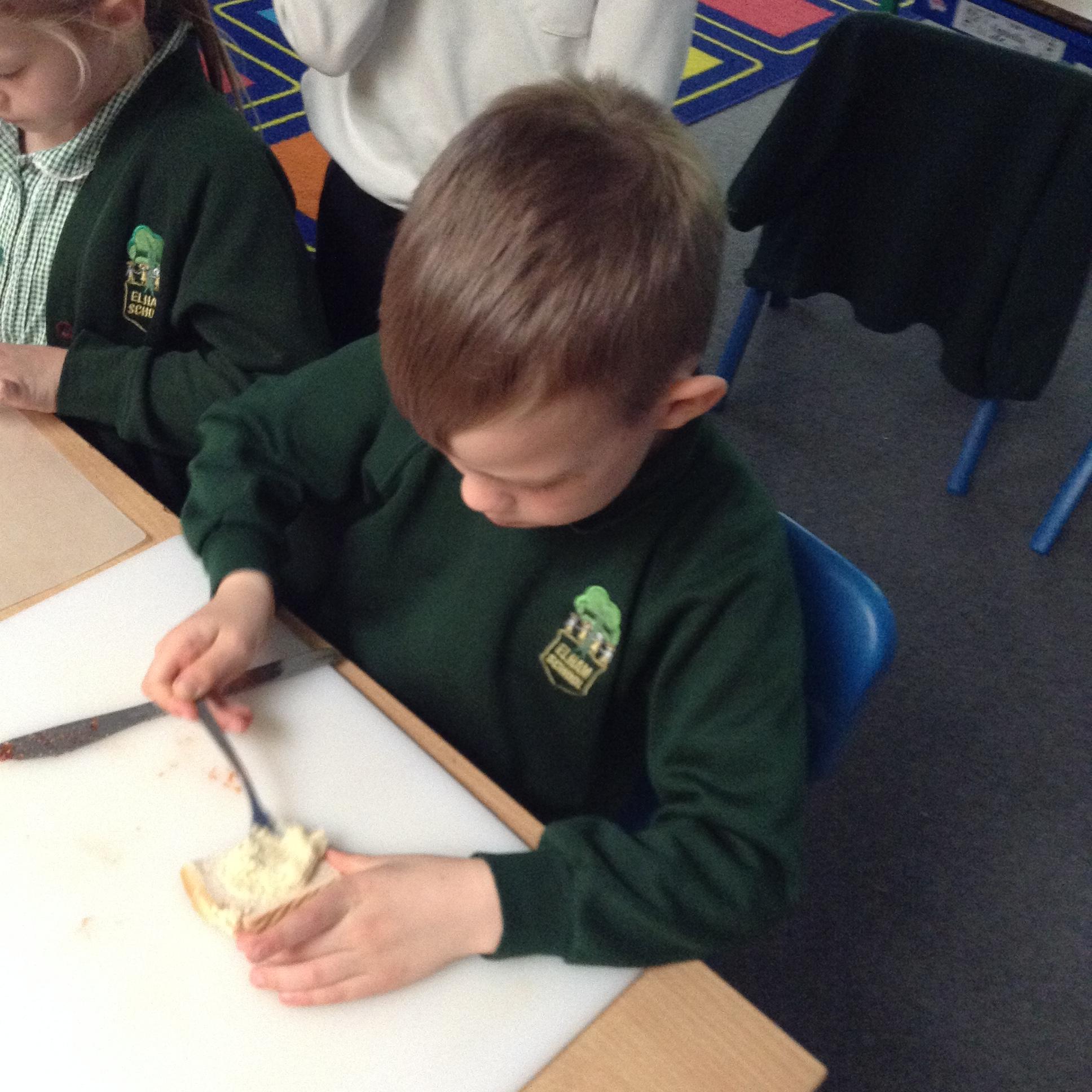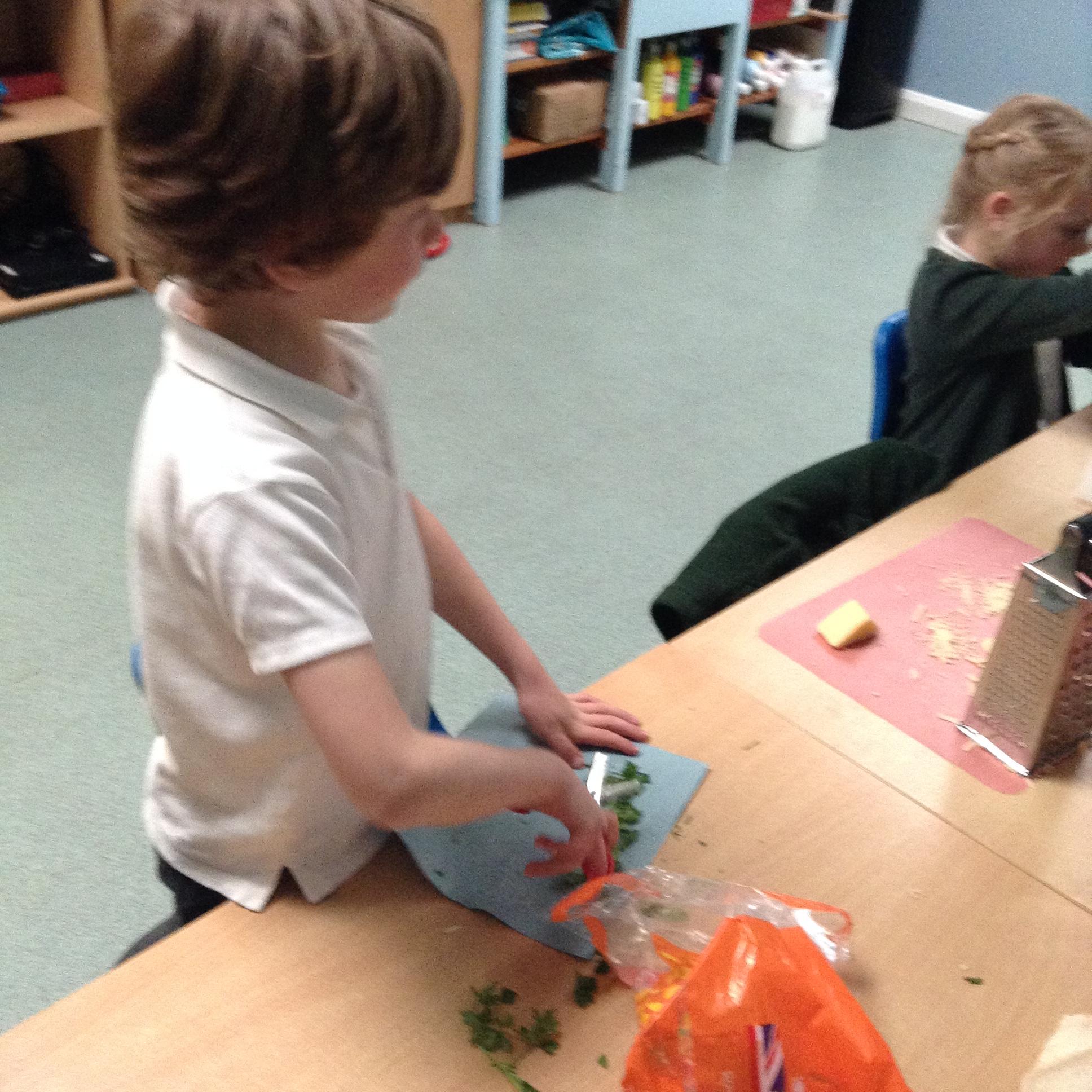 The children have been identifying appropriate pieces of equipment to prepare food. They then had a go at cutting, snipping, grating and spreading a variety of foods.
