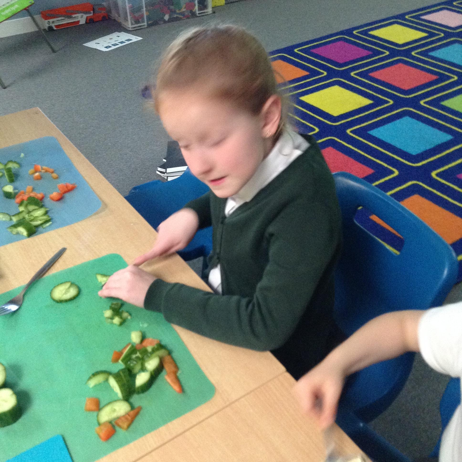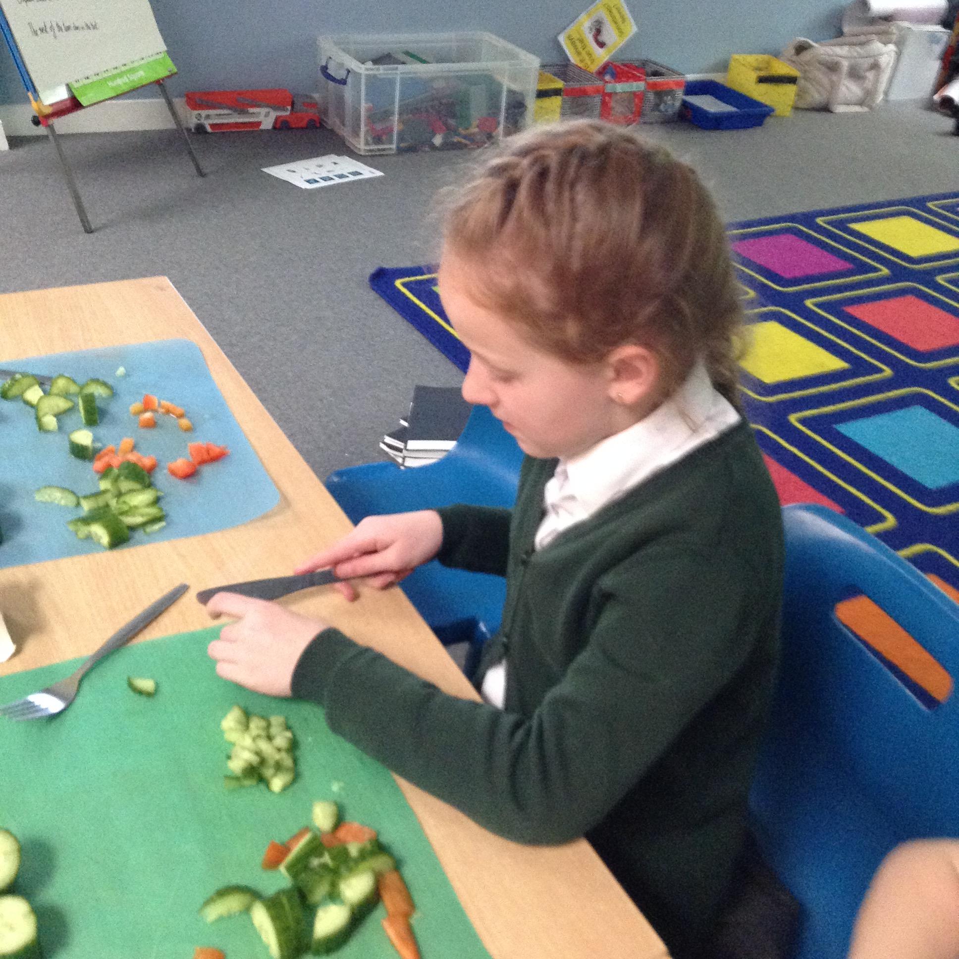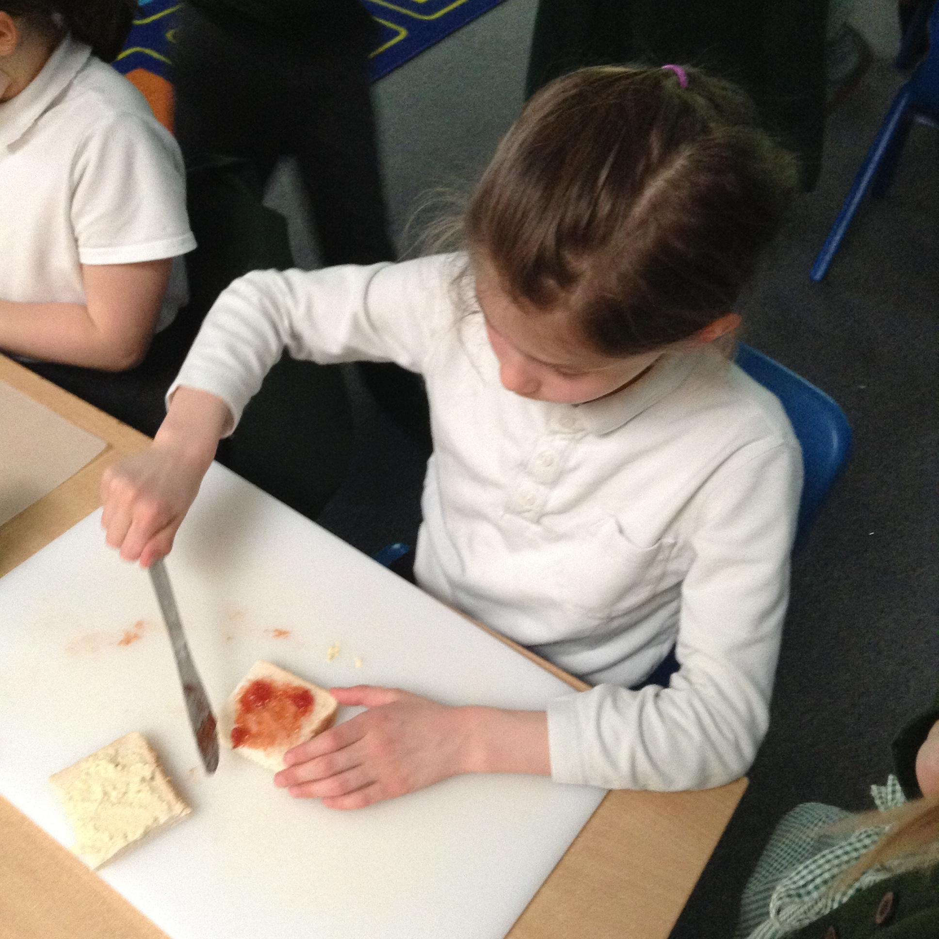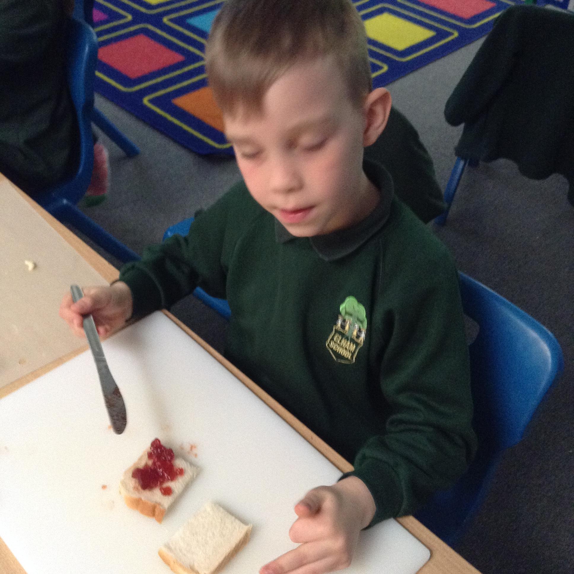 The children have been identifying appropriate pieces of equipment to prepare food. They then had a go at cutting, snipping, grating and spreading a variety of foods.