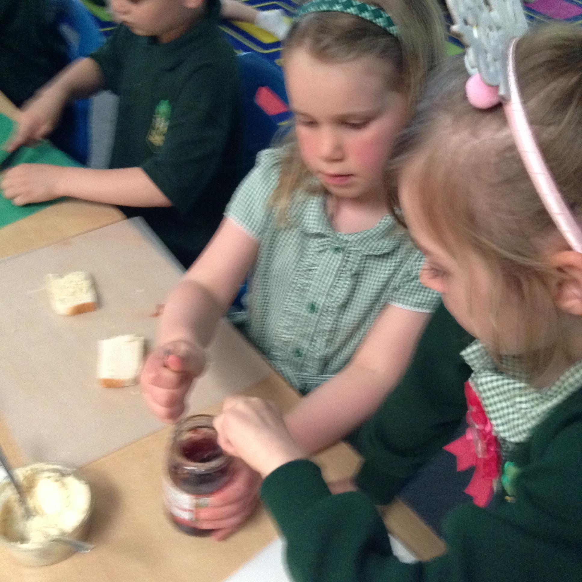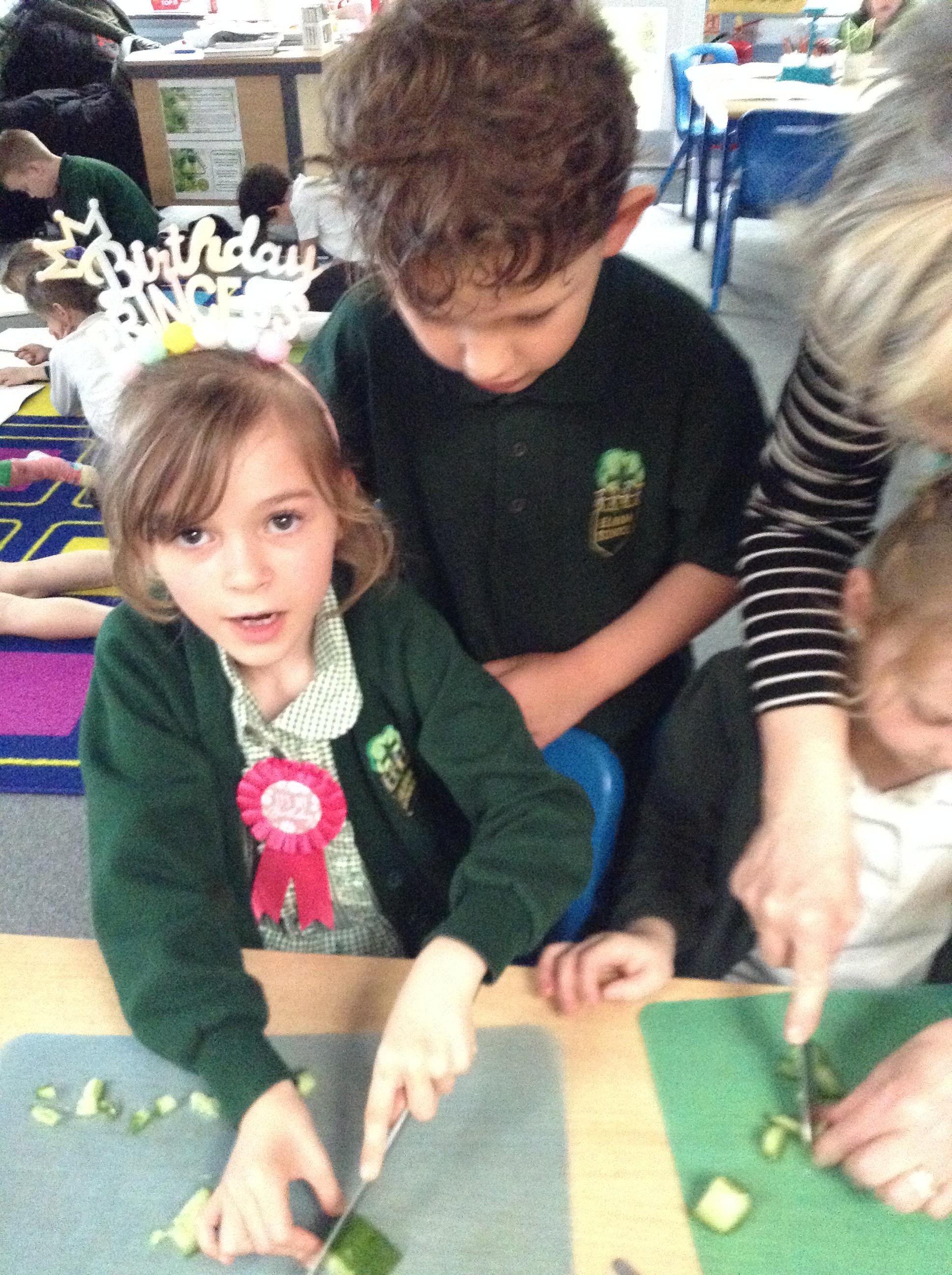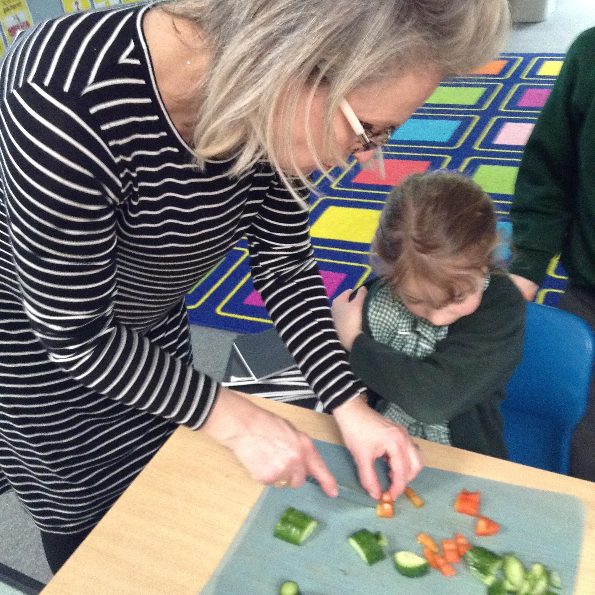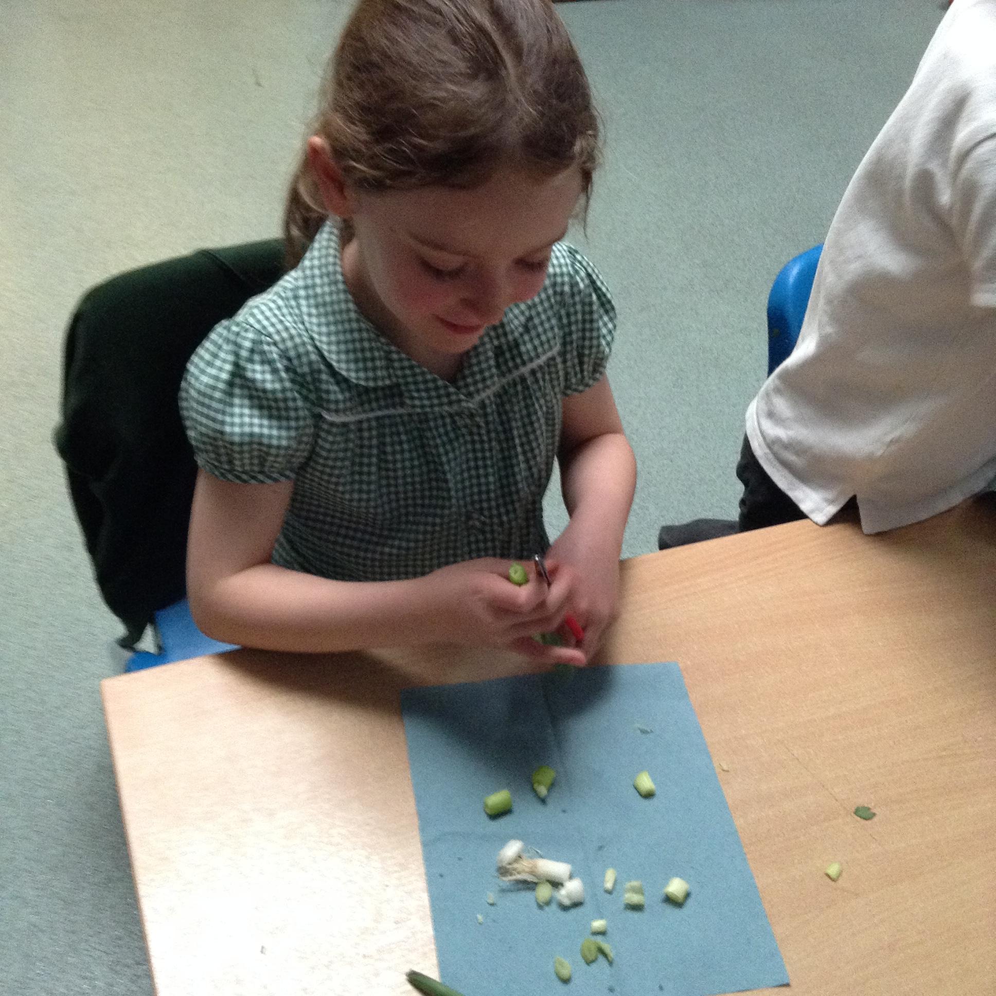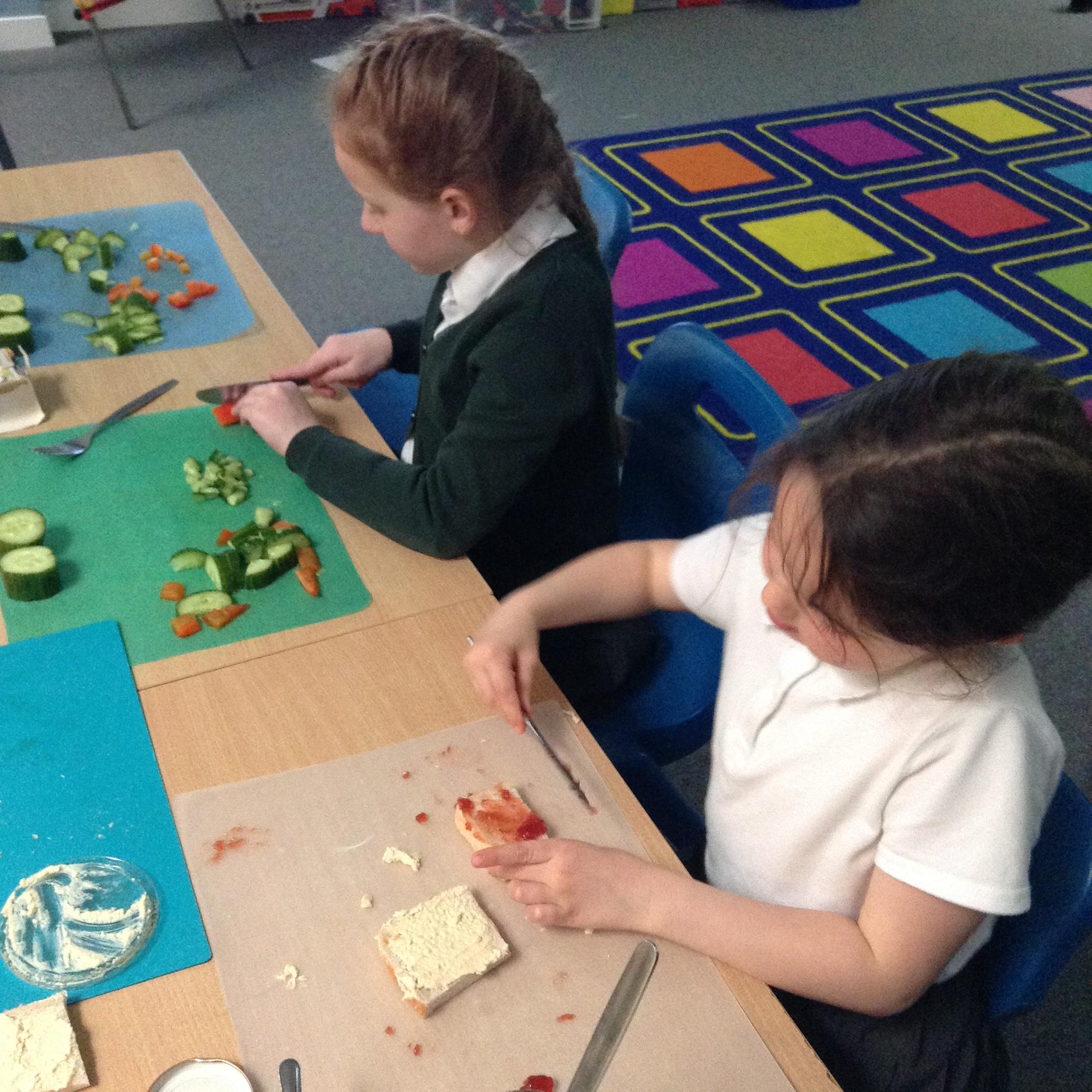 The children have been identifying appropriate pieces of equipment to prepare food. They then had a go at cutting, snipping, grating and spreading a variety of foods.