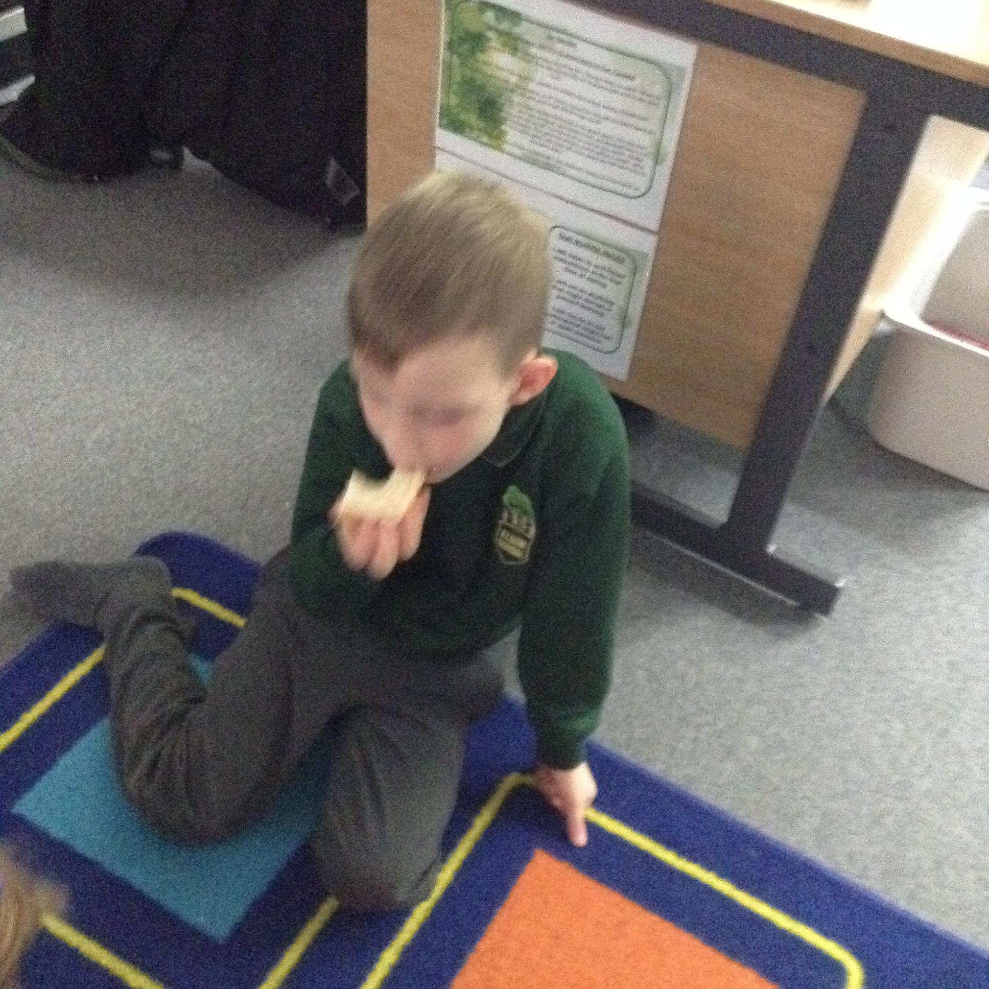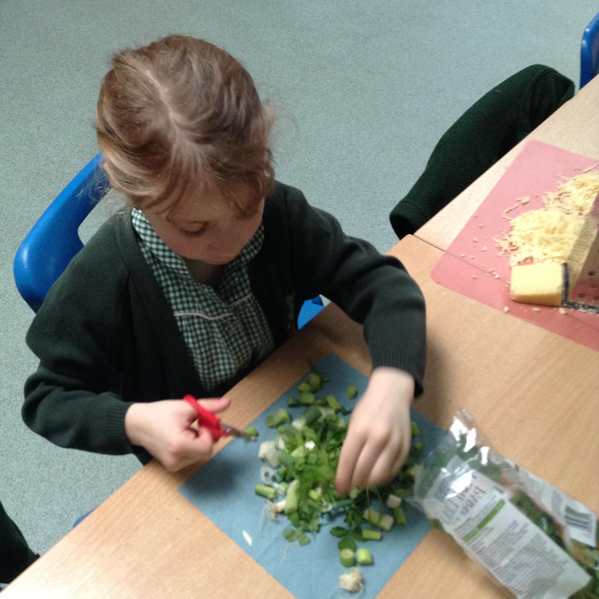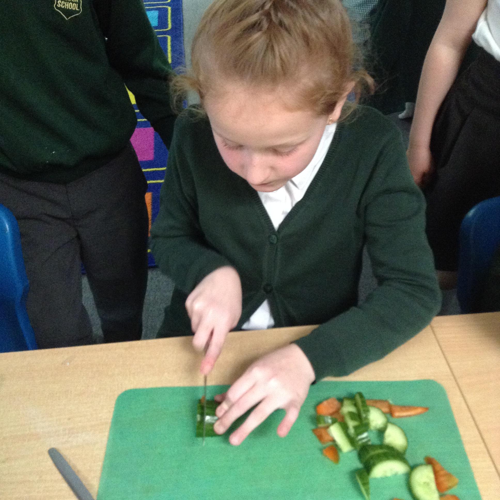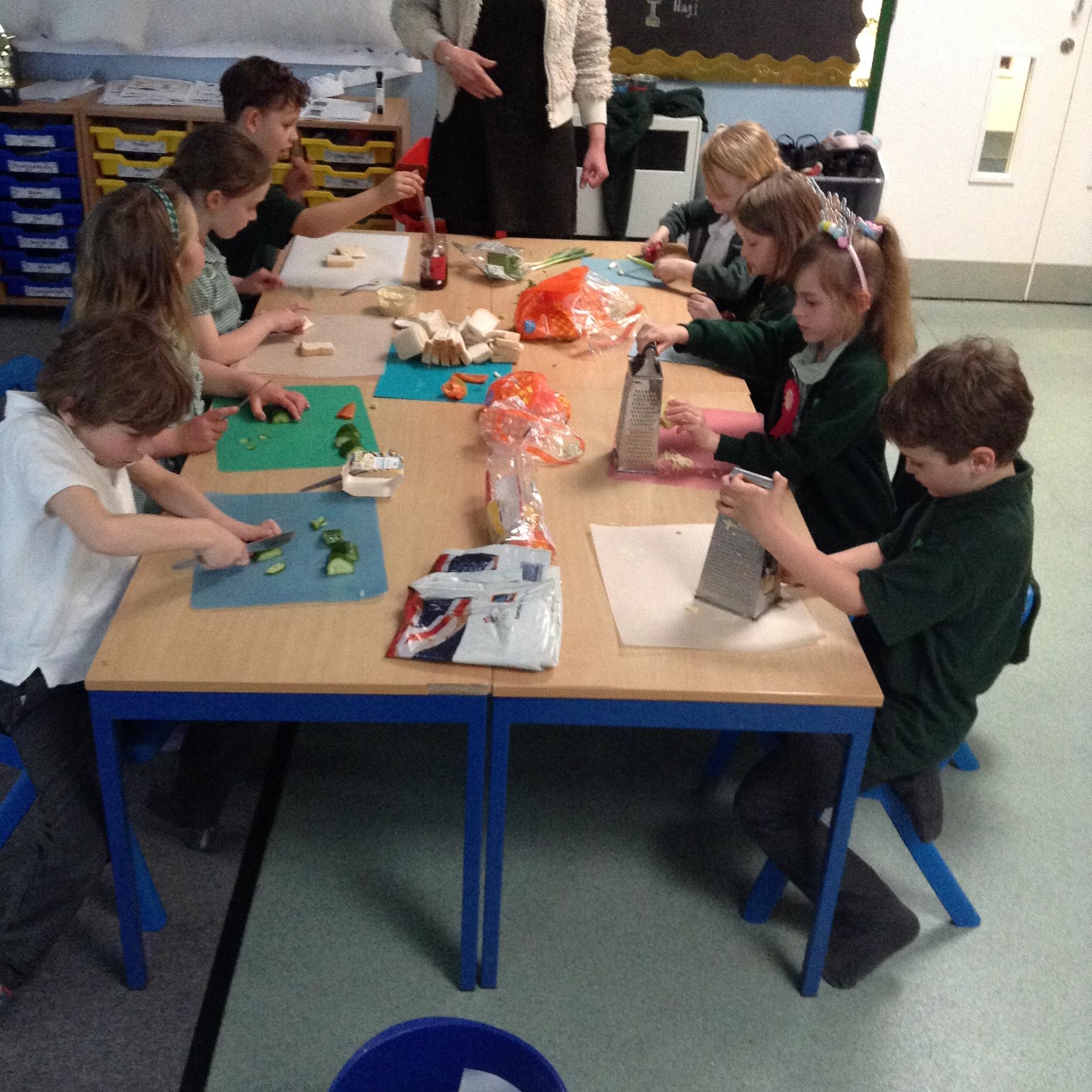 The children have been identifying appropriate pieces of equipment to prepare food. They then had a go at cutting, snipping, grating and spreading a variety of foods.