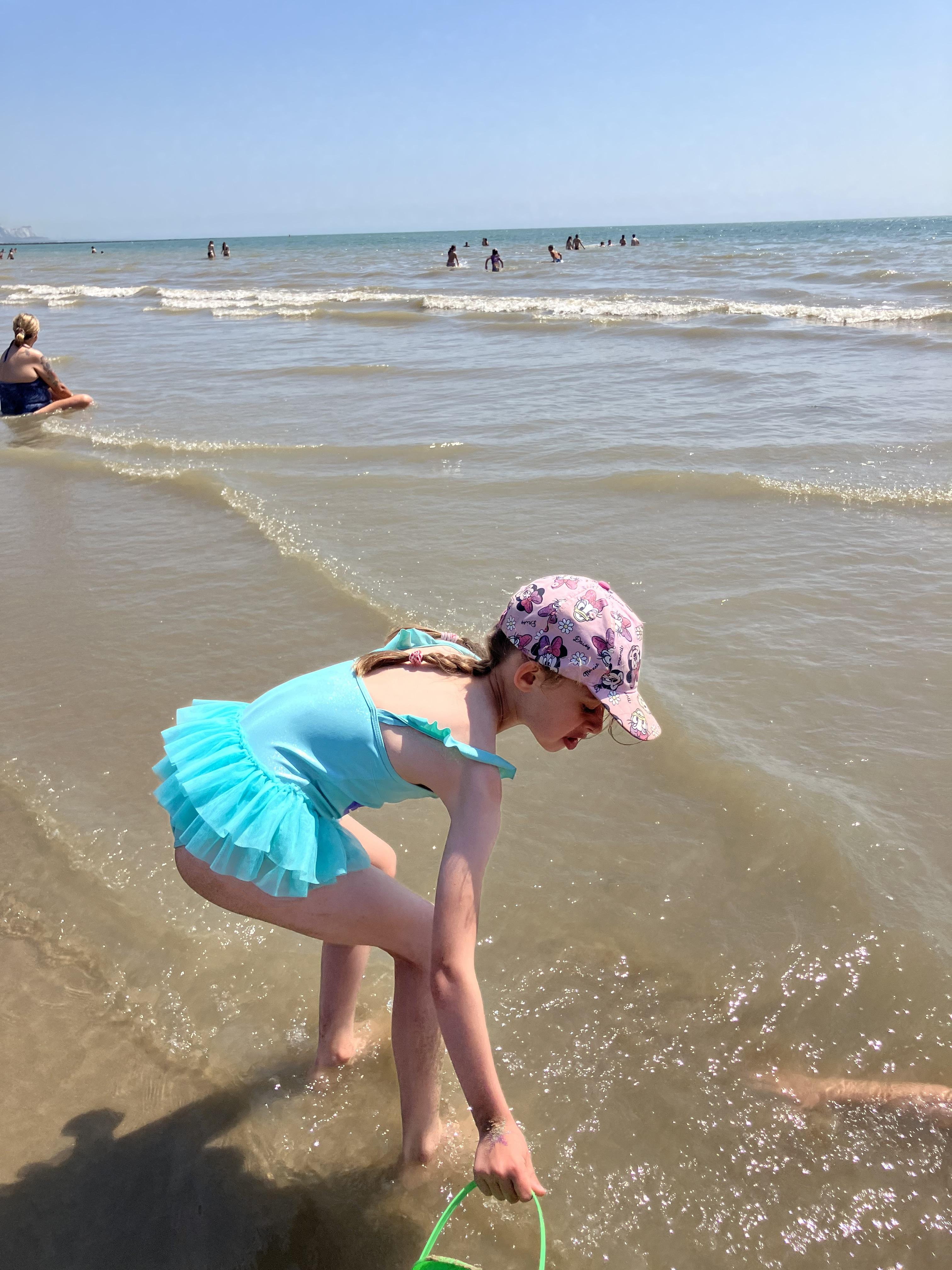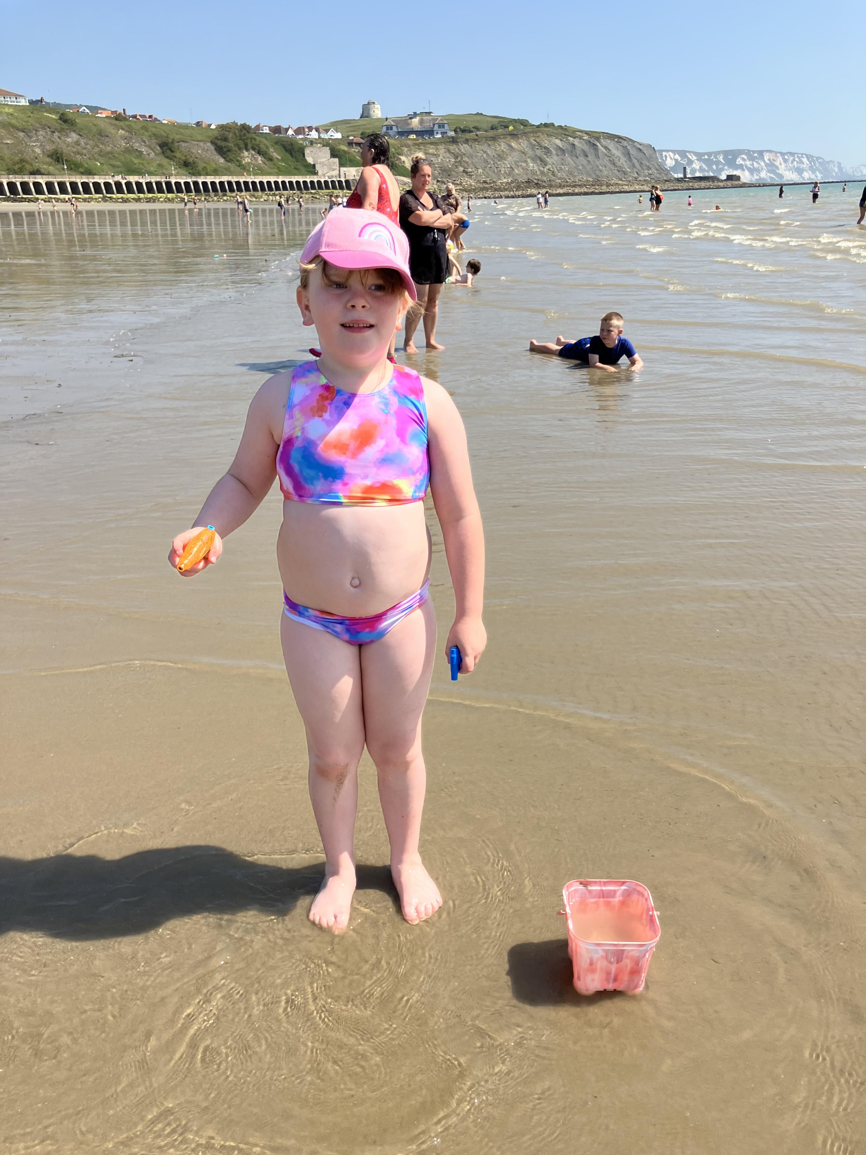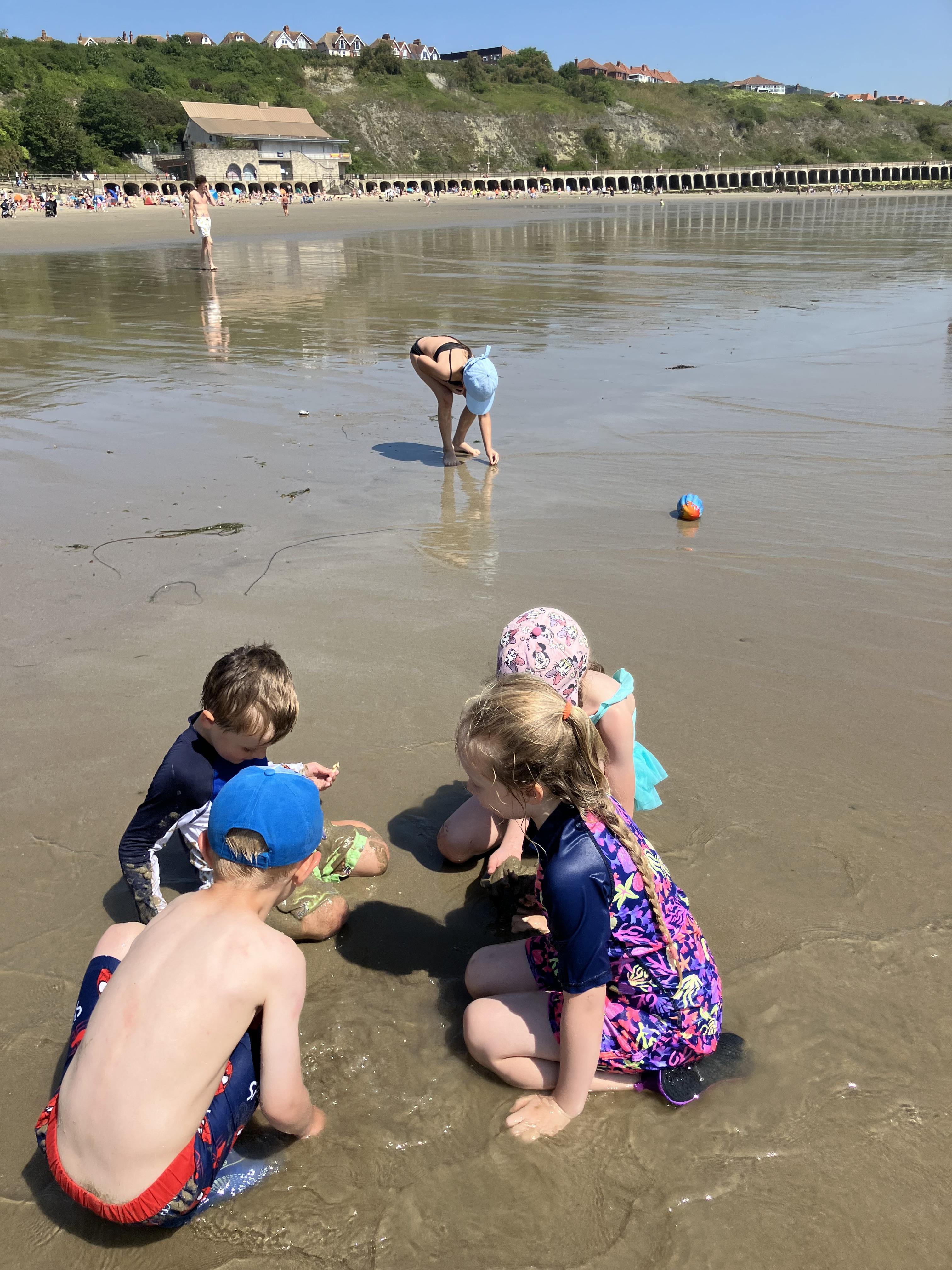 We went to the beach yesterday and we had jelly babies from Miss Knight and Ms Shepherd and we went on the top of the bus, even at the end of the trip. We had ice cream and we went to paddle in the sea and we had fish and chips and sausages. We found lots of crabs. We sunbathed. We walked to Sunny Sands and we did a gynormous sandcastle.