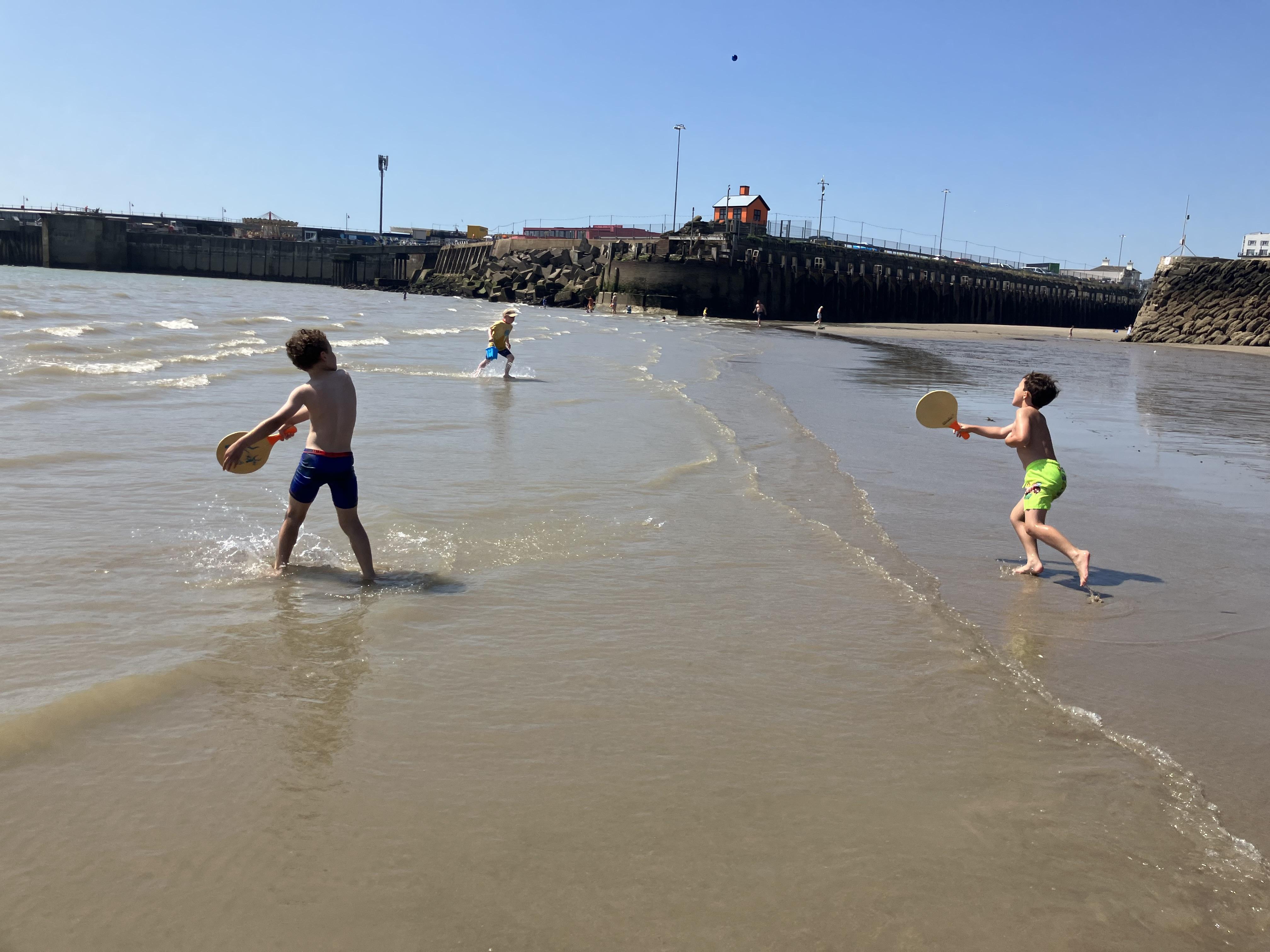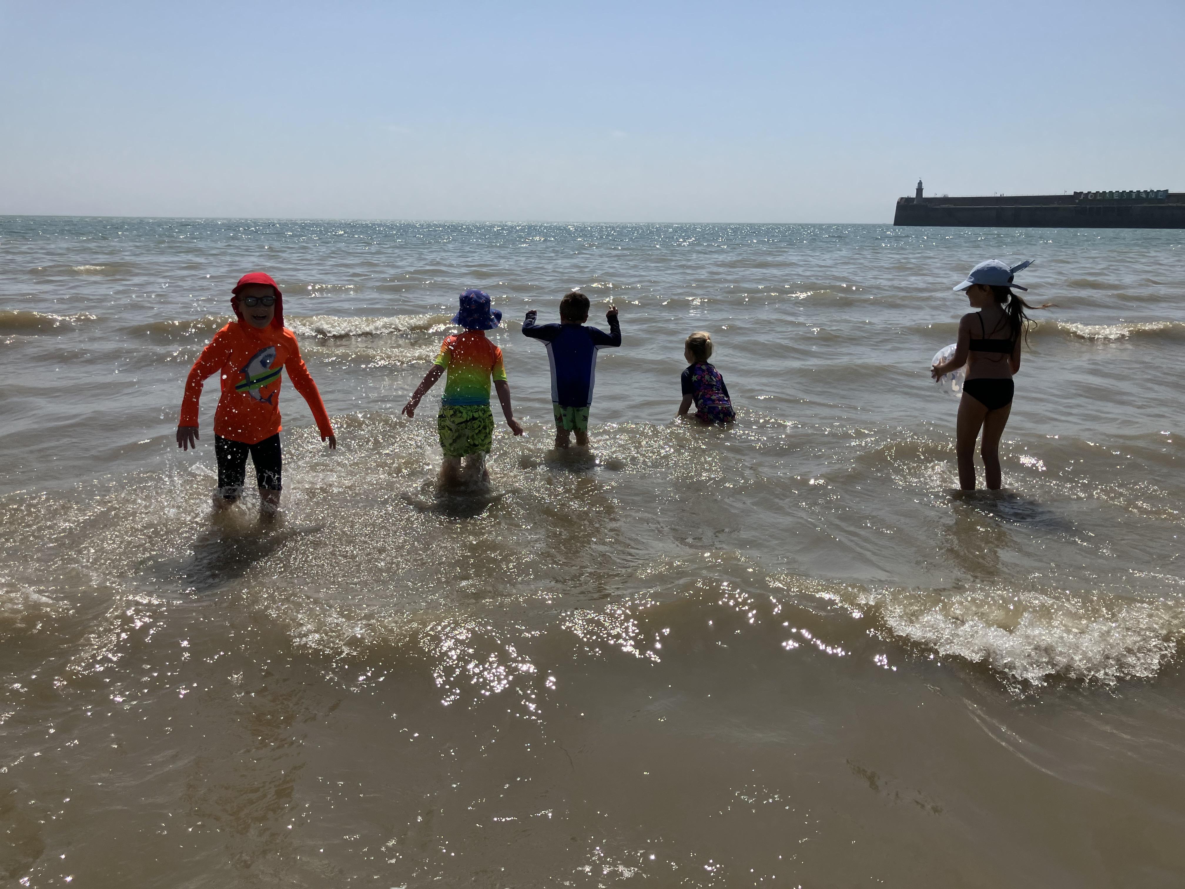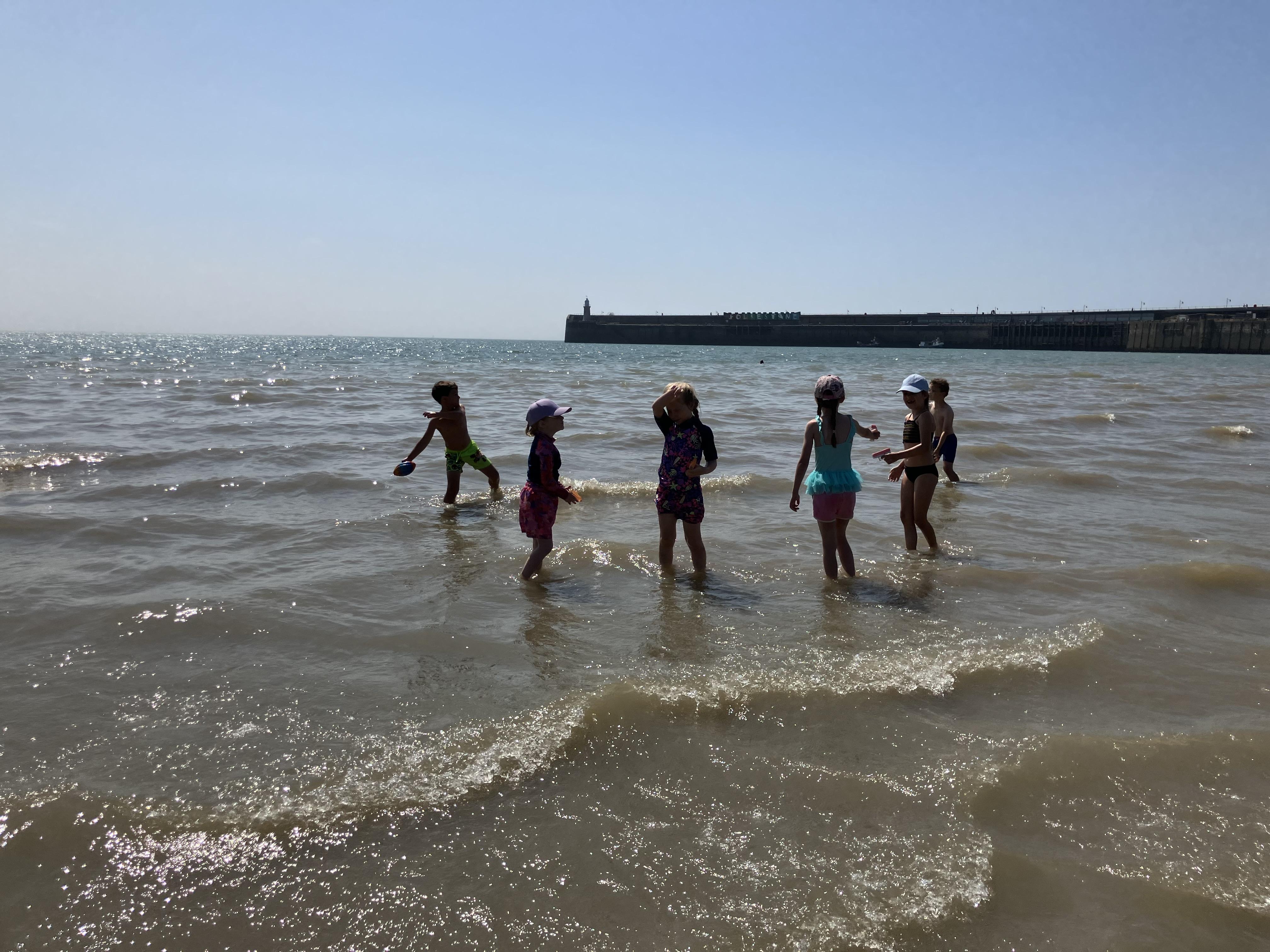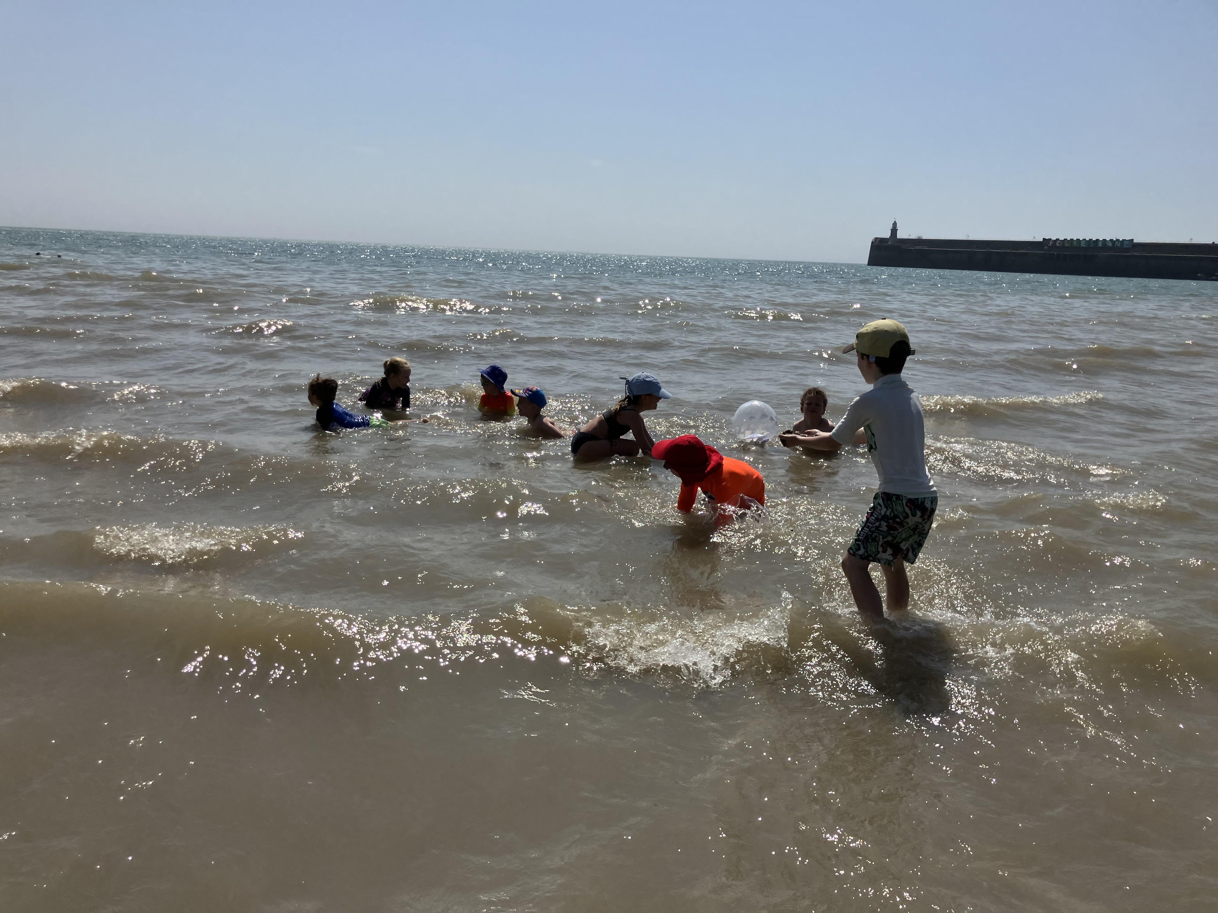 We went to the beach. We swam in the sea. It was the hottest day of the year. We played bats and ball with Dom. Me and Dom played rugby ball that floats on water.