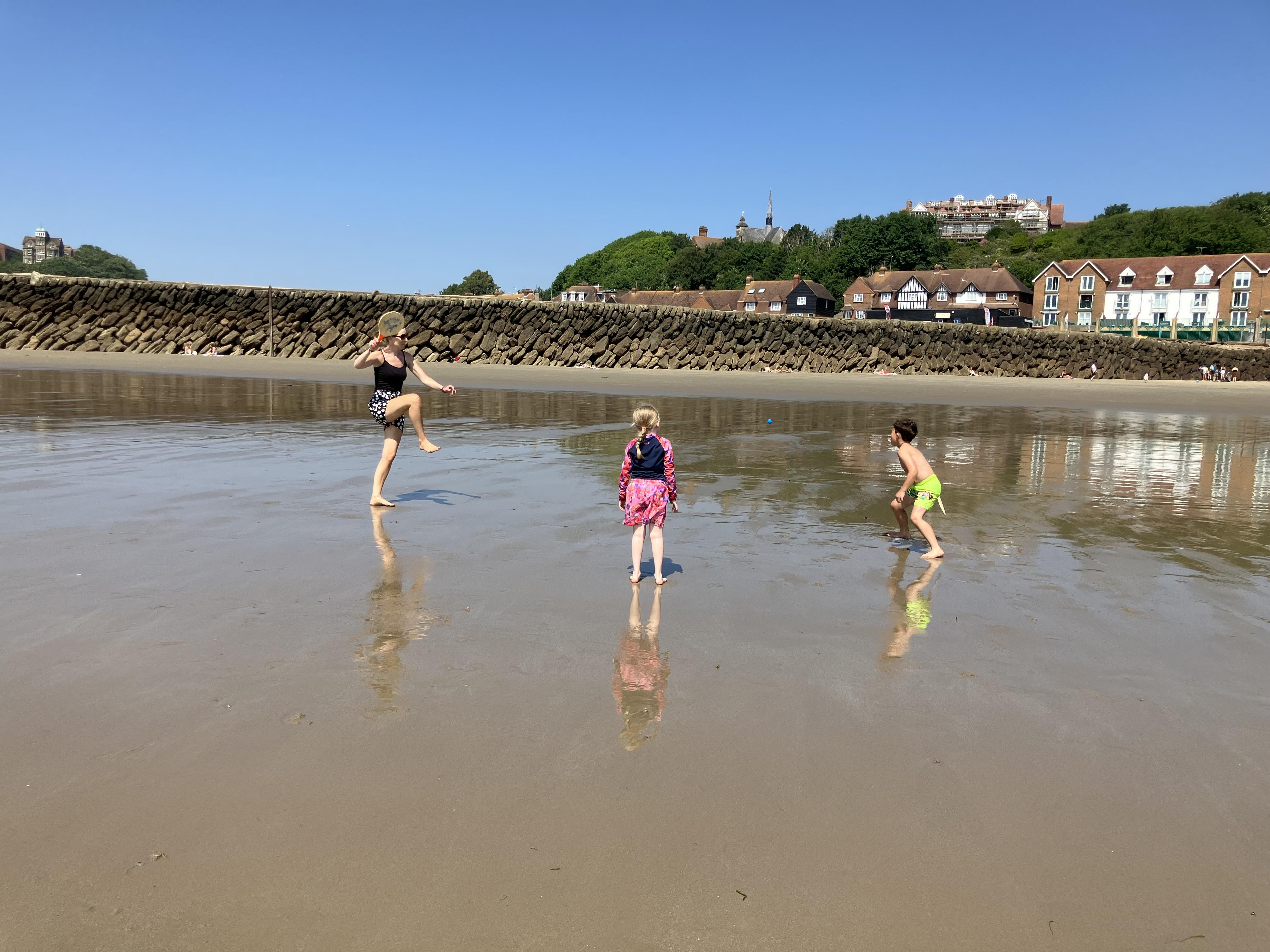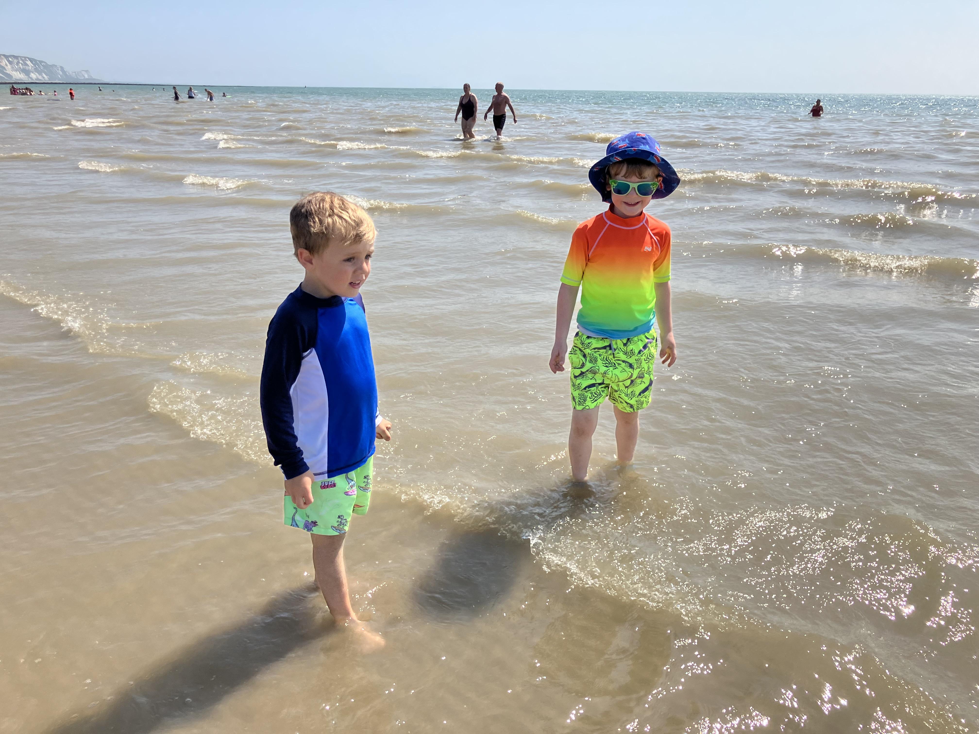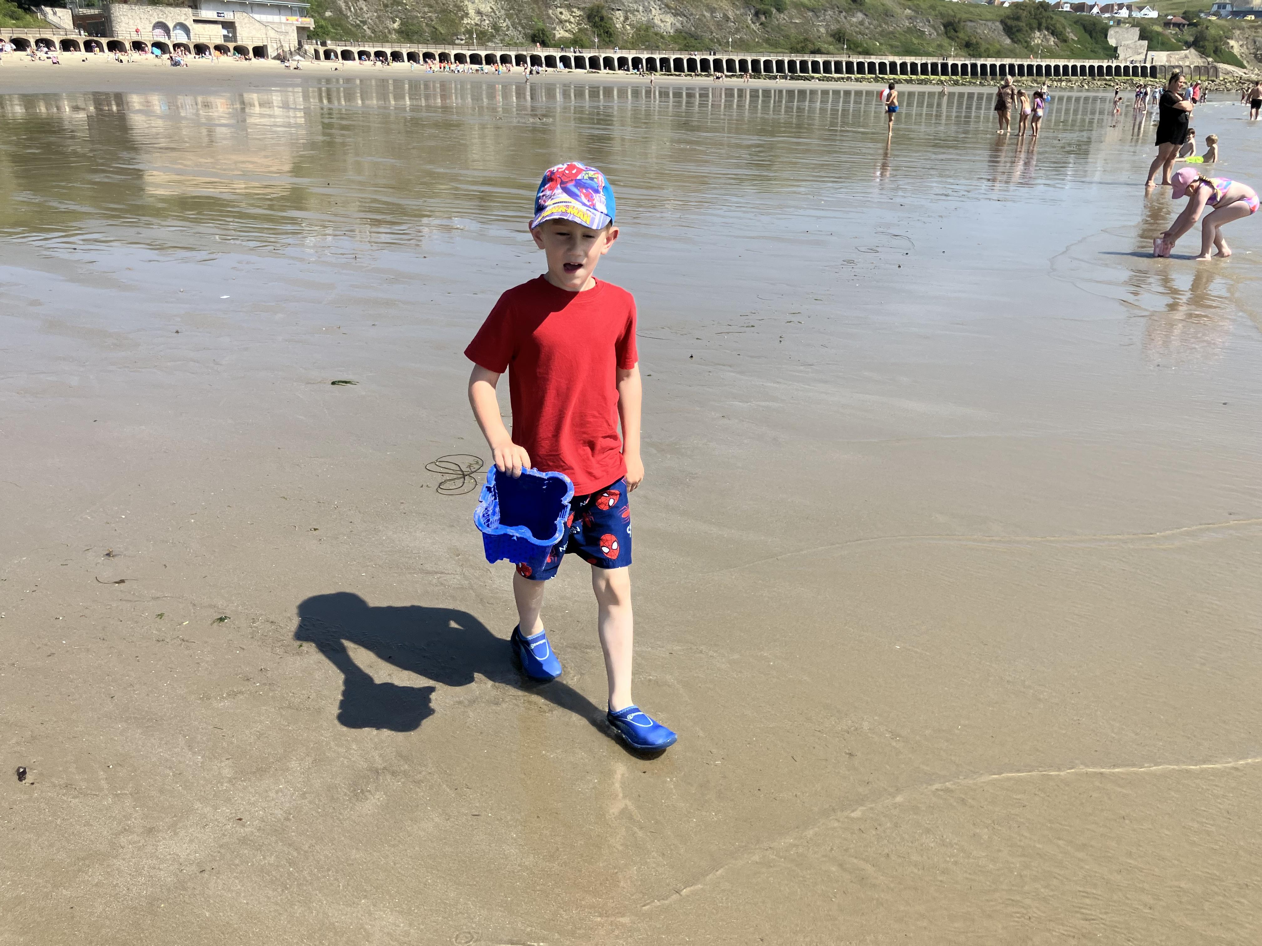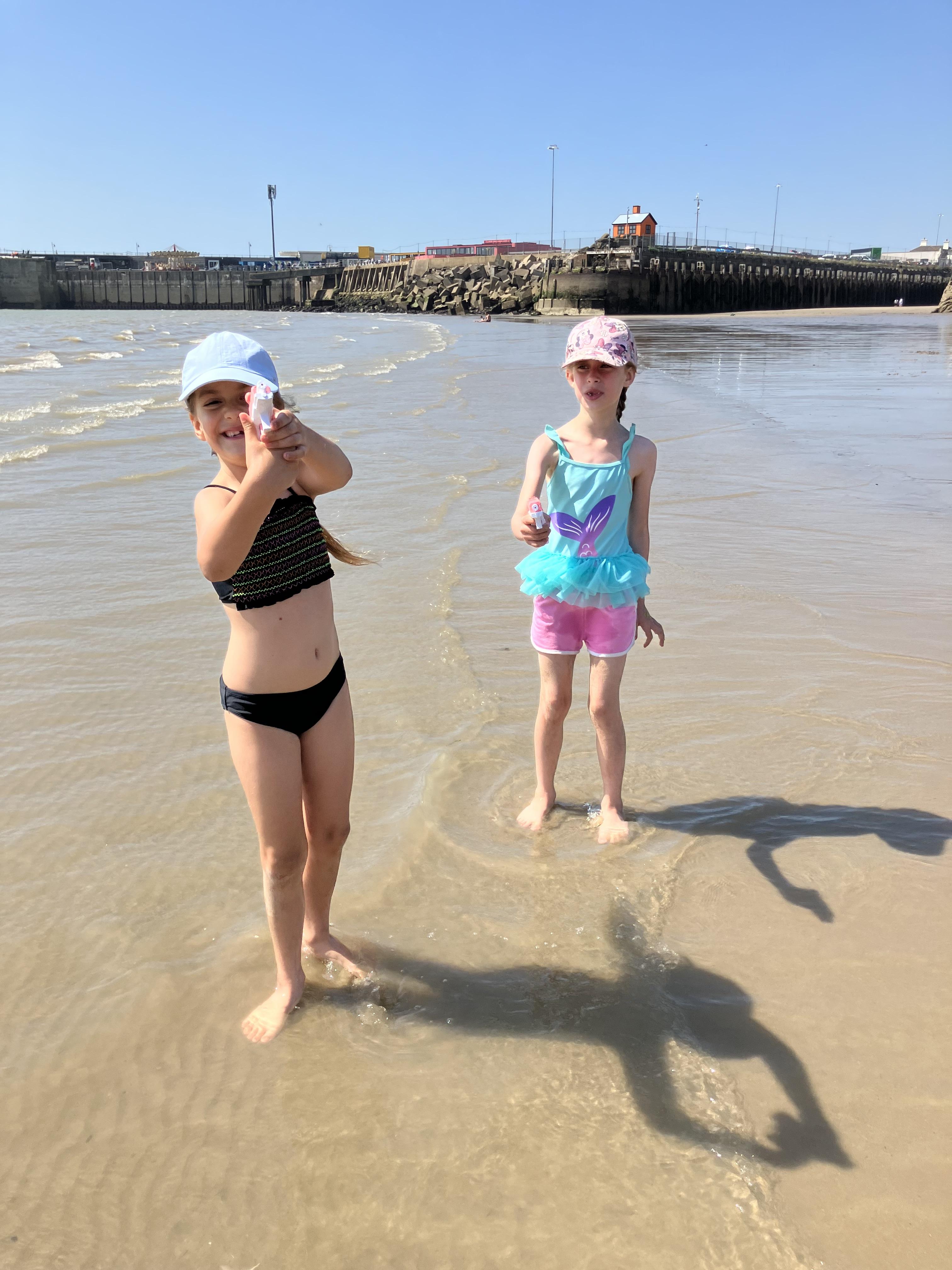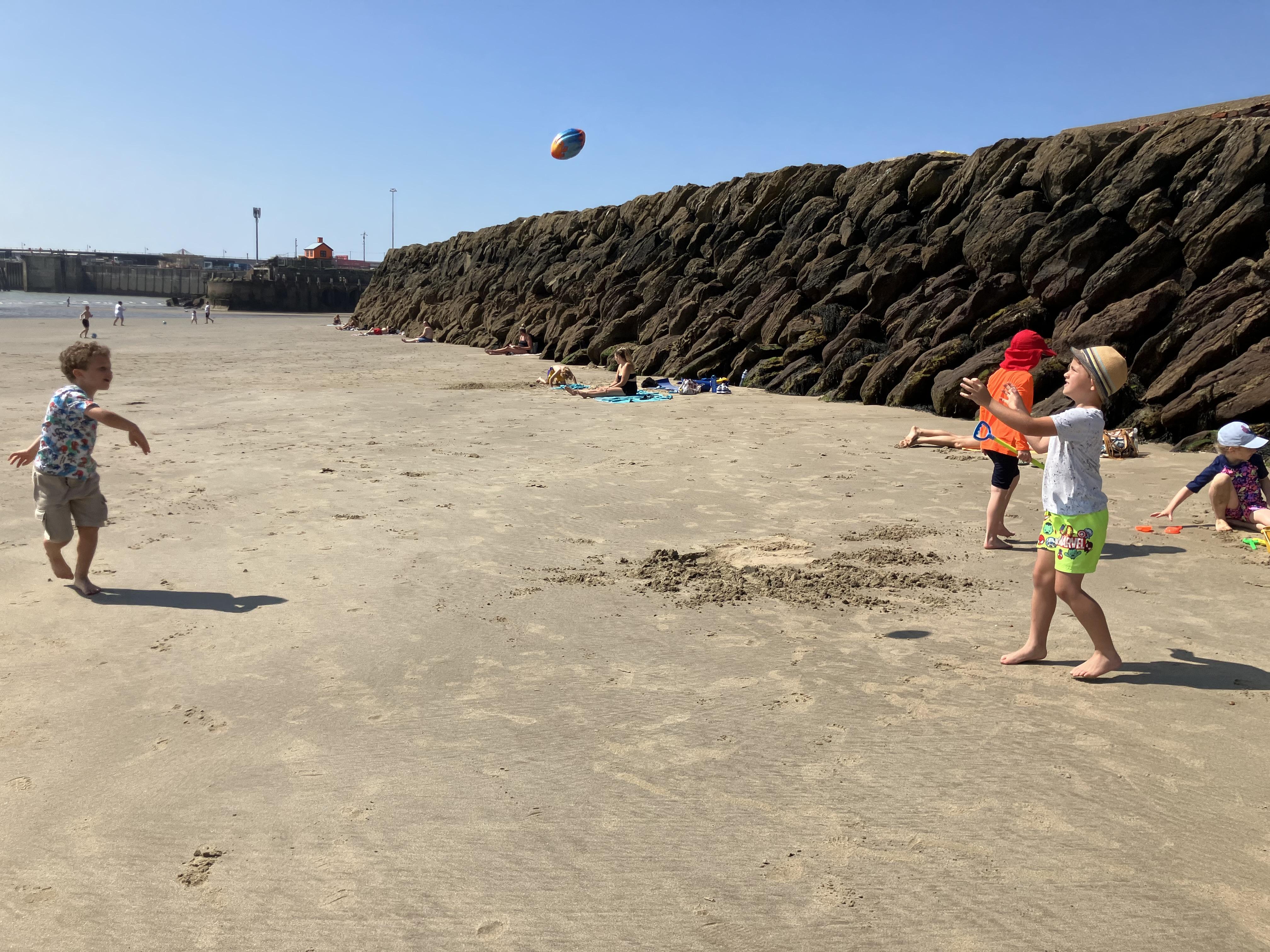 We went to the beach. We swam in the sea. It was the hottest day of the year. We played bats and ball with Dom. Me and Dom played rugby ball that floats on water.