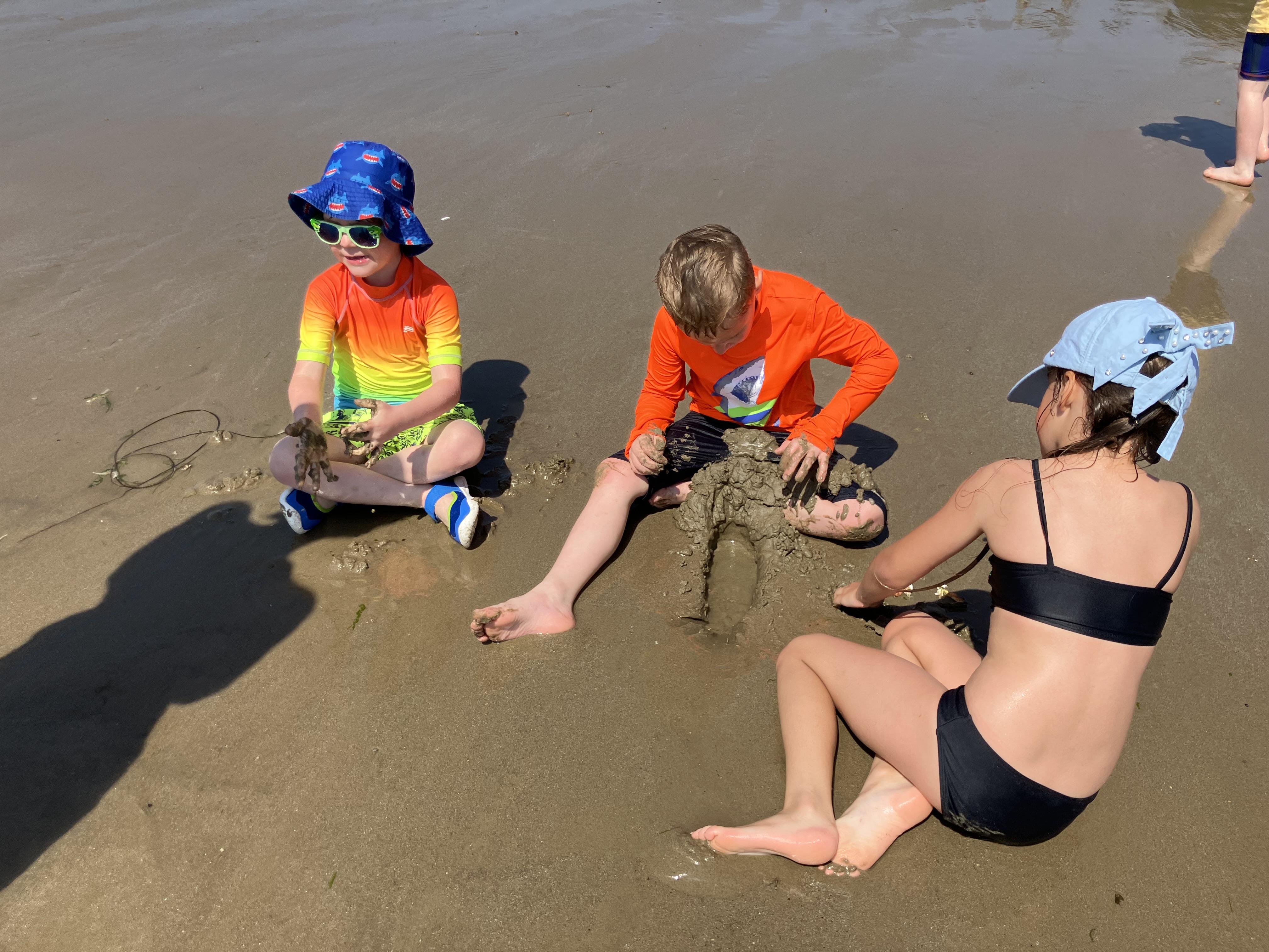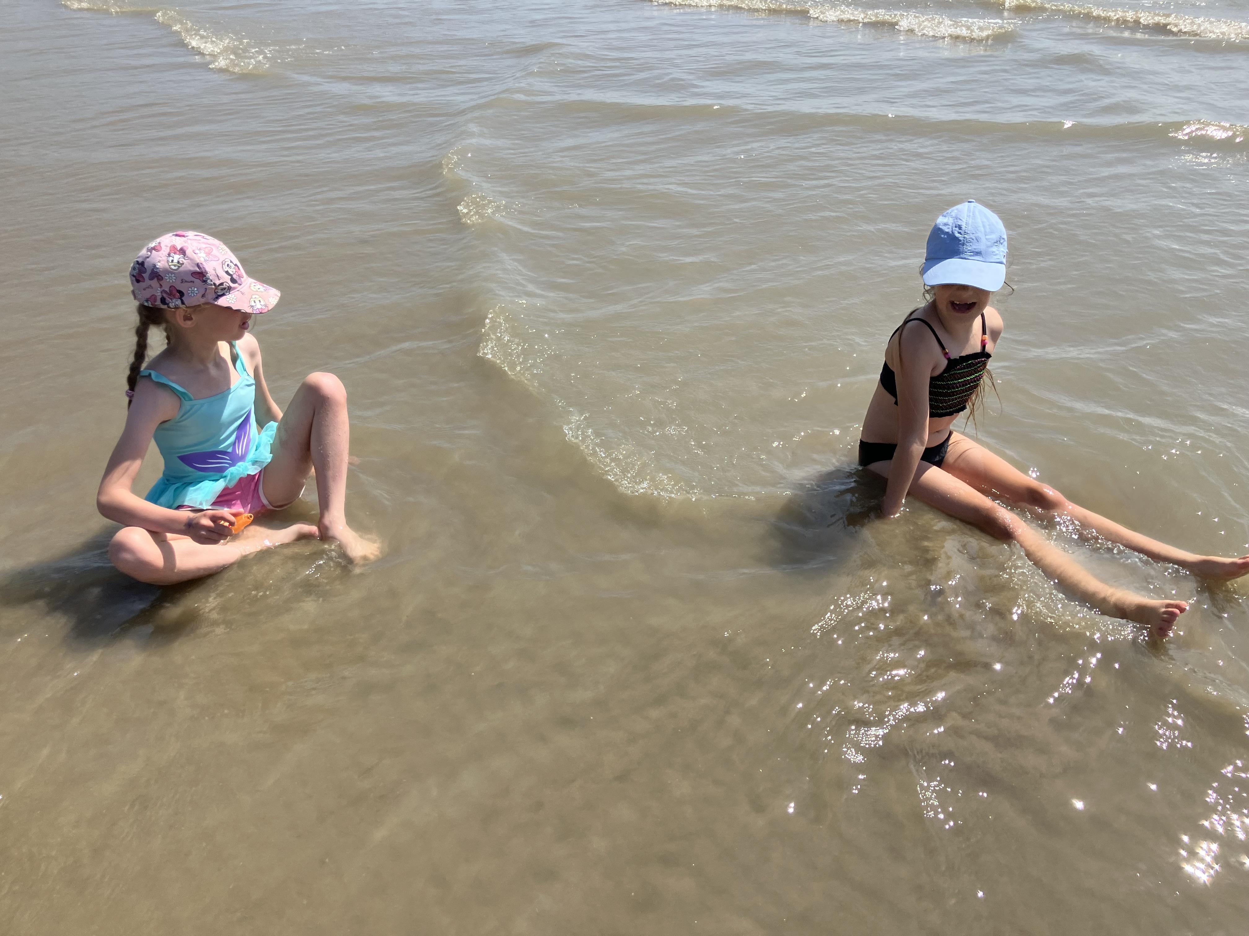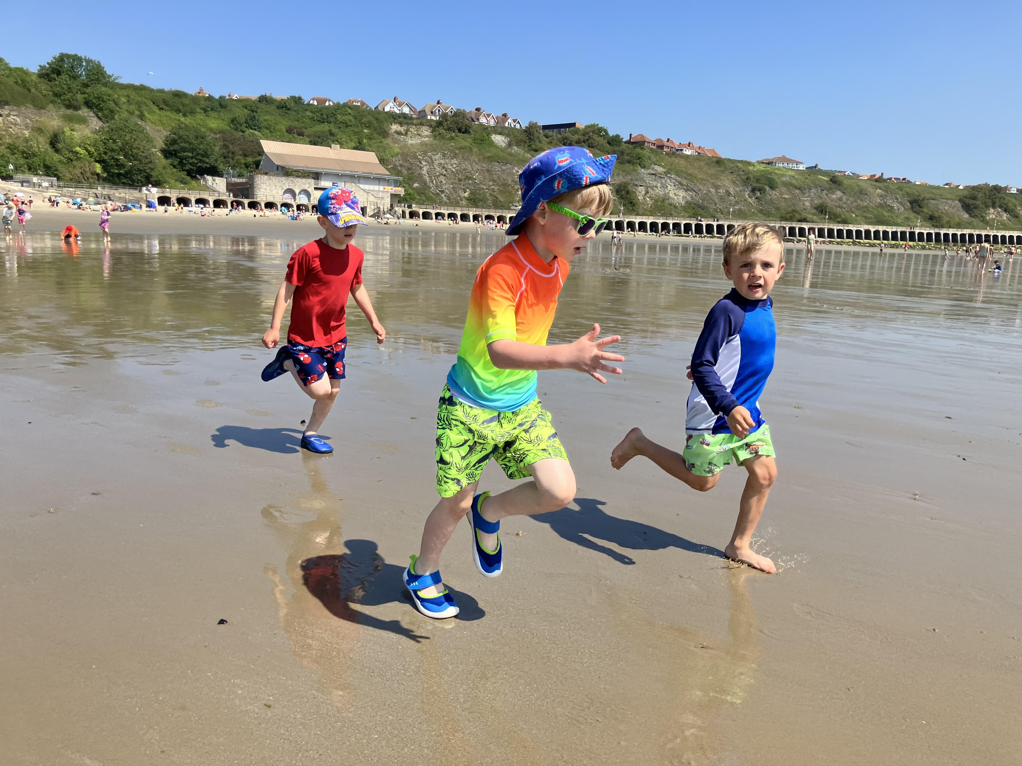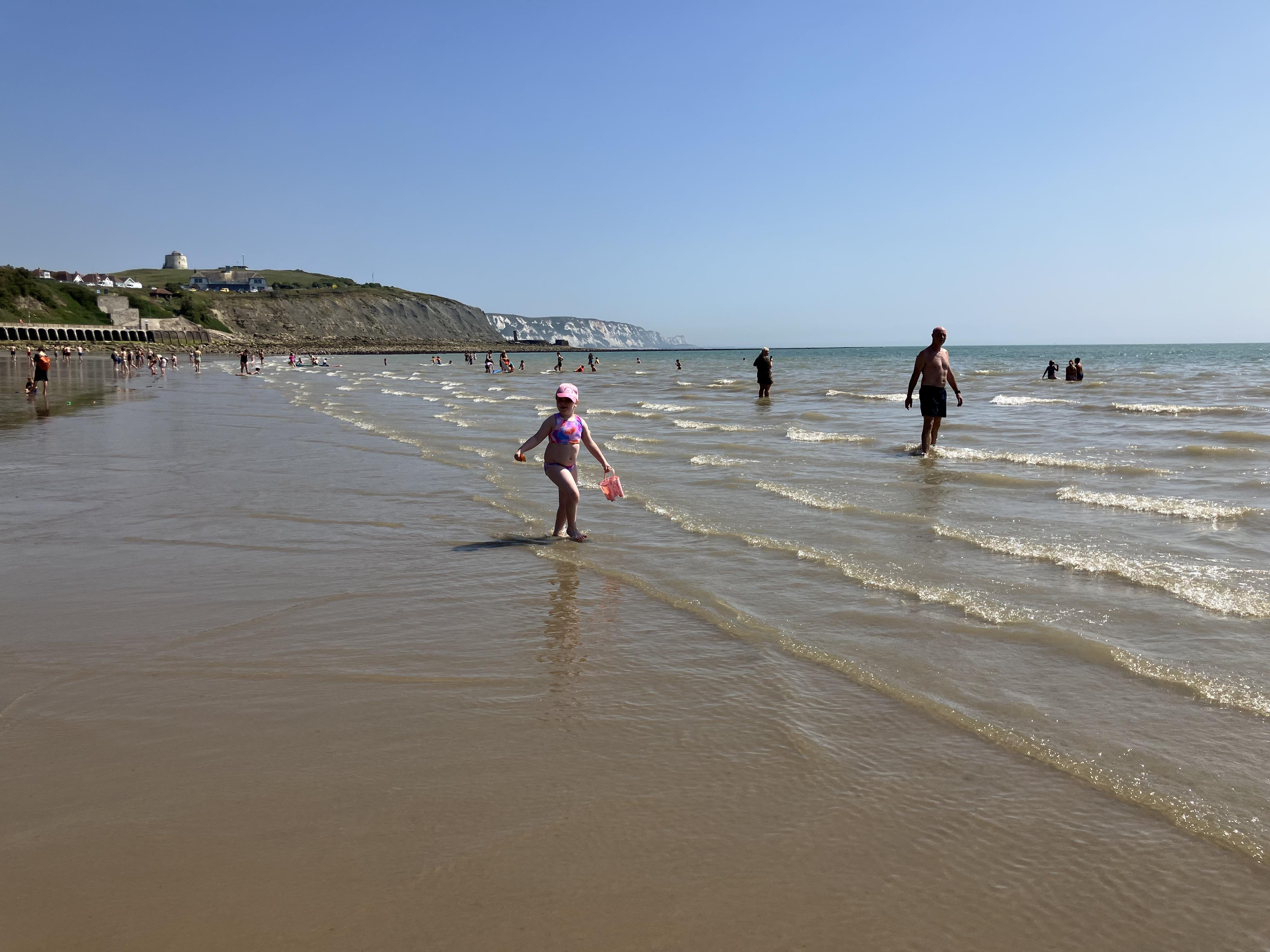 We went to the beach. We swam in the sea. It was the hottest day of the year. We played bats and ball with Dom. Me and Dom played rugby ball that floats on water.