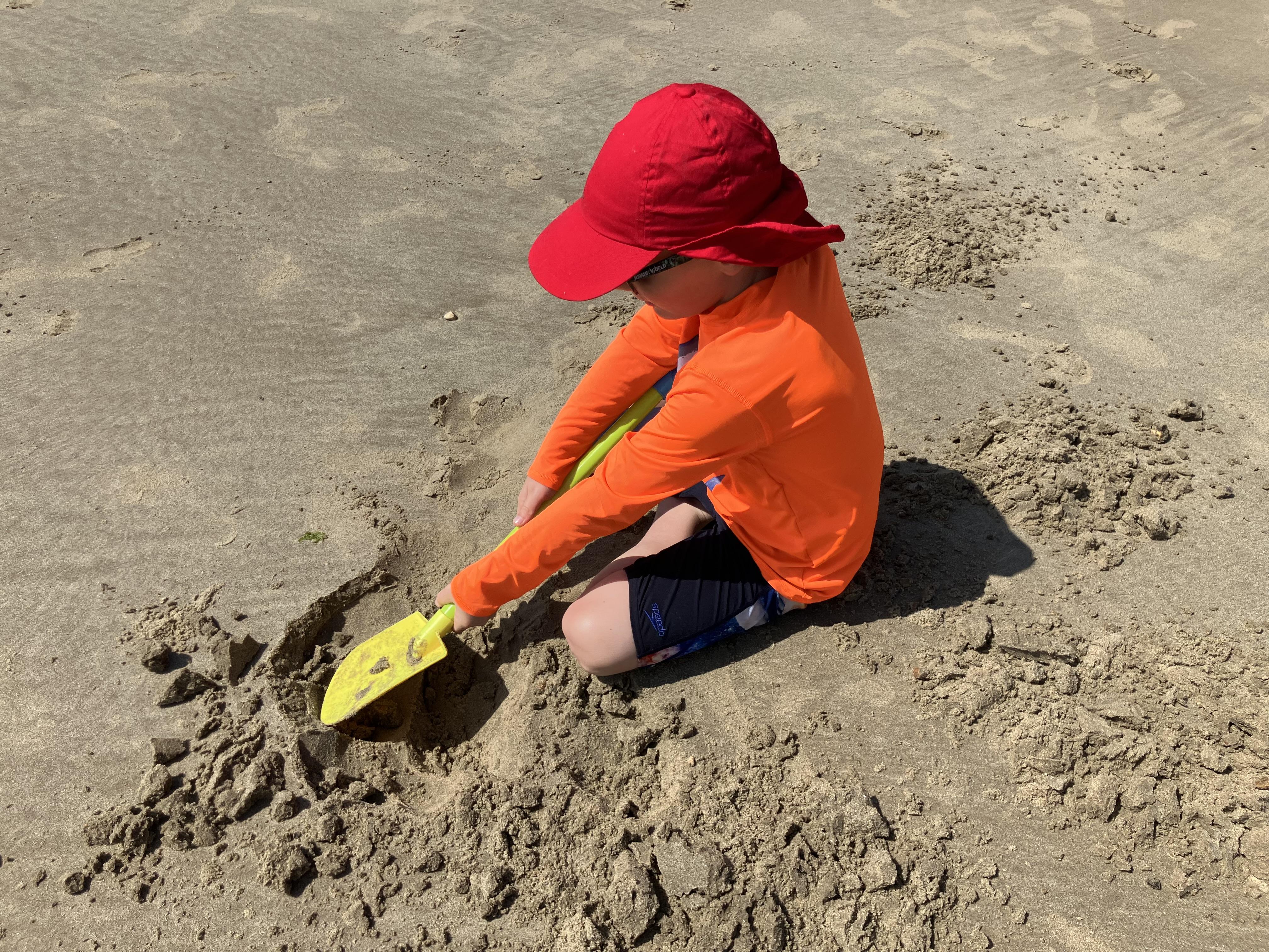 Yesterday we went to the beach. We travelled by bus. When we got there I started digging a hole. My favourite part was digging. I went swimming. Lunch was sausage and chips. On the way back we had some jelly men.