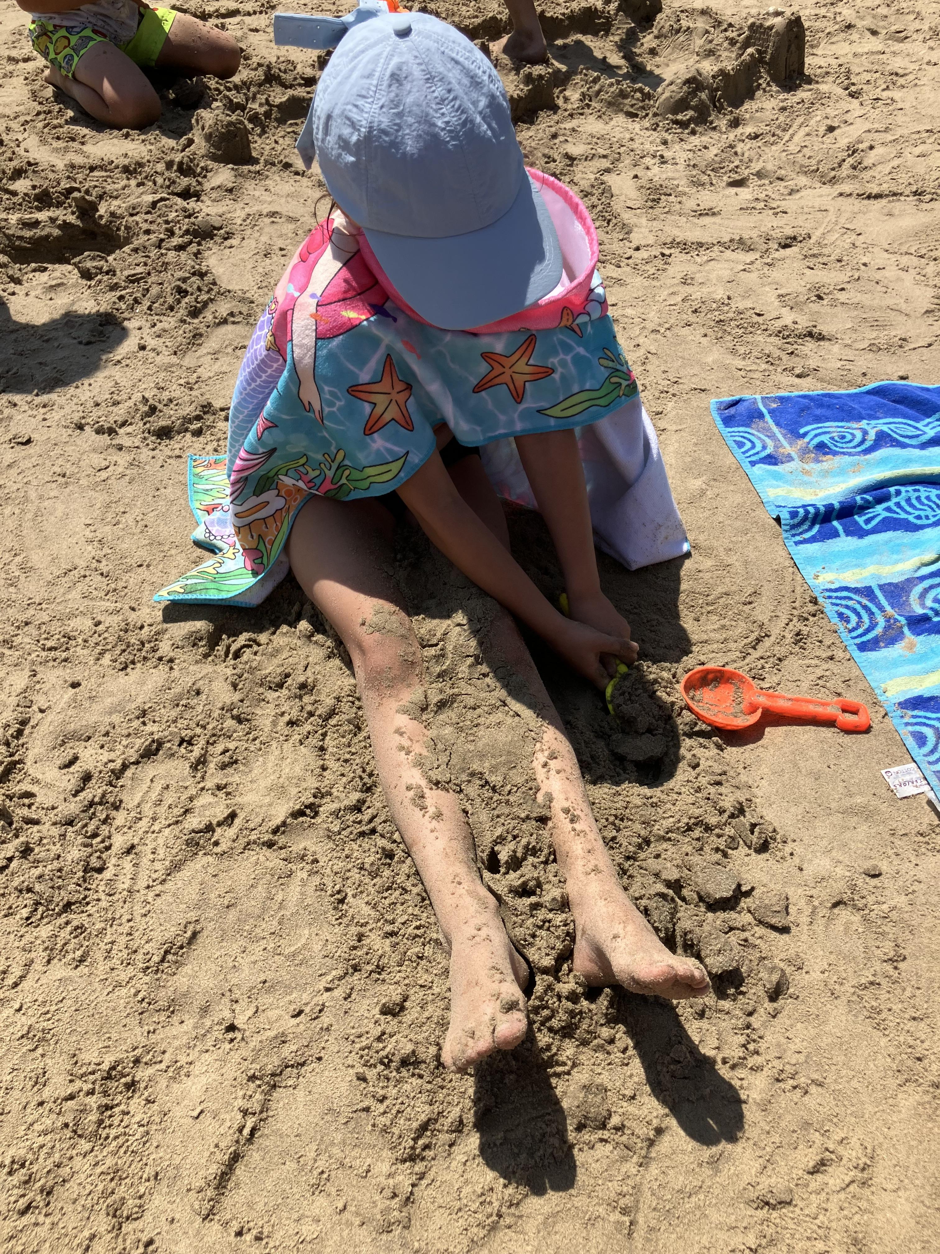 Yesterday we went to the beach. We finally got there. We played in the sand then I went in the sea. Then I got chilly. I sunbathed. I got changed into my top and knickers.
