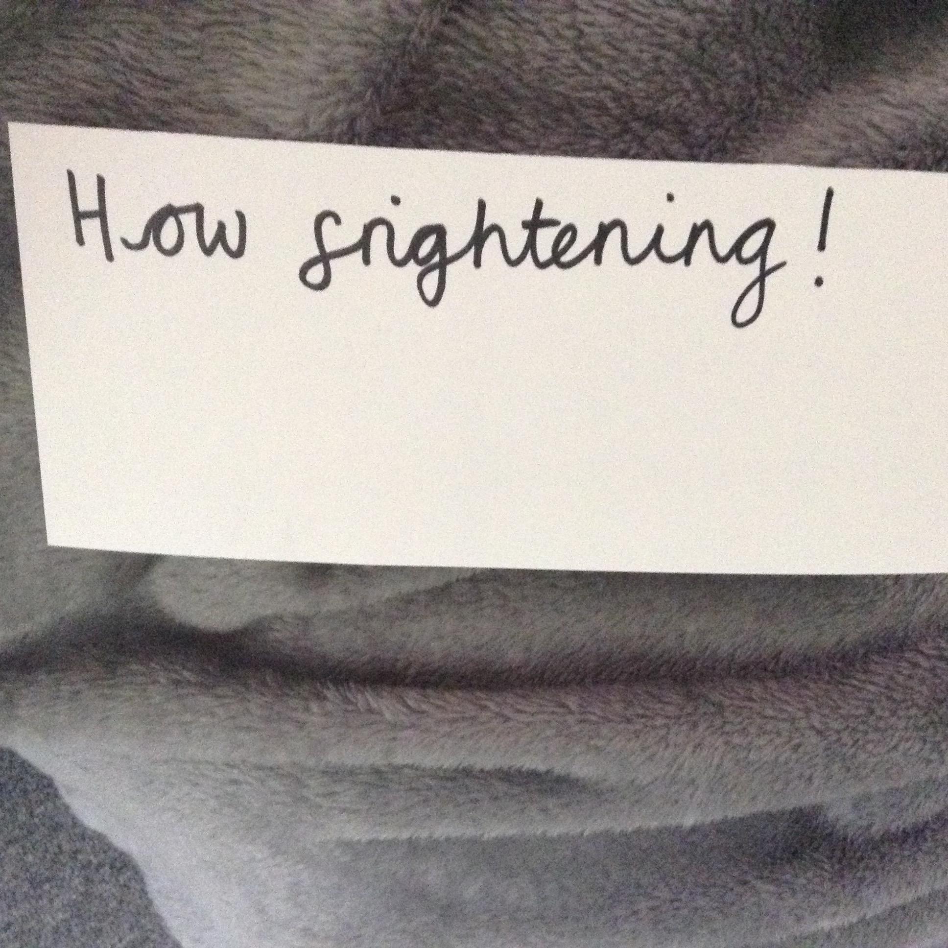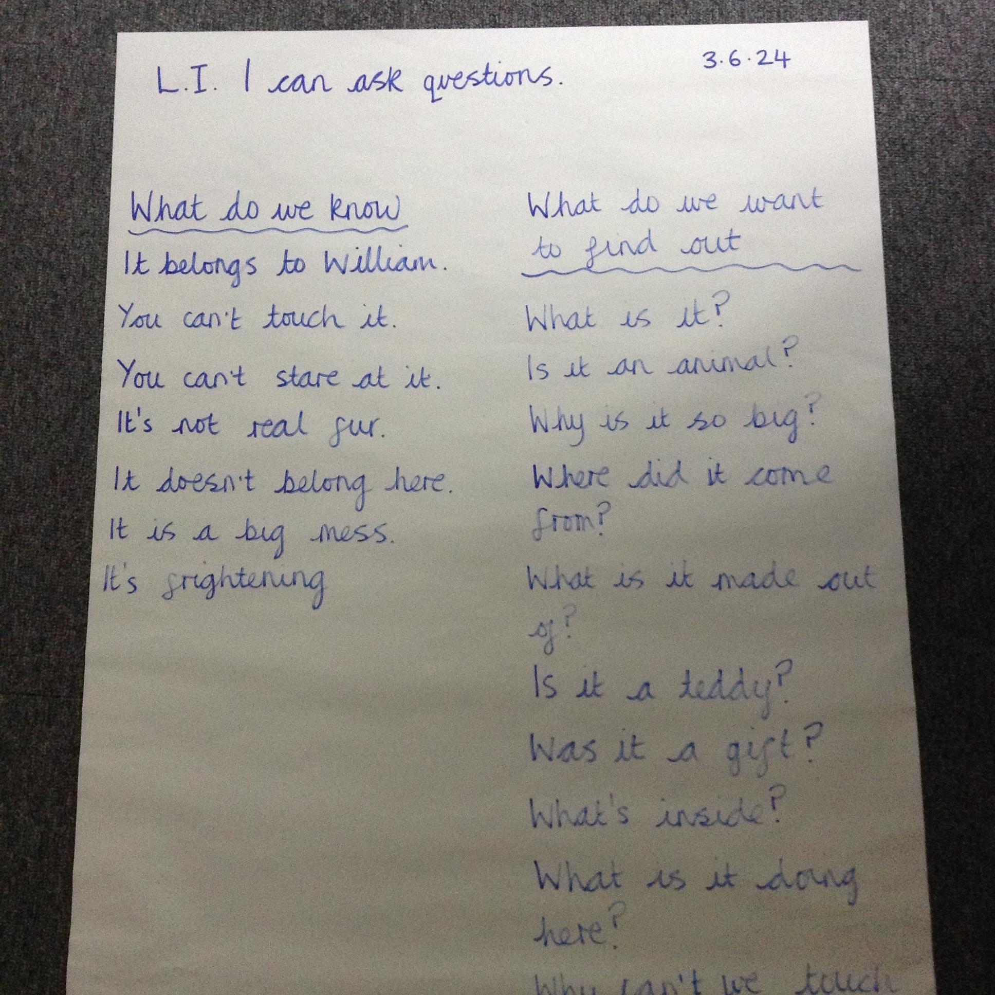 The children came in to see something very strange on the floor. The lumpy, furry mass was covered in a variety of signs. The children had to sort the signs into piles for questions, statements, exclamations and commands. They then had to write statements about what they knew and then questions about what they would like to know.