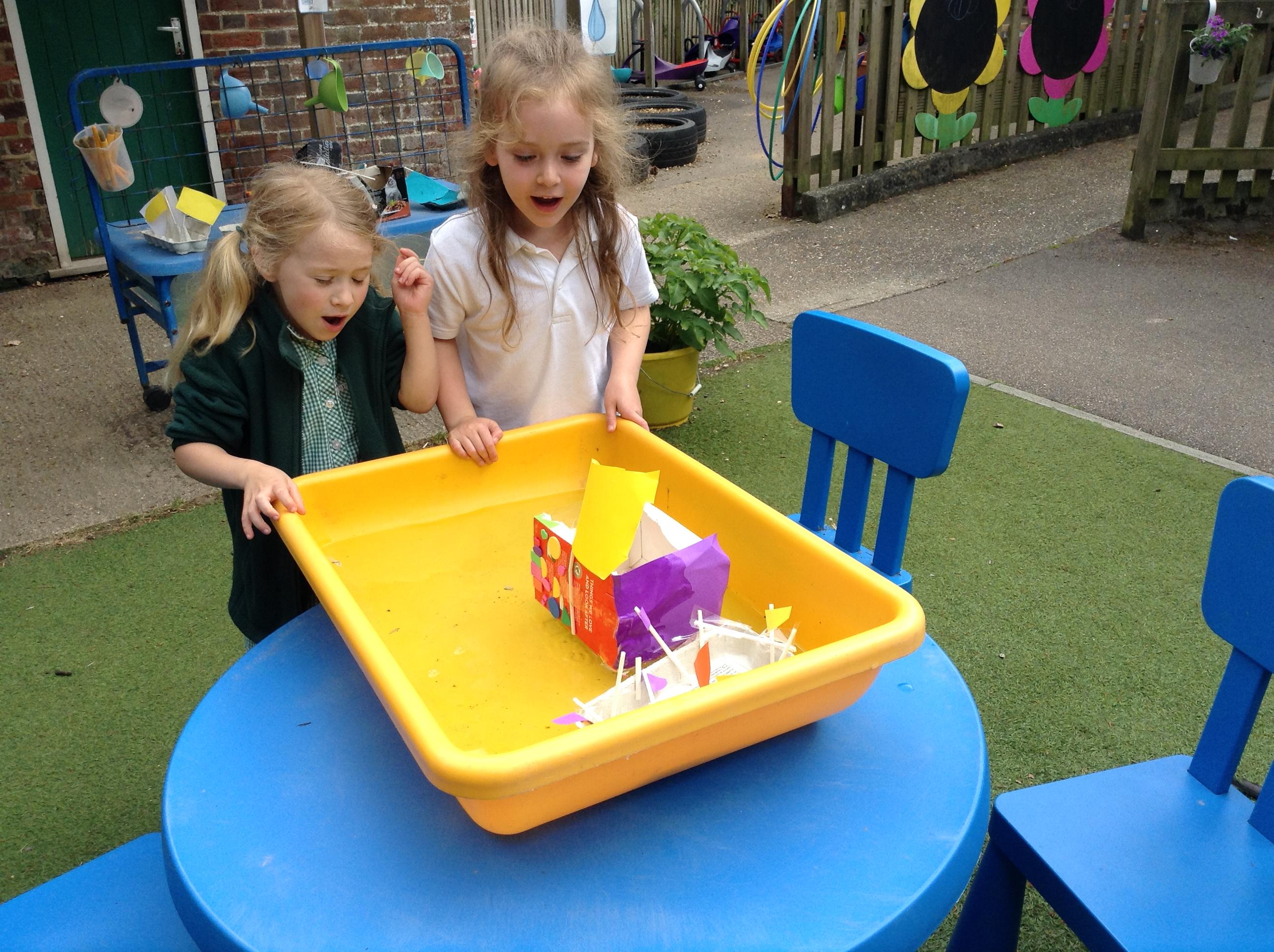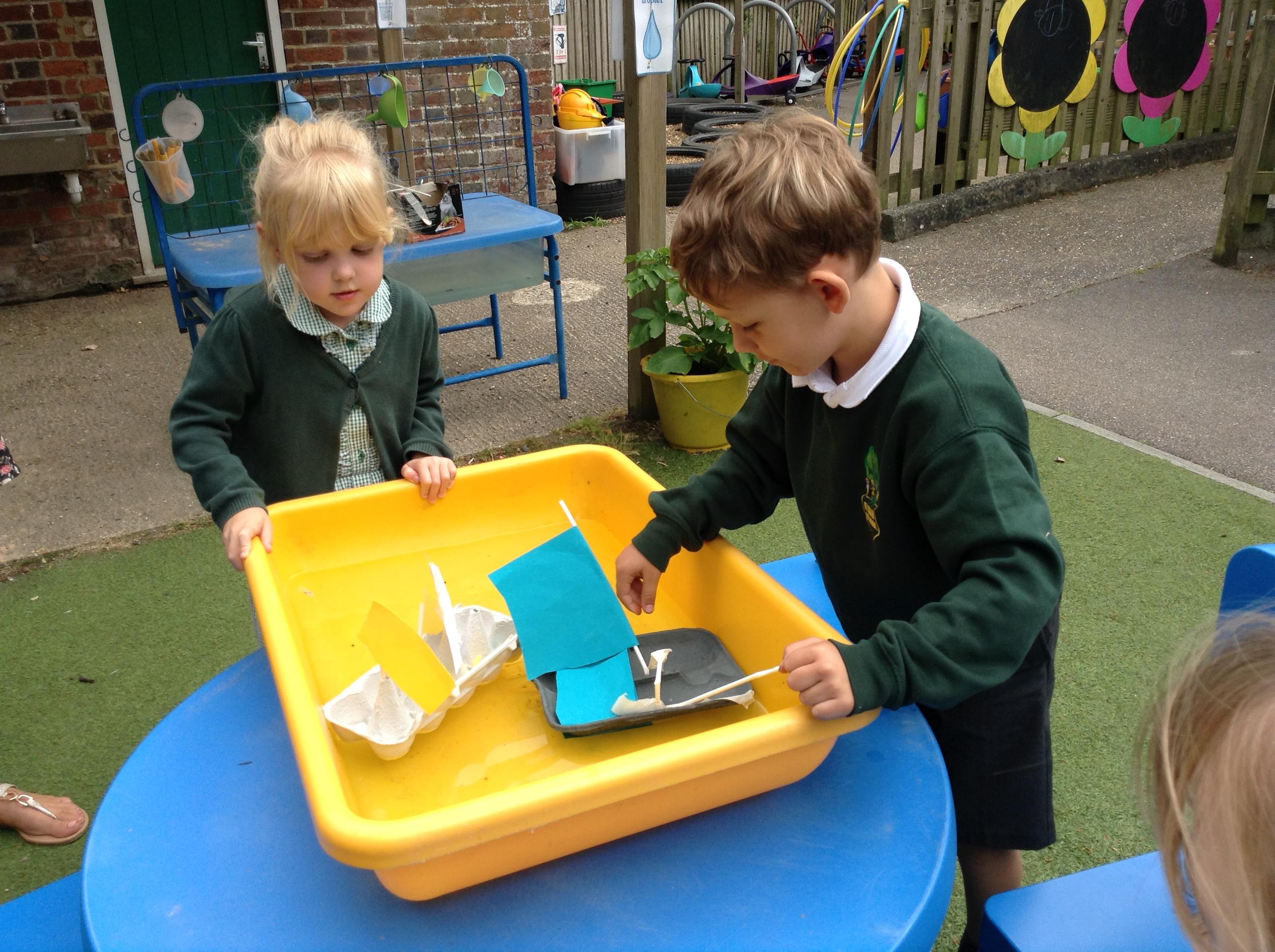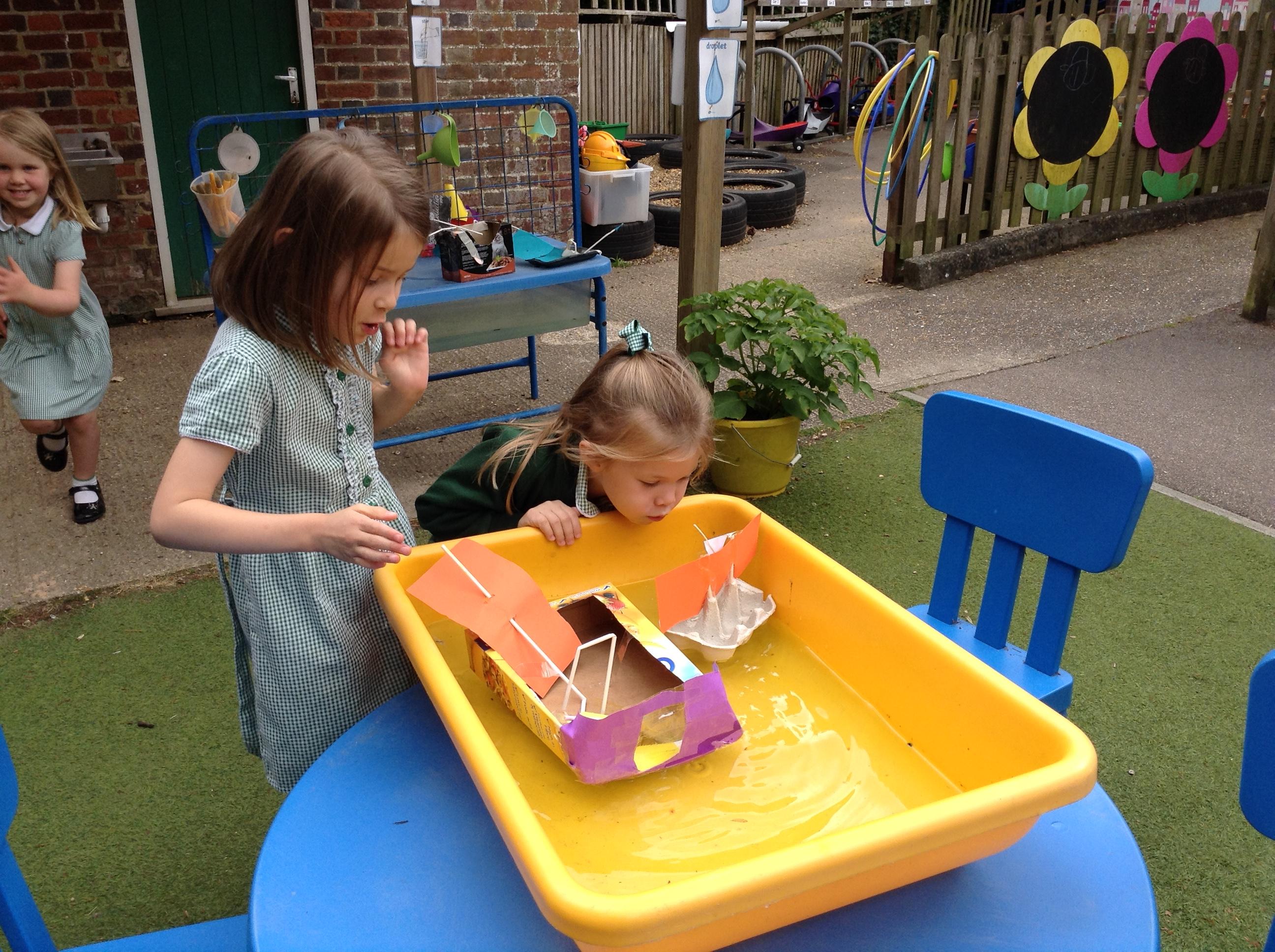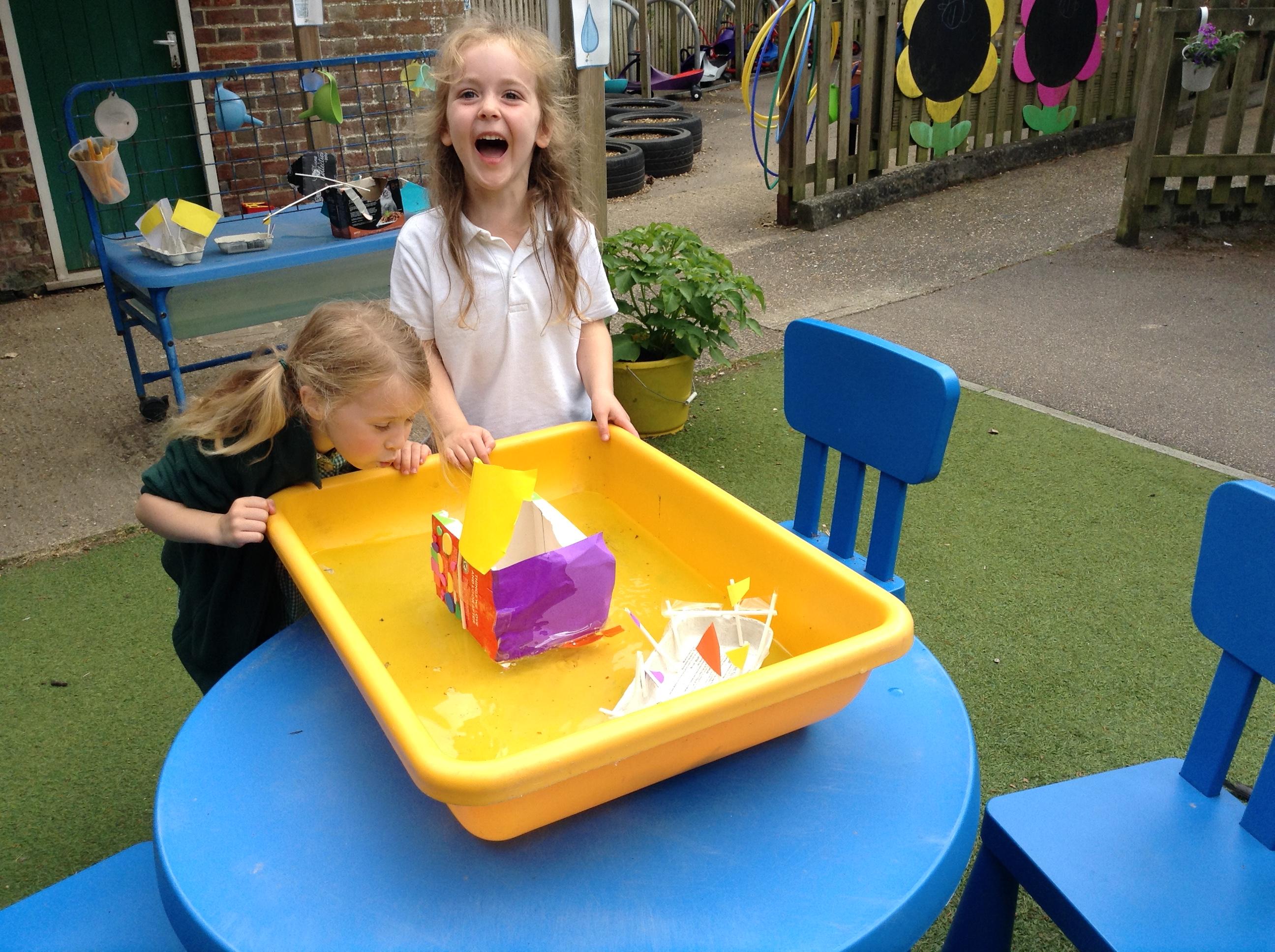 We made some super boats. We were very careful to make sure they had no holes in them to let the water in. We noticed that a bigger sail made the boat move faster.
