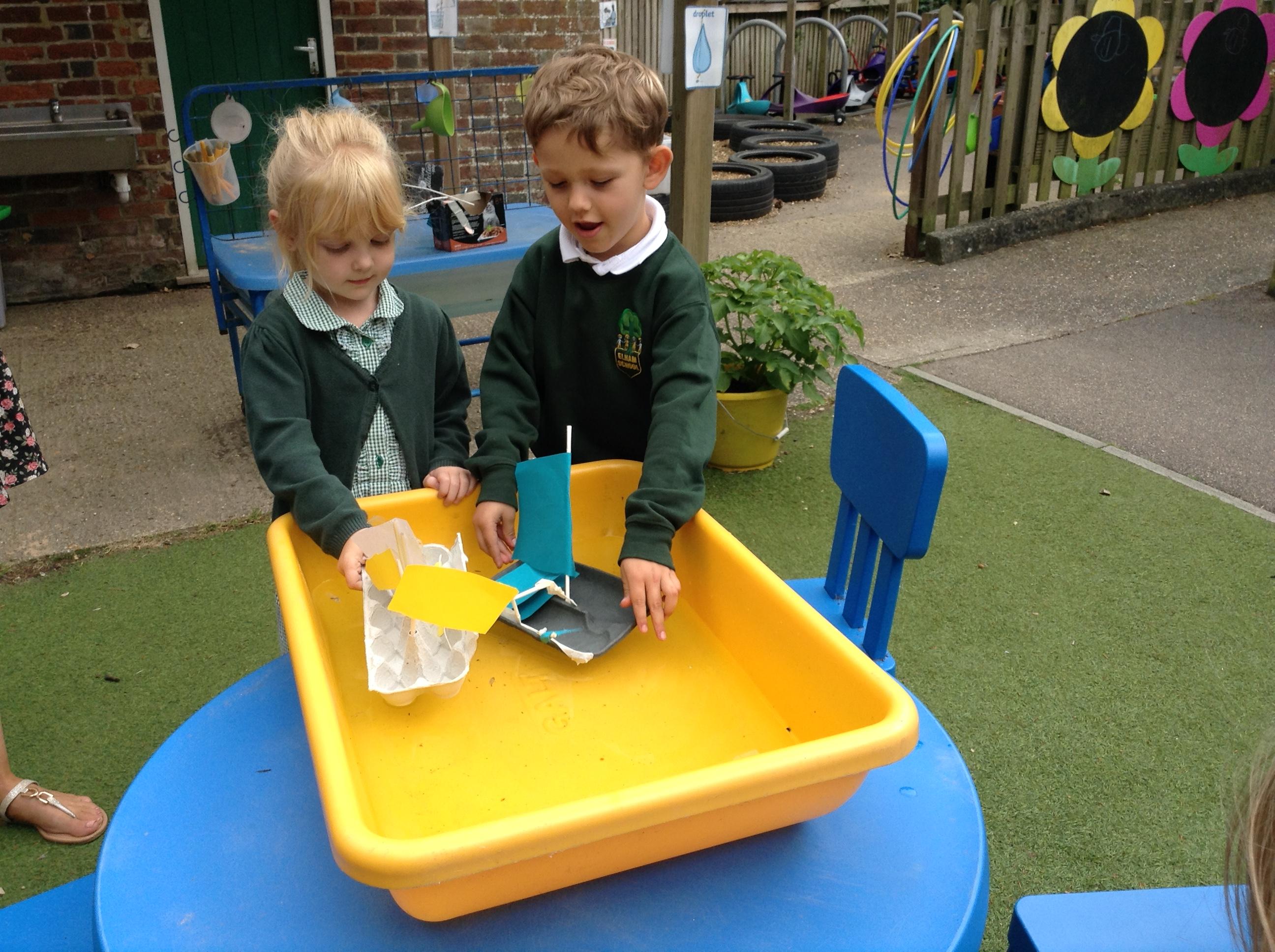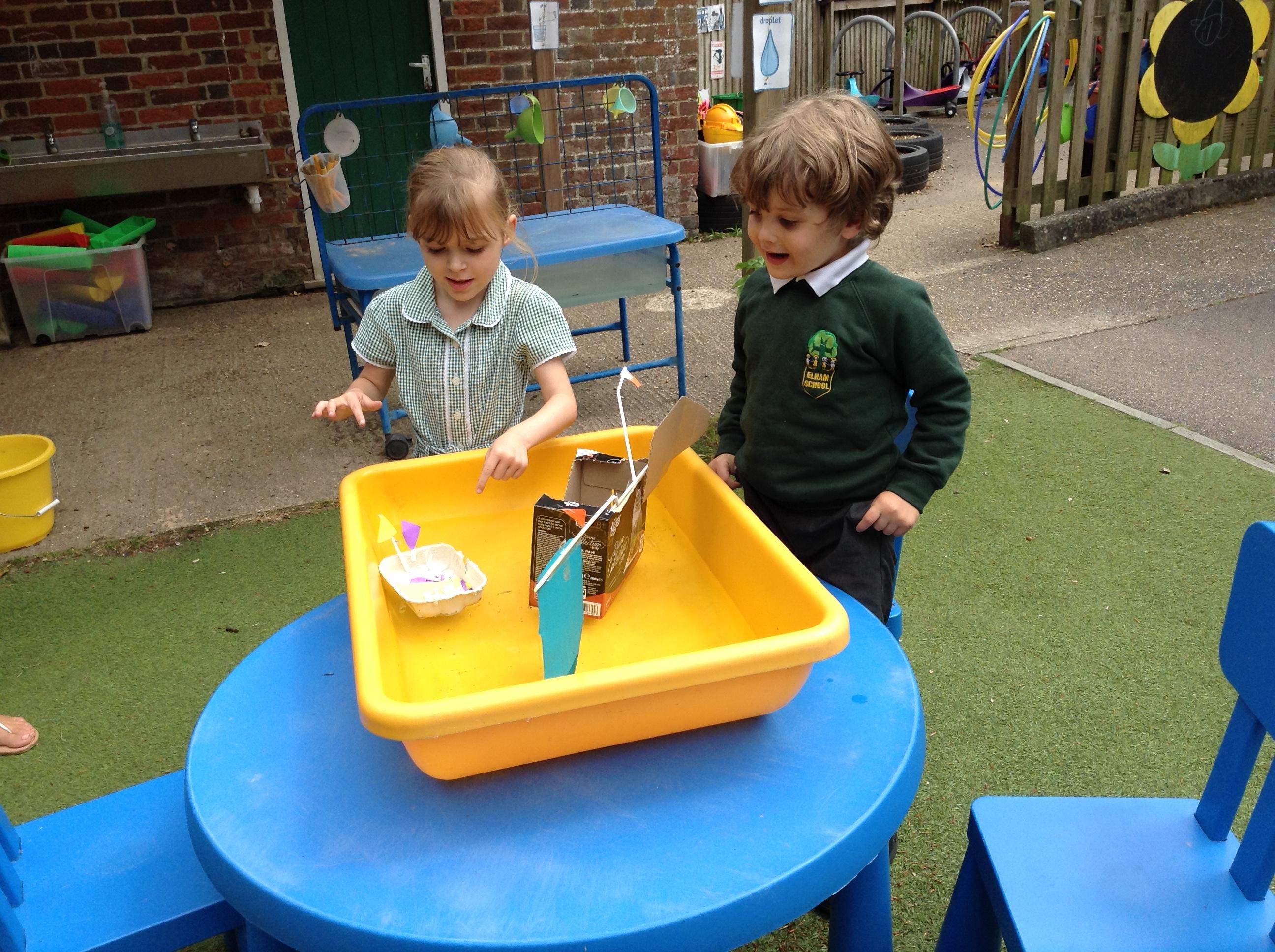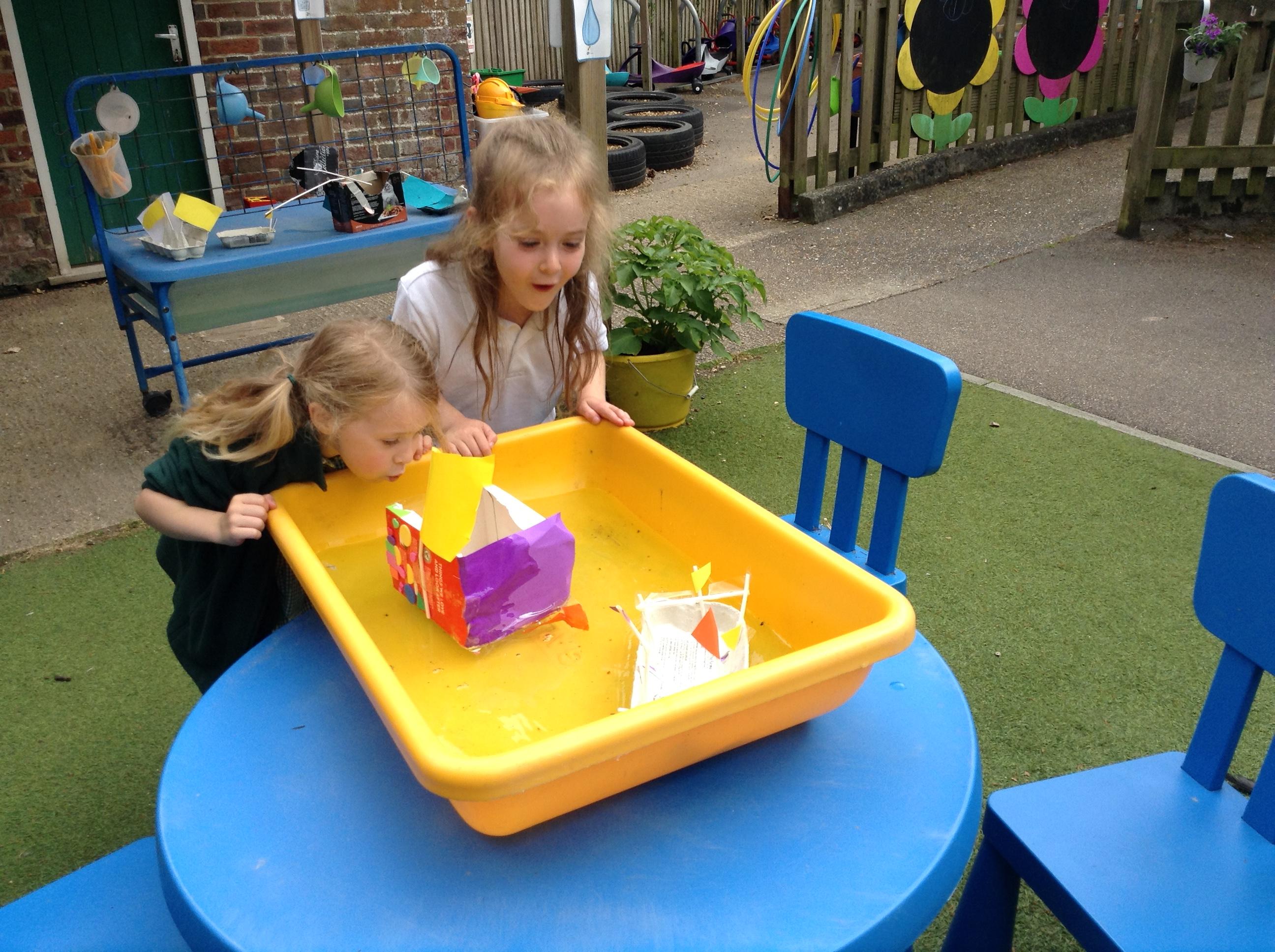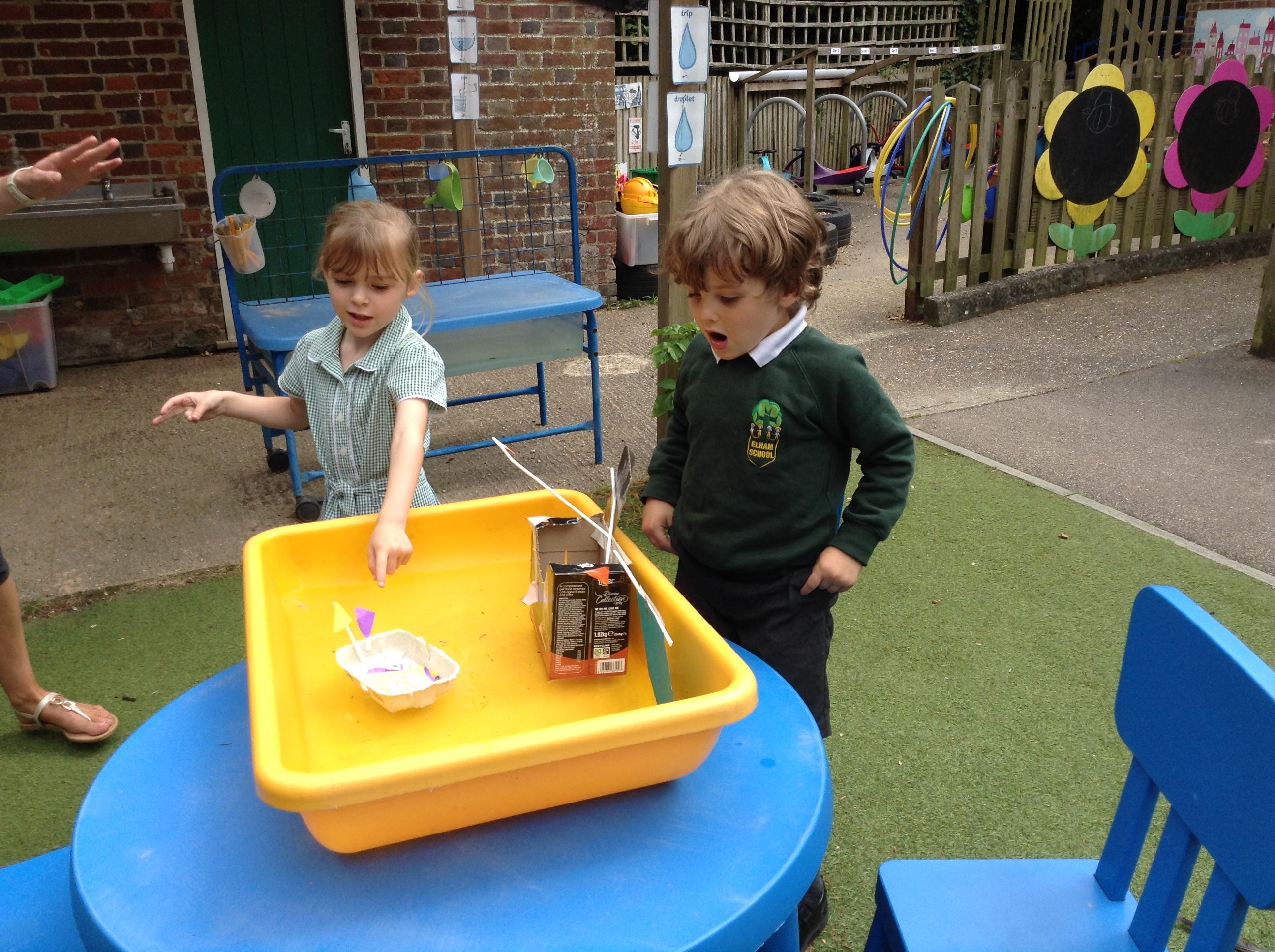We made some super boats. We were very careful to make sure they had no holes in them to let the water in. We noticed that a bigger sail made the boat move faster.