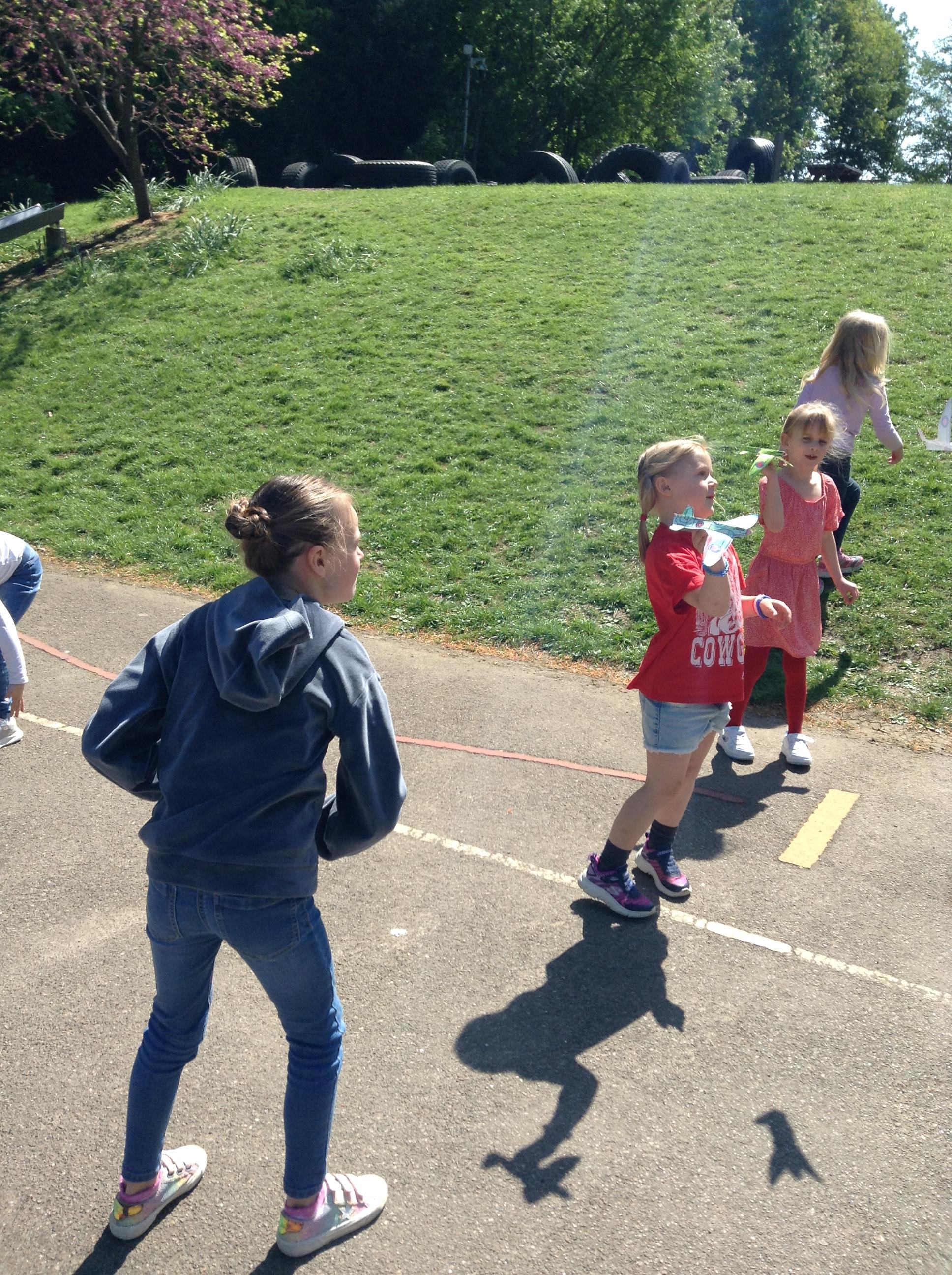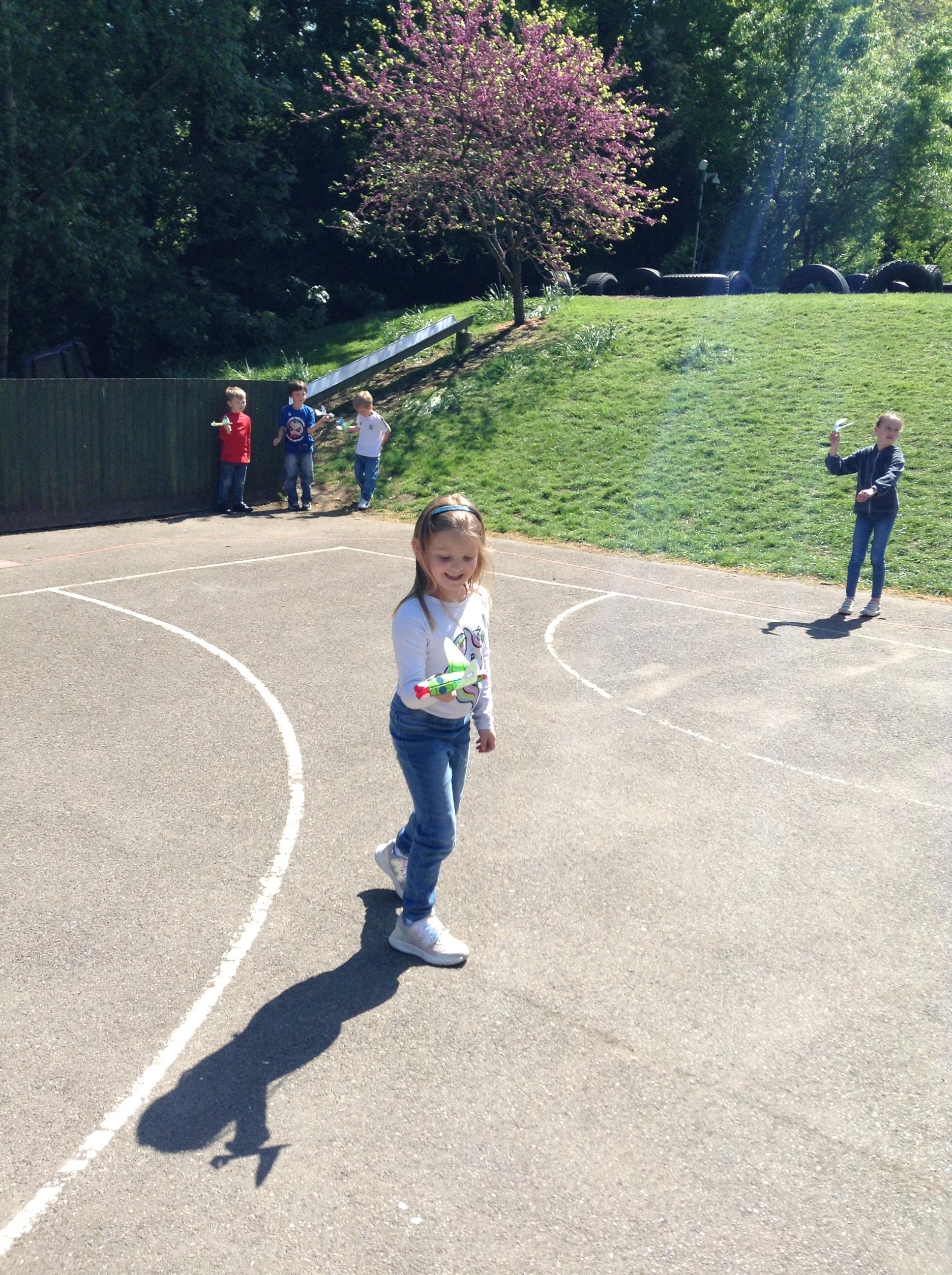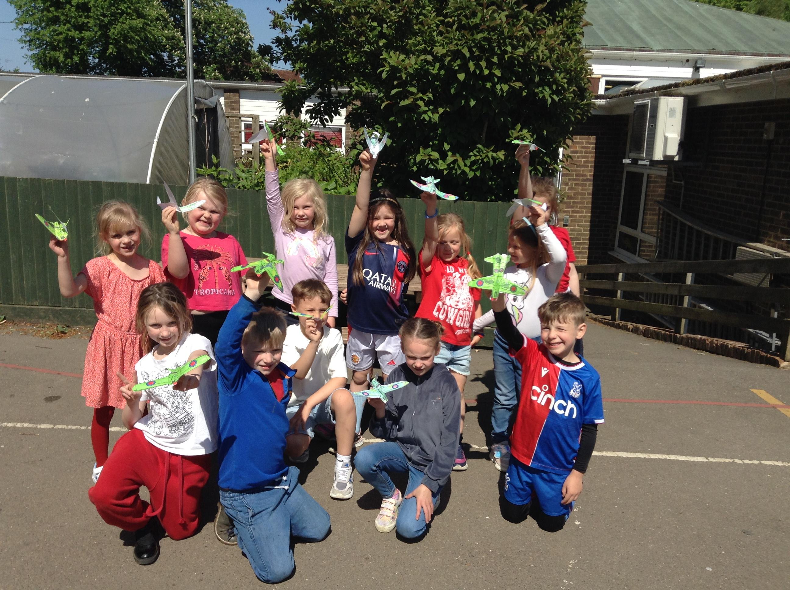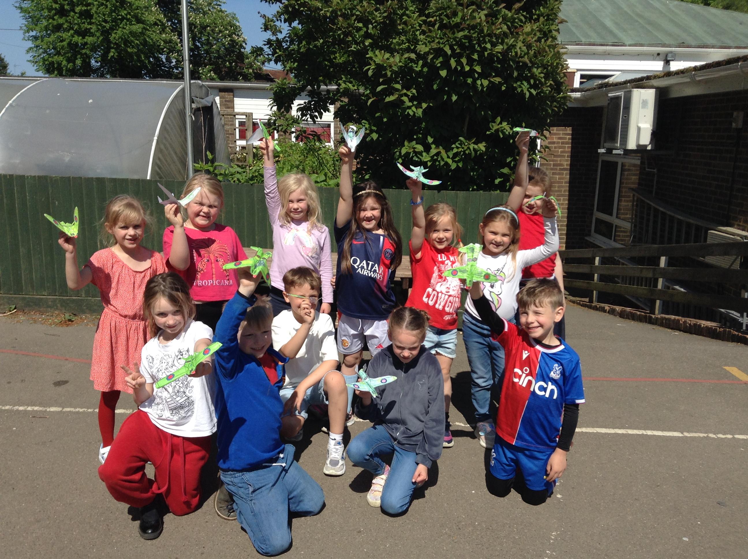 We started the morning observing a one minute silence on the playground whilst a special VE Day flag was raised. We then listened to Elizabeth talking in the hall about her memories of life as a child during the war. This afternoon the children made their own Spitfire plane and had fun flying them outside.