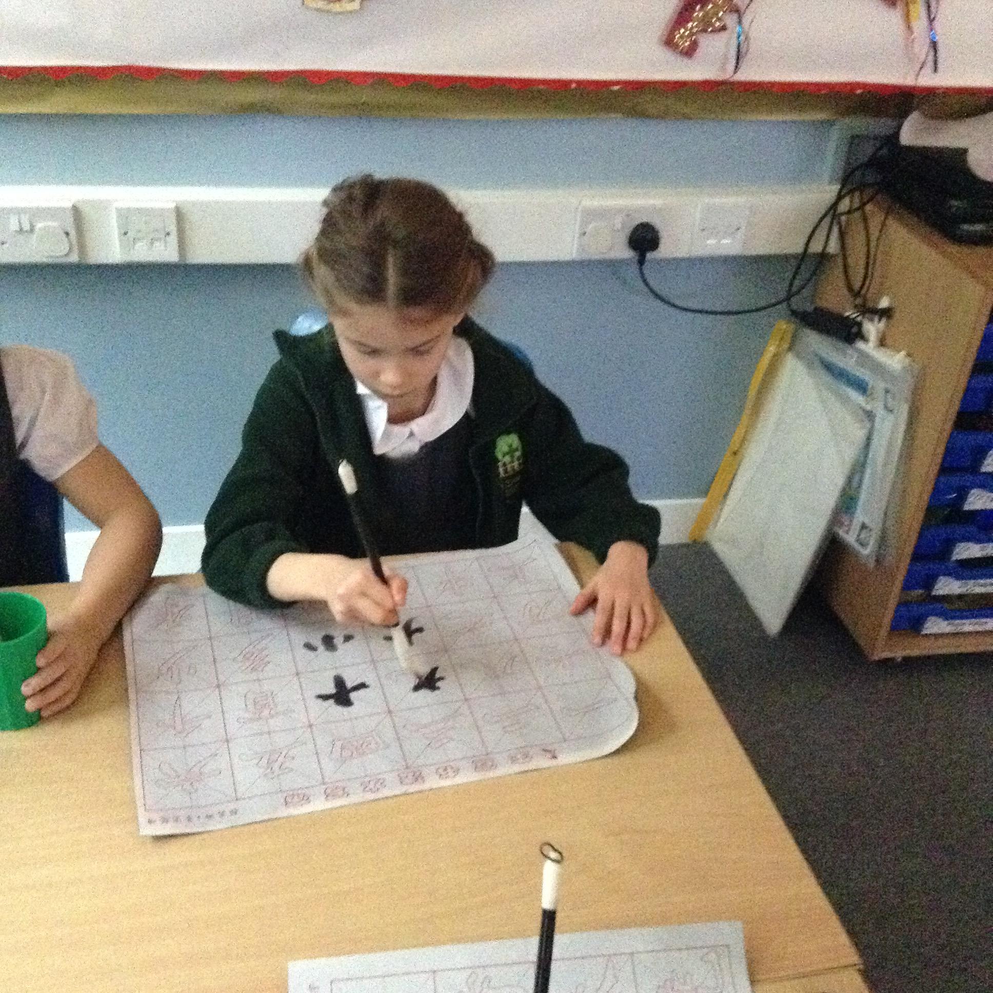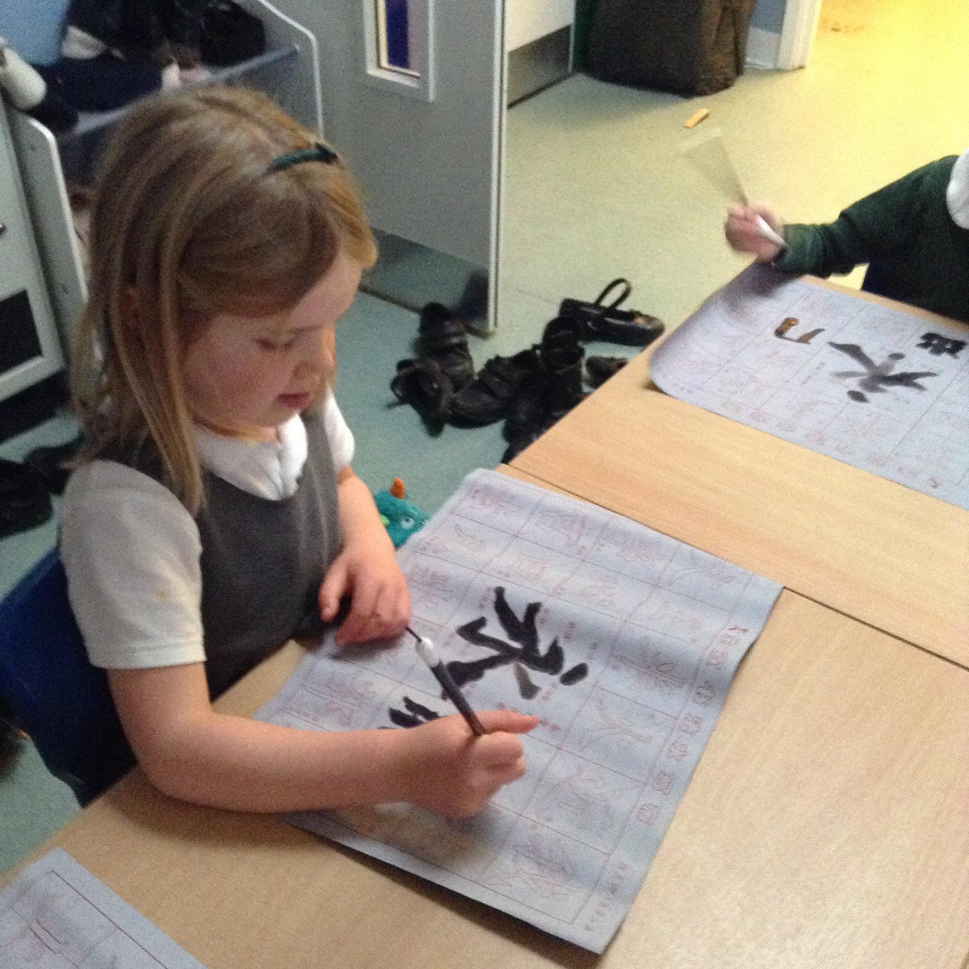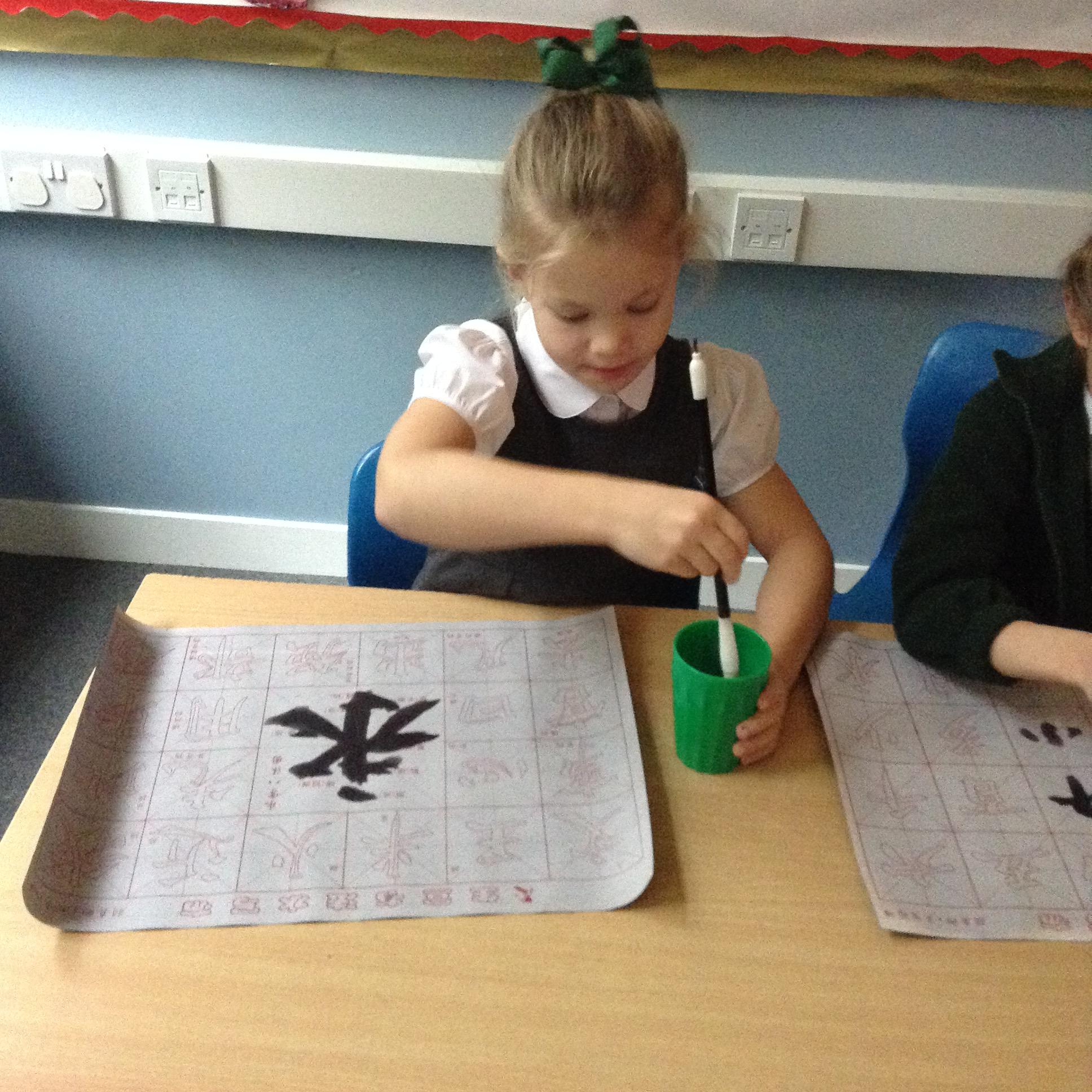 The children have been using a special type of paintbrush to have a go at writing some Chinese characters.