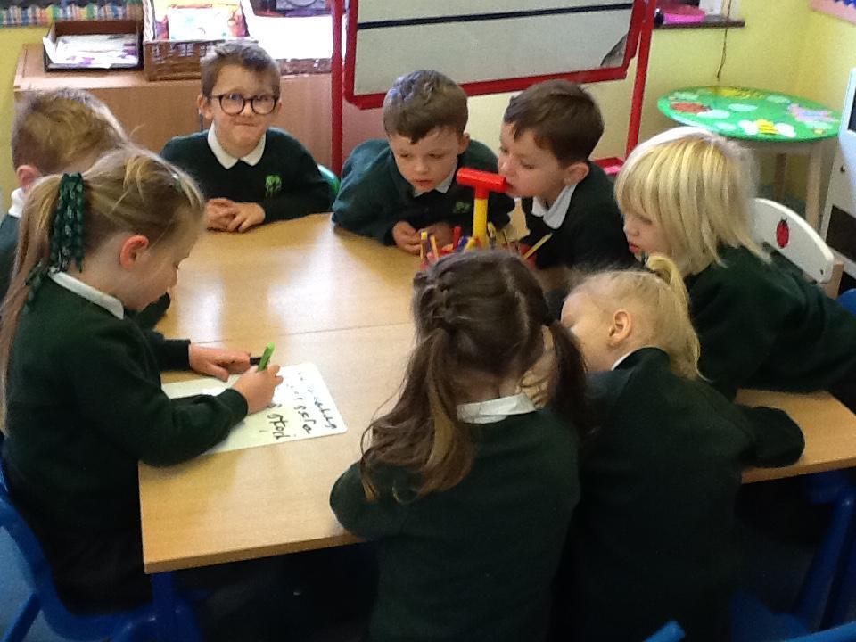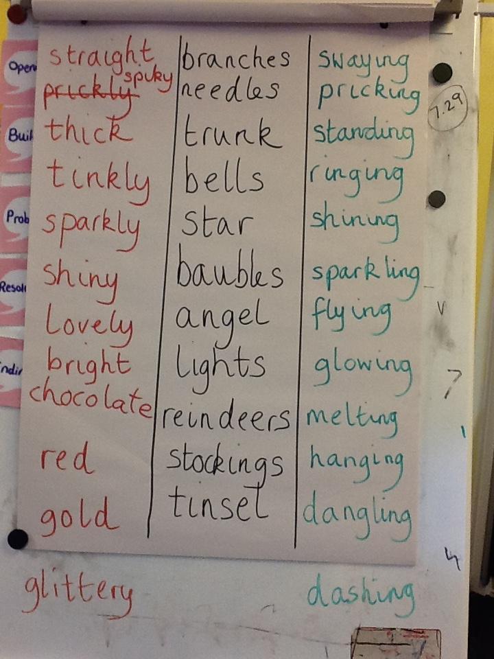 This week the focus is on write a spine poem about Christmas trees. The children worked beautifully in groups thinking up words to put in their poems, with one child acting as secretary. We put the words up on the flipchart and the children each highlighted their favourite line, the most popular being 'chocolate reindeers melting'.