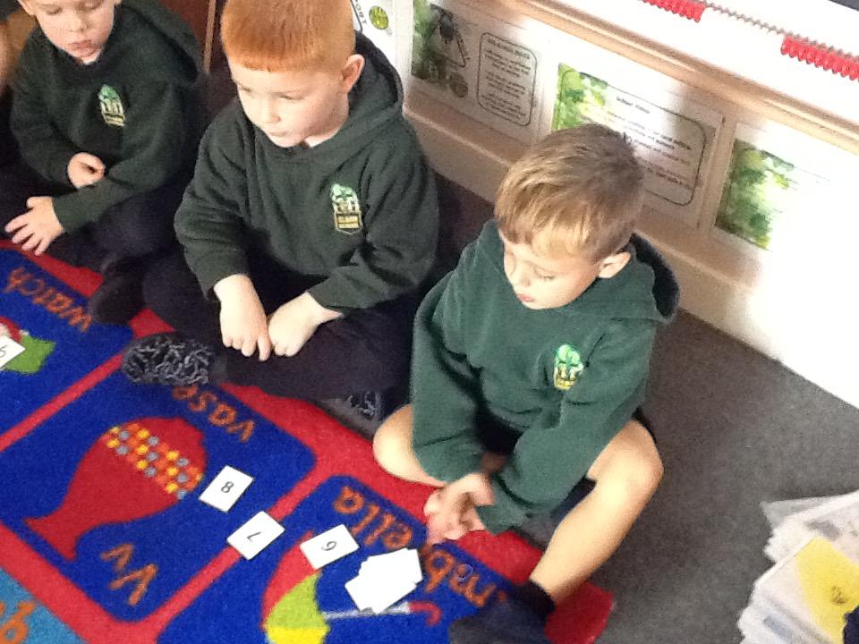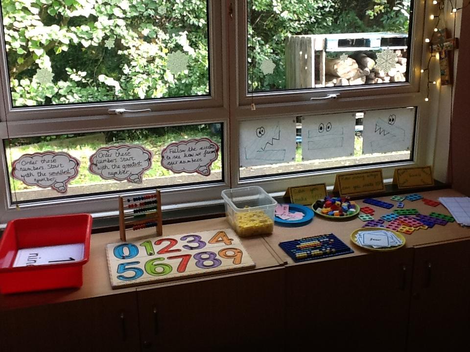 This is our Maths Working Area. The children can come and choose any activity to practise what they have been learning during the week. This week they can order numbers, find different ways of making ten and remind themselves where they must begin each numbe when they write it. The tasks will change as their learning progresses.