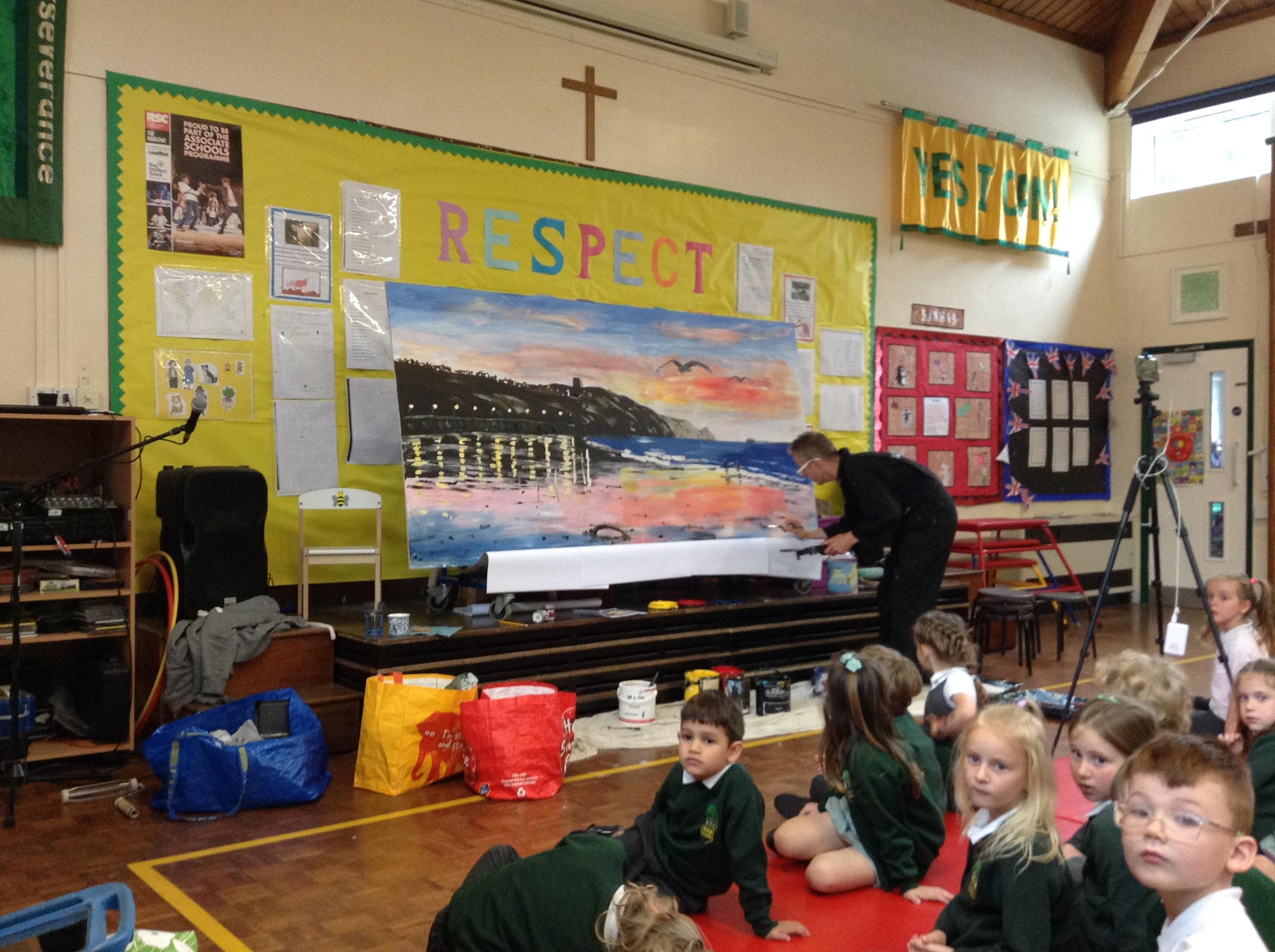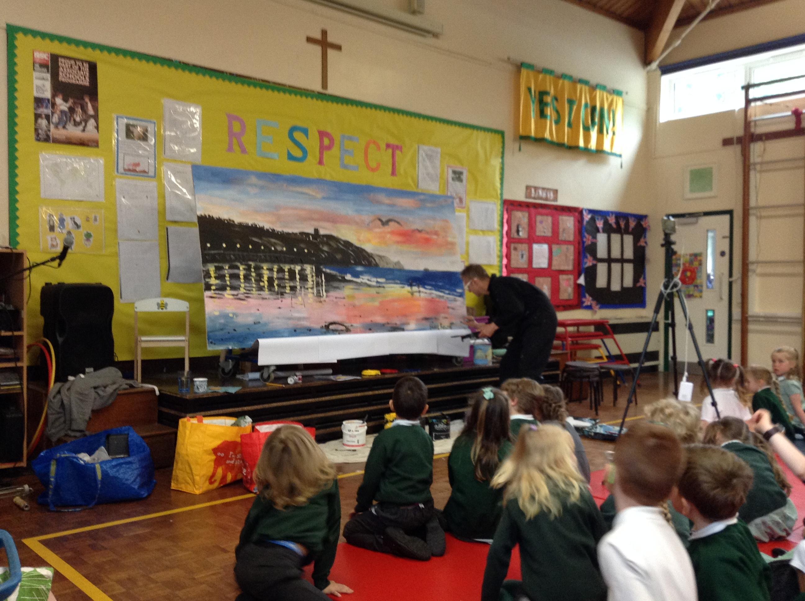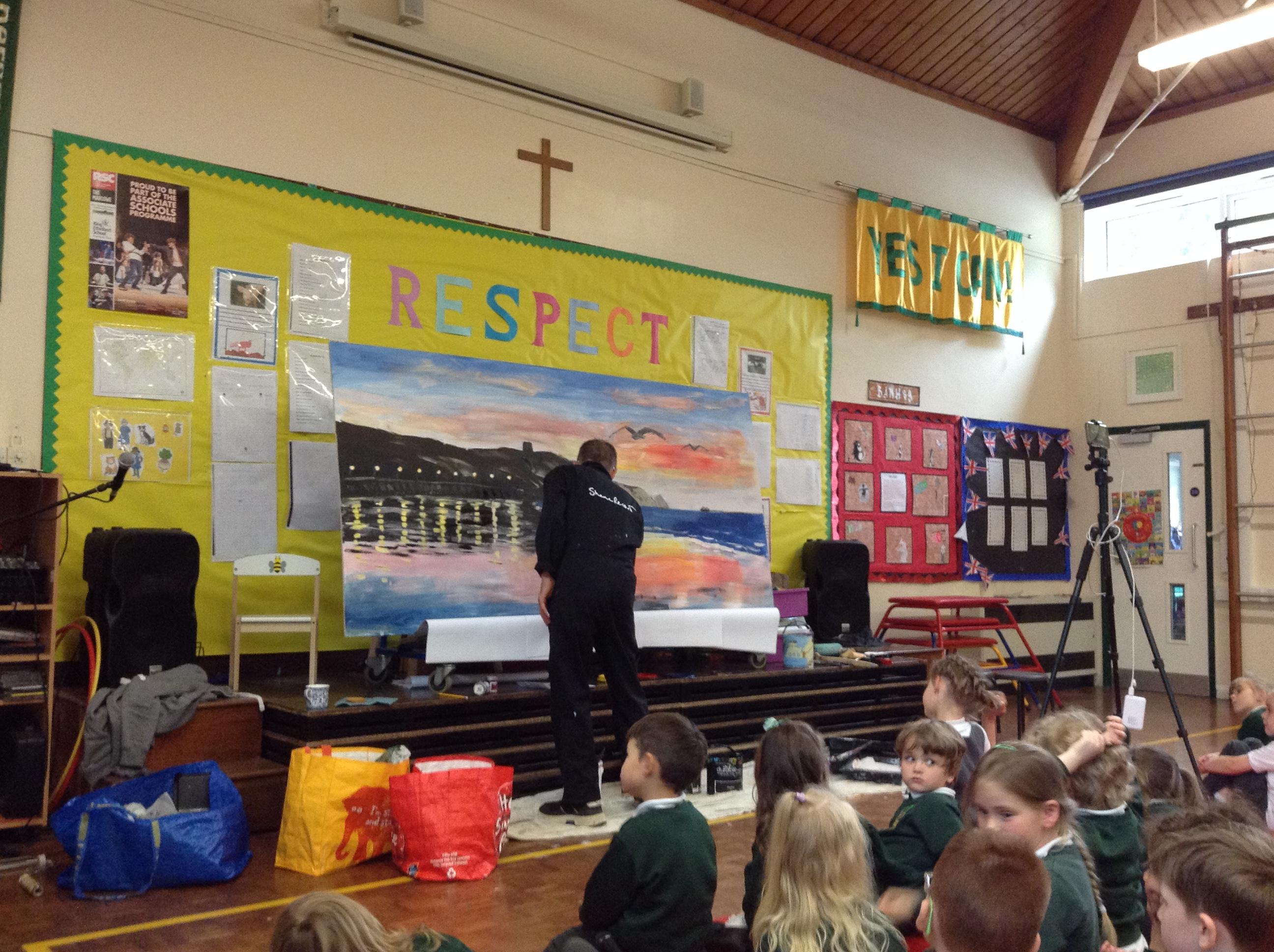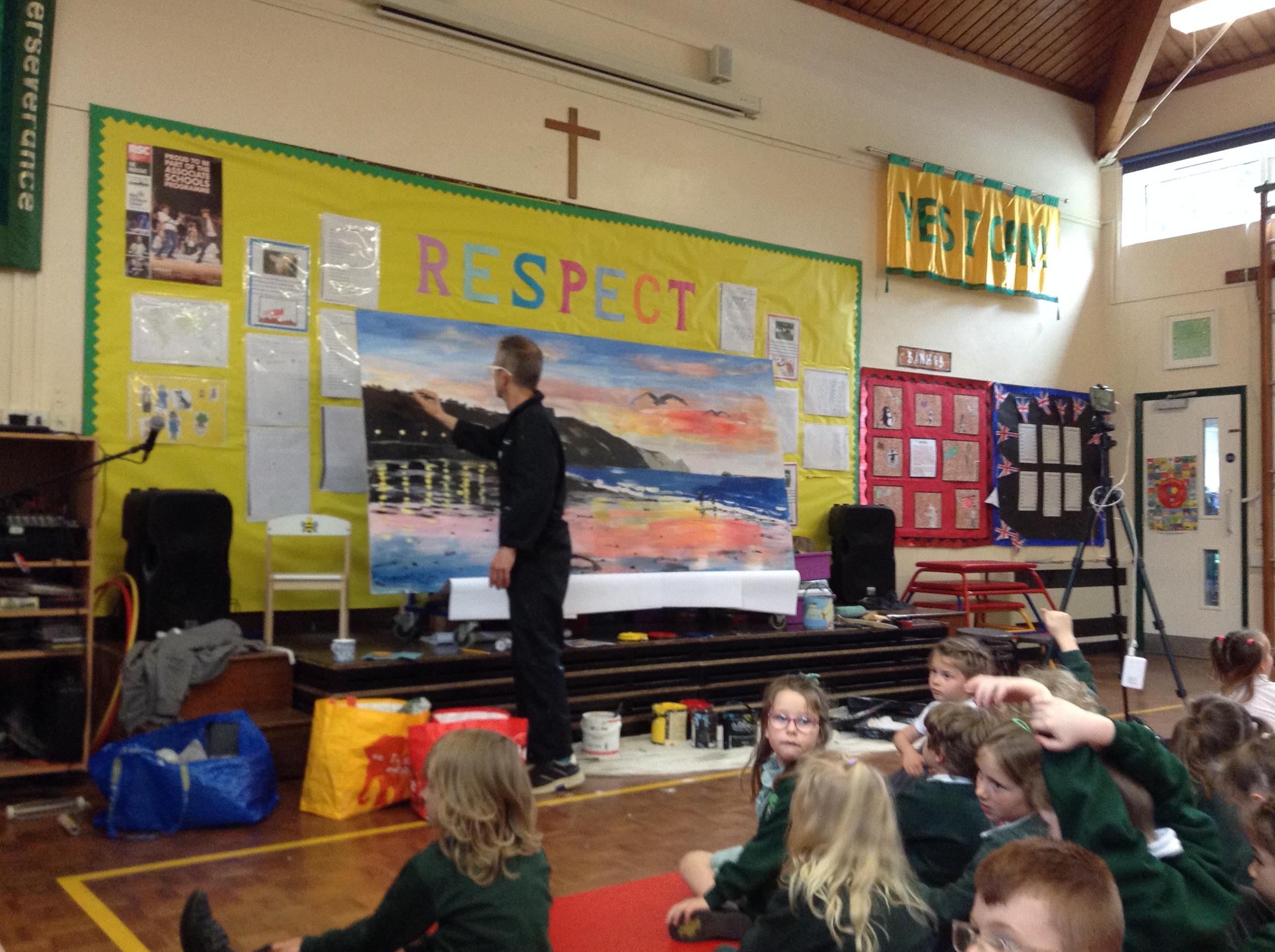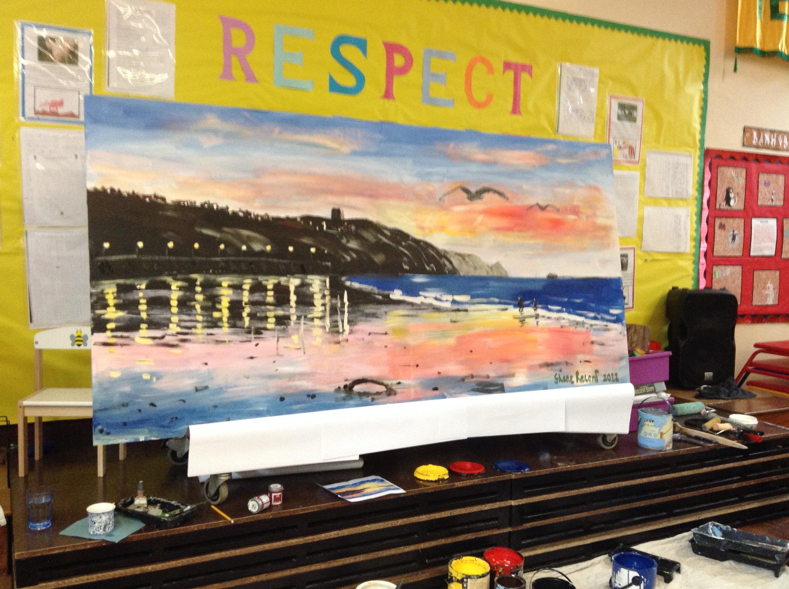 What a fun week we have had! It was SKY Arts Week, with lots of really interesting resources to download, from 2D print making to drama, dance and poetry. We were also fortunate to have Annie Begley doing pottery workshops in the Forest School hut, on Thursday and Kevin teaching the children djembe drumming and Laura teaching modern dance on Friday. On Tuesday, Shane Record painted a huge landscape mural of Sunny Sands in the hall. It was incredible to see the picture emerge before our eyes and the children and teachers were enthralled!