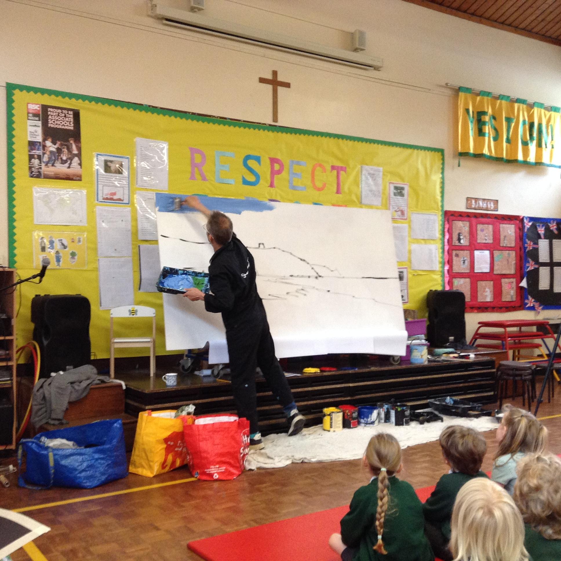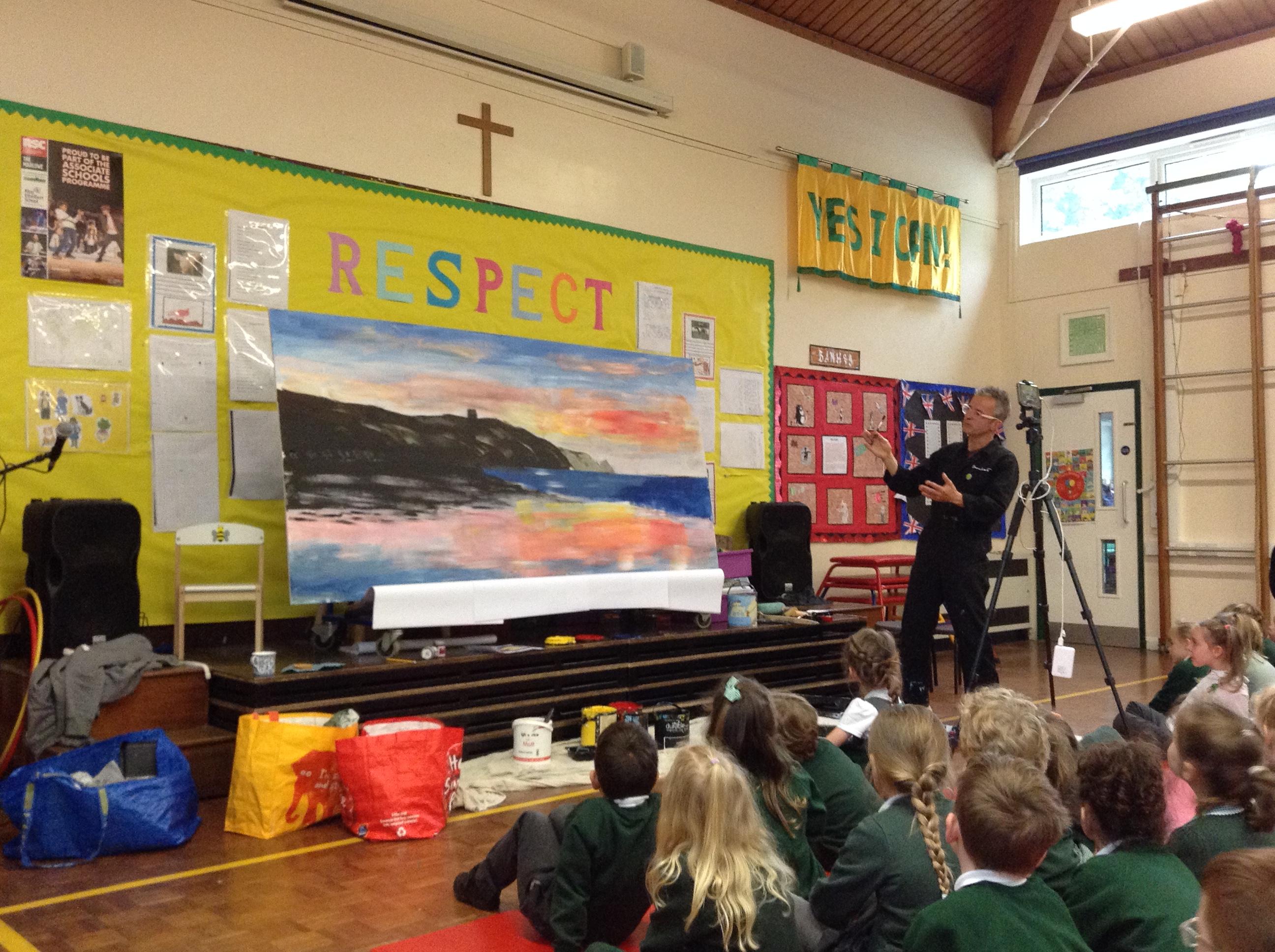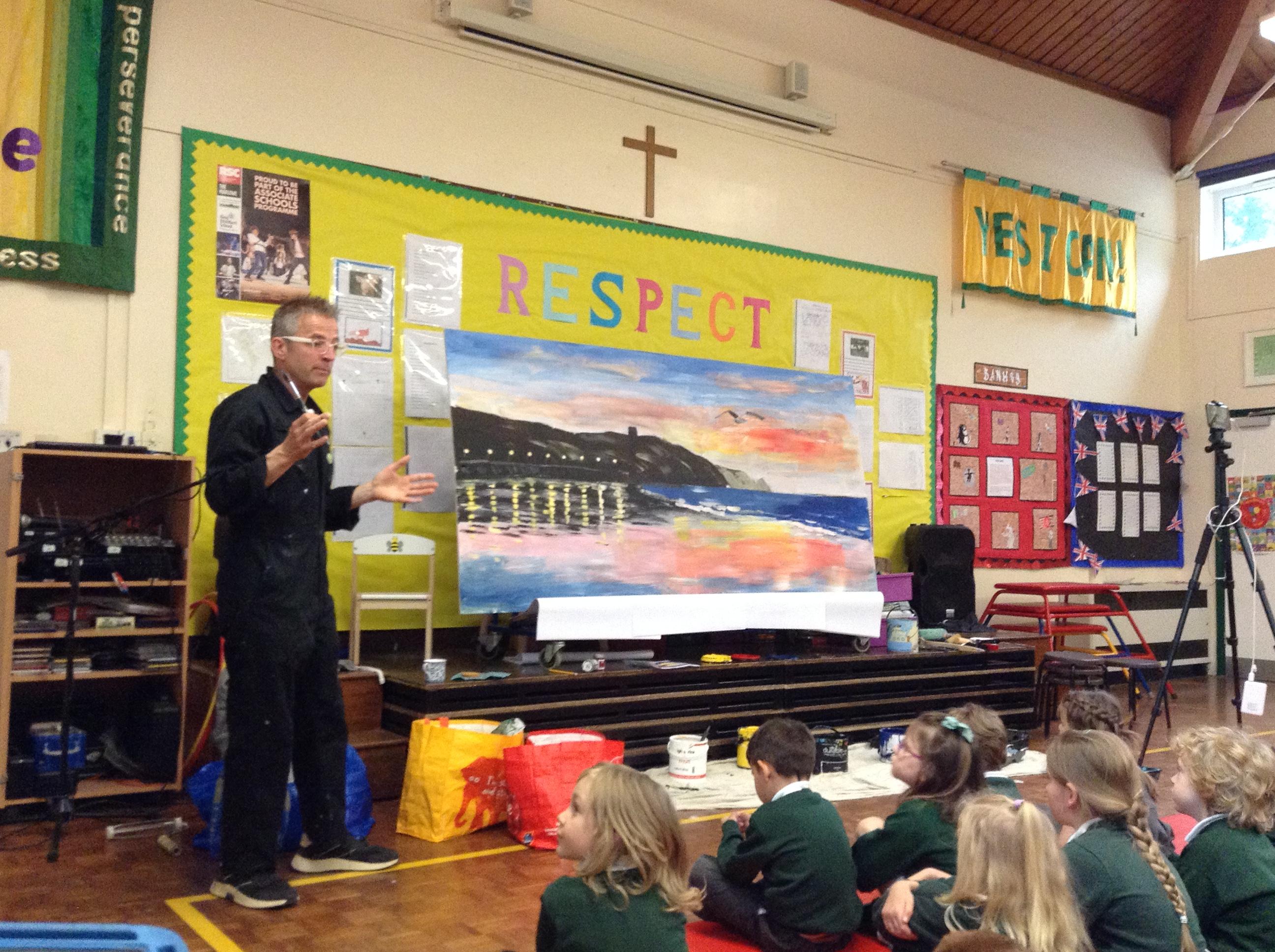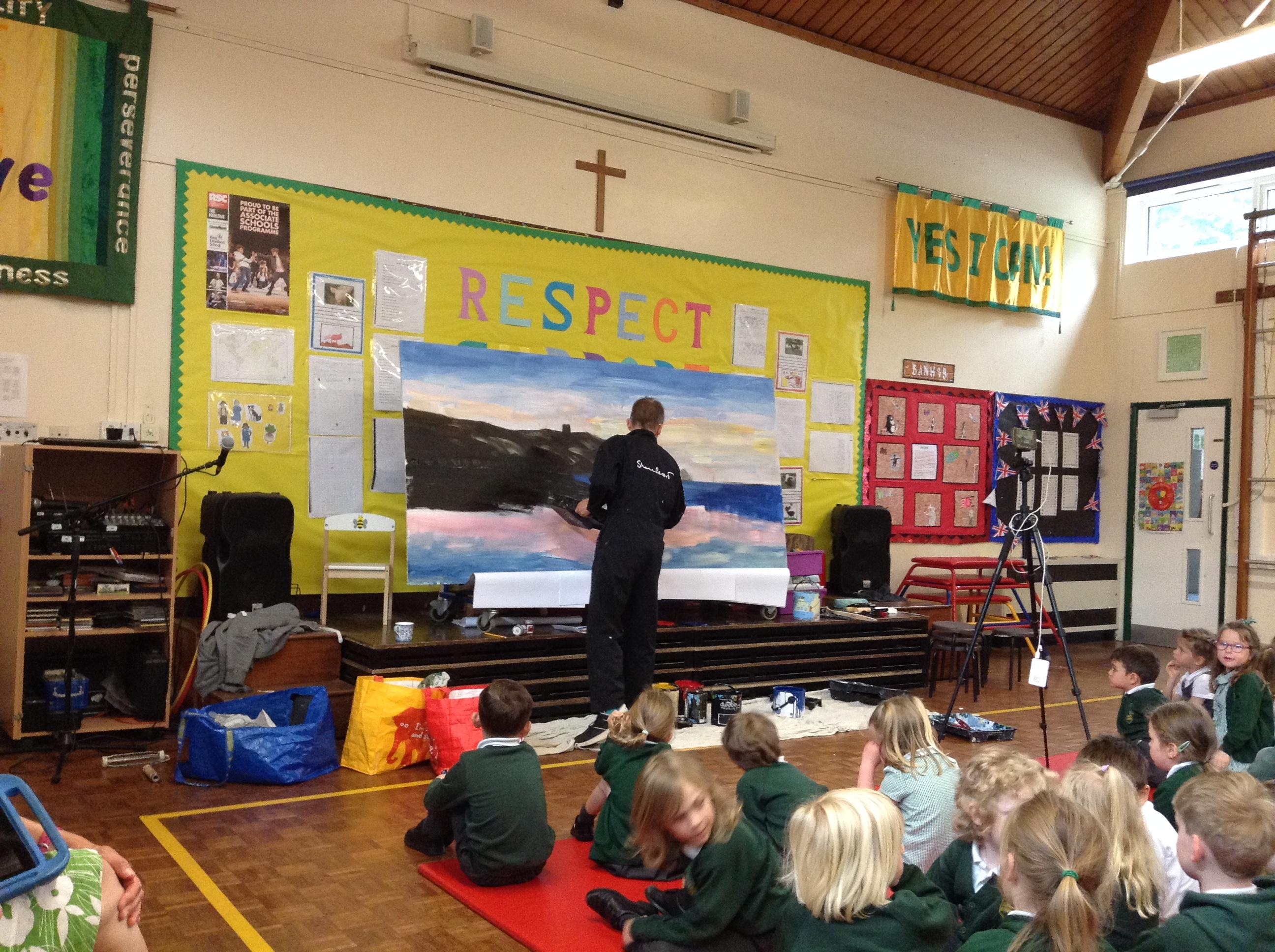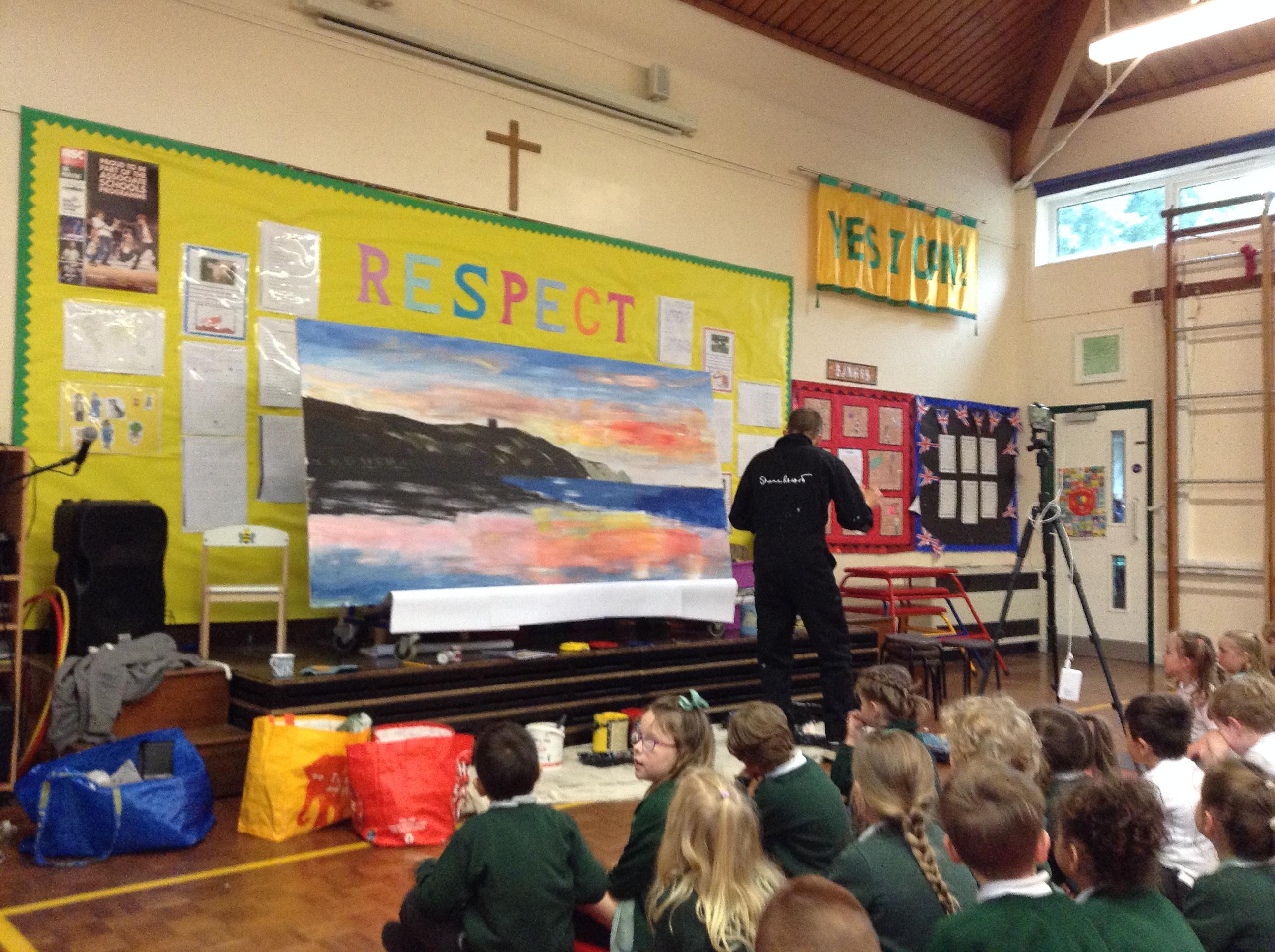 What a fun week we have had! It was SKY Arts Week, with lots of really interesting resources to download, from 2D print making to drama, dance and poetry. We were also fortunate to have Annie Begley doing pottery workshops in the Forest School hut, on Thursday and Kevin teaching the children djembe drumming and Laura teaching modern dance on Friday. On Tuesday, Shane Record painted a huge landscape mural of Sunny Sands in the hall. It was incredible to see the picture emerge before our eyes and the children and teachers were enthralled!