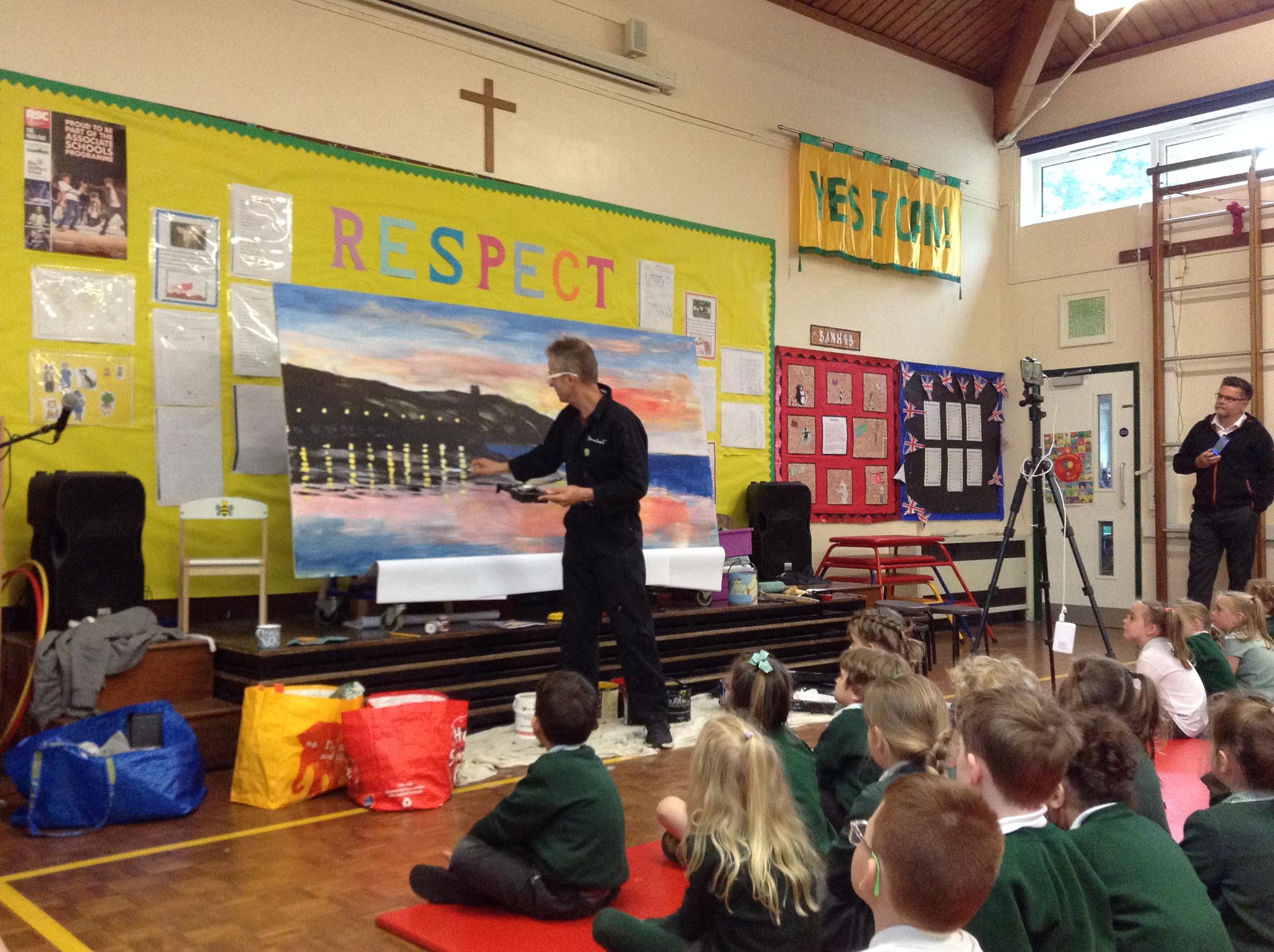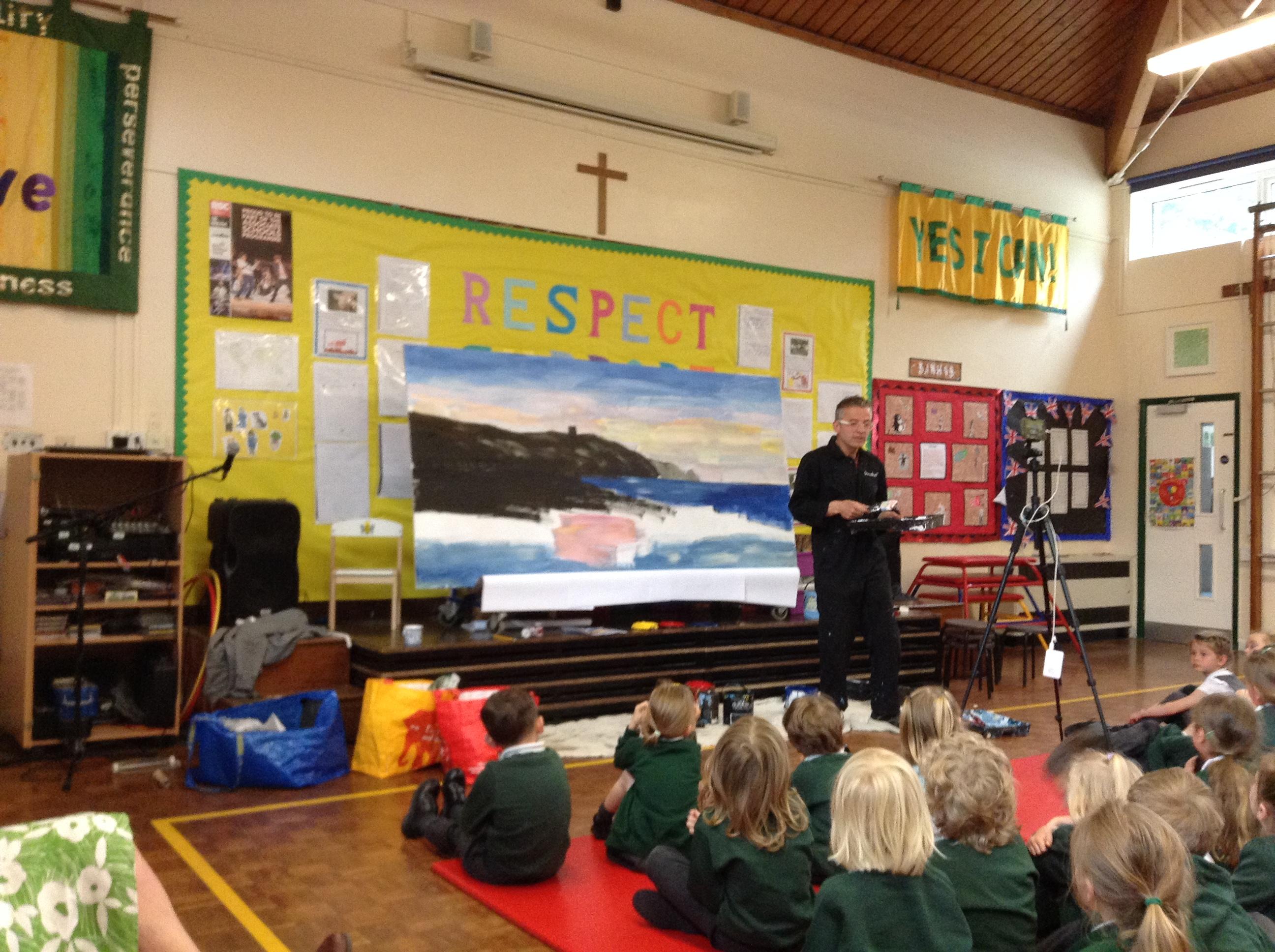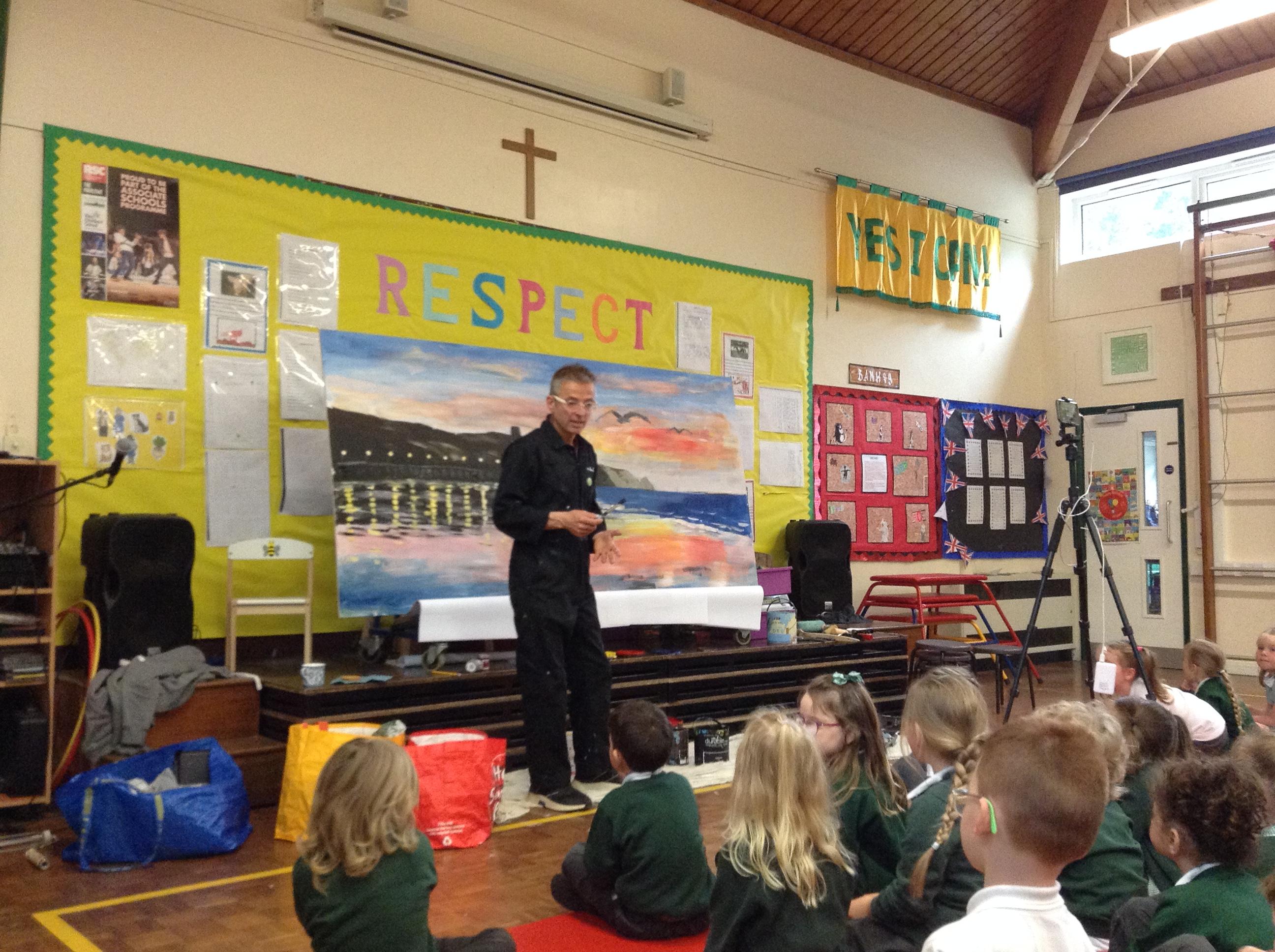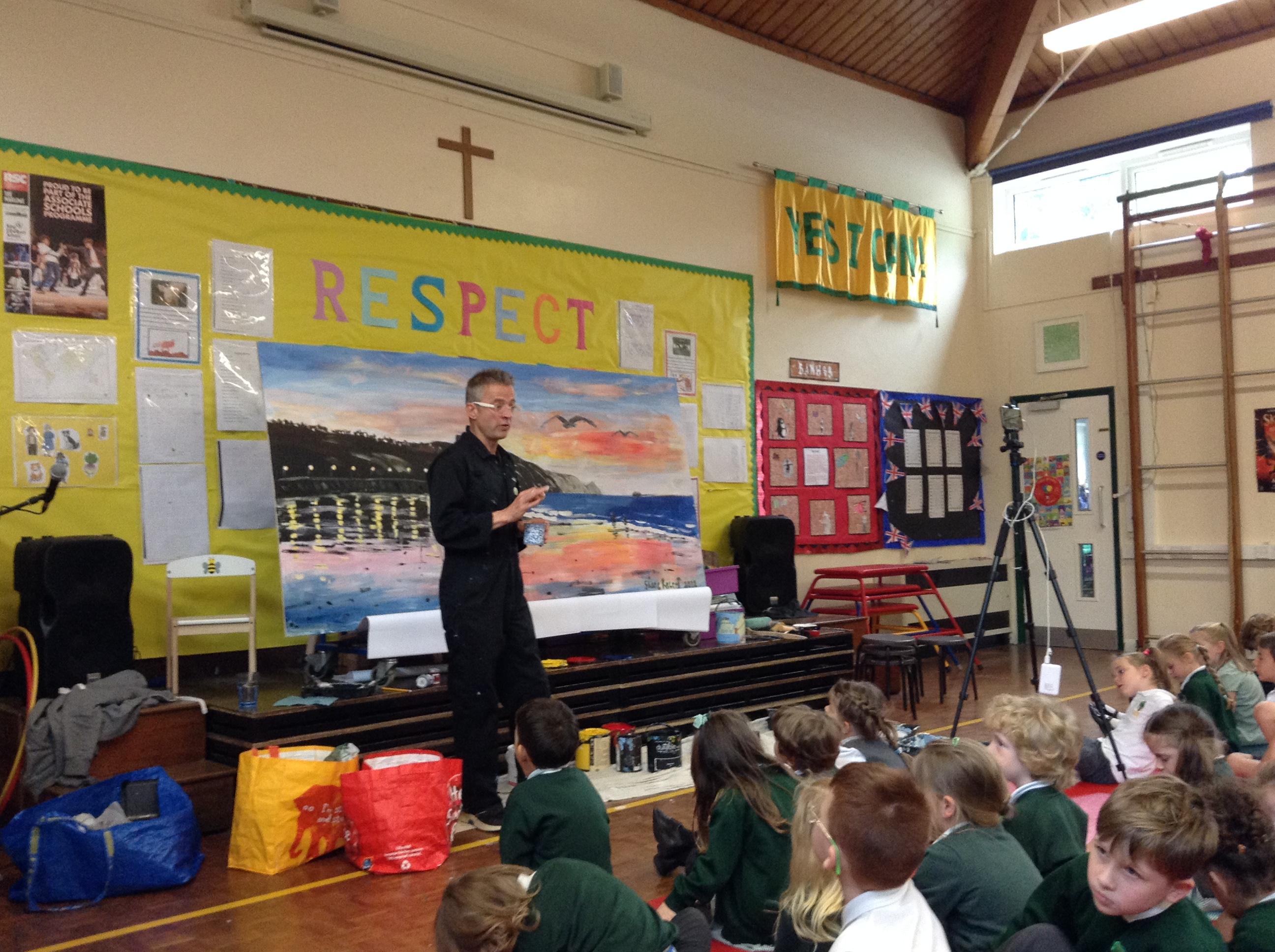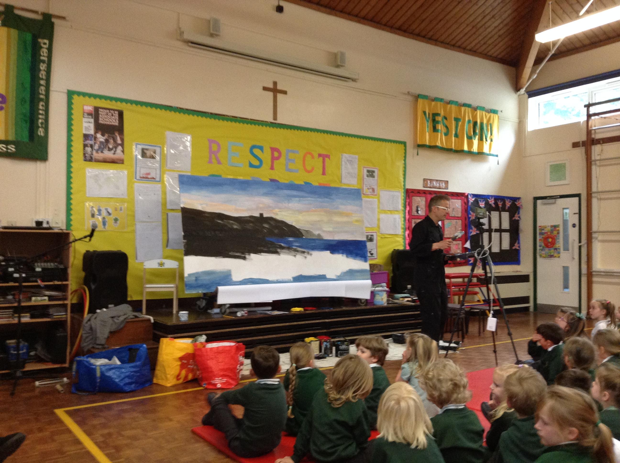 What a fun week we have had! It was SKY Arts Week, with lots of really interesting resources to download, from 2D print making to drama, dance and poetry. We were also fortunate to have Annie Begley doing pottery workshops in the Forest School hut, on Thursday and Kevin teaching the children djembe drumming and Laura teaching modern dance on Friday. On Tuesday, Shane Record painted a huge landscape mural of Sunny Sands in the hall. It was incredible to see the picture emerge before our eyes and the children and teachers were enthralled!