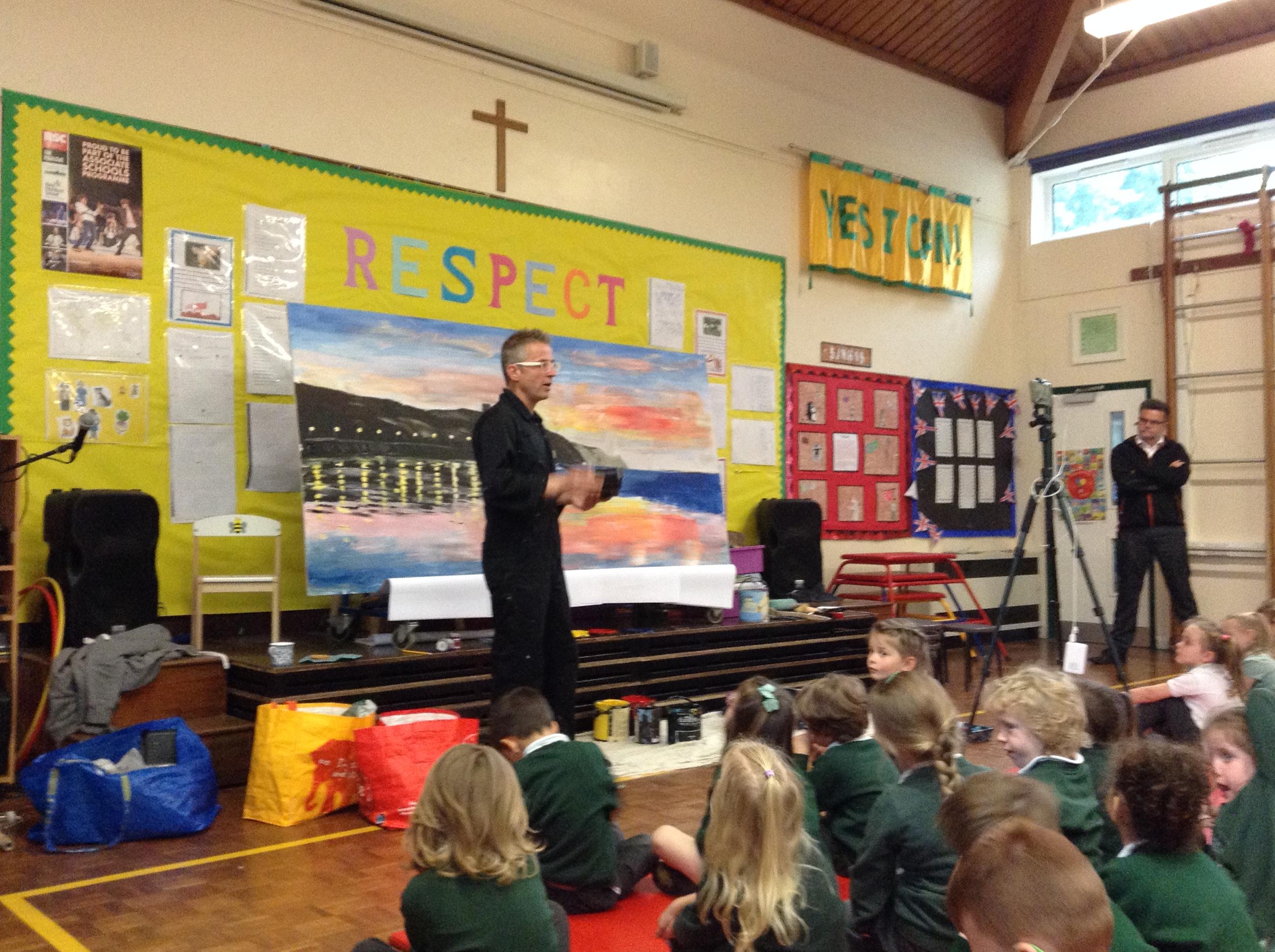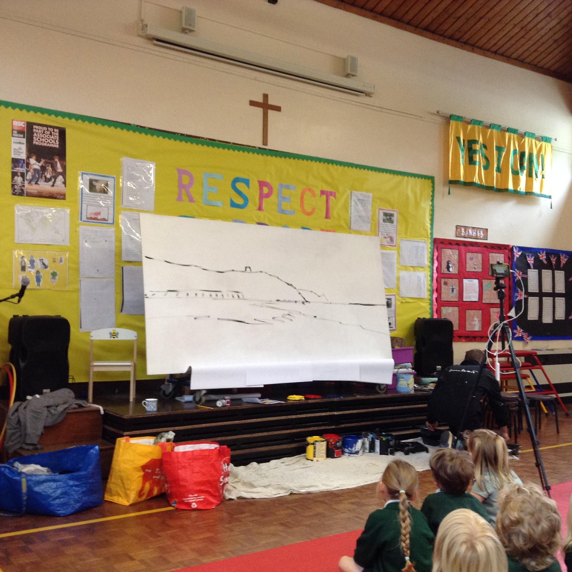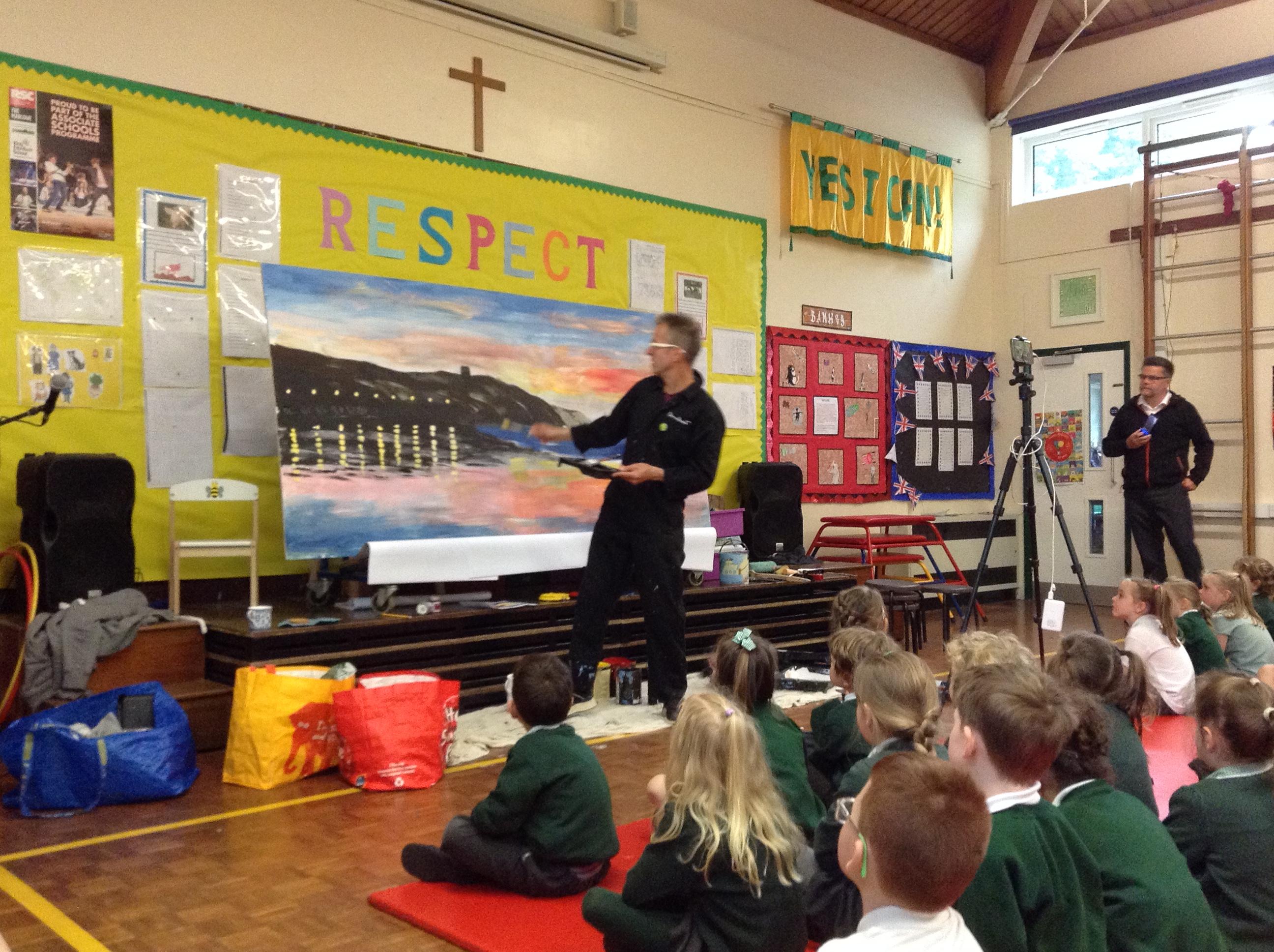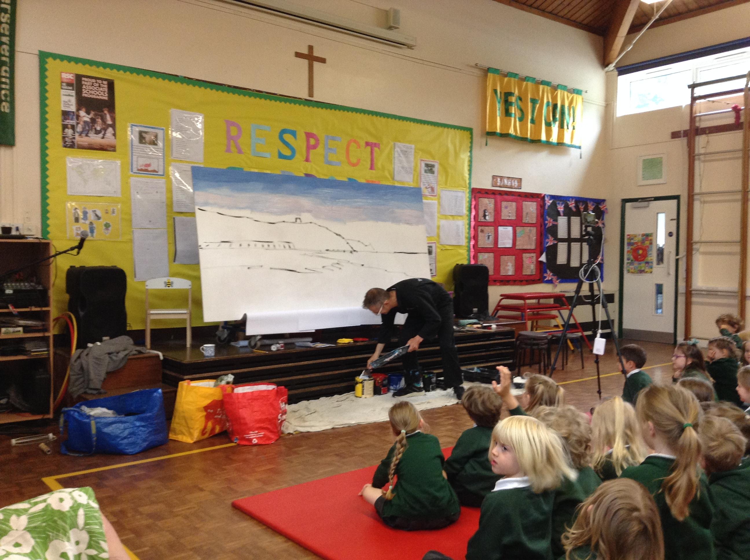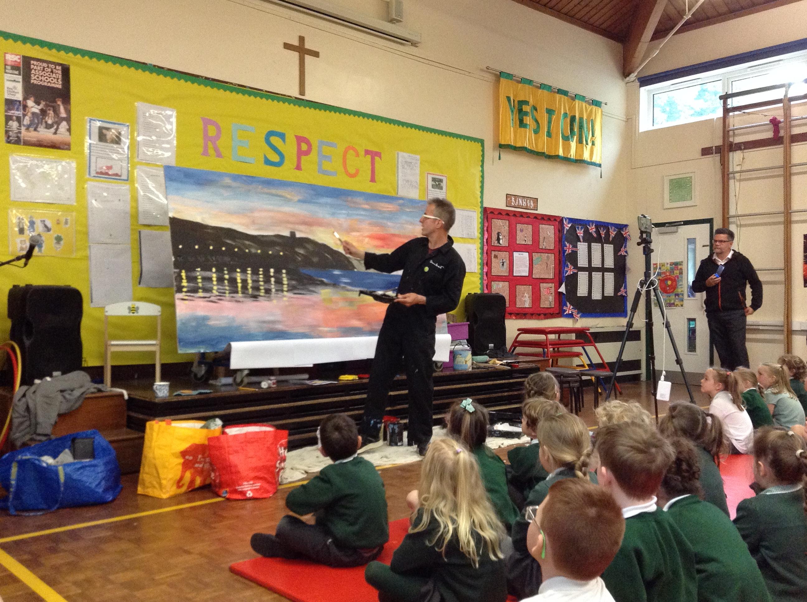 What a fun week we have had! It was SKY Arts Week, with lots of really interesting resources to download, from 2D print making to drama, dance and poetry. We were also fortunate to have Annie Begley doing pottery workshops in the Forest School hut, on Thursday and Kevin teaching the children djembe drumming and Laura teaching modern dance on Friday. On Tuesday, Shane Record painted a huge landscape mural of Sunny Sands in the hall. It was incredible to see the picture emerge before our eyes and the children and teachers were enthralled!