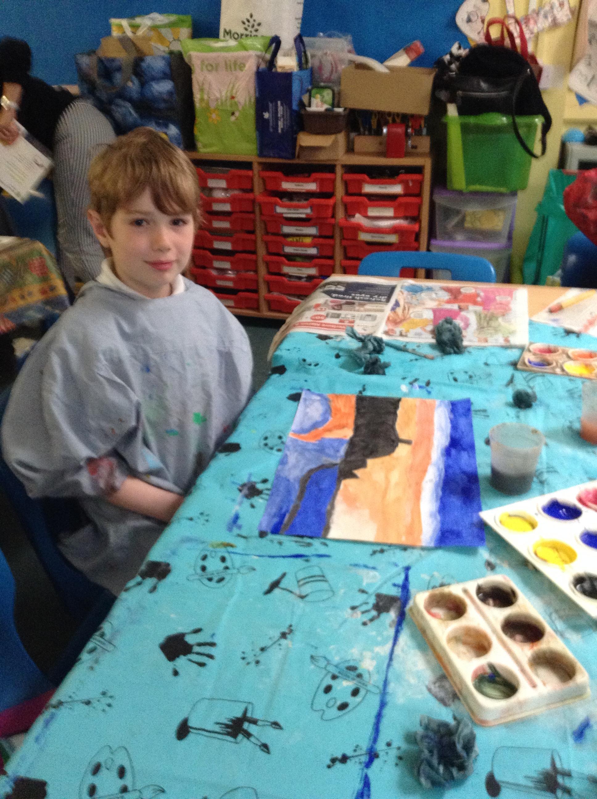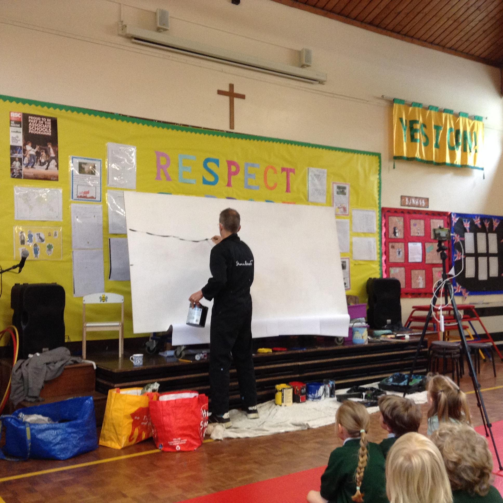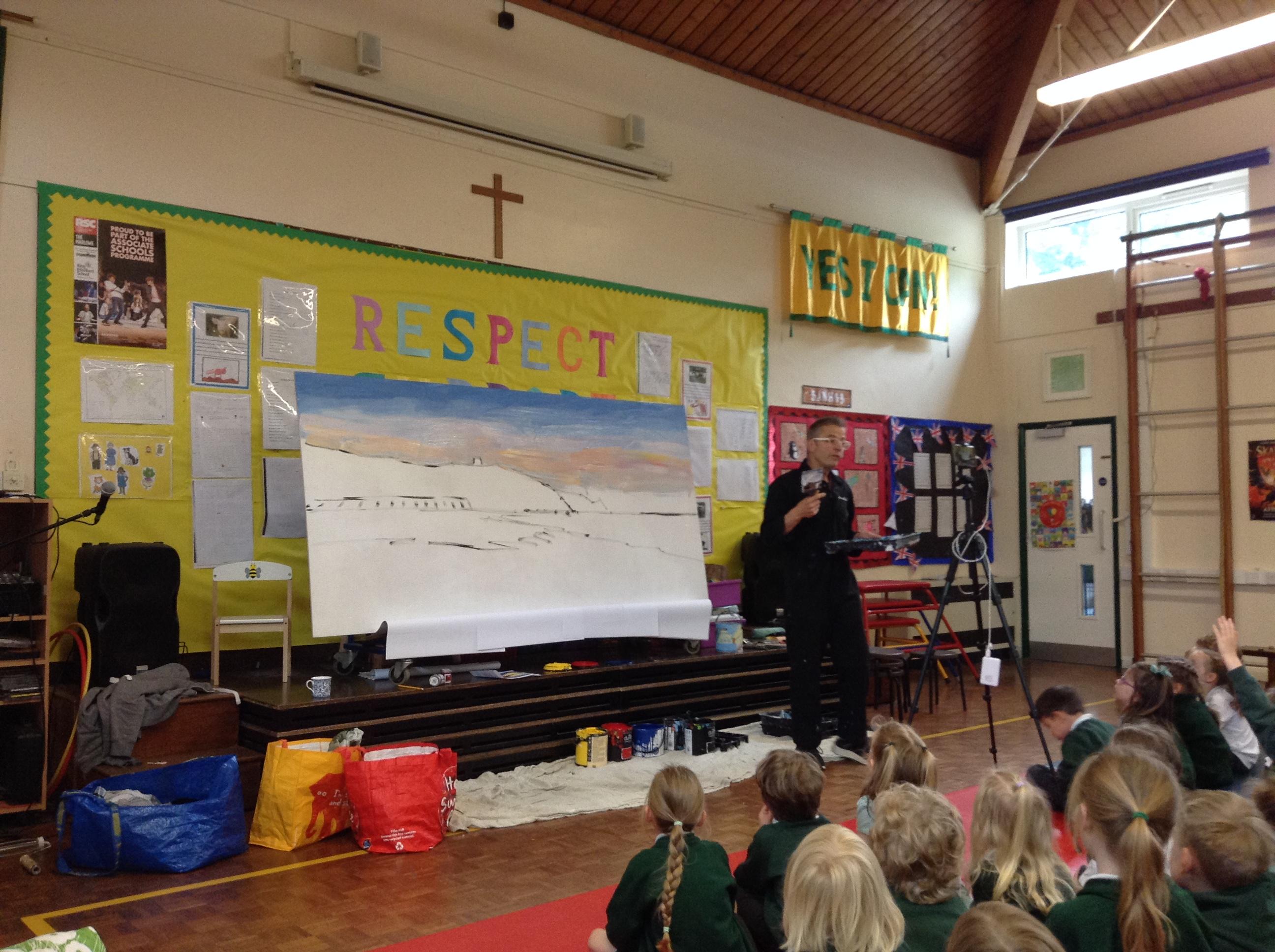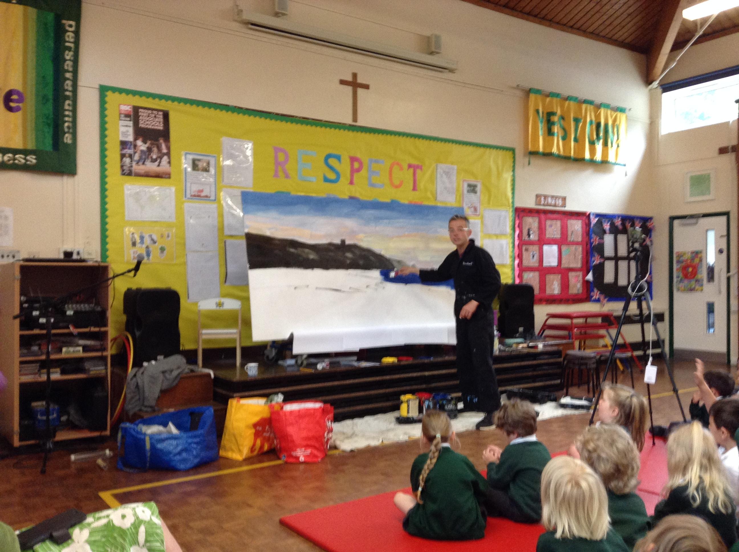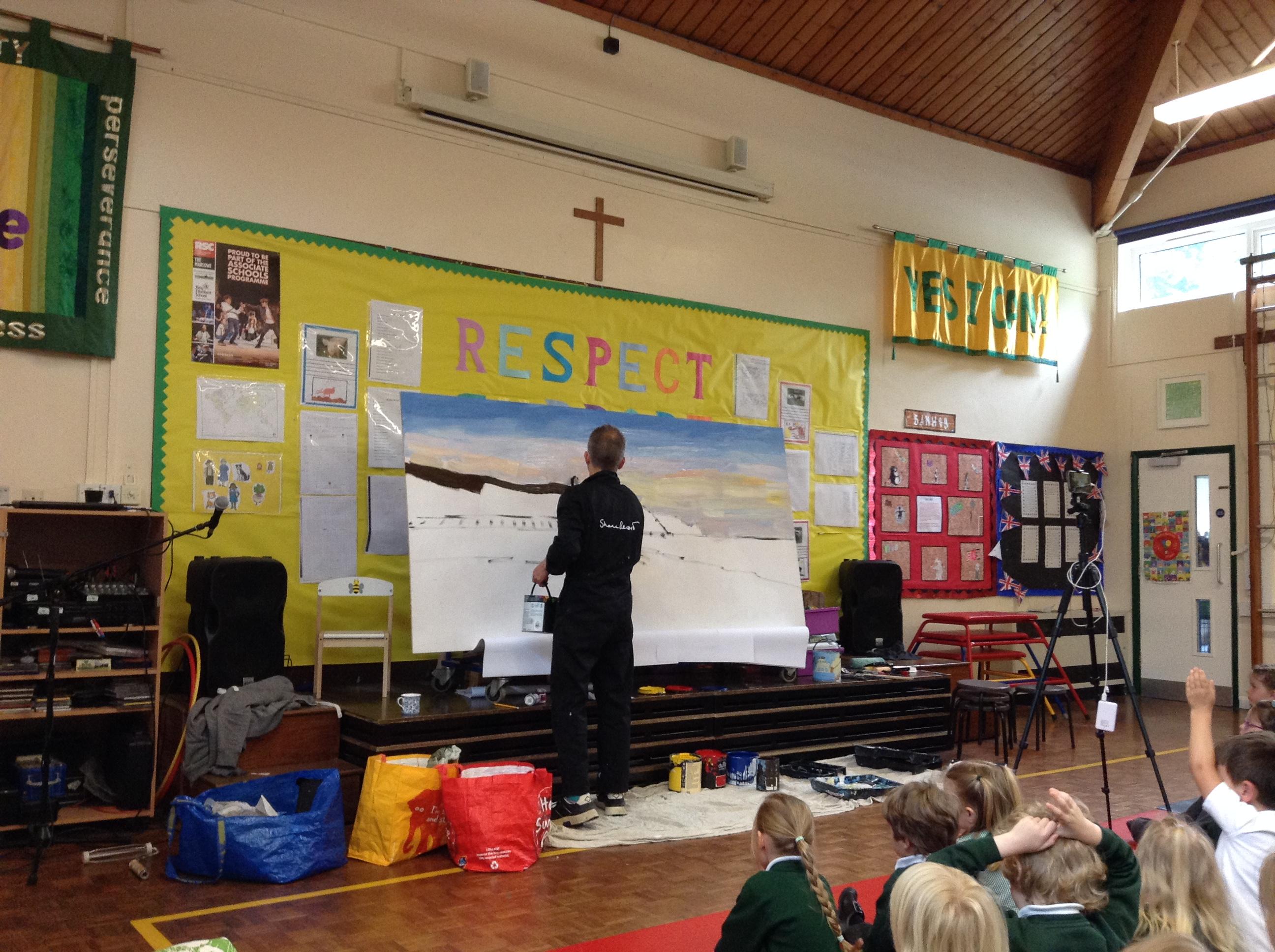 What a fun week we have had! It was SKY Arts Week, with lots of really interesting resources to download, from 2D print making to drama, dance and poetry. We were also fortunate to have Annie Begley doing pottery workshops in the Forest School hut, on Thursday and Kevin teaching the children djembe drumming and Laura teaching modern dance on Friday. On Tuesday, Shane Record painted a huge landscape mural of Sunny Sands in the hall. It was incredible to see the picture emerge before our eyes and the children and teachers were enthralled!