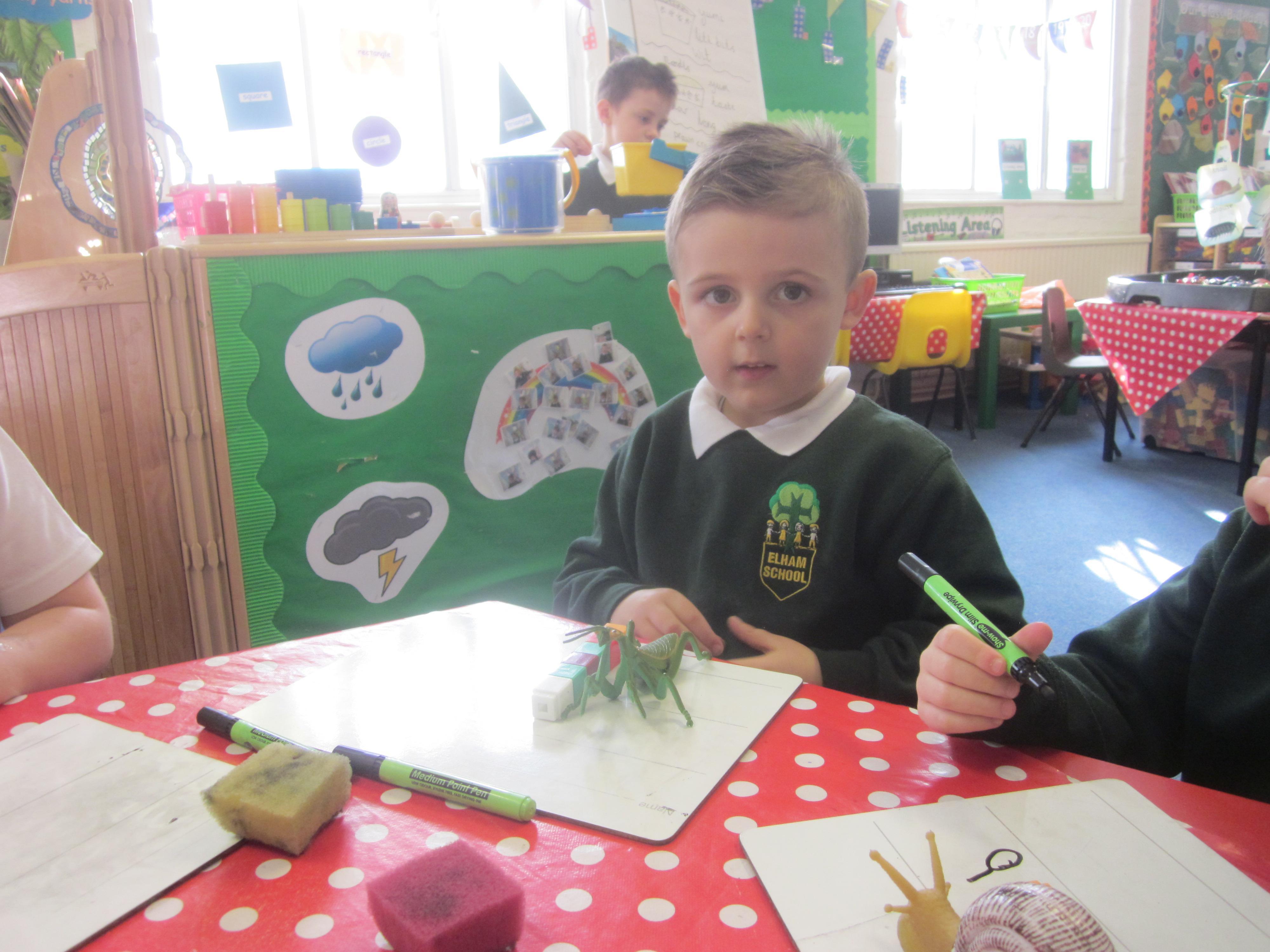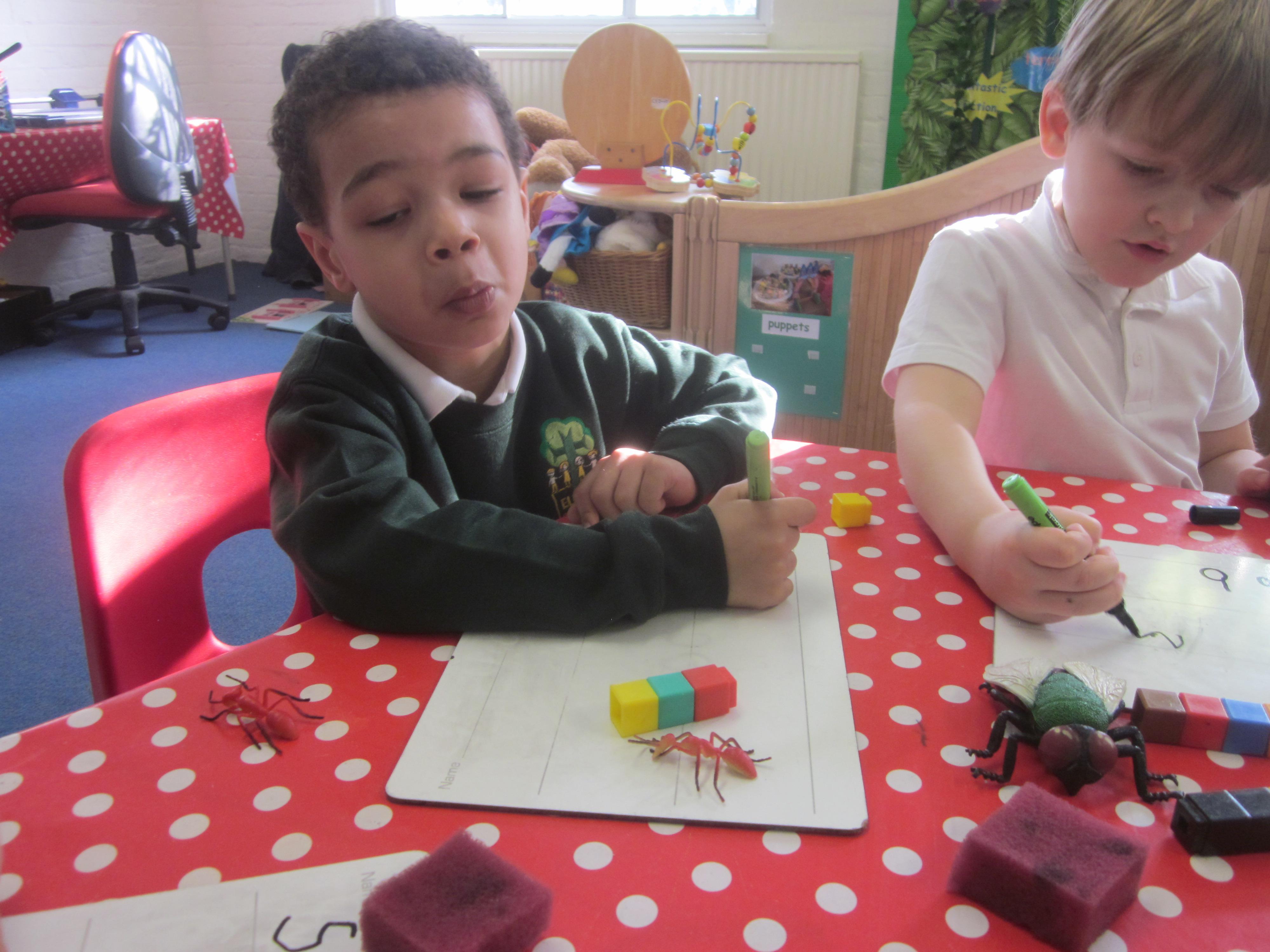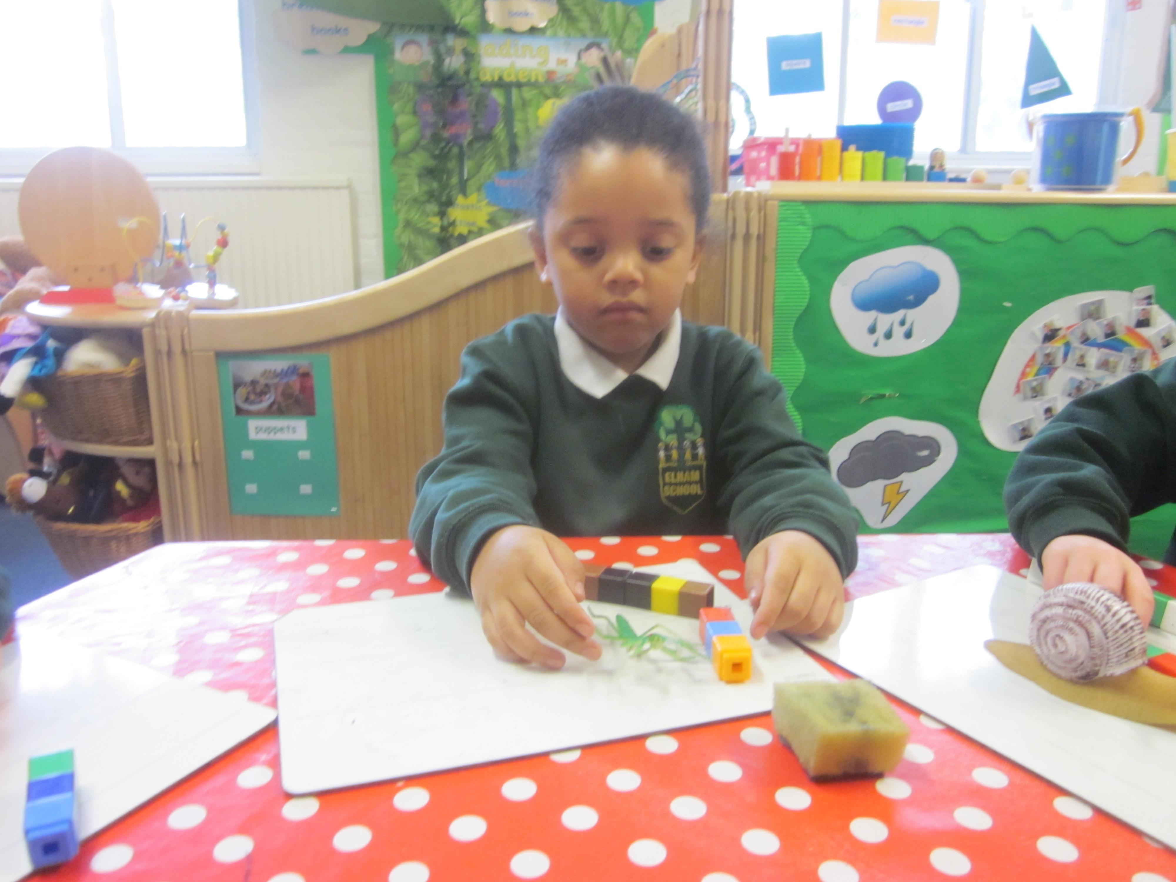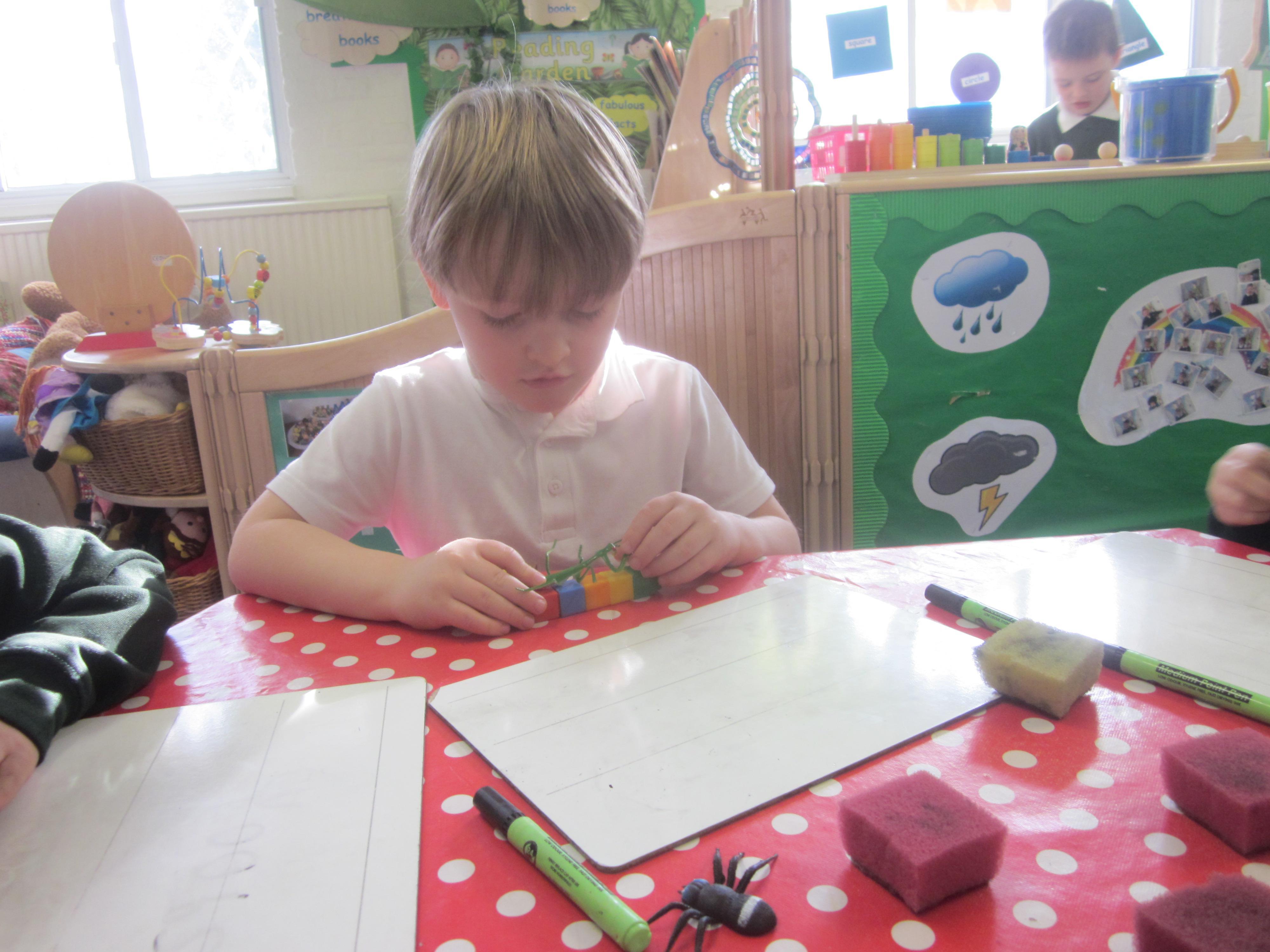 Our learning this week has been all about mini beasts. We started off the week with our English learning and thought about words to describe mini beasts, adjectives or as we like to say in Acorn Class WOW! words. These have made our writing more interesting and when looking at mini beasts we have been able to say they have 'long legs' or 'hard shell. Our maths learning was all about measuring and using the language longer and shorter. We also learnt that to measure accurately we needed to use a standard unit of measure. We began to record our findings on whiteboards. Our favourite activity was our mini beast hunt, although we didn't find many. Maybe it was a bit cold. We are going to try again in a couple of months and compare our findings.