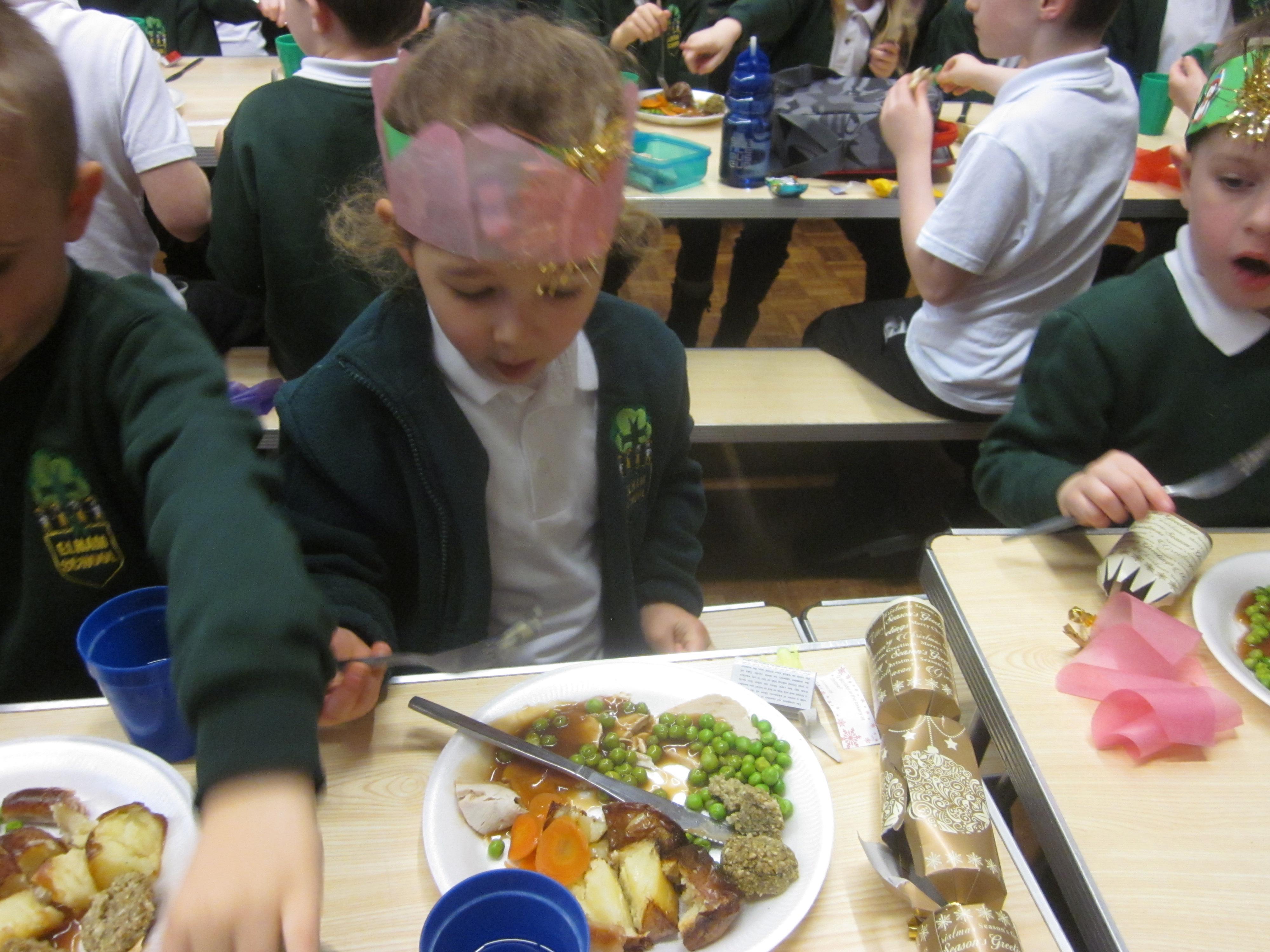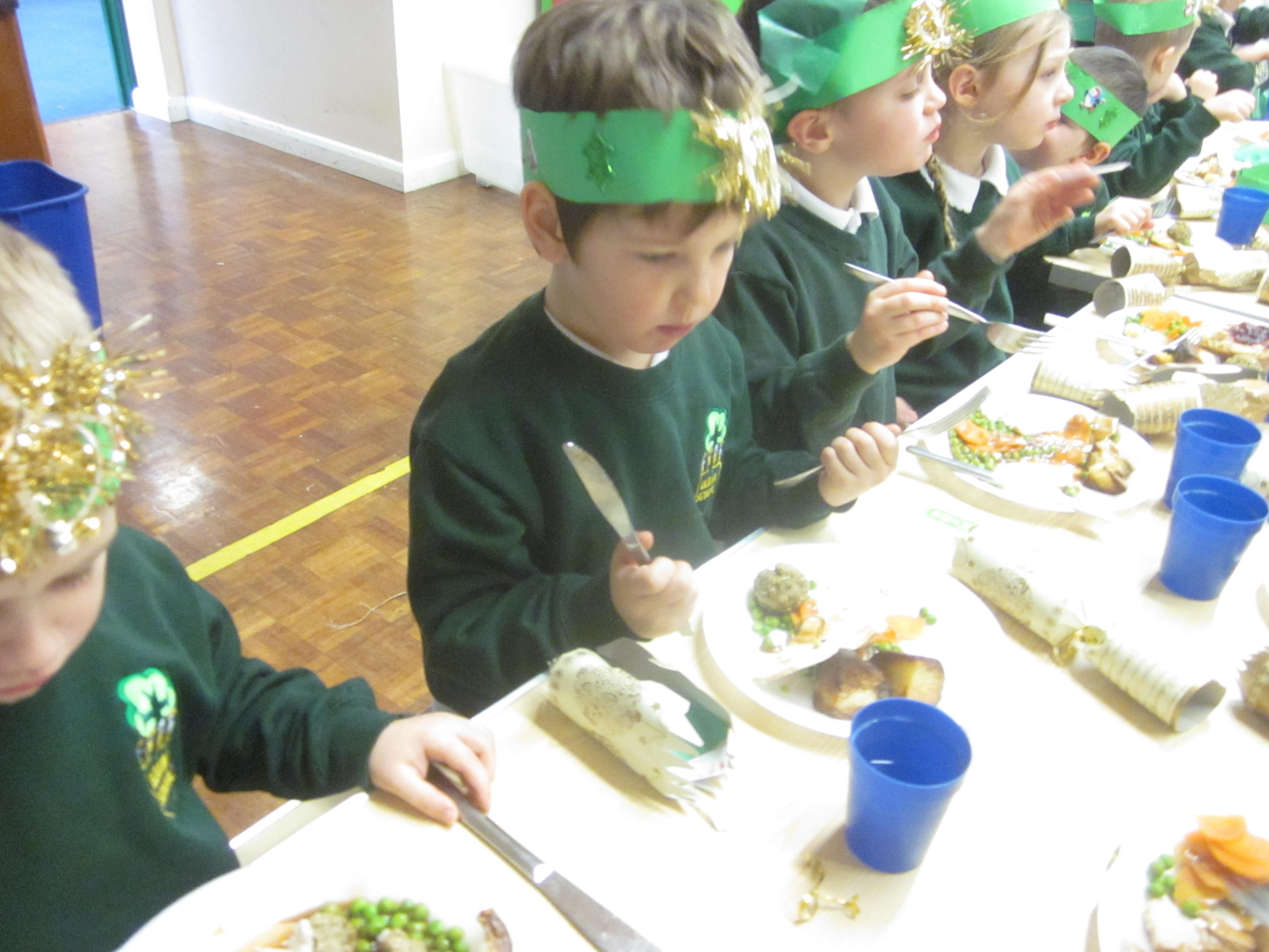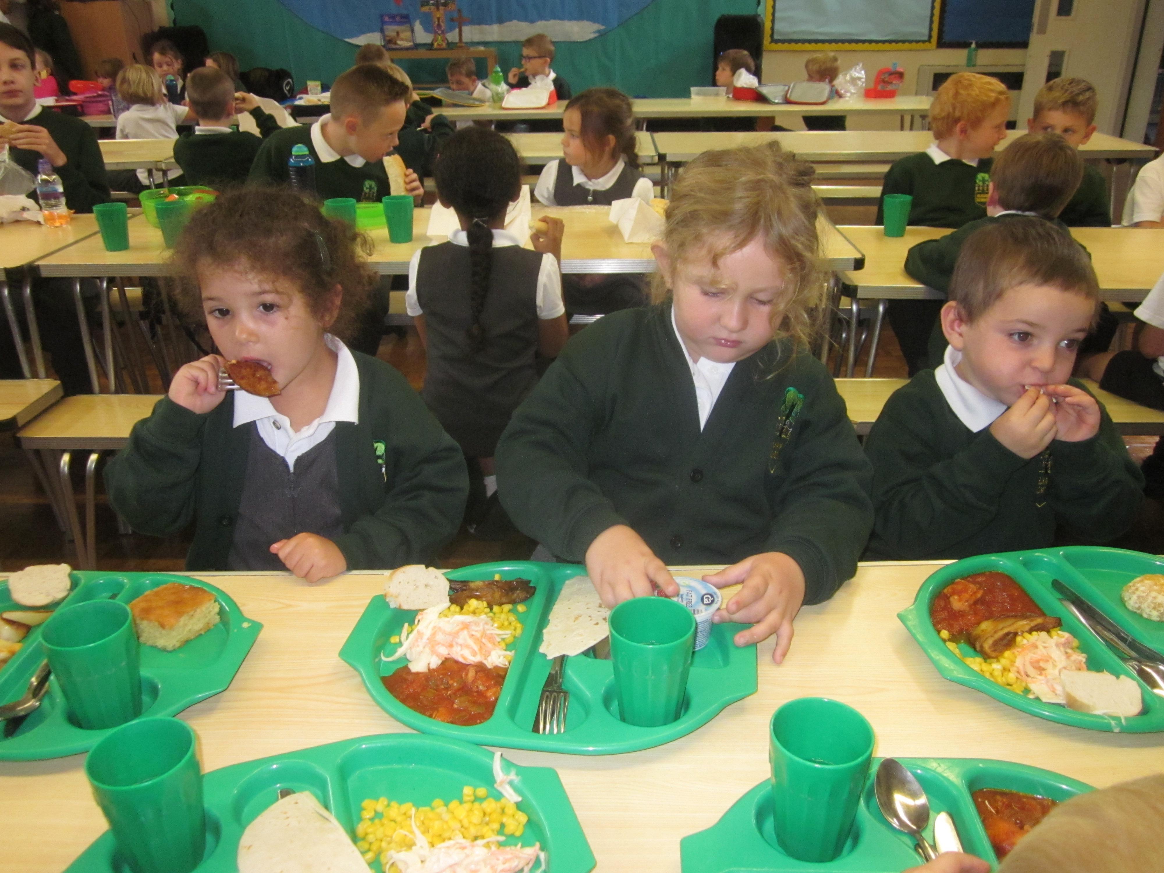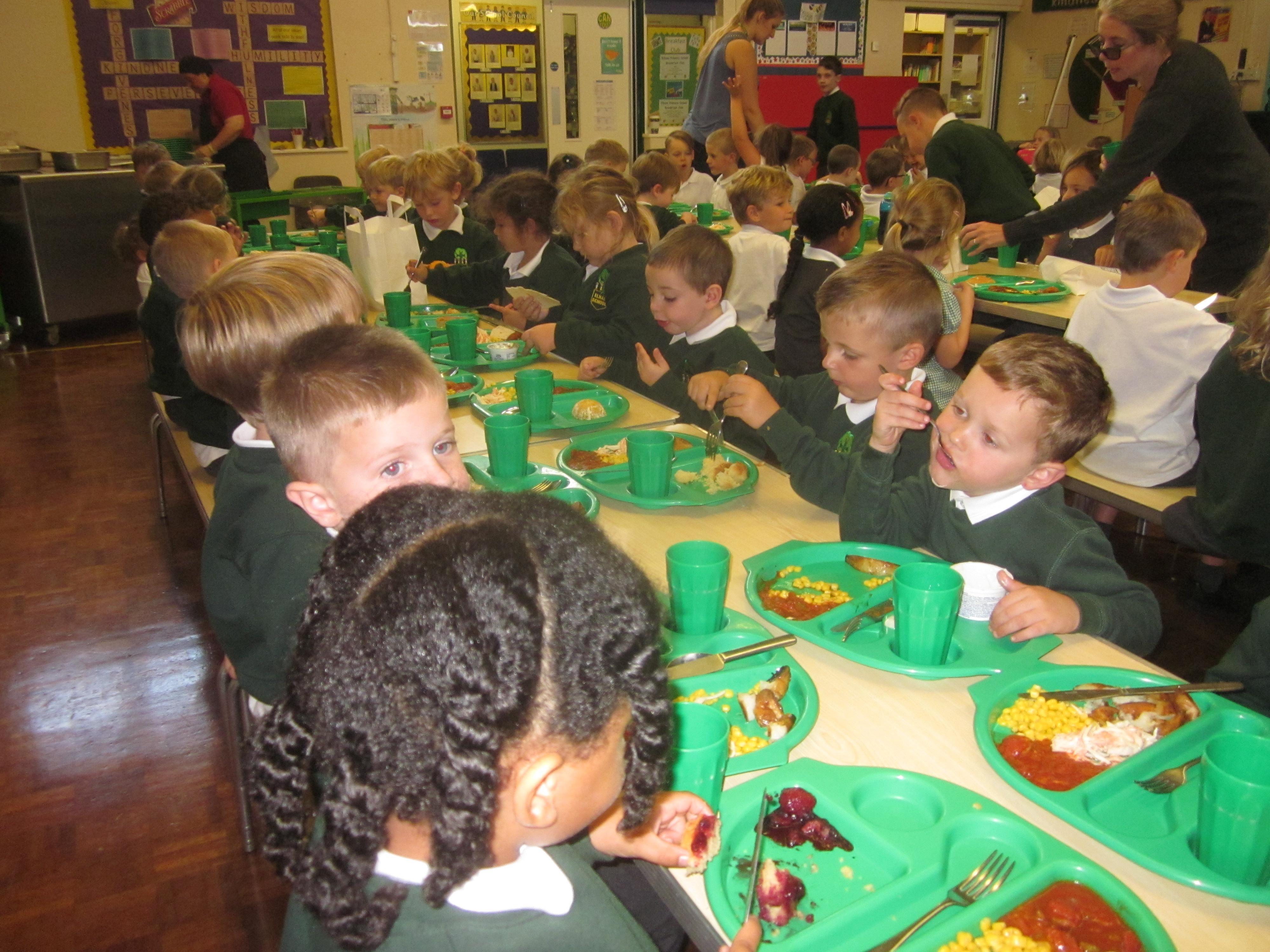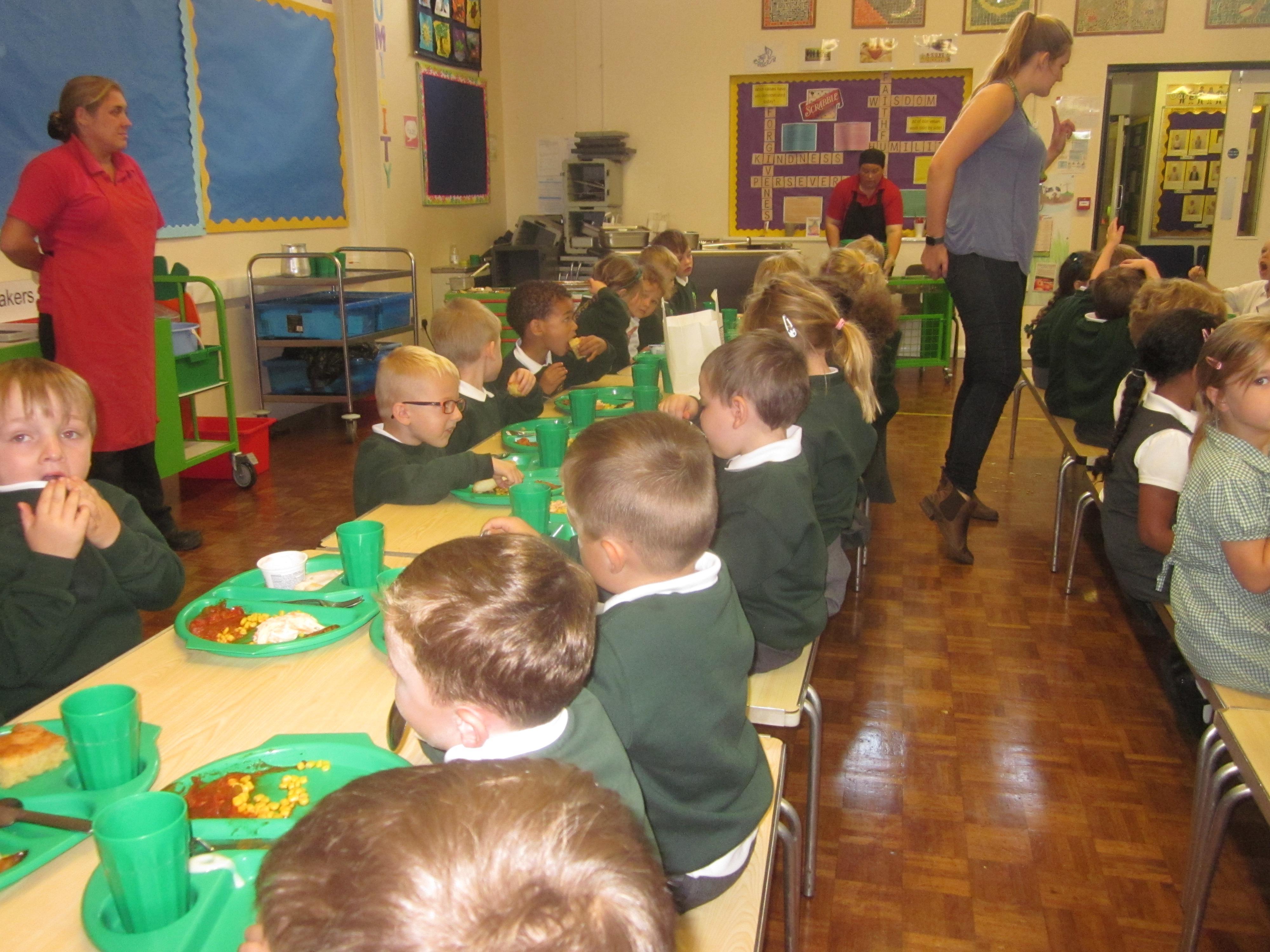 We had our first school dinners this week, which were very yummy! All of the children behaved well and ate their dinners really nicely. We all tried hard to use our knives and forks. Thanks to the Year 6 buddies who were on hand to help.