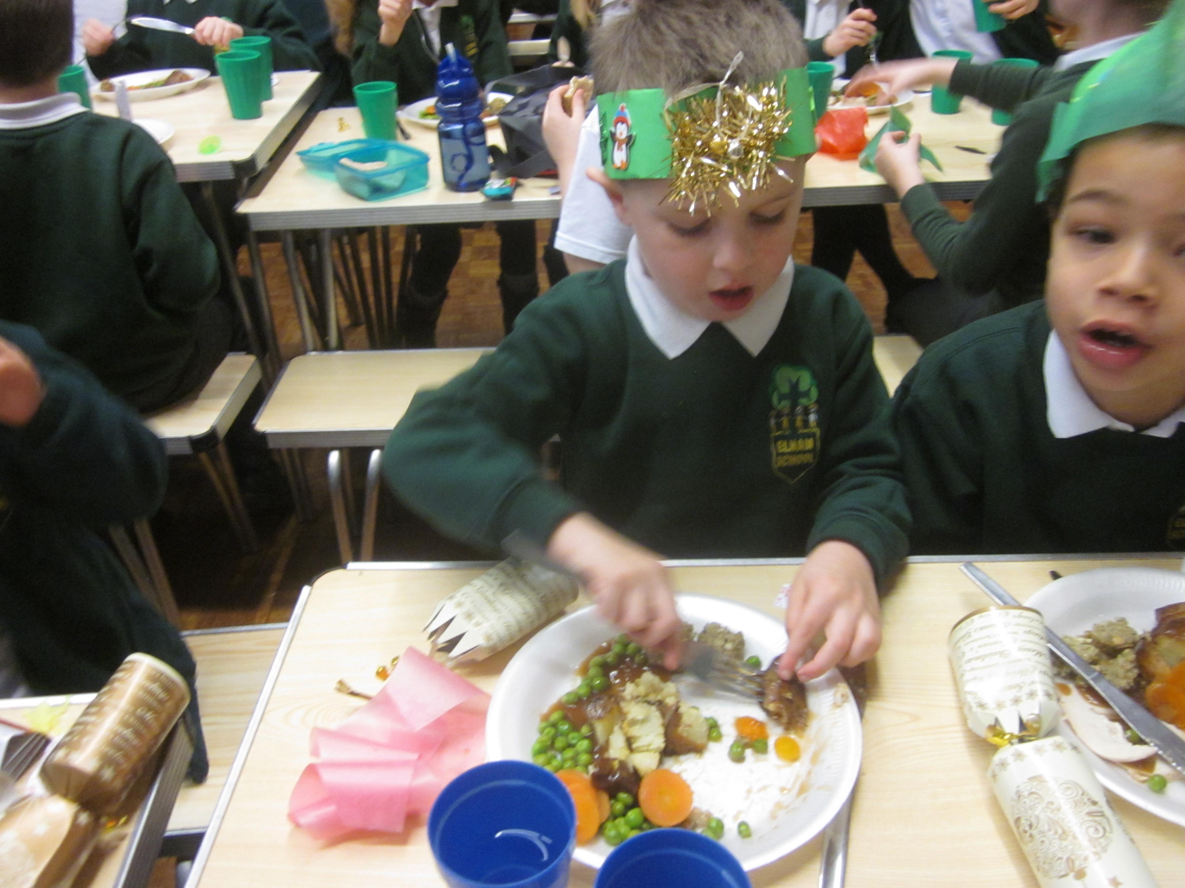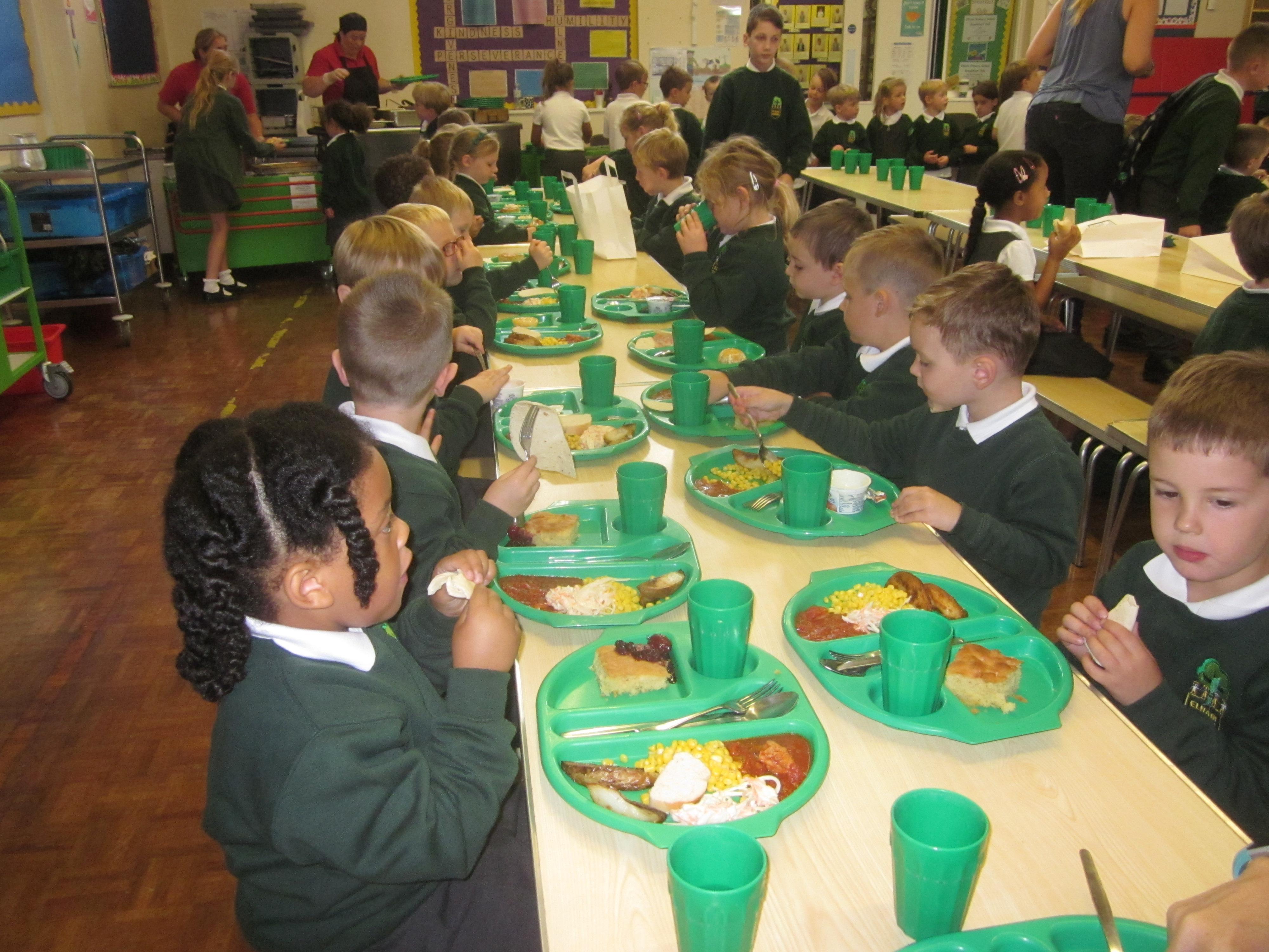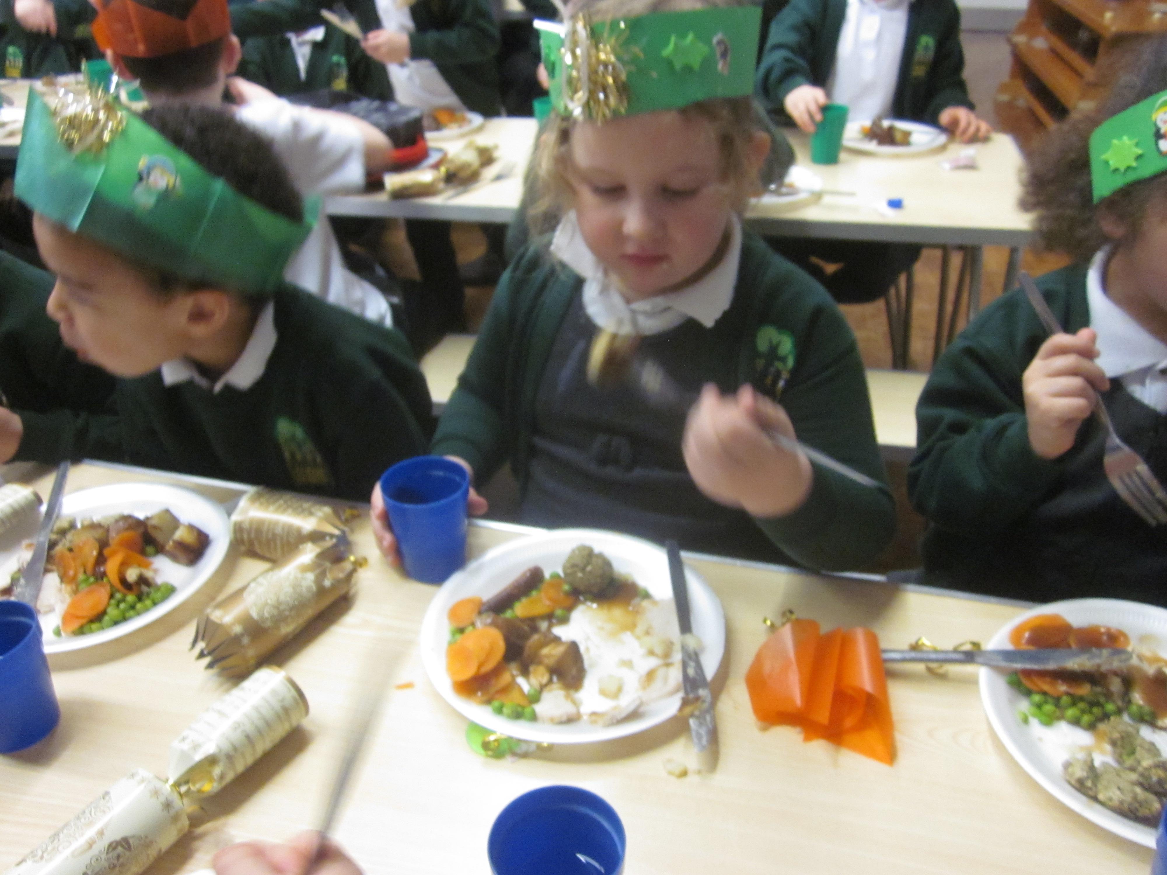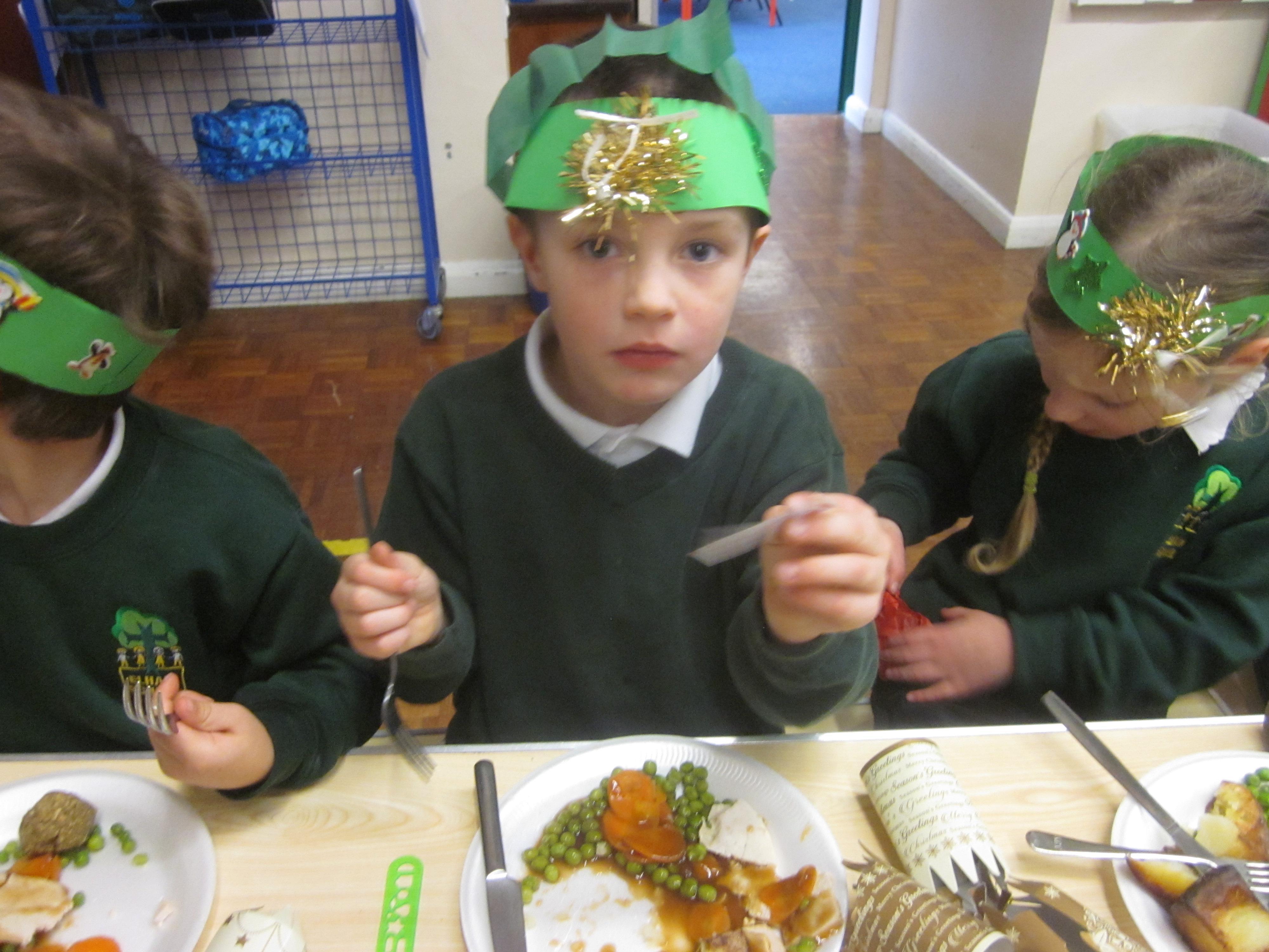 We had our first school dinners this week, which were very yummy! All of the children behaved well and ate their dinners really nicely. We all tried hard to use our knives and forks. Thanks to the Year 6 buddies who were on hand to help.