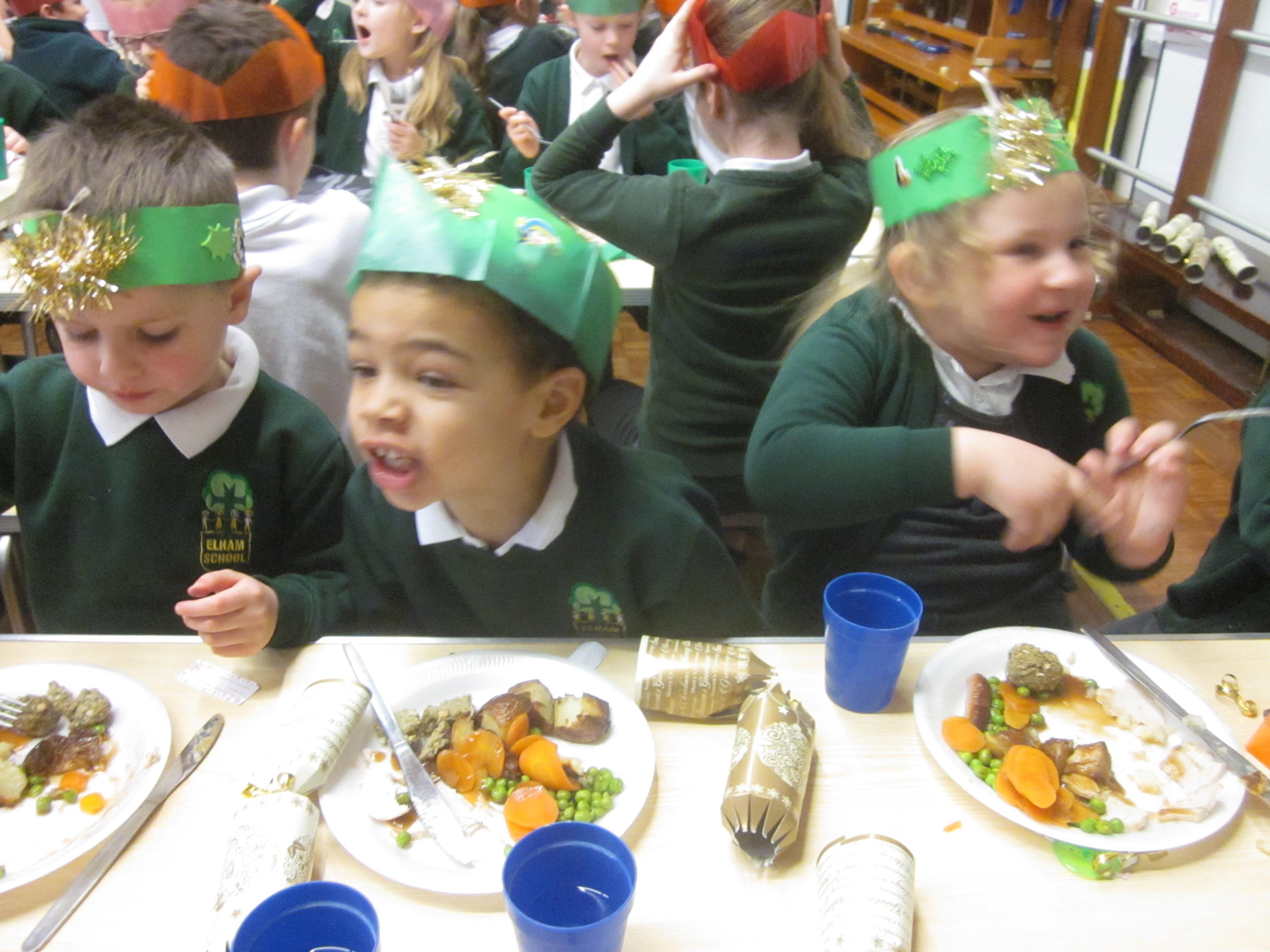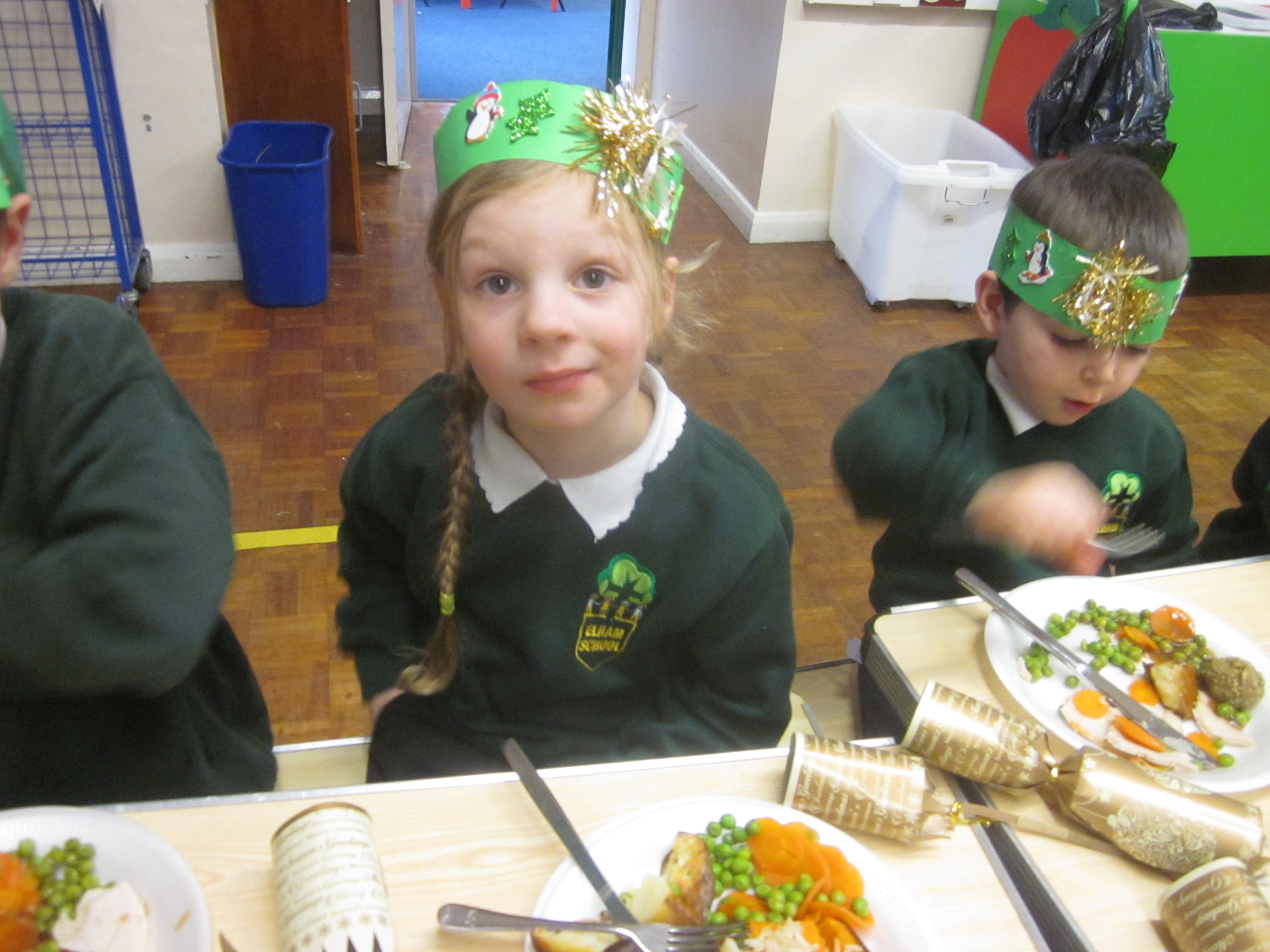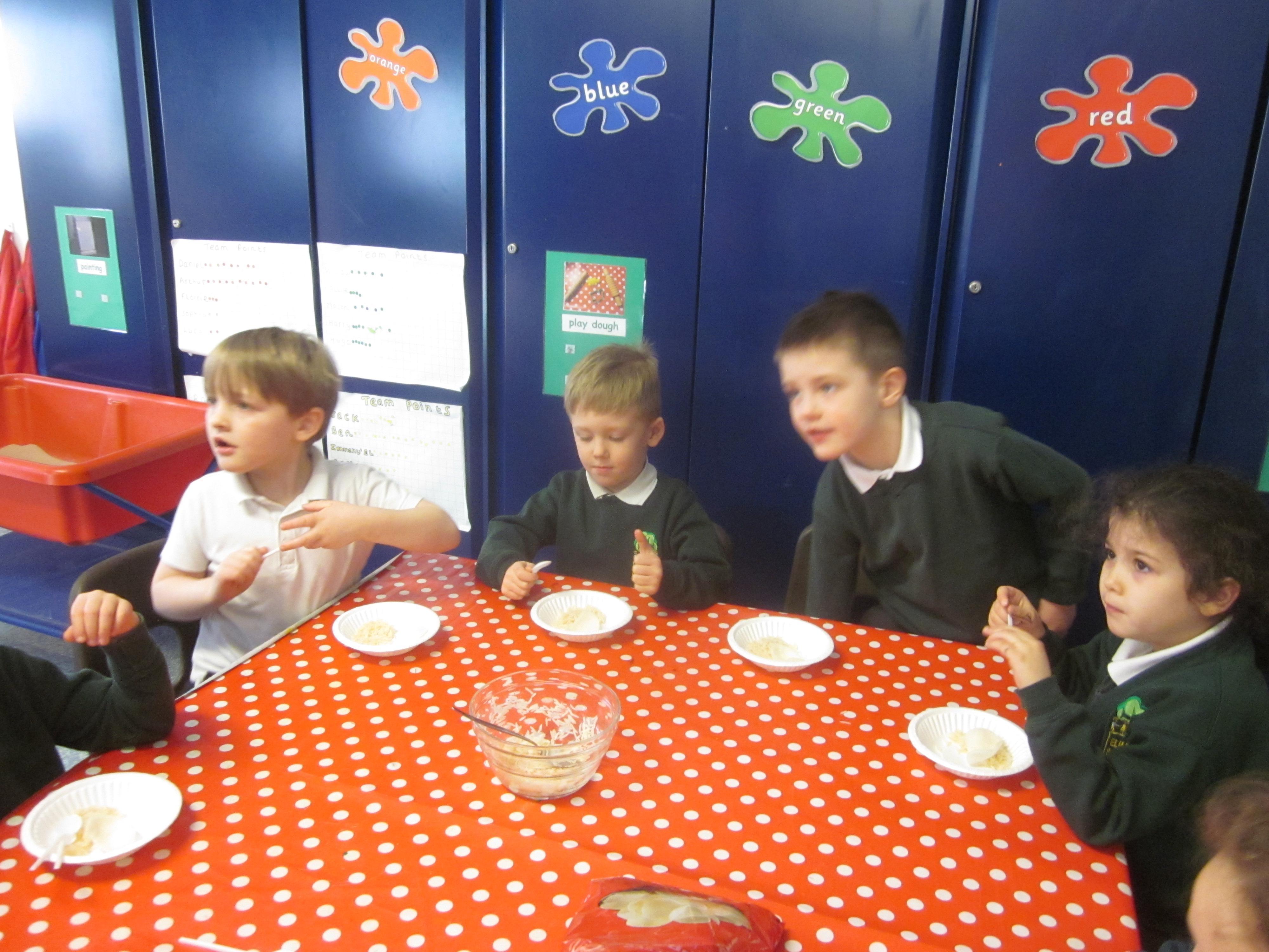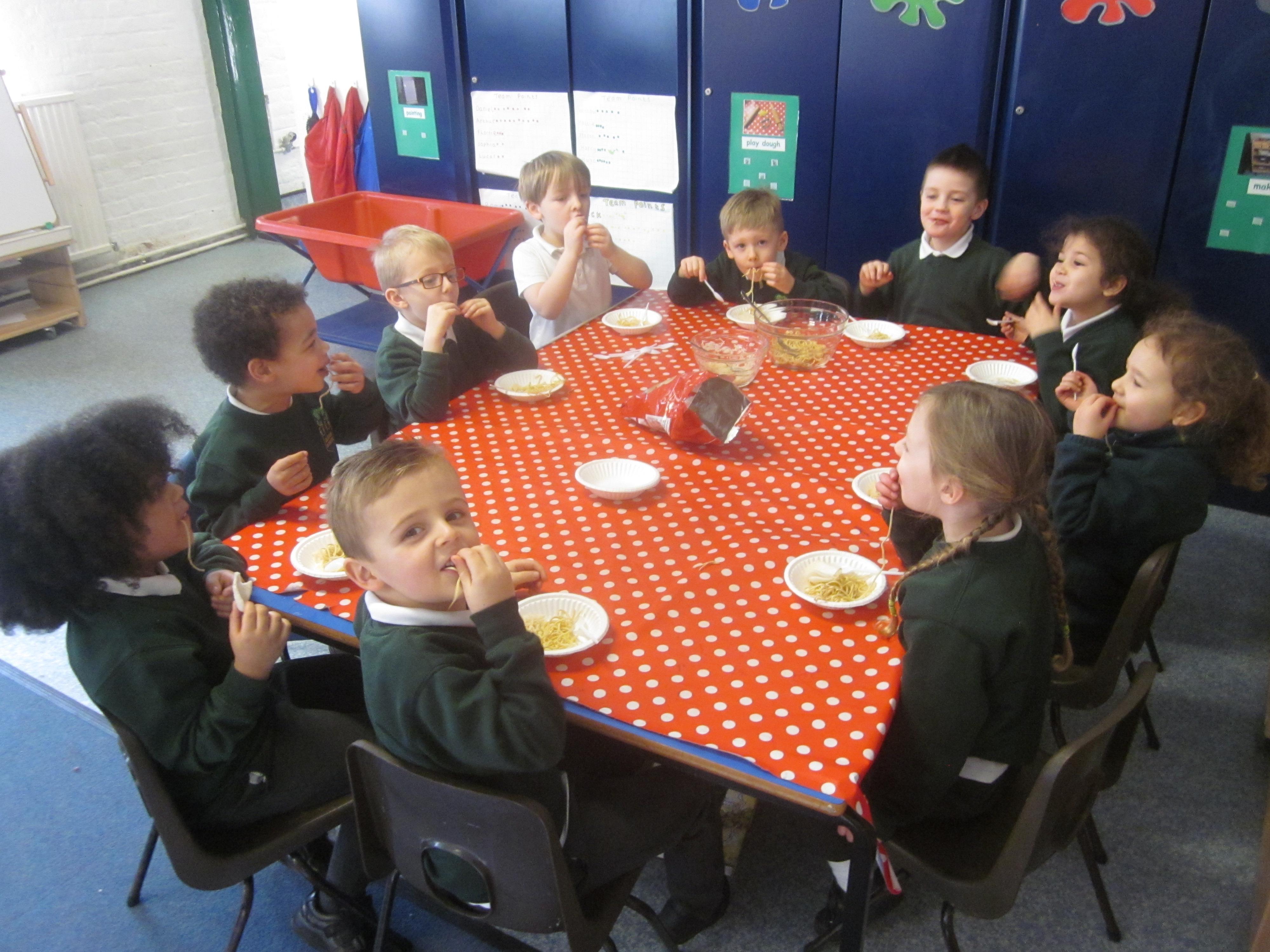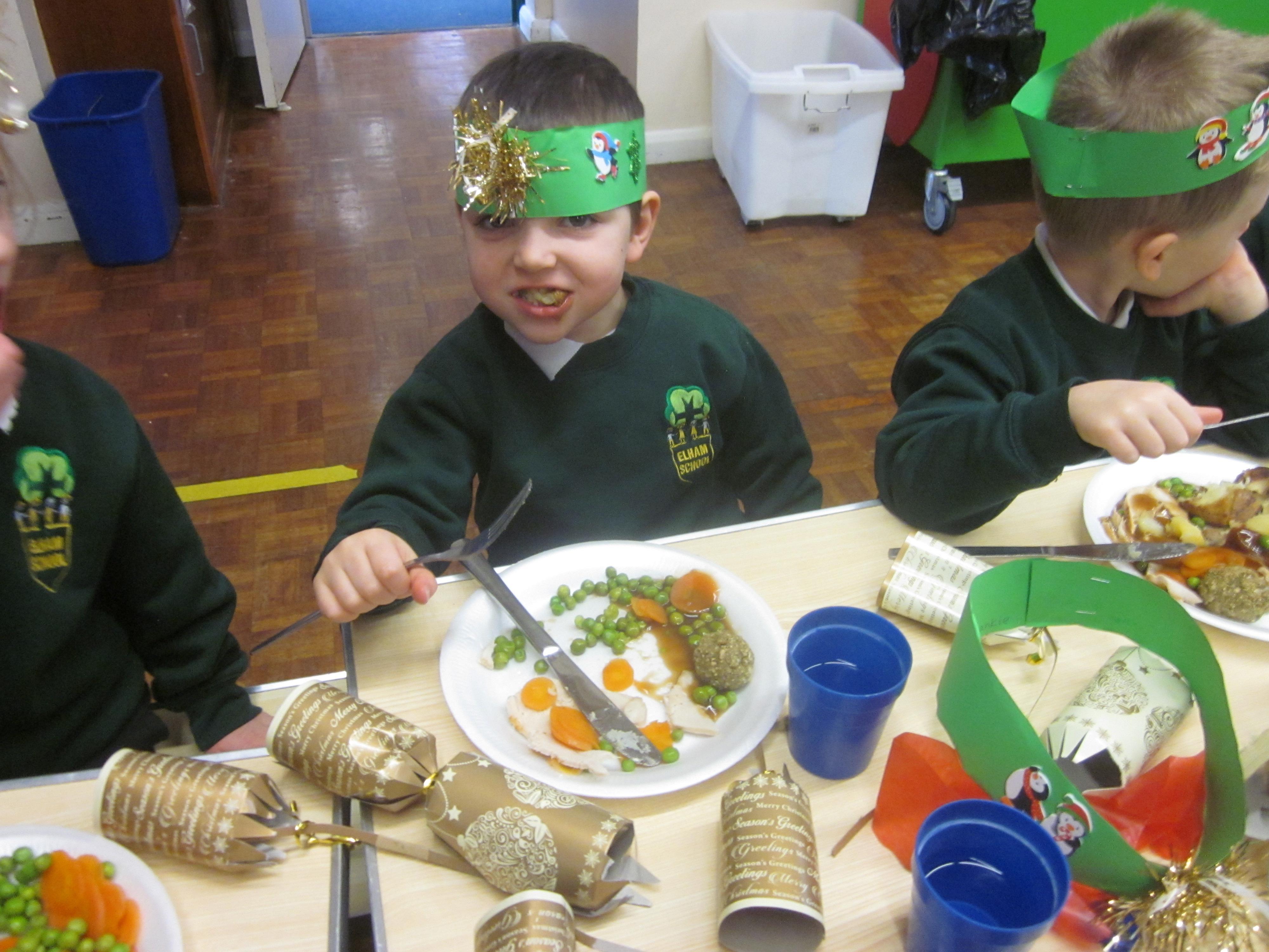 We had our first school dinners this week, which were very yummy! All of the children behaved well and ate their dinners really nicely. We all tried hard to use our knives and forks. Thanks to the Year 6 buddies who were on hand to help.