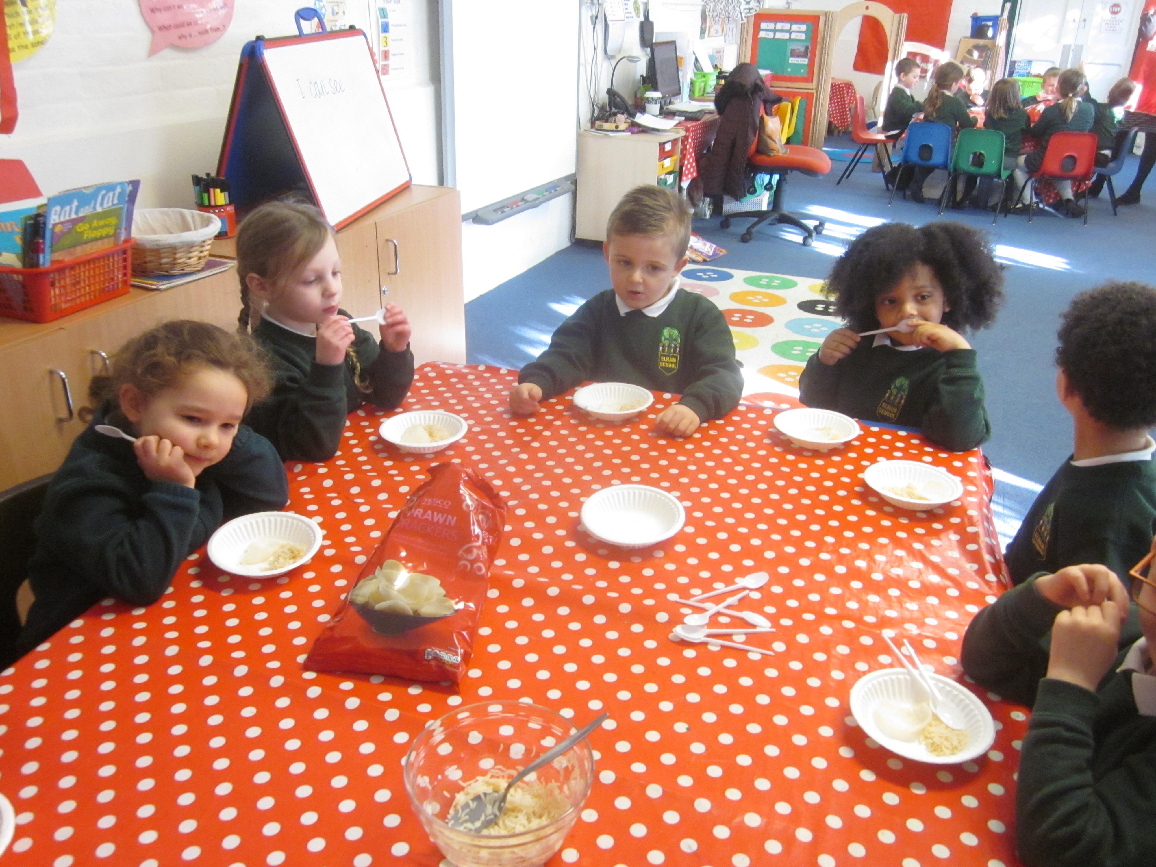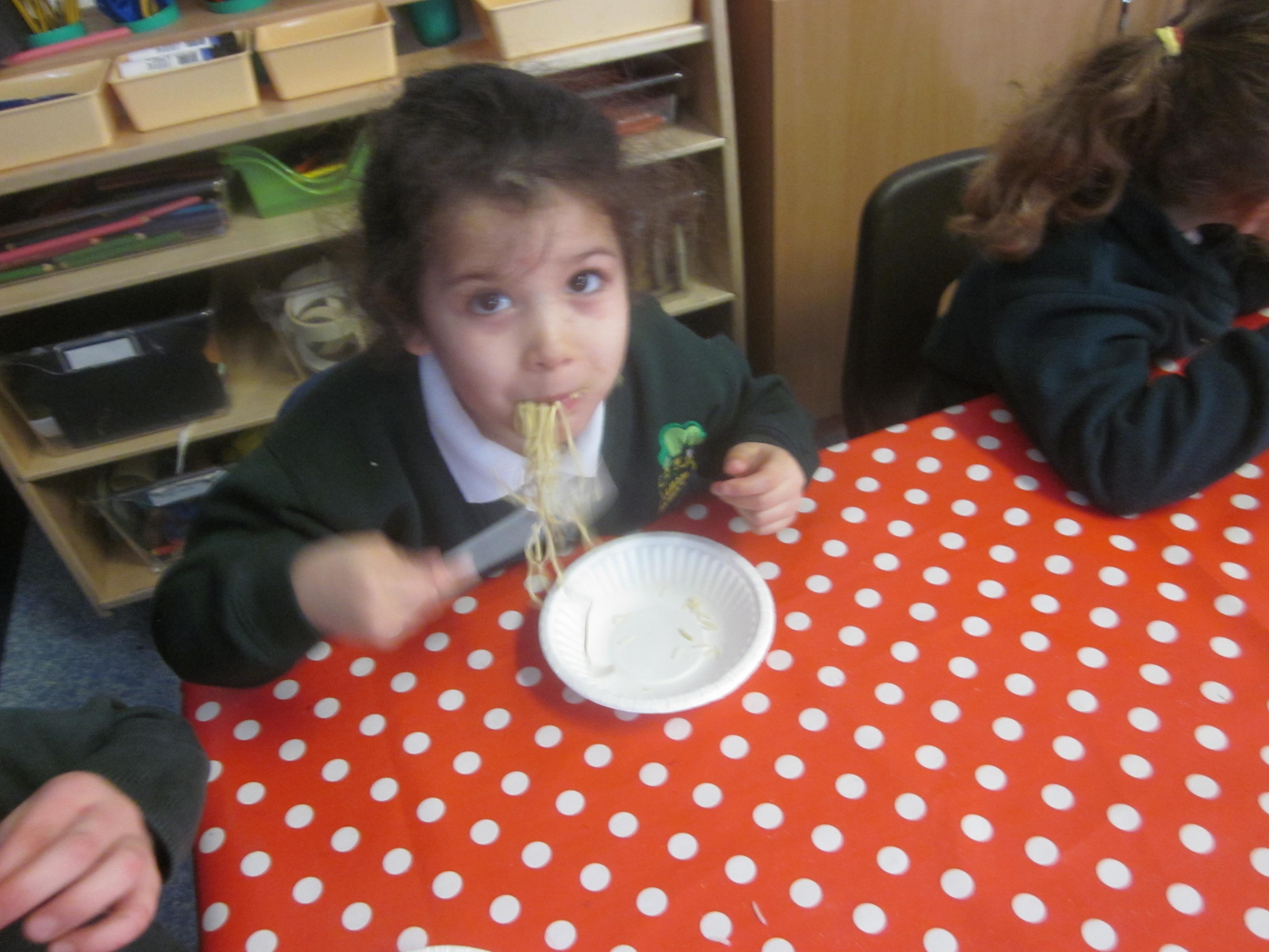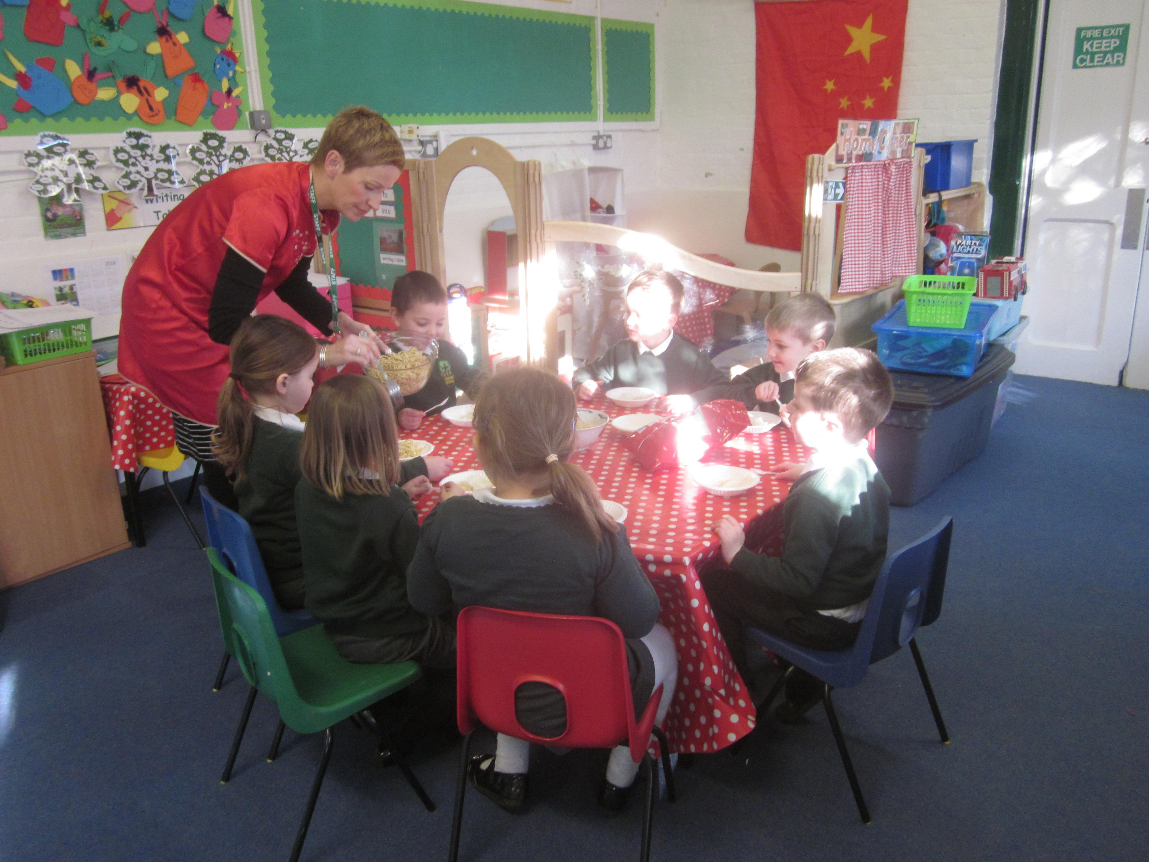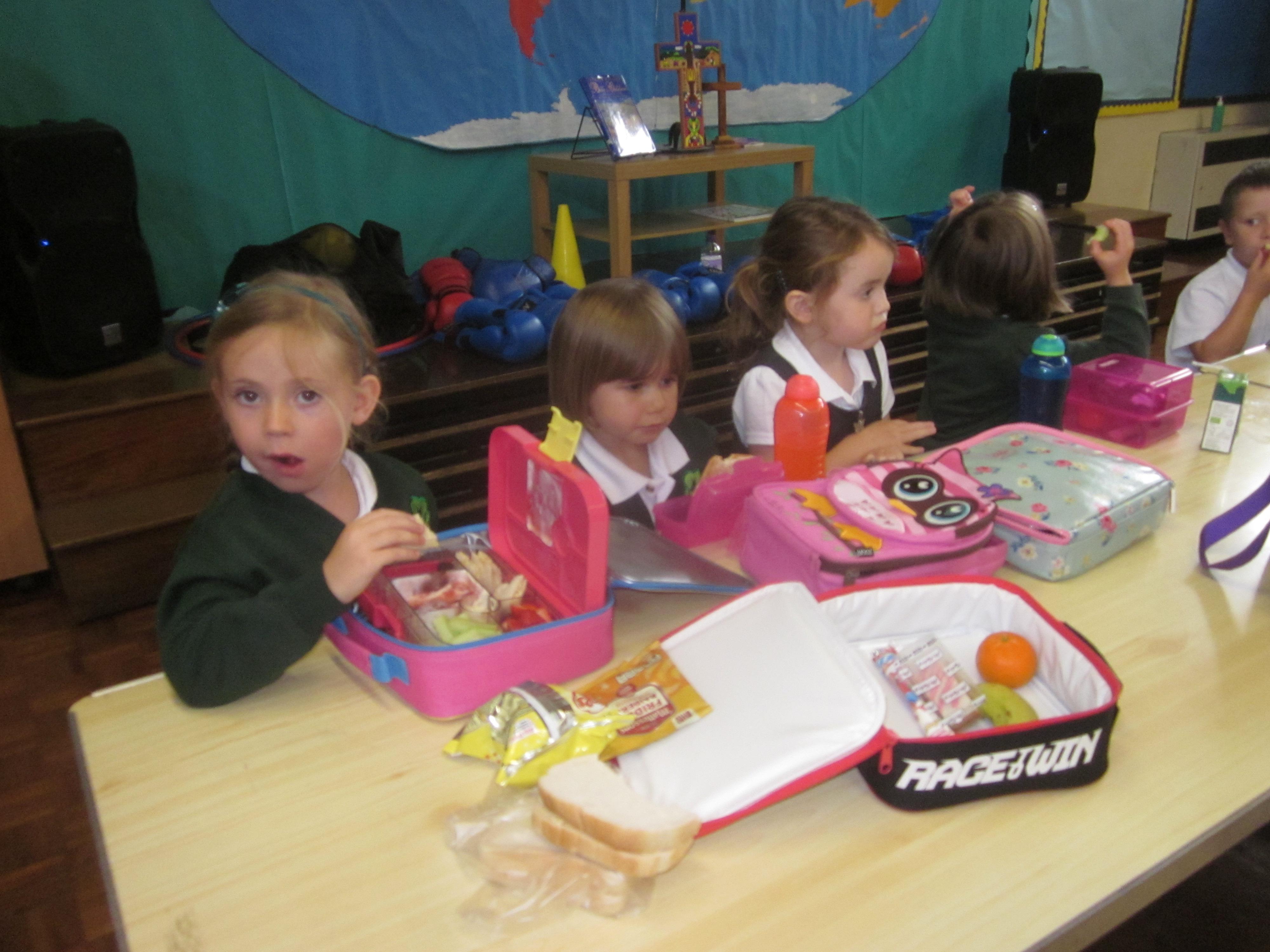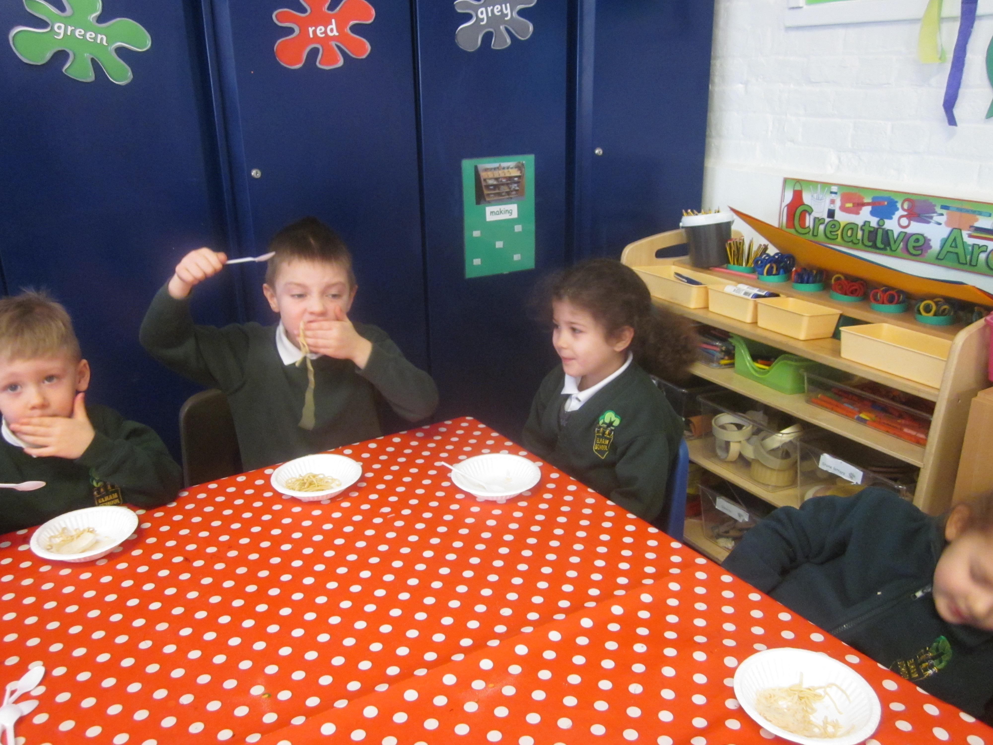 We had our first school dinners this week, which were very yummy! All of the children behaved well and ate their dinners really nicely. We all tried hard to use our knives and forks. Thanks to the Year 6 buddies who were on hand to help.