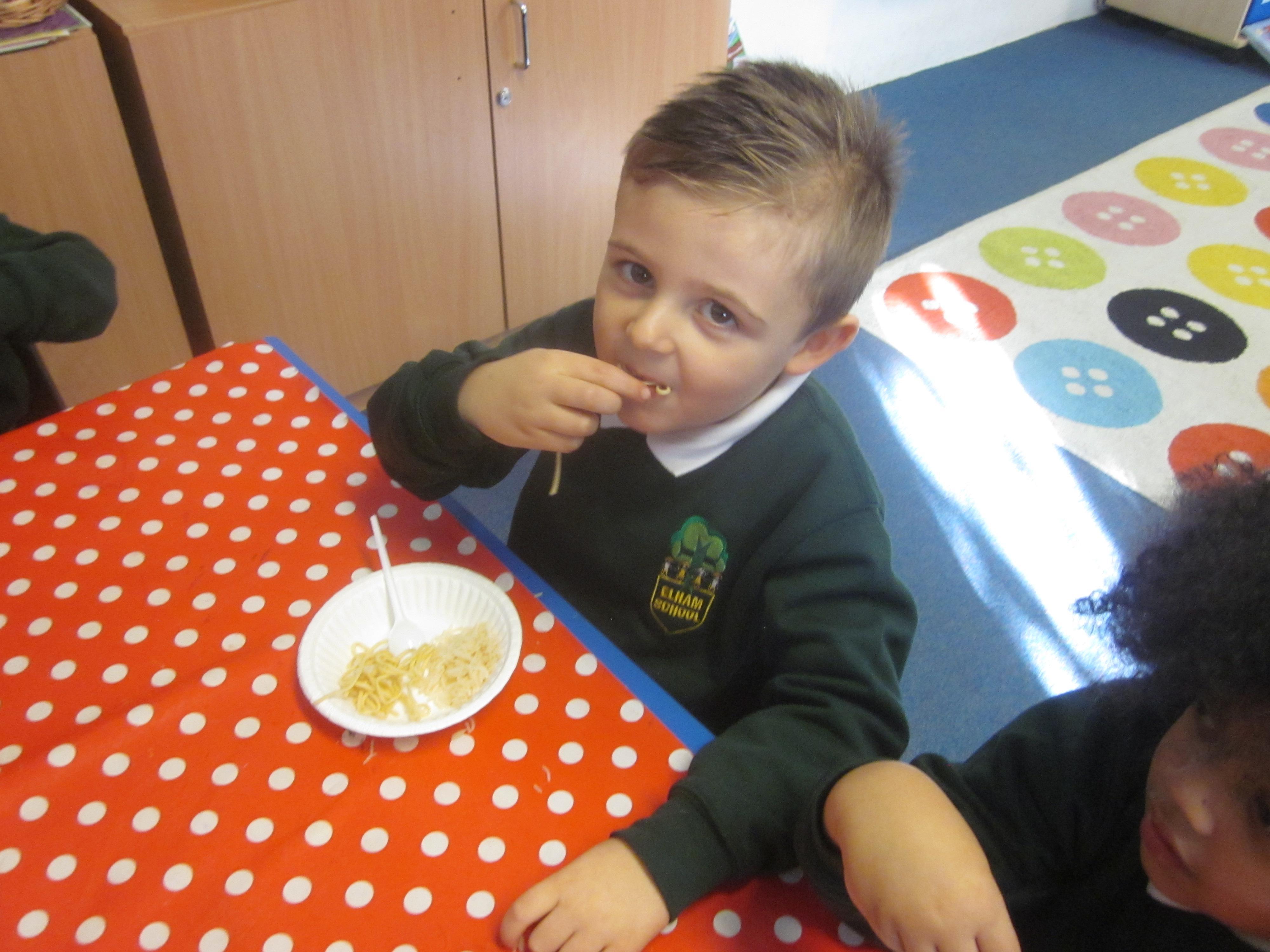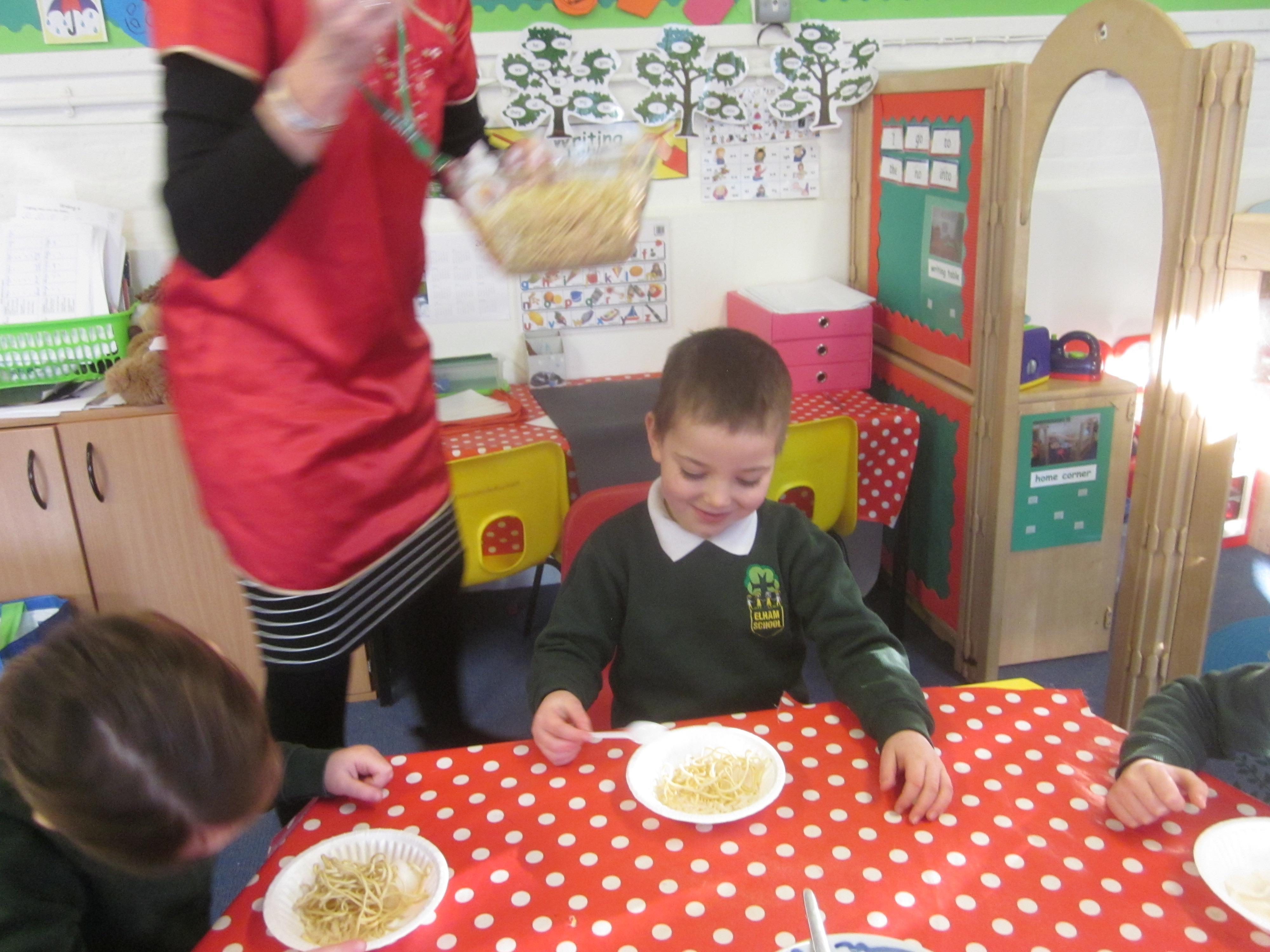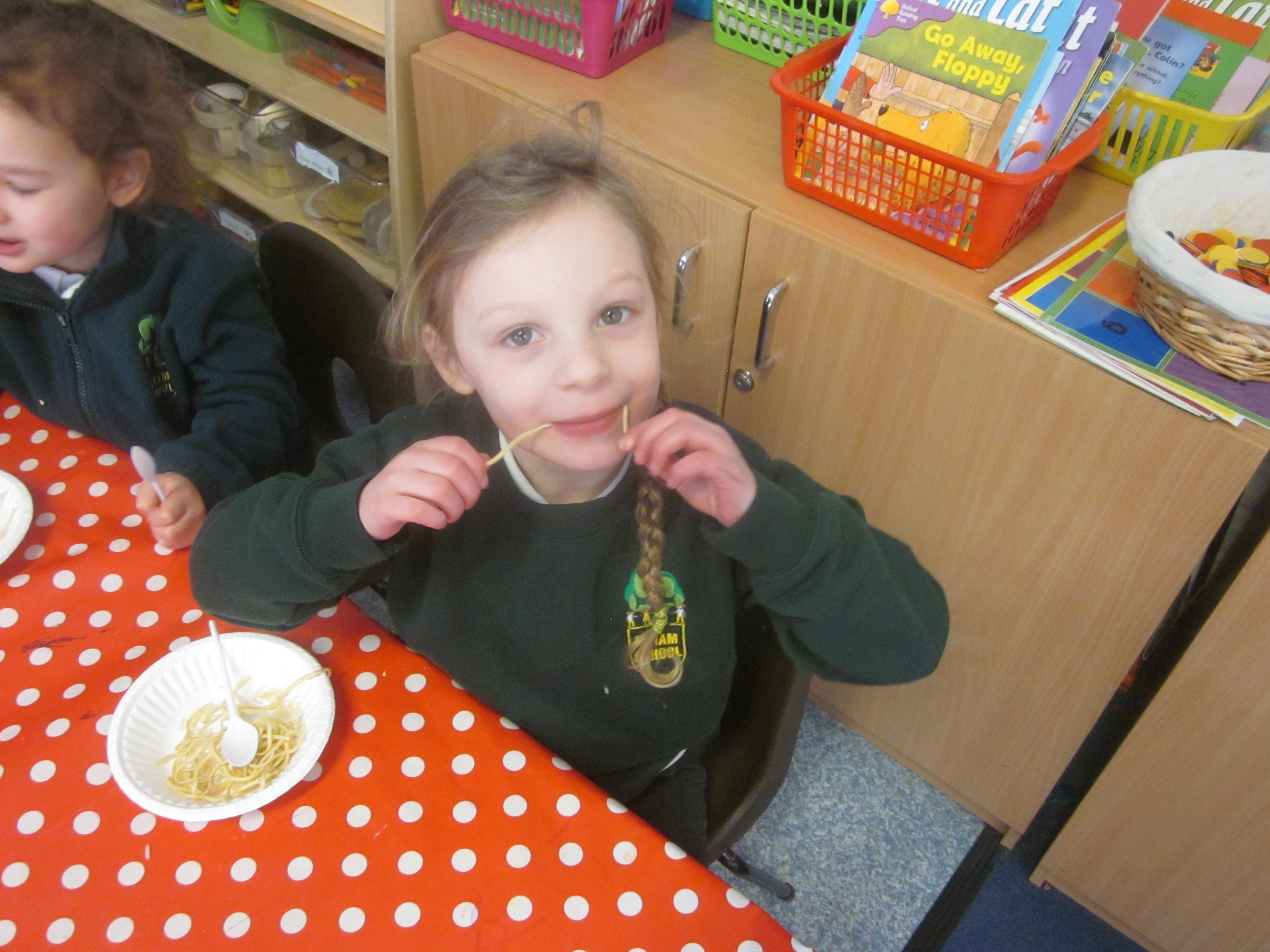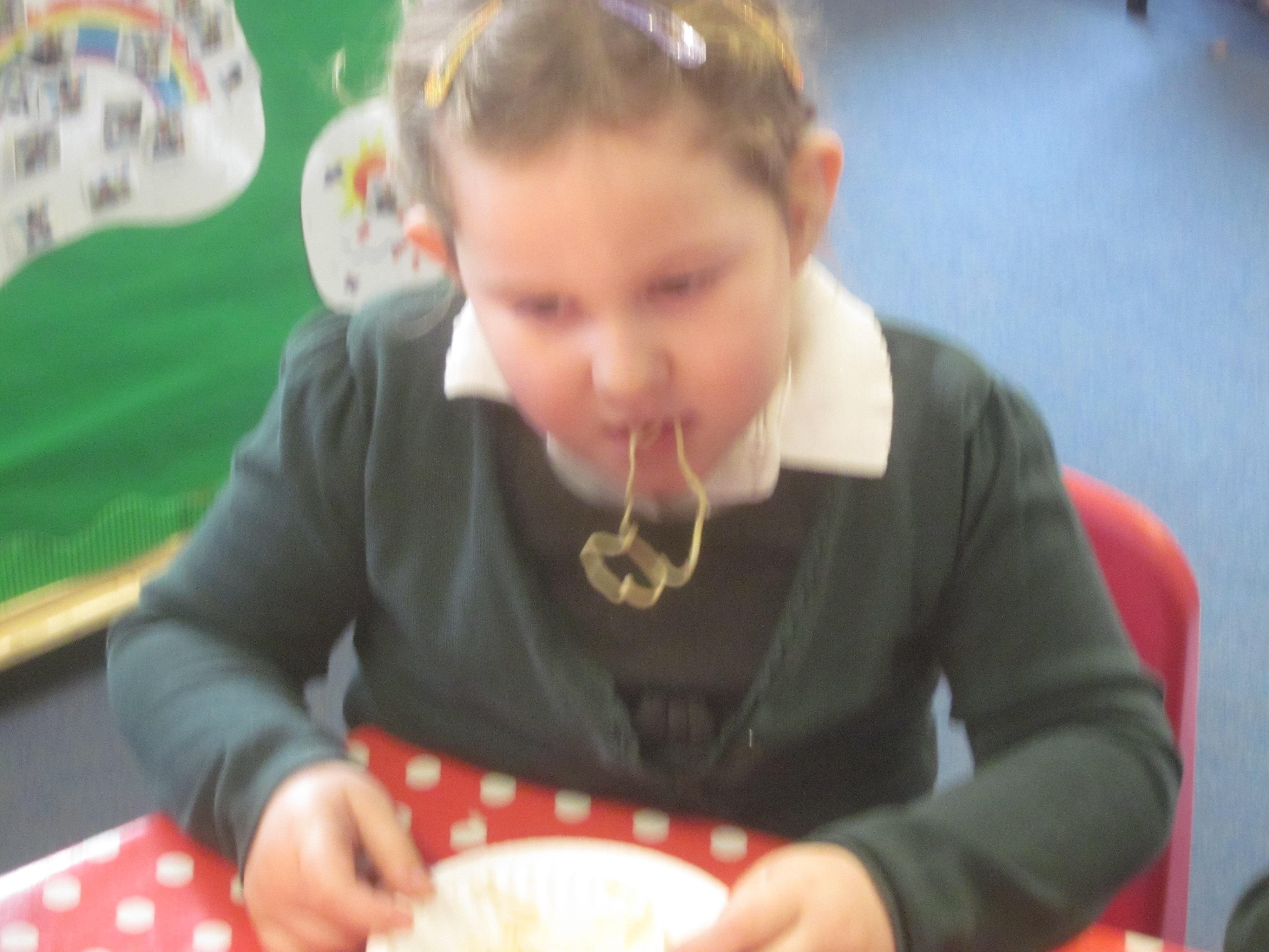 We had our first school dinners this week, which were very yummy! All of the children behaved well and ate their dinners really nicely. We all tried hard to use our knives and forks. Thanks to the Year 6 buddies who were on hand to help.