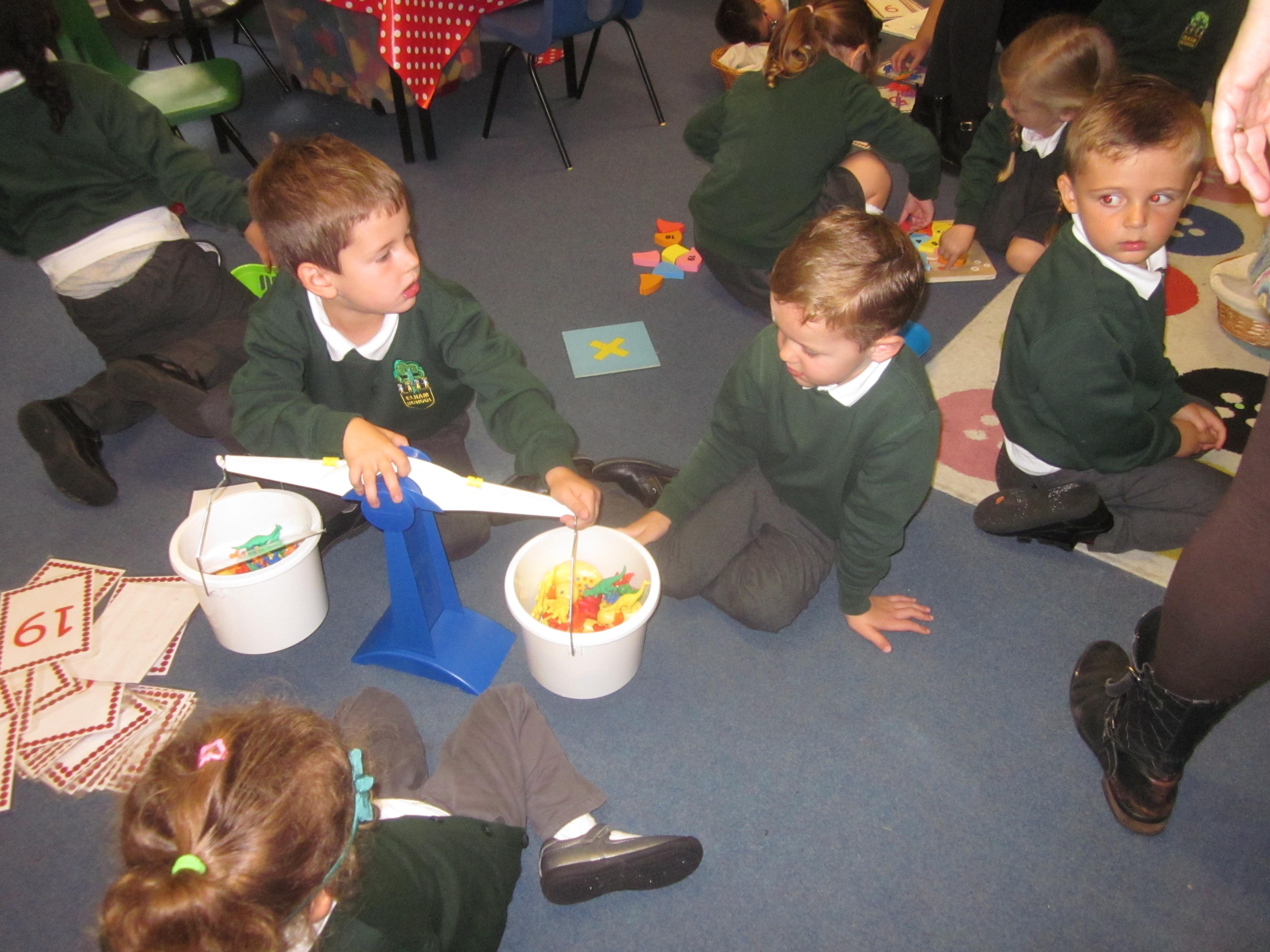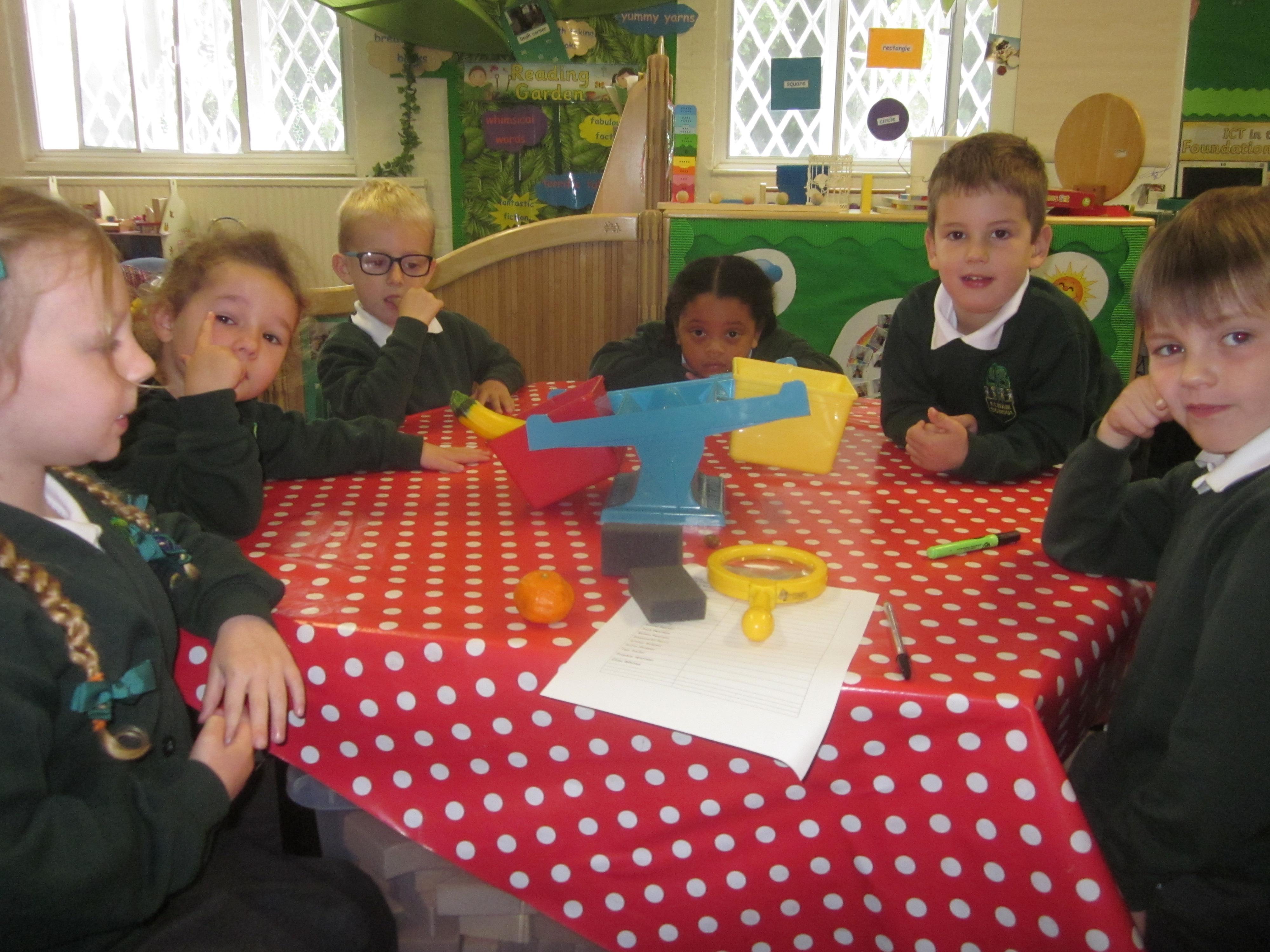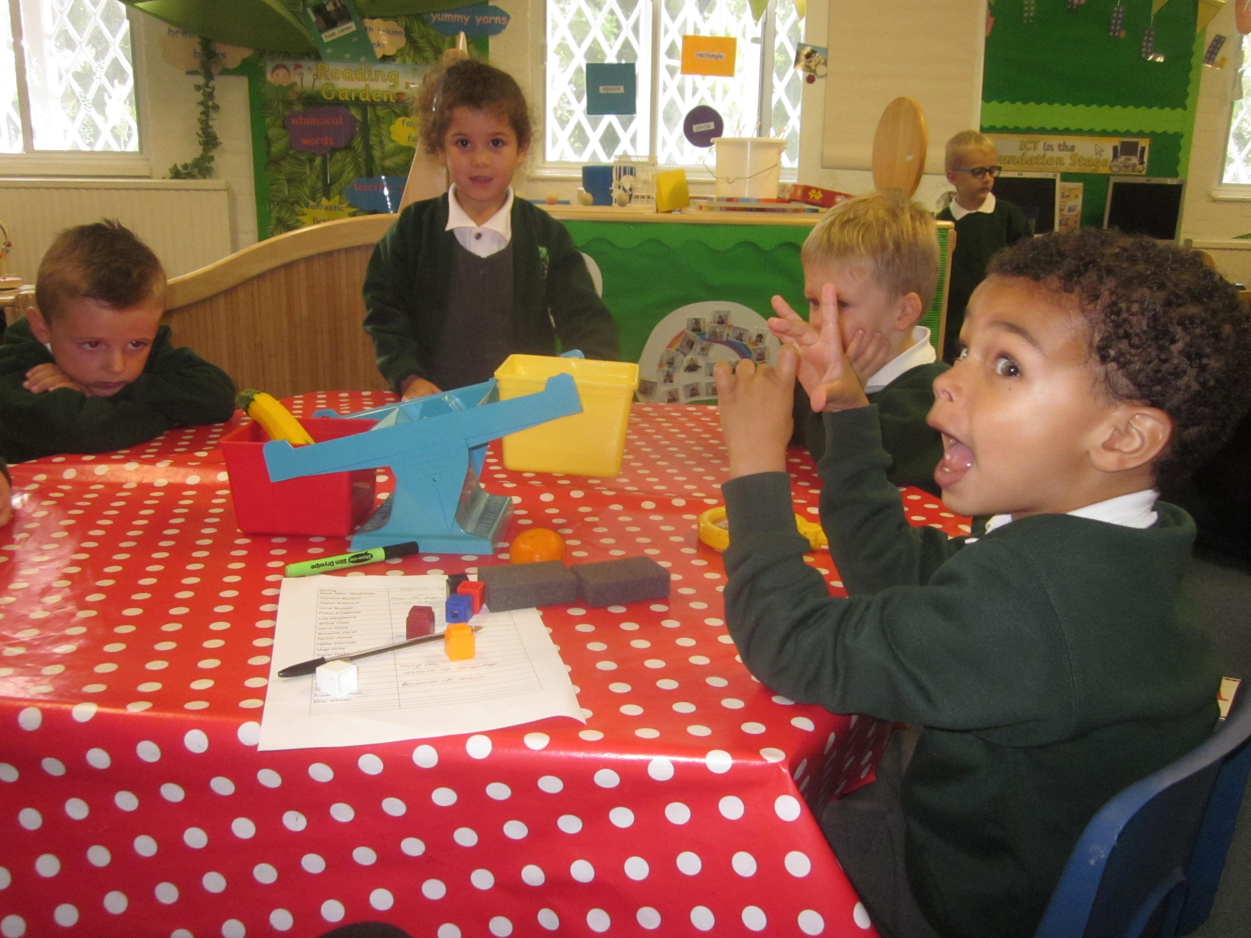 We have used initial sounds to label fruits and vegetables and have used the language heavier and lighter when using weighing scales to compare objects.