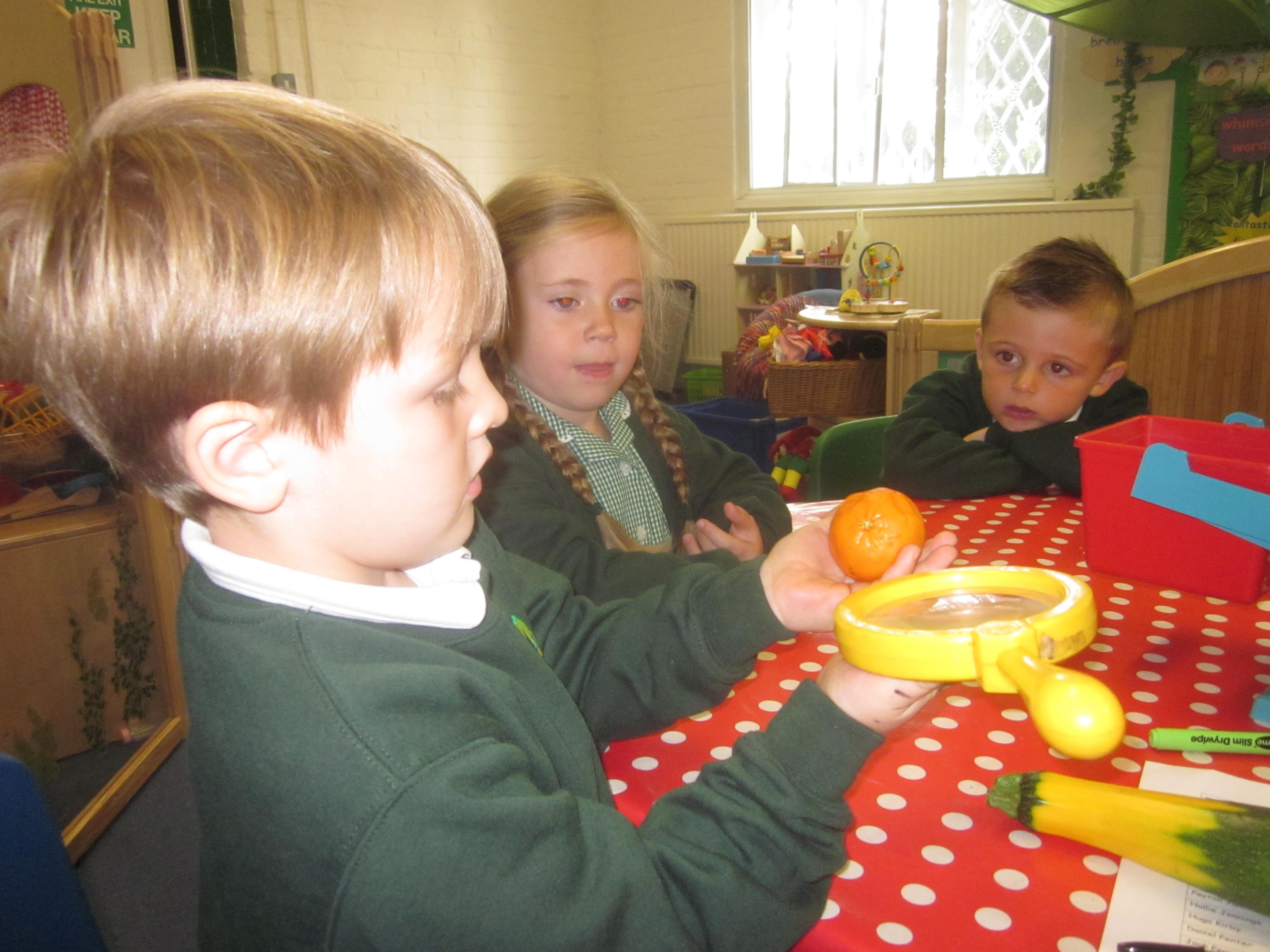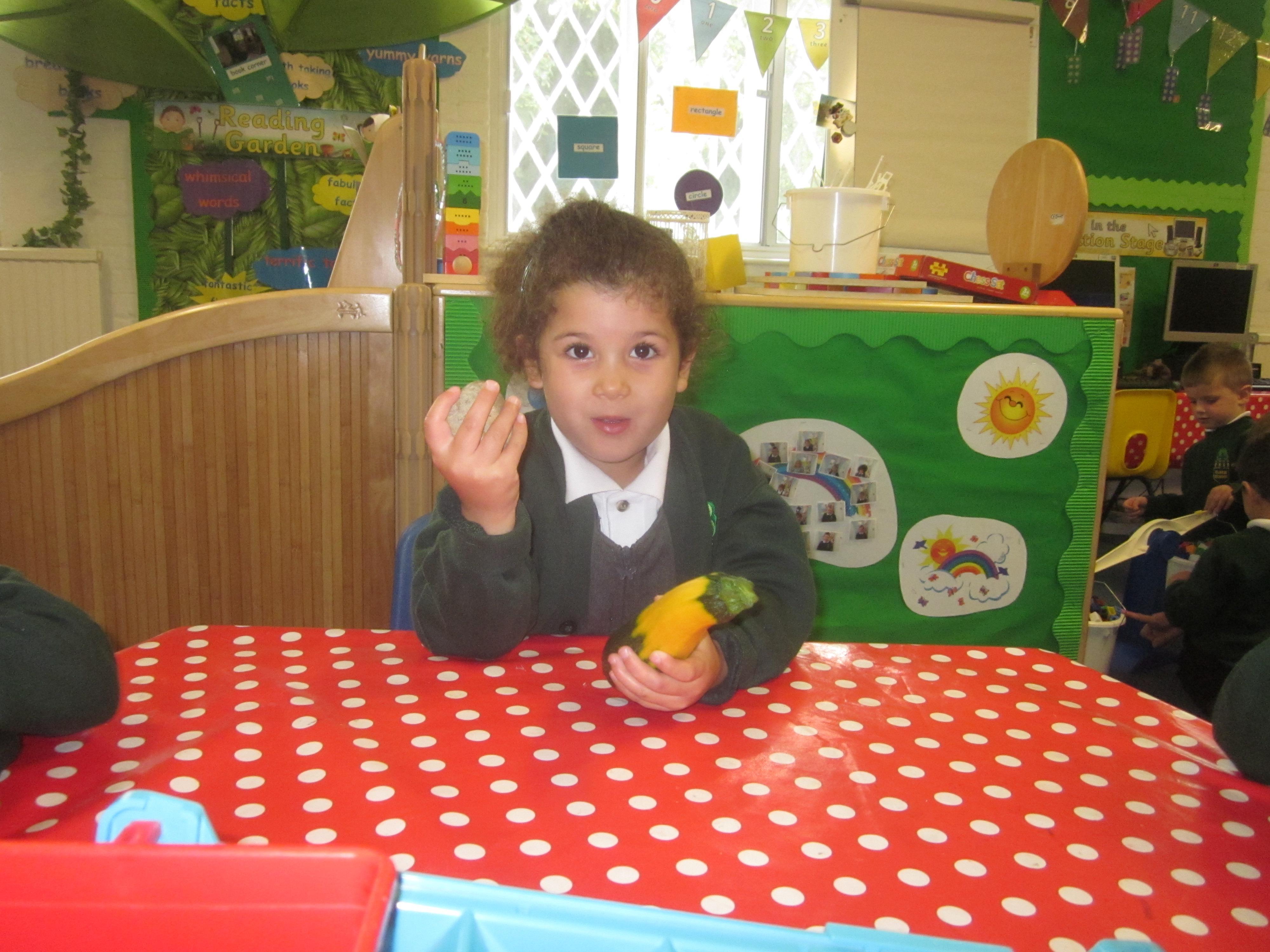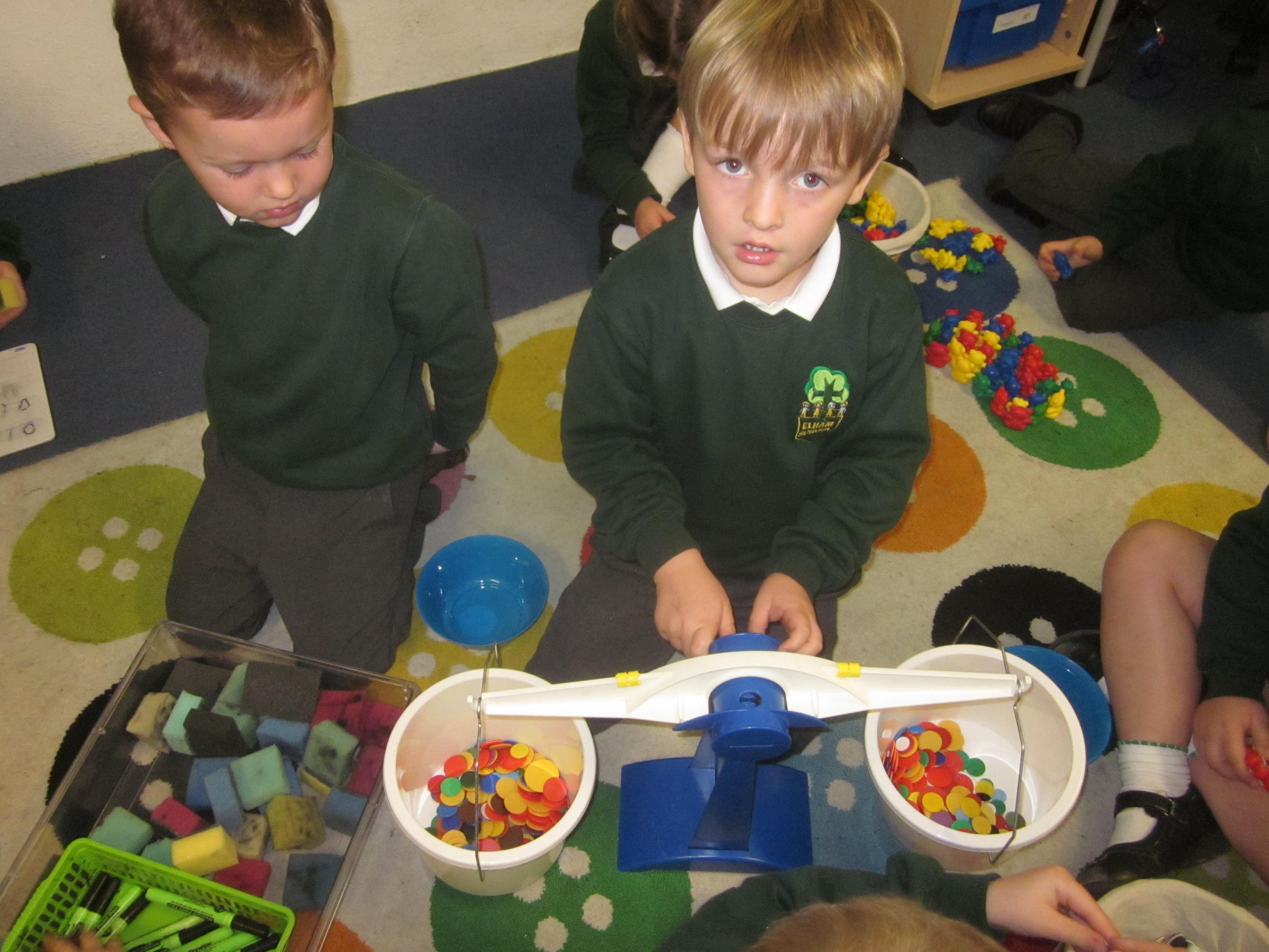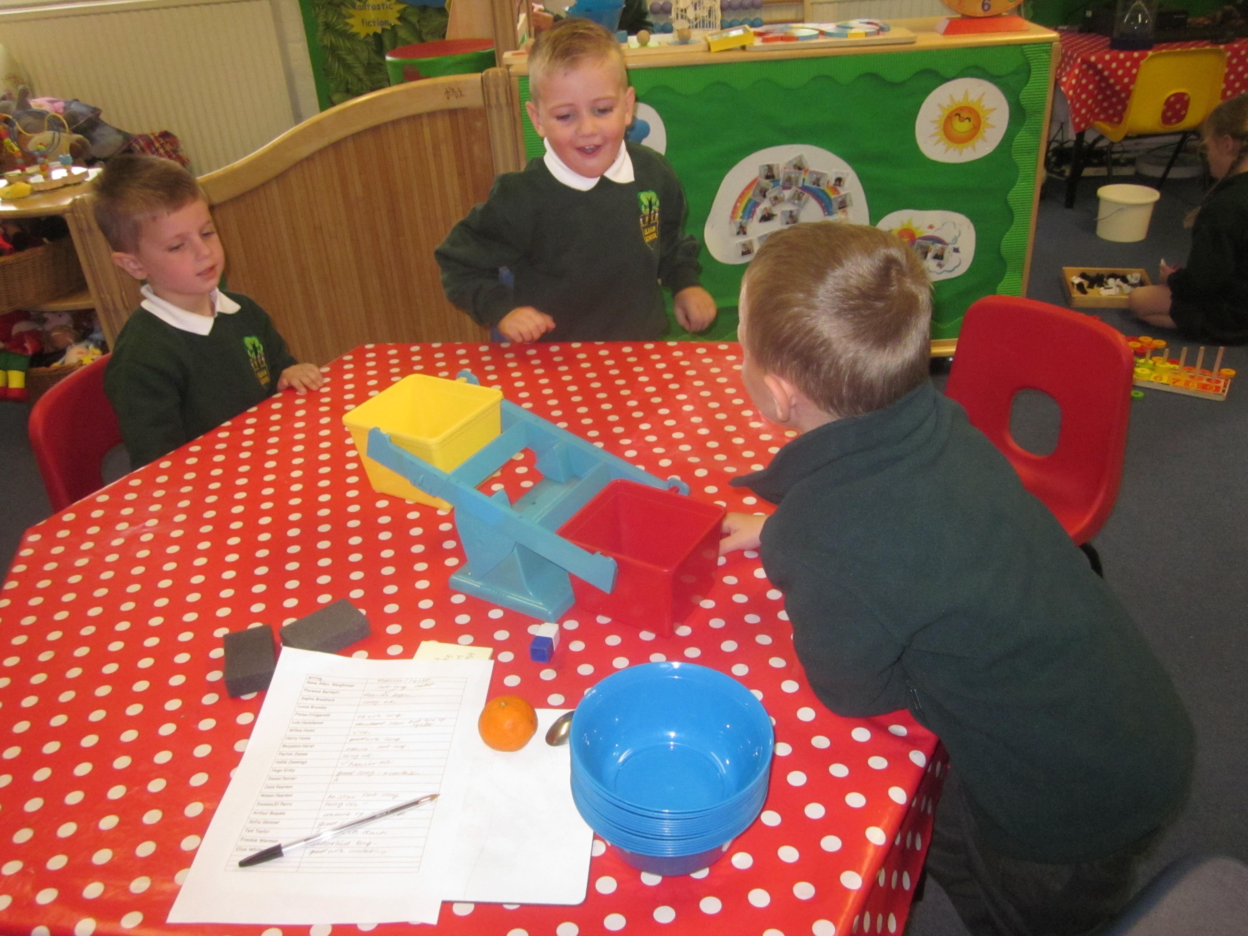 We have used initial sounds to label fruits and vegetables and have used the language heavier and lighter when using weighing scales to compare objects.
