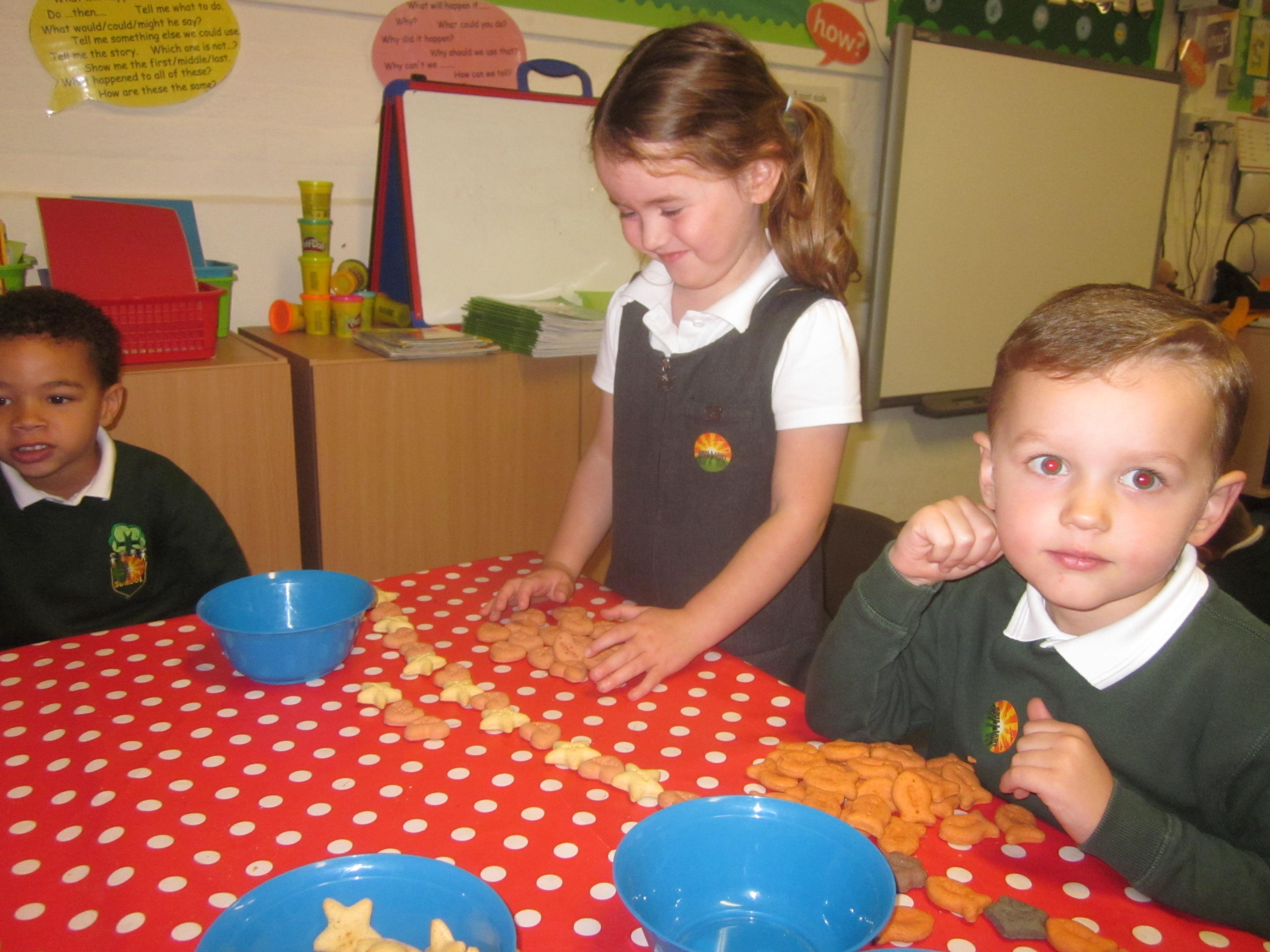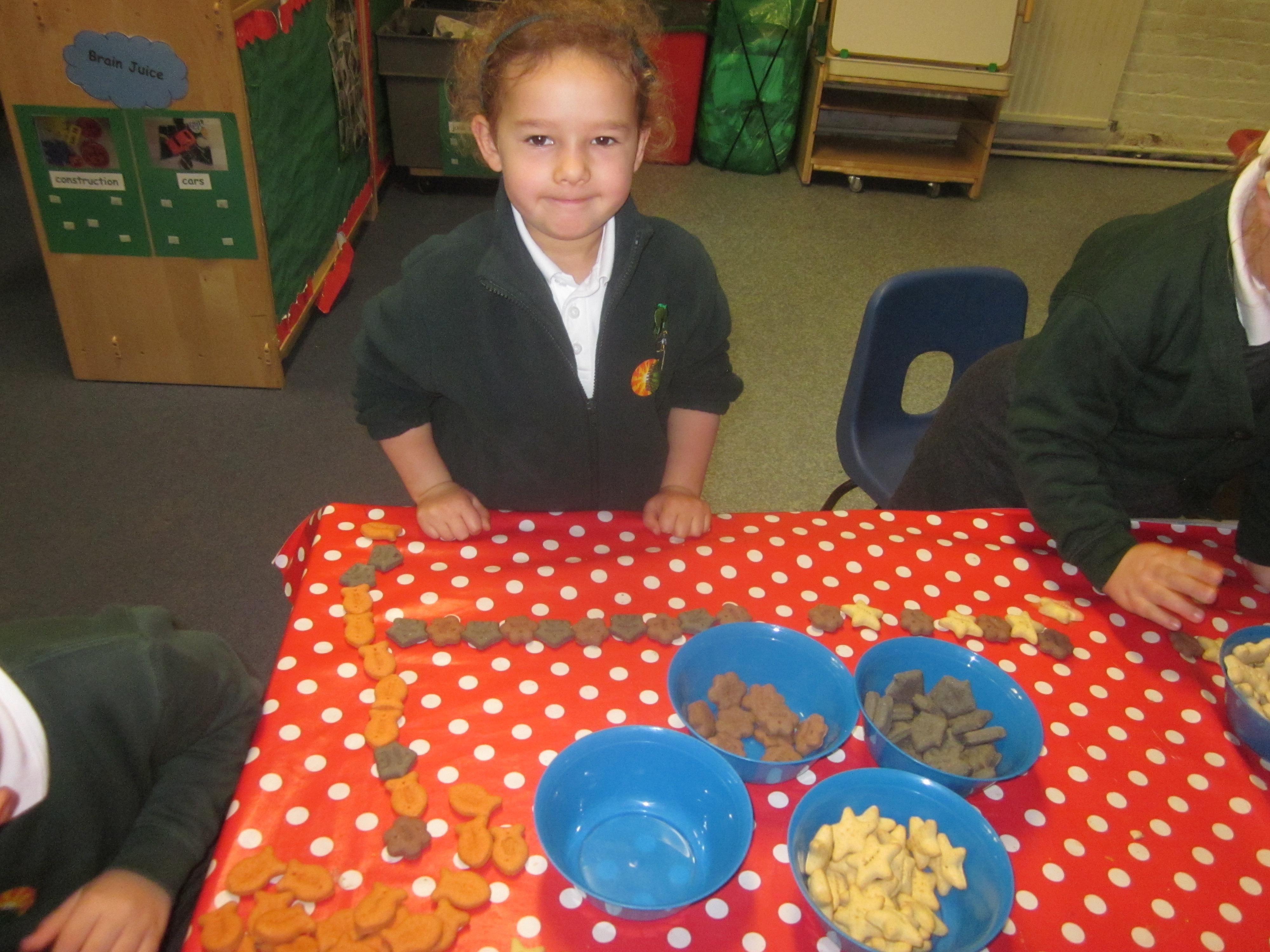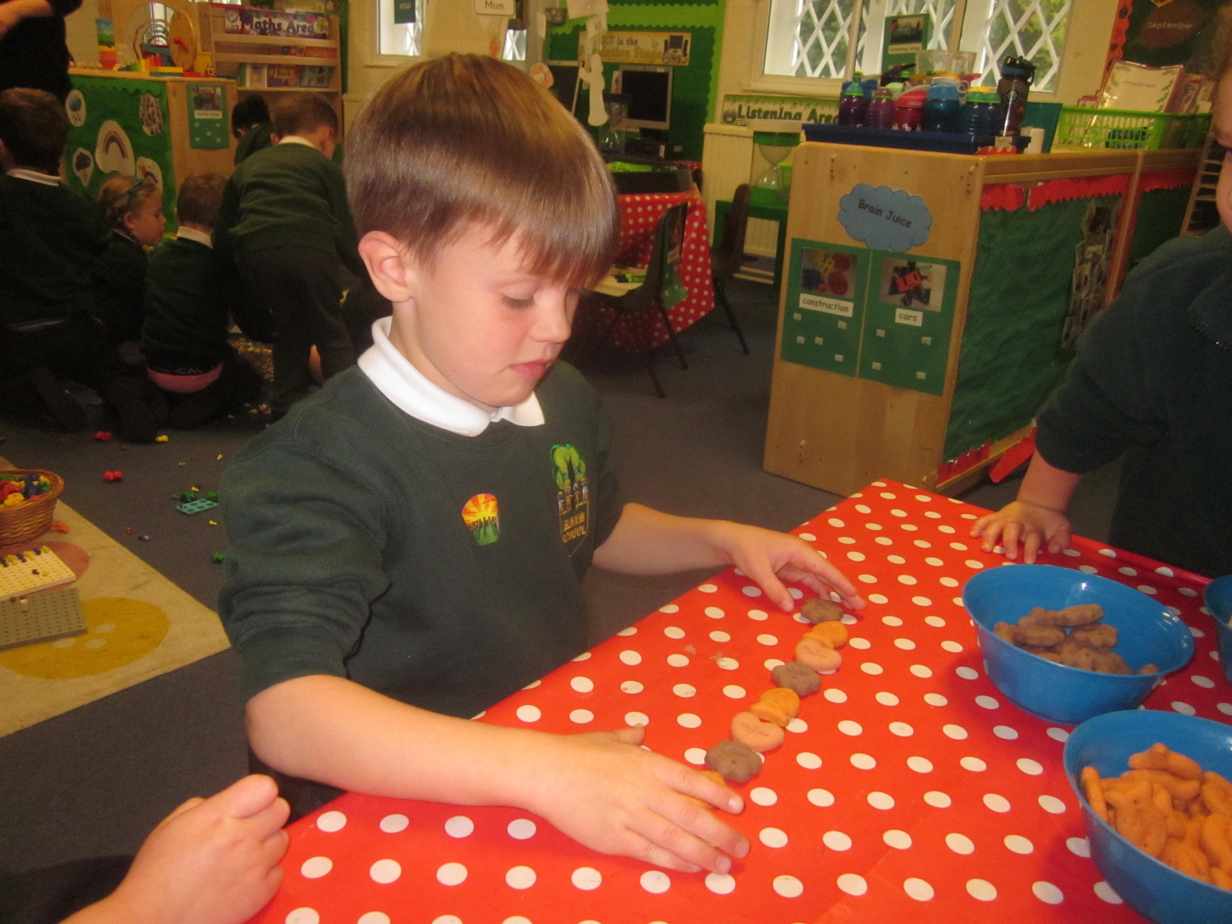 In our maths learning we sorted Floppies biscuits and made repeating patterns.