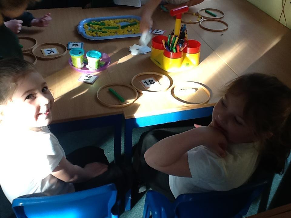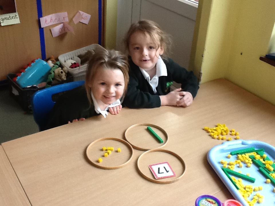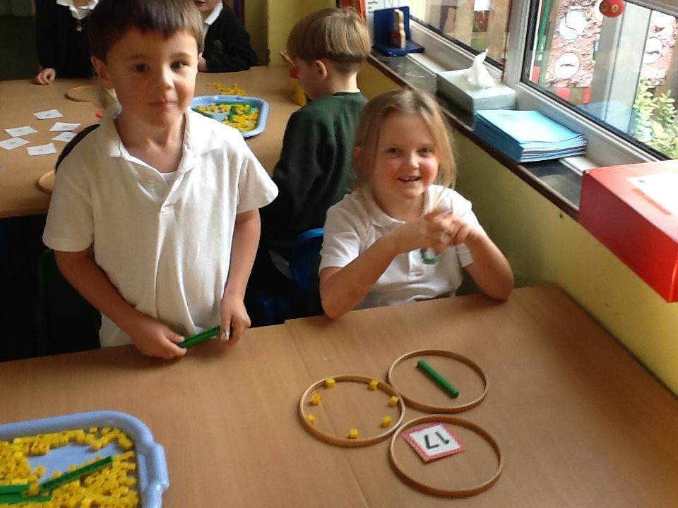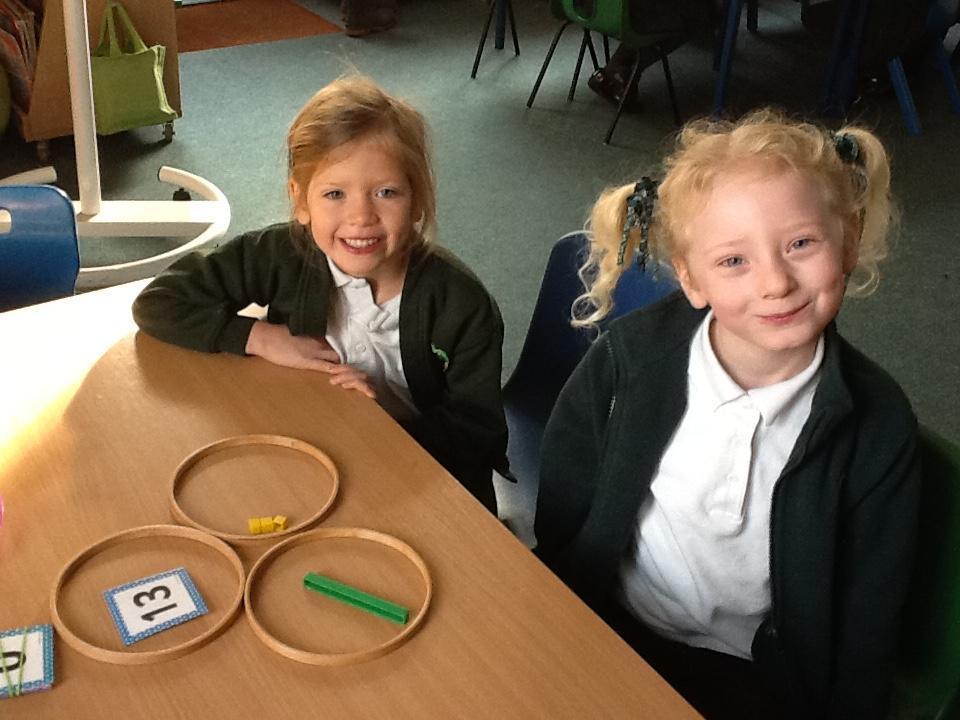 We are continuing to work with tens and units in as many different visual ways to help the children understand what a ten is and that a teen number is a number with a ten and some ones.  Thinking of the number as a whole and splitting it into parts (in hoops) helped.