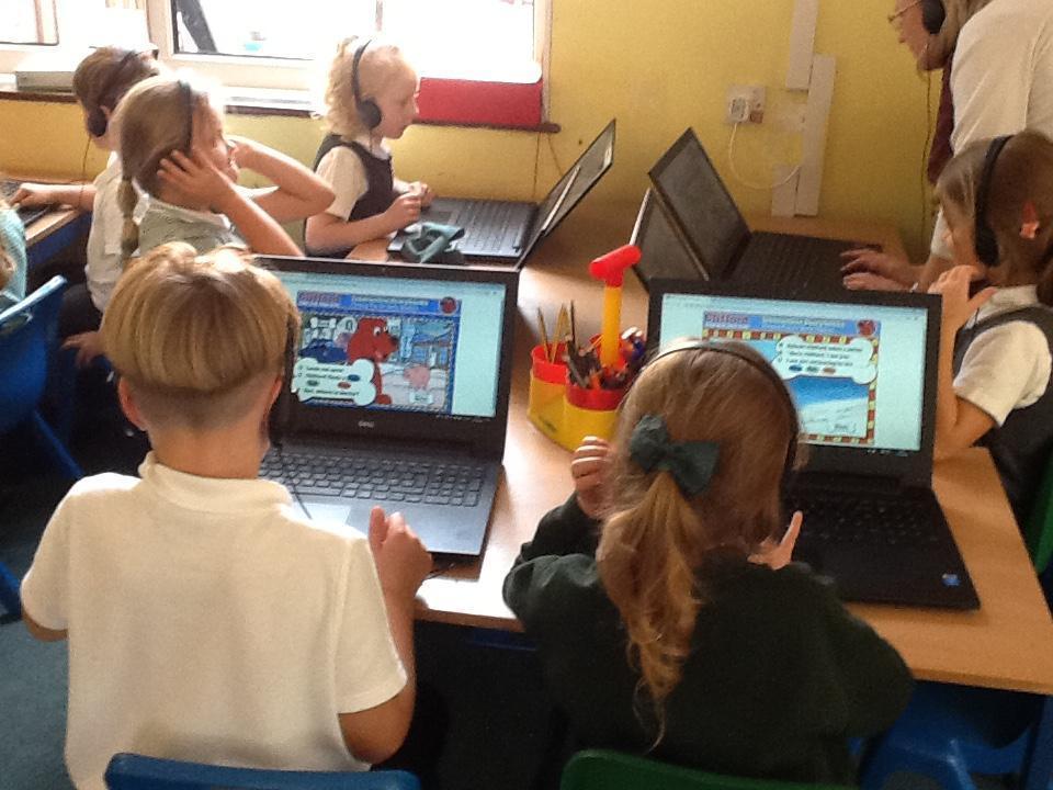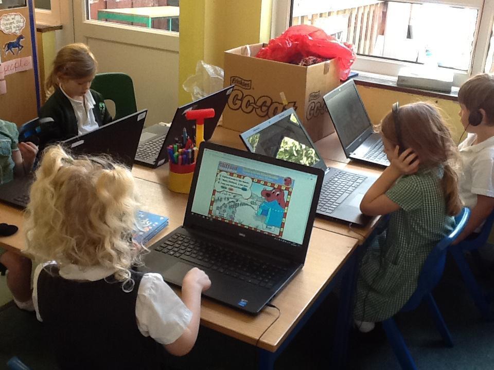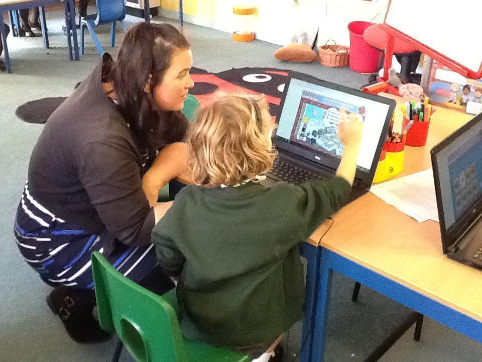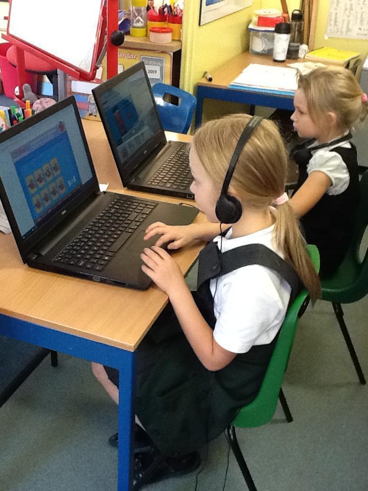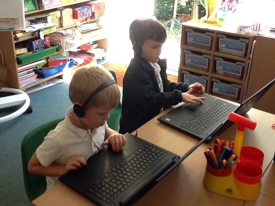 The children are upskilling themselves in ICT.  They have been learning how to left click on mouse pads and use headphones in order to listen to e-stories.