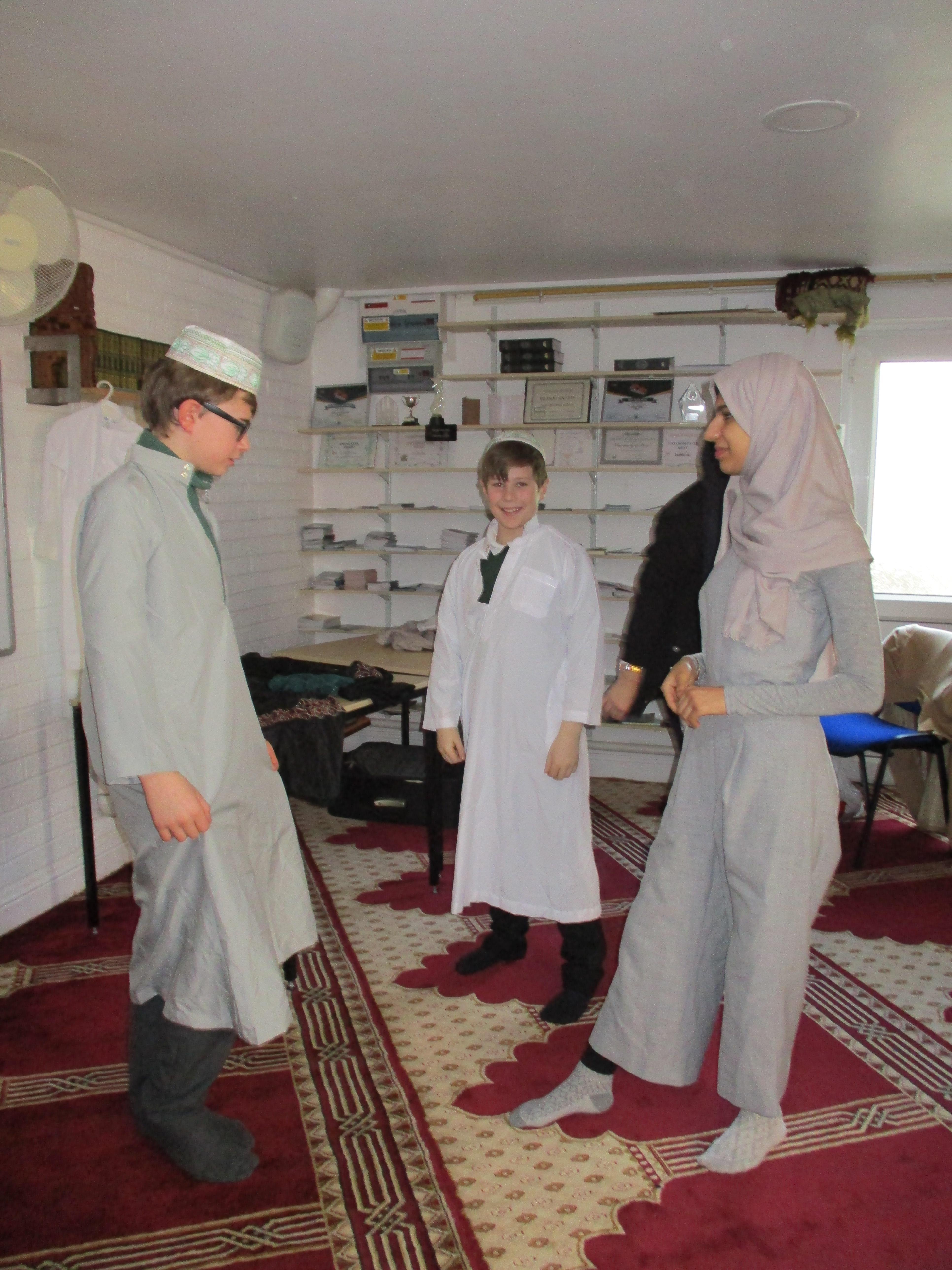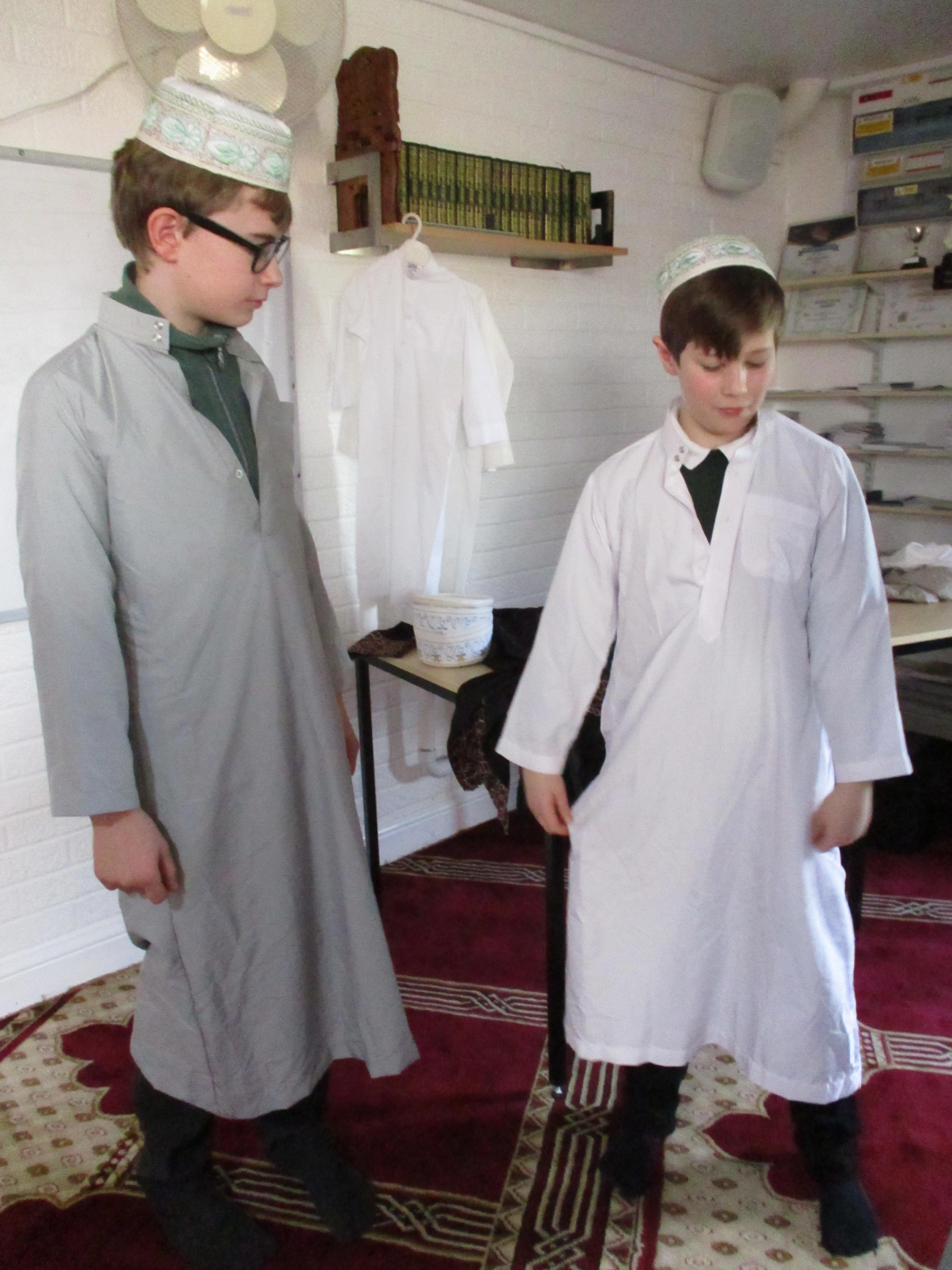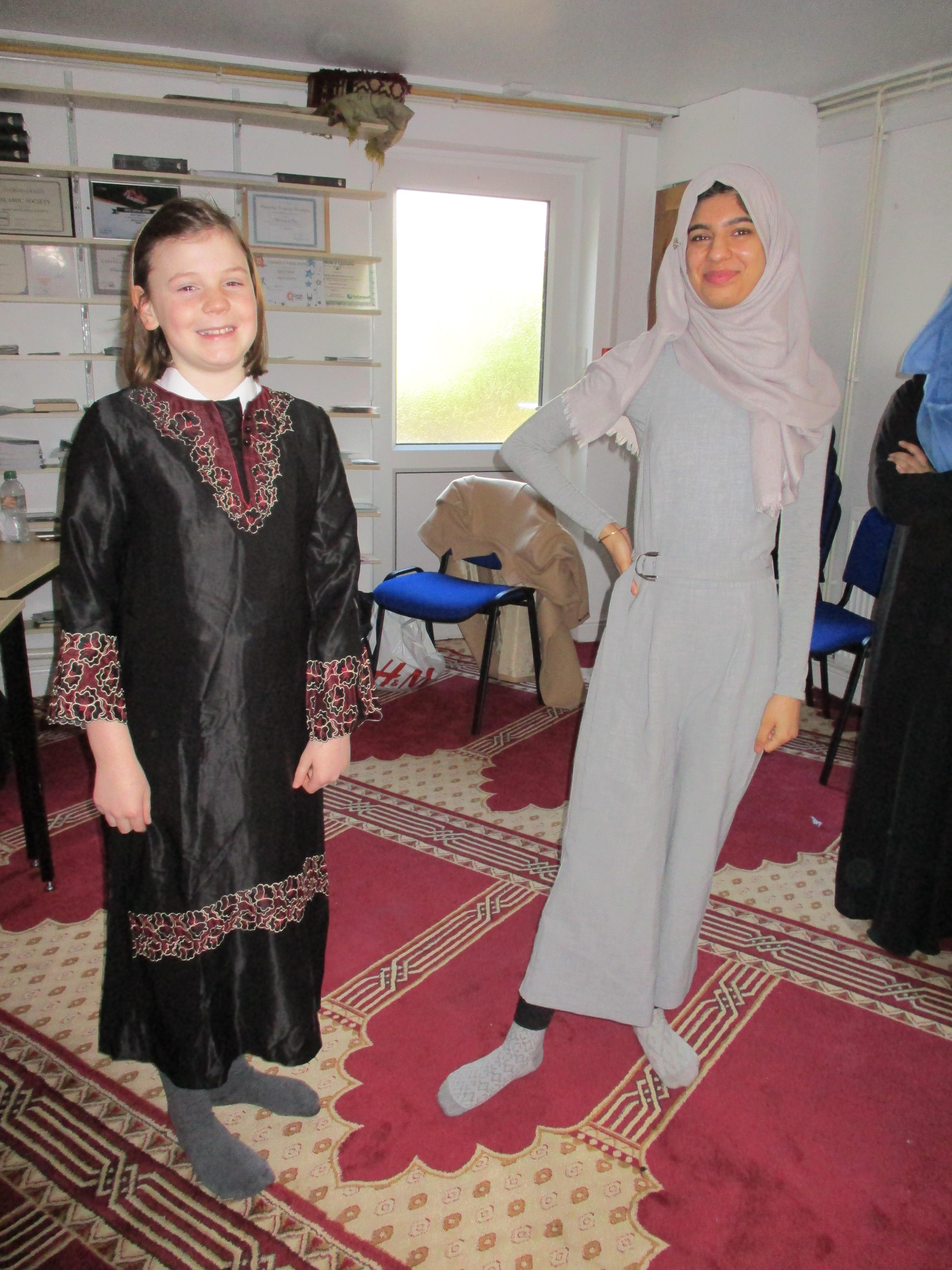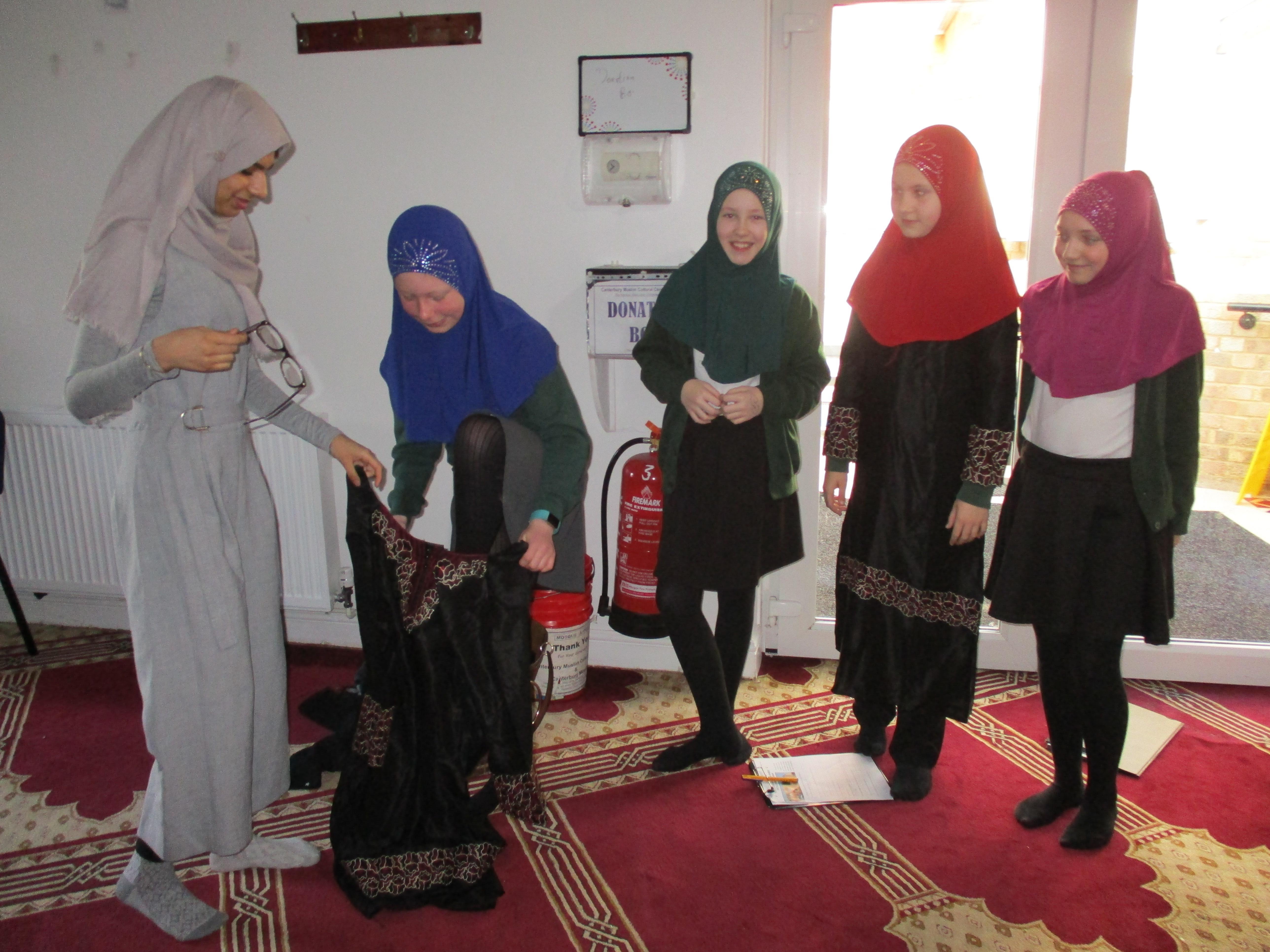 We enjoyed a really interesting trip to Canterbury mosque on Thursday morning, where we were greeted by Imam Ishan Khan and some other members of Canterbury's Muslim community. We learnt about the features of the mosque and what happens there and were taught how to write out names in Arabic (the language in which the Qur'an, the holy book of Islam, is written). We were also shown a fascinating film about Islamic inventions. Did you know that many scientific inventions were first suggested by Islamic scholars during the middle ages, including the camera, the clock, airplanes and the engine. After that, some of the ladies helped us to dress up in typical Islamic dress and they explained that it helps keep them cool as many Islamic countries are very hot. Before we returned to school, we were treated to drinks, biscuits and dates and had a chance to ask the Imam any questions we still had. We would like to pass on our thanks to Mrs Goldup, Ms Wilson and Mr Mowl for taking us to the mosque and bringing us back to school in time for lunch!