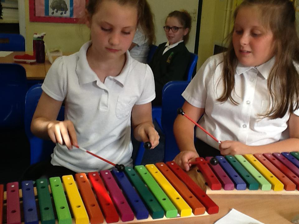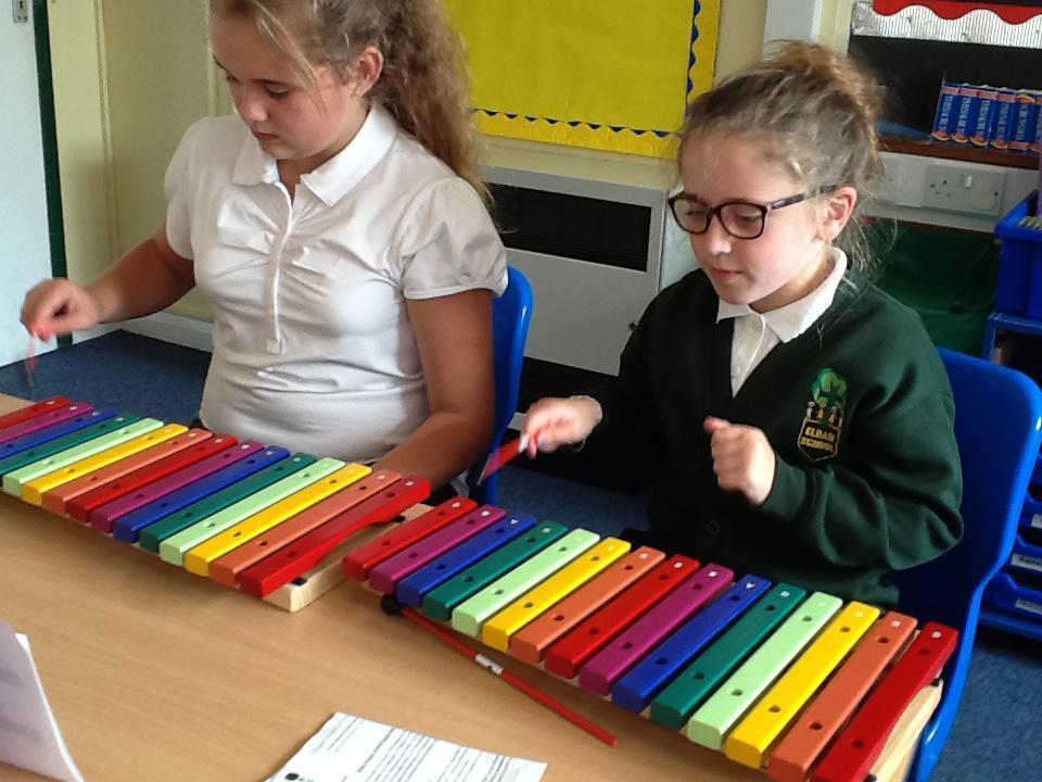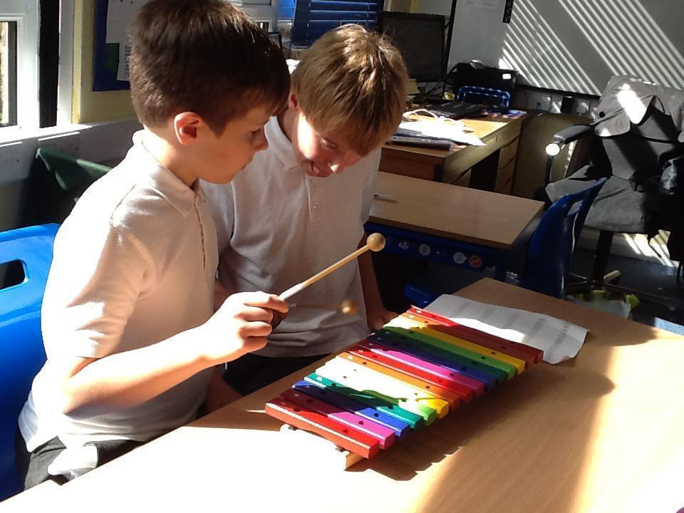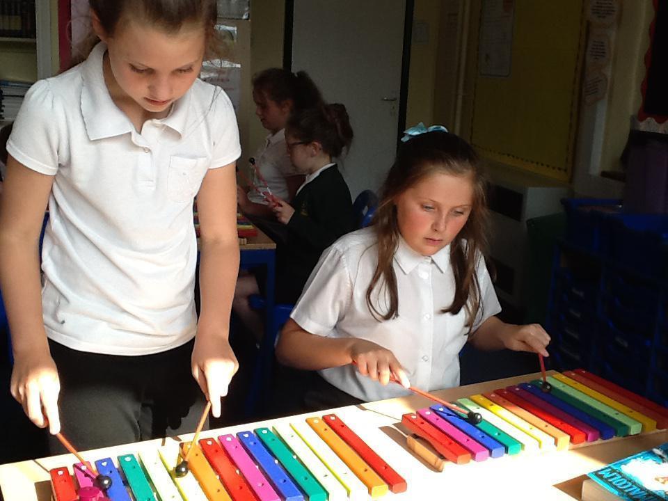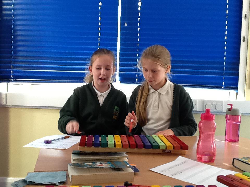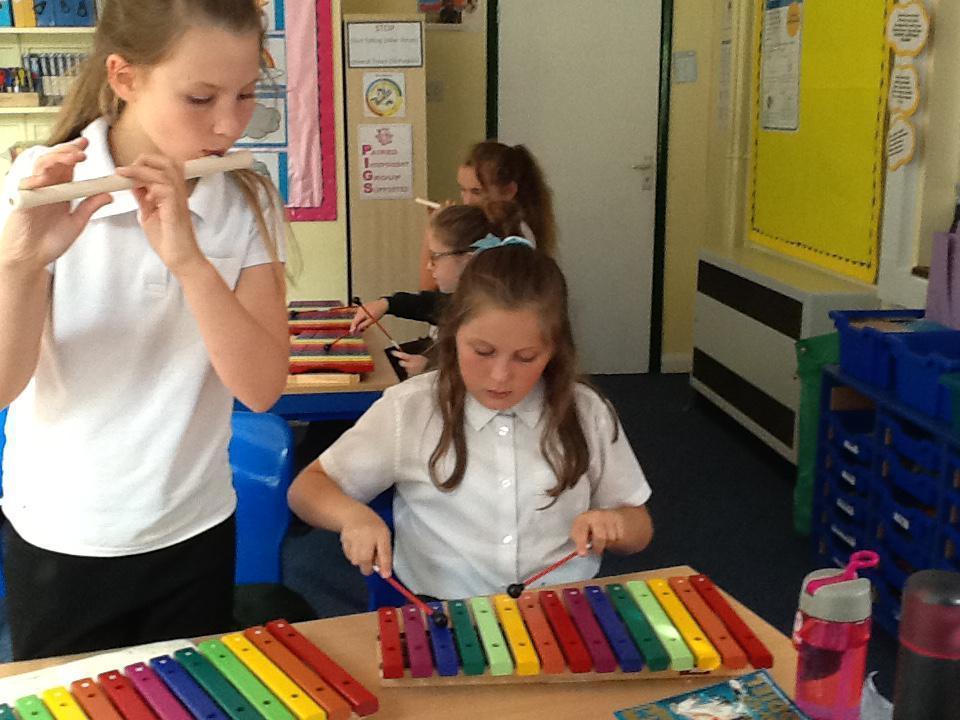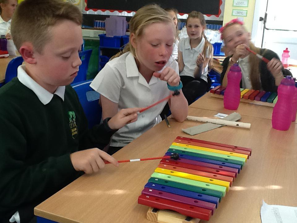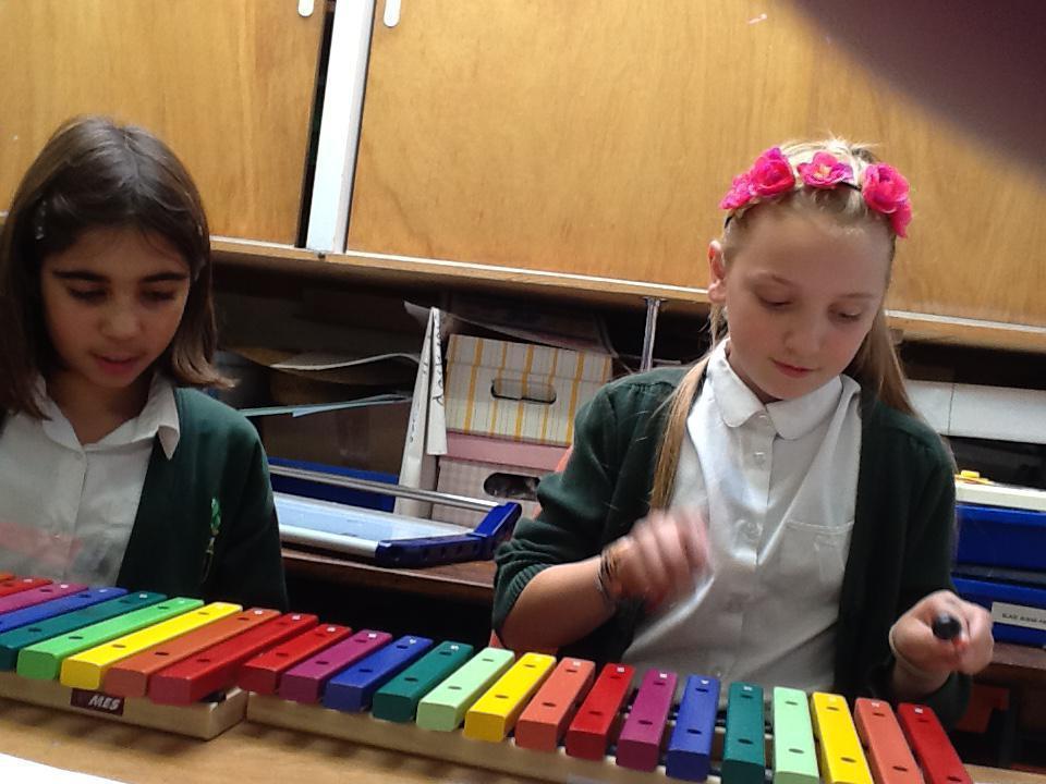 A really nice surprise this week was when Mrs Hickman (our music teacher) turned up with brand new Glockenspiels for us to play. We were very keen to start playing, but had to wait patiently until Mrs Hickman had explained what we needed to do first. We worked in pairs to compose our own music, which was great fun. Some pictures of us doing this can be seen below.