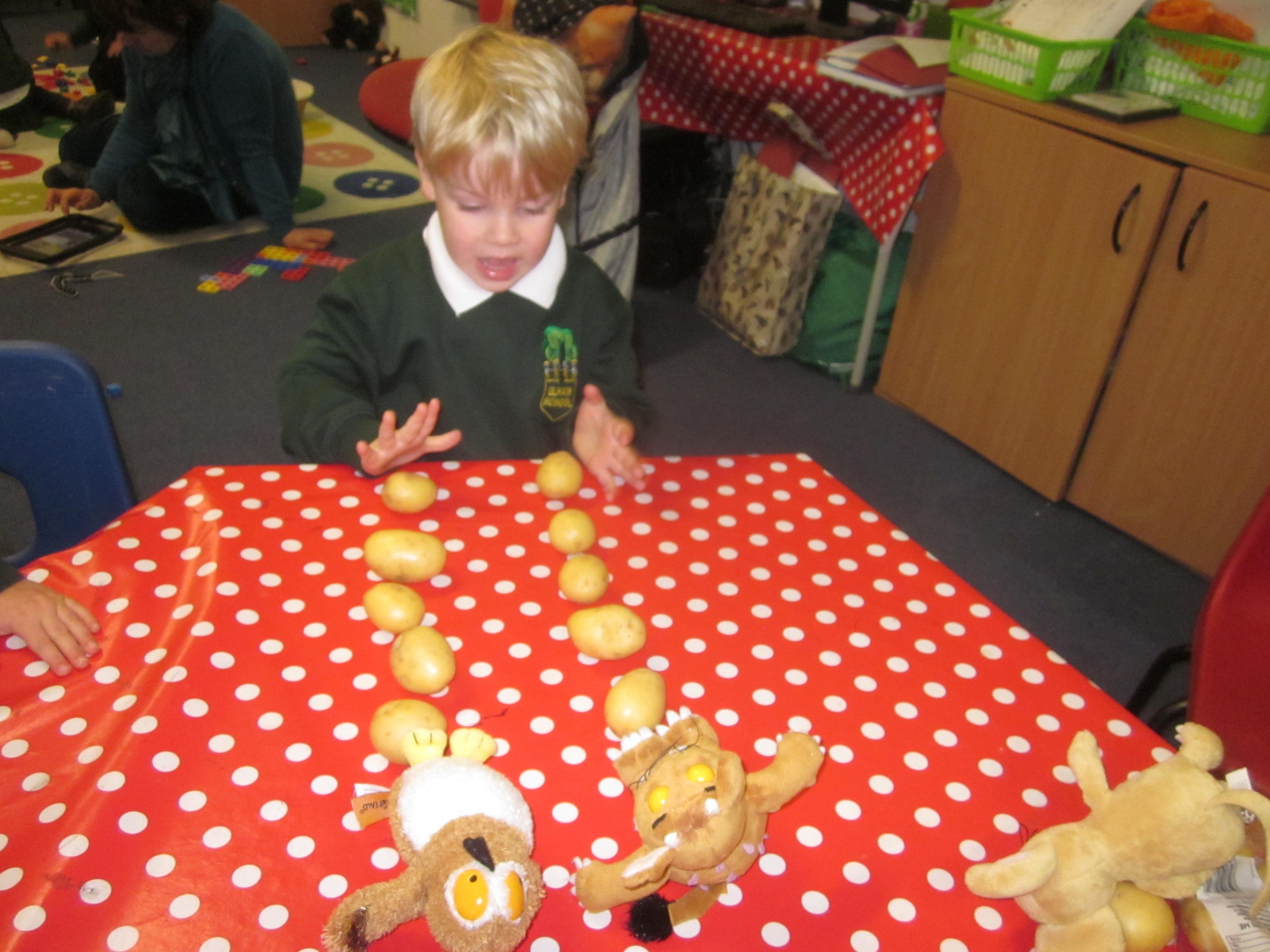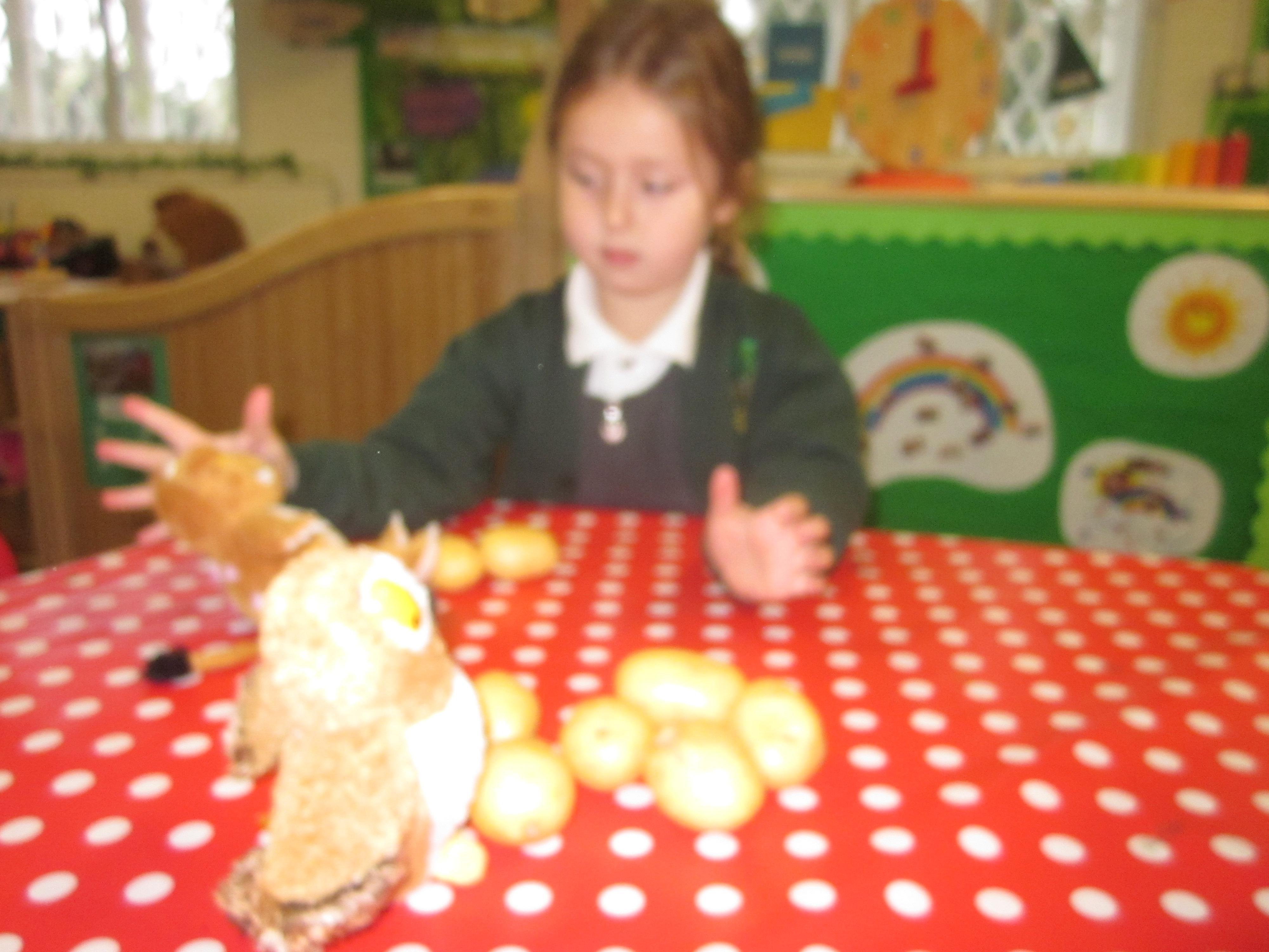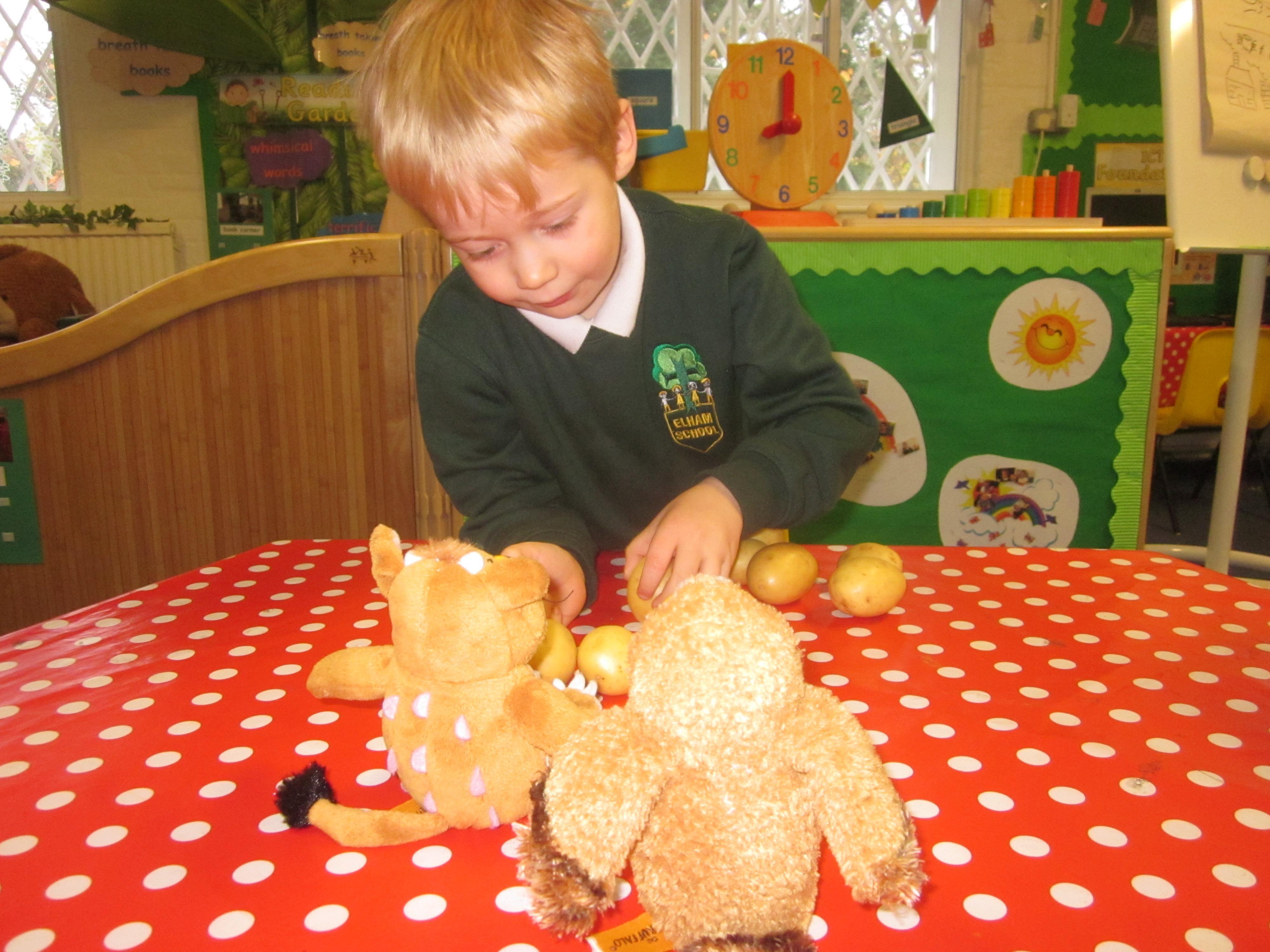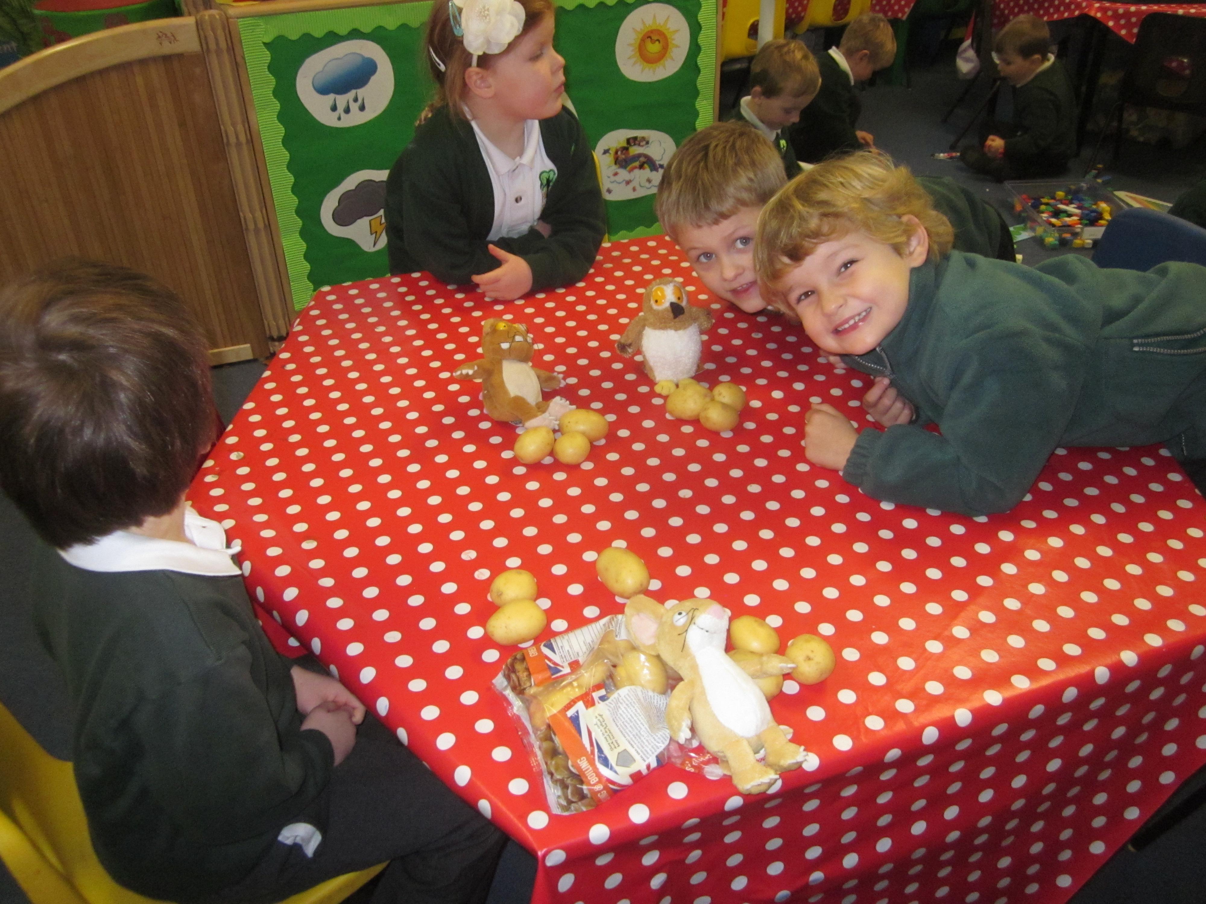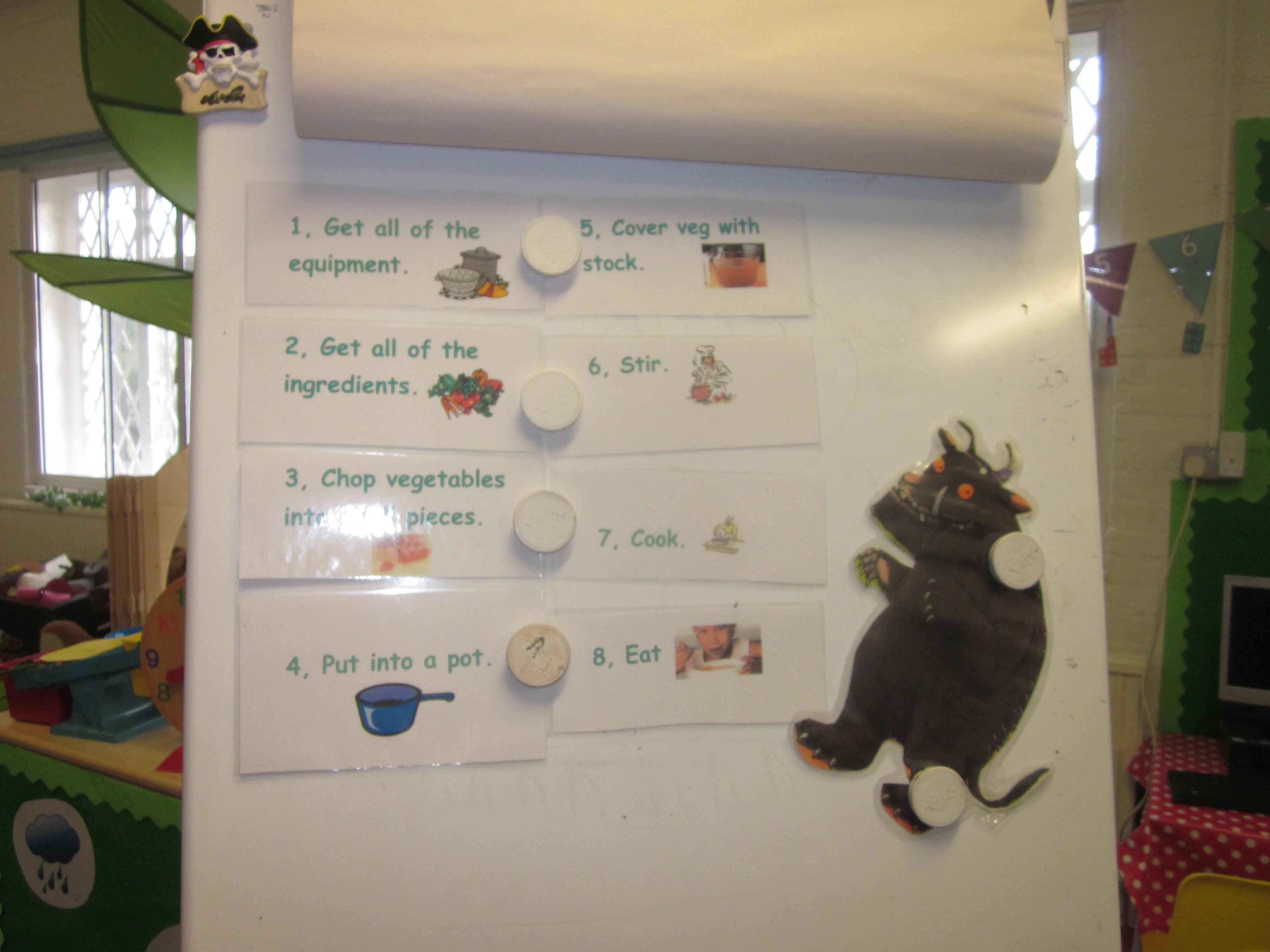 This week we have probably had too much fun! We have been looking for Gruffalo’s in the school grounds. We decided that to stop the Gruffalo wanting to eat the mouse we would make him some Gruffalo soup. For our Maths we shared out the ingredients we needed, and for our English we followed instructions to make the soup.
