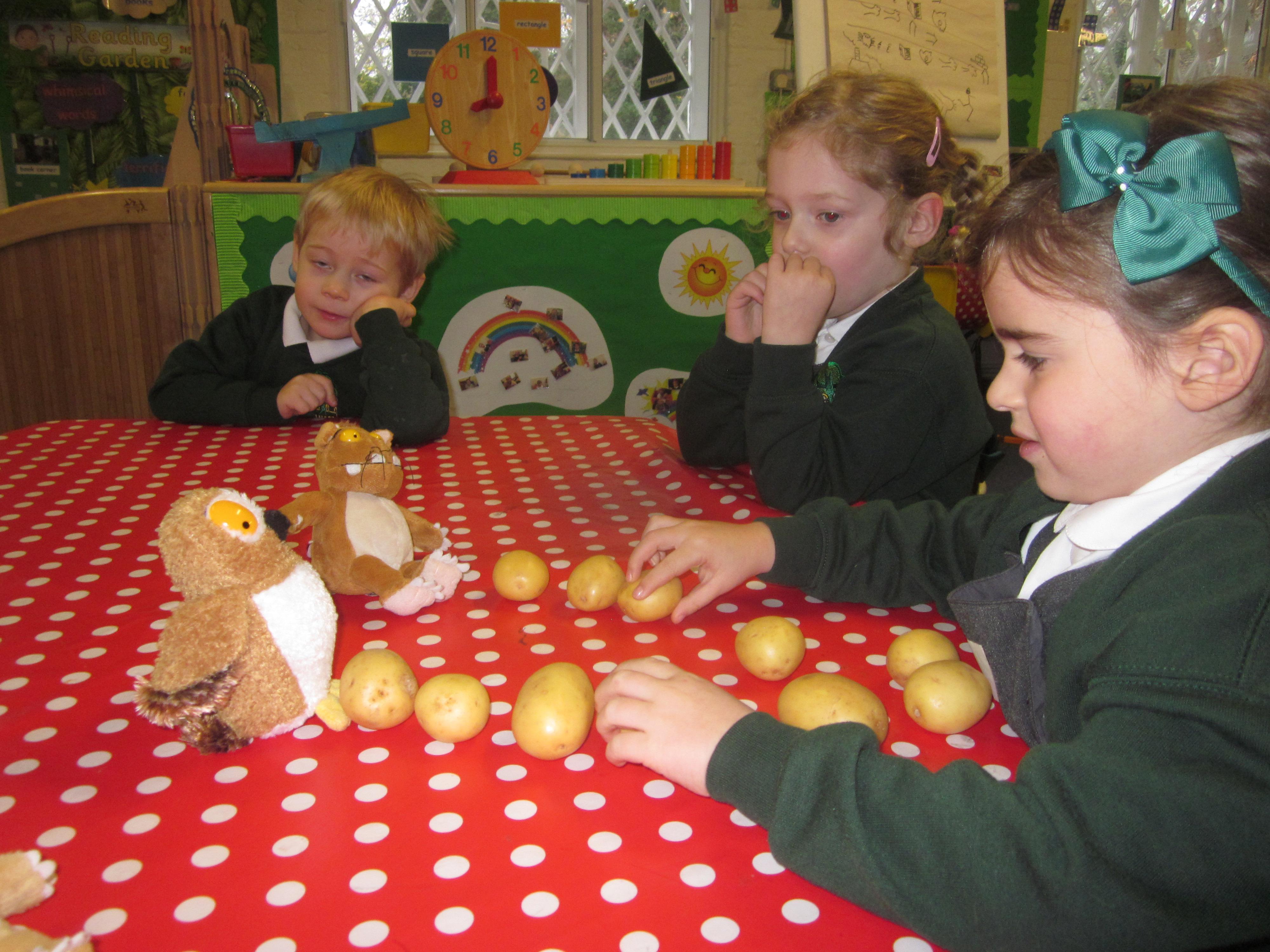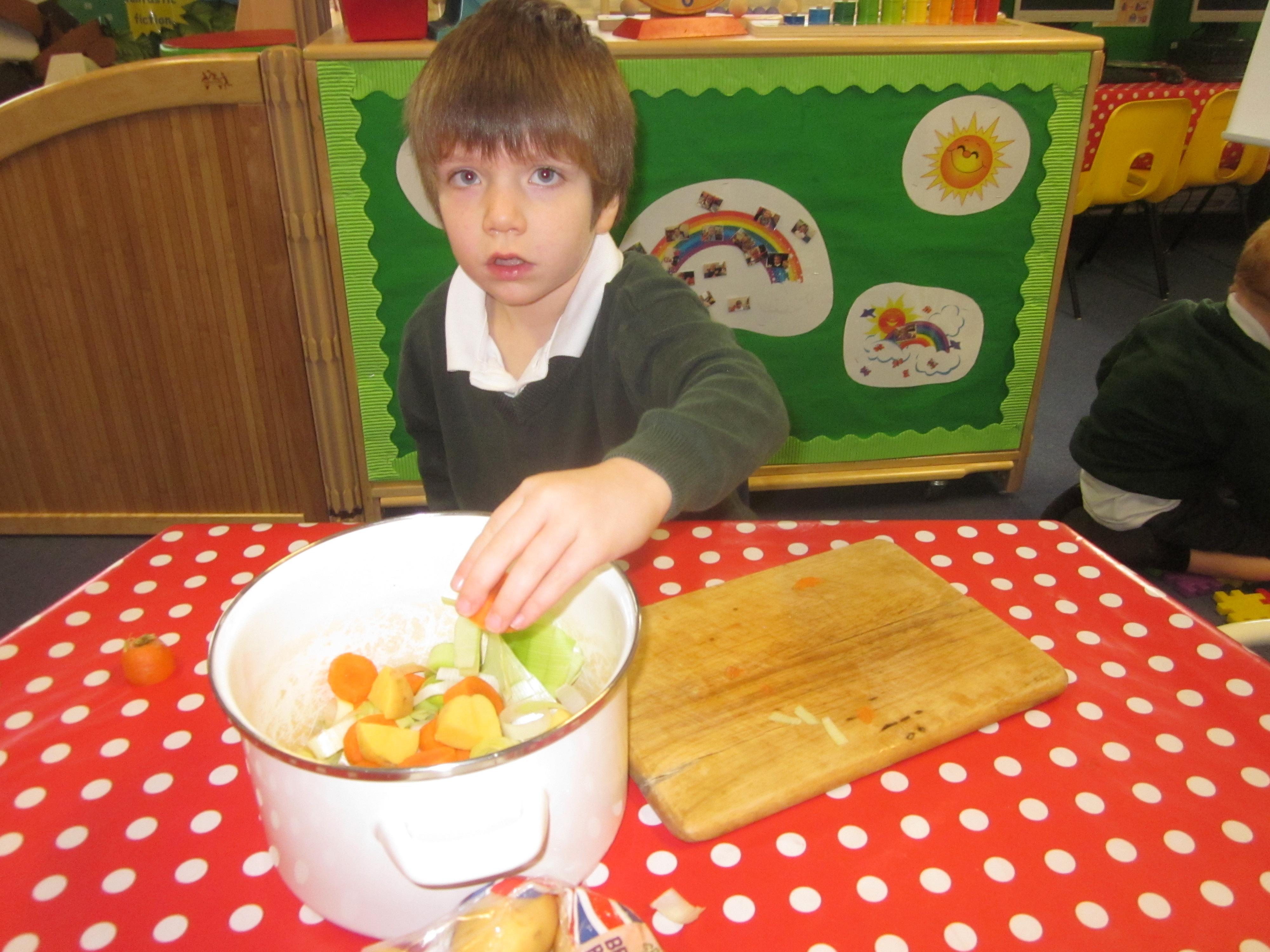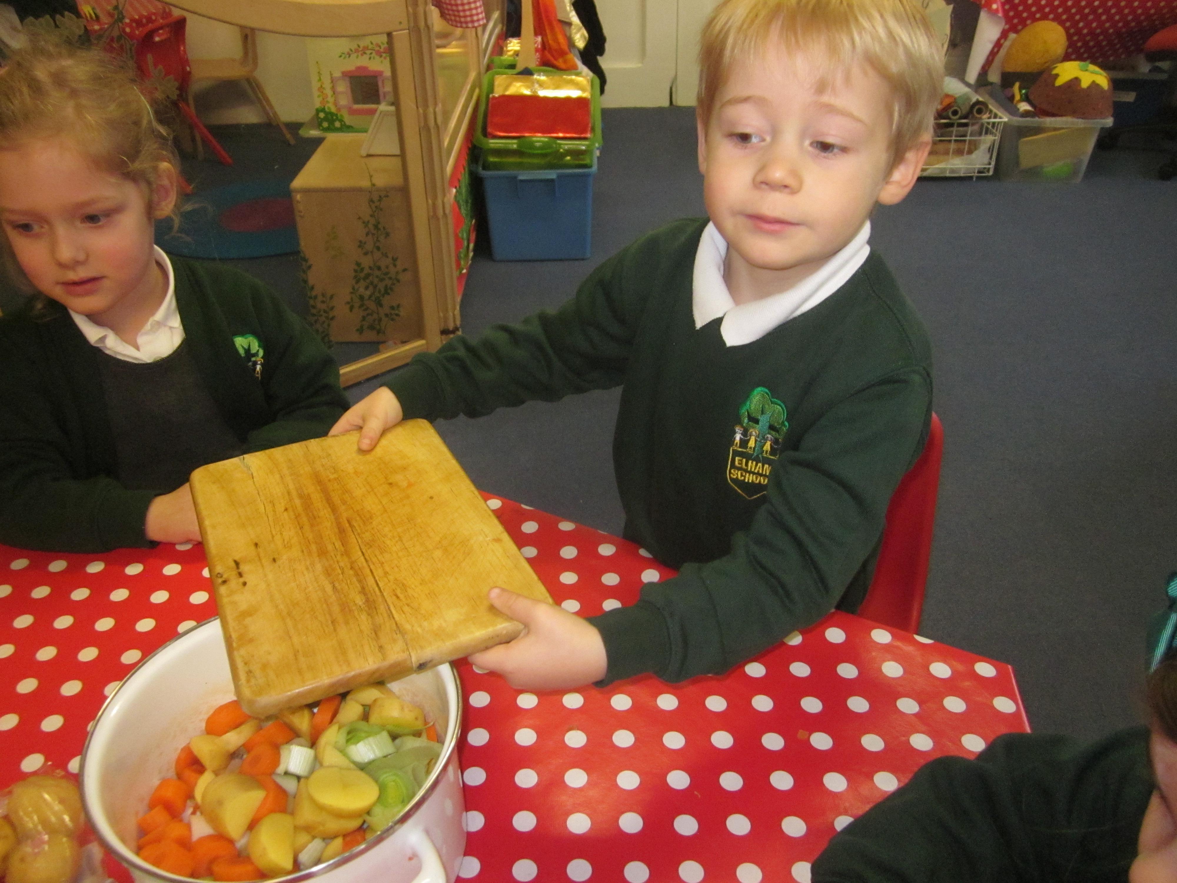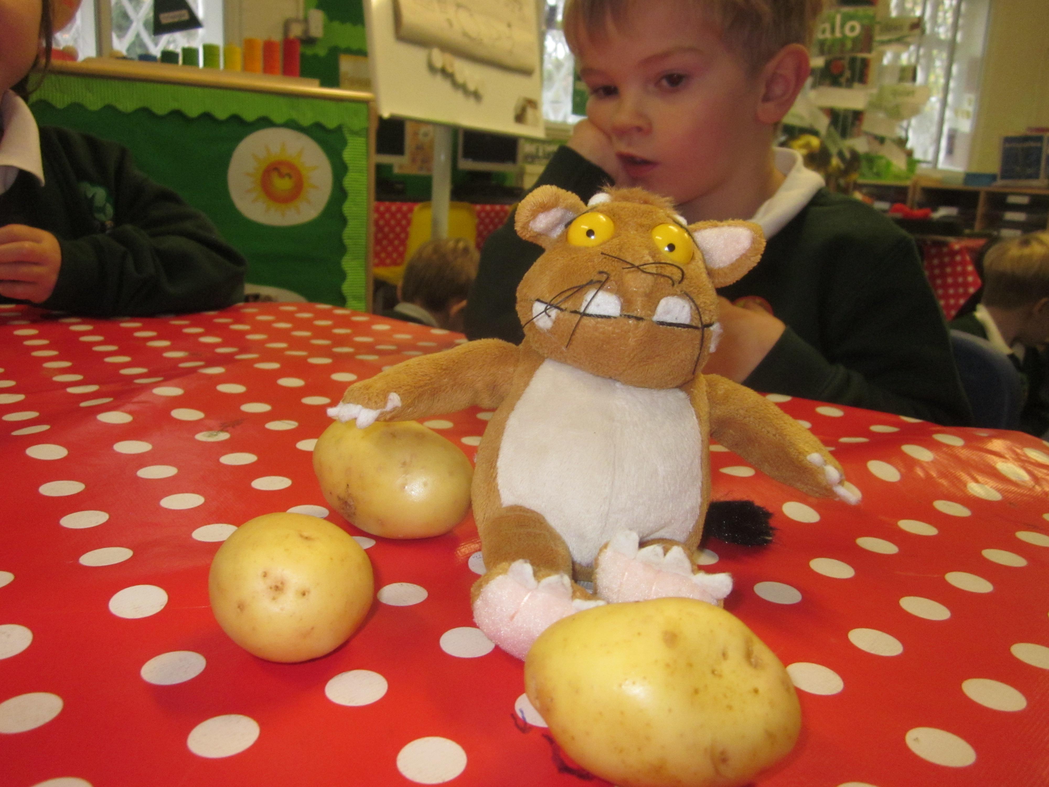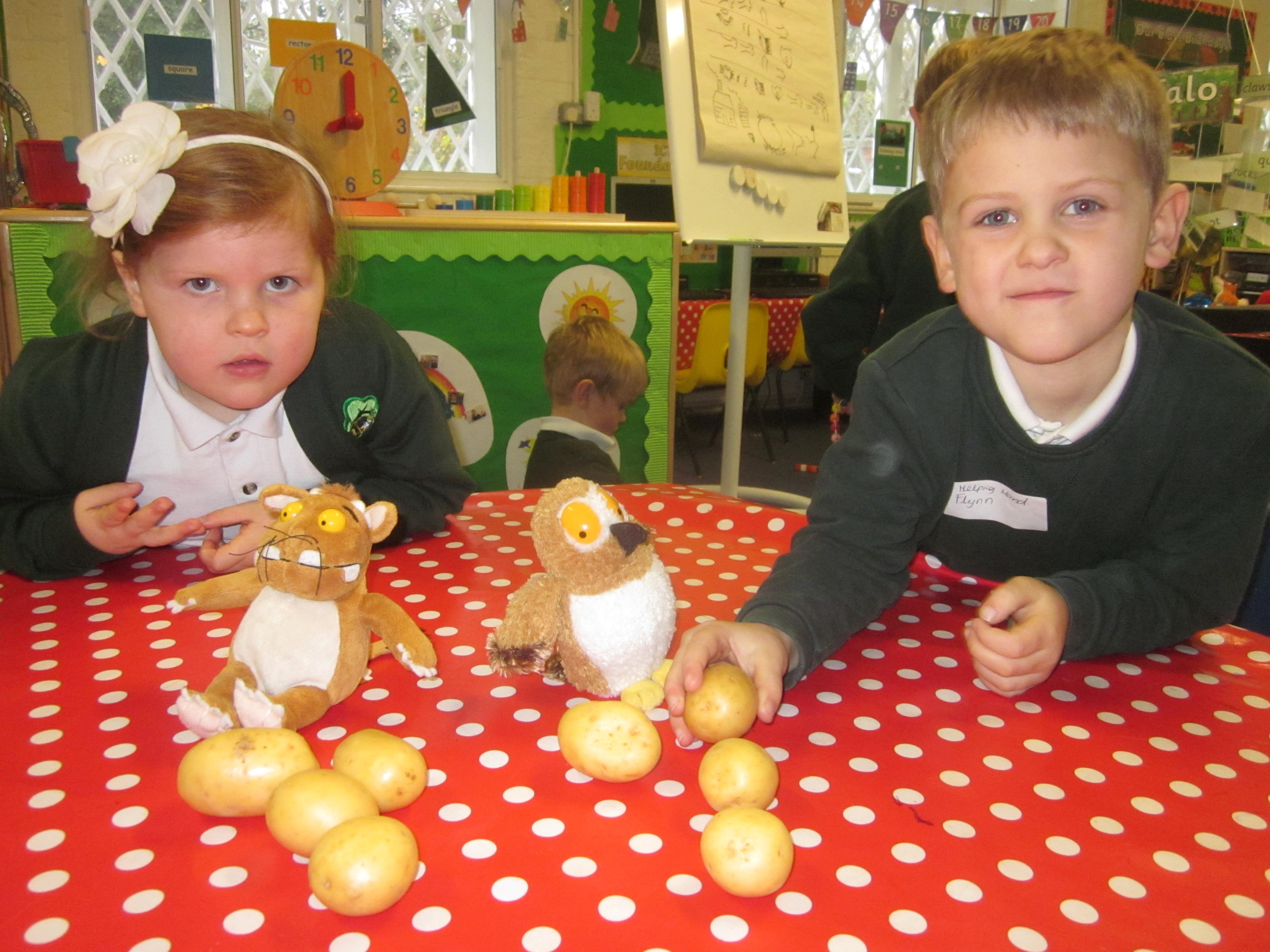 This week we have probably had too much fun! We have been looking for Gruffalo’s in the school grounds. We decided that to stop the Gruffalo wanting to eat the mouse we would make him some Gruffalo soup. For our Maths we shared out the ingredients we needed, and for our English we followed instructions to make the soup.