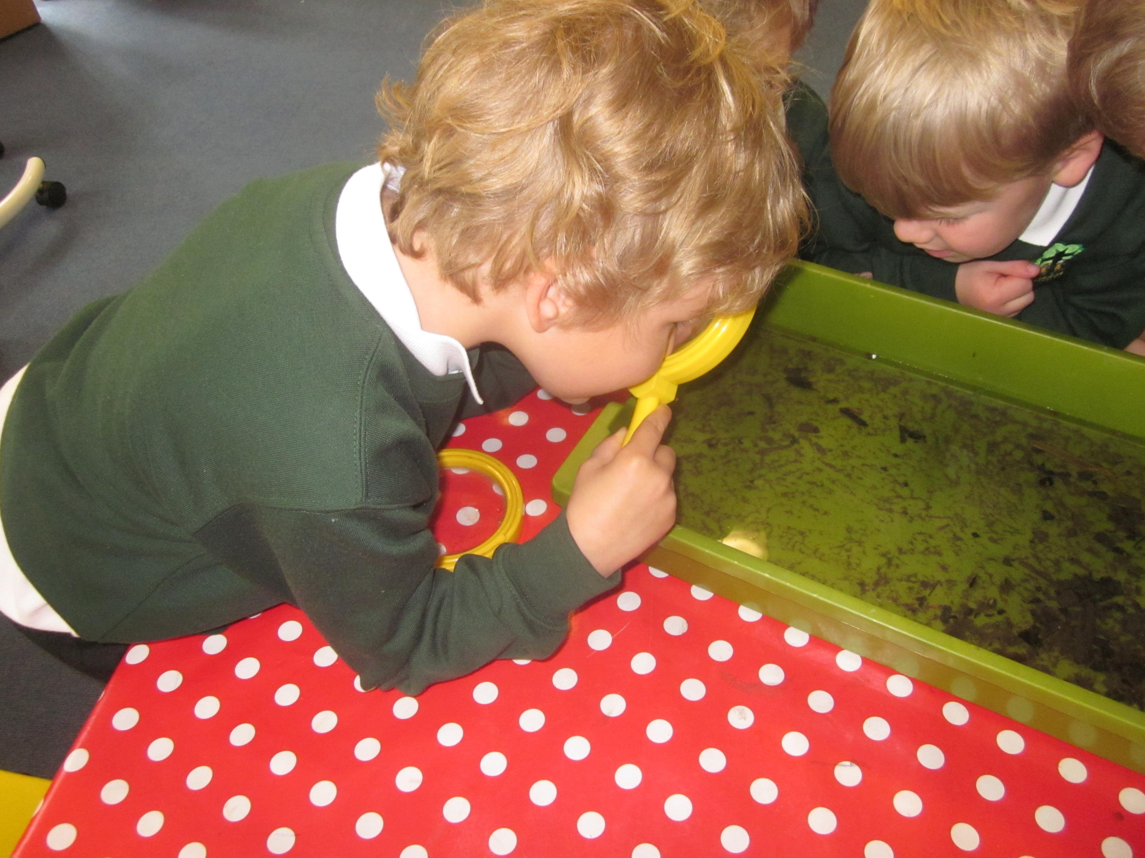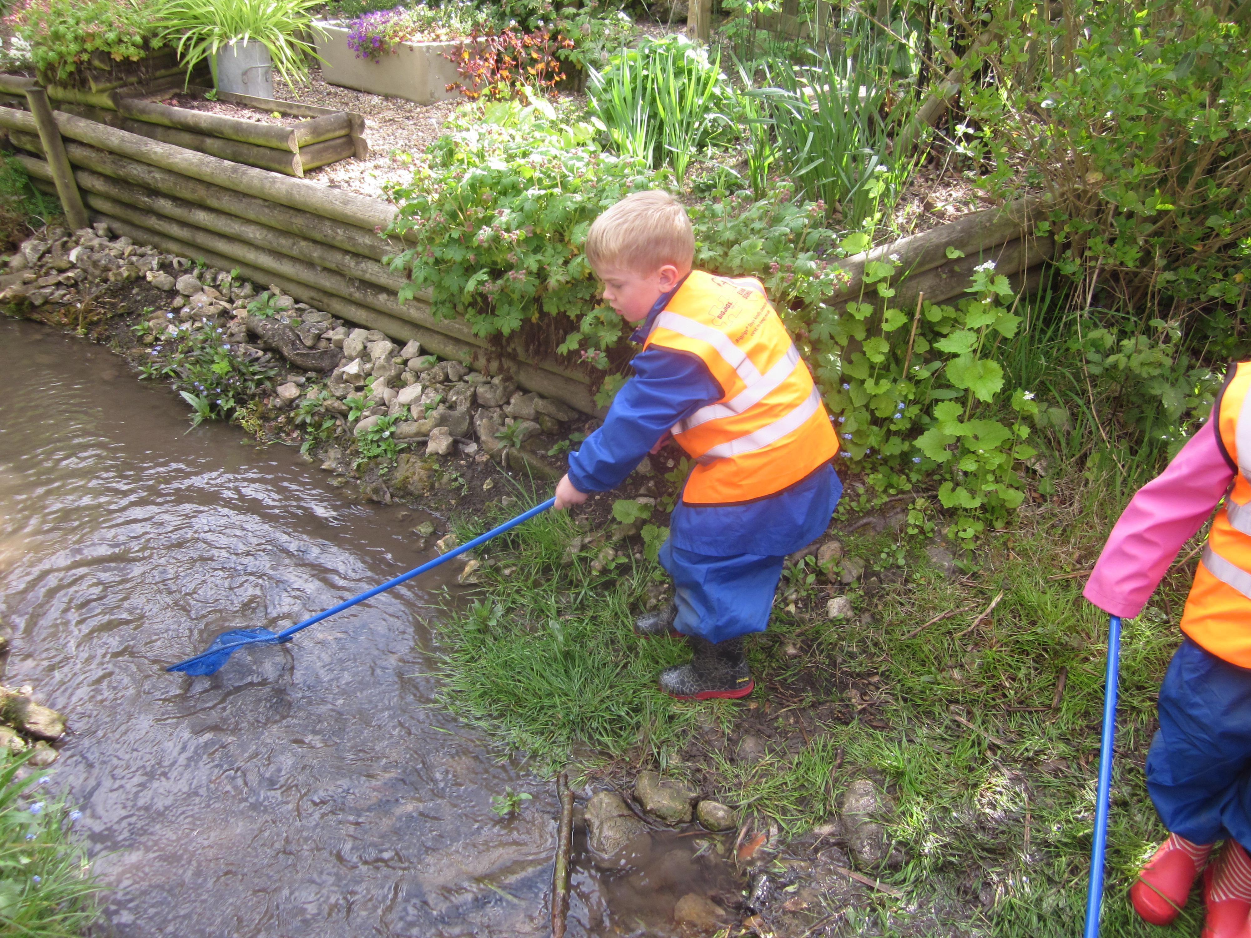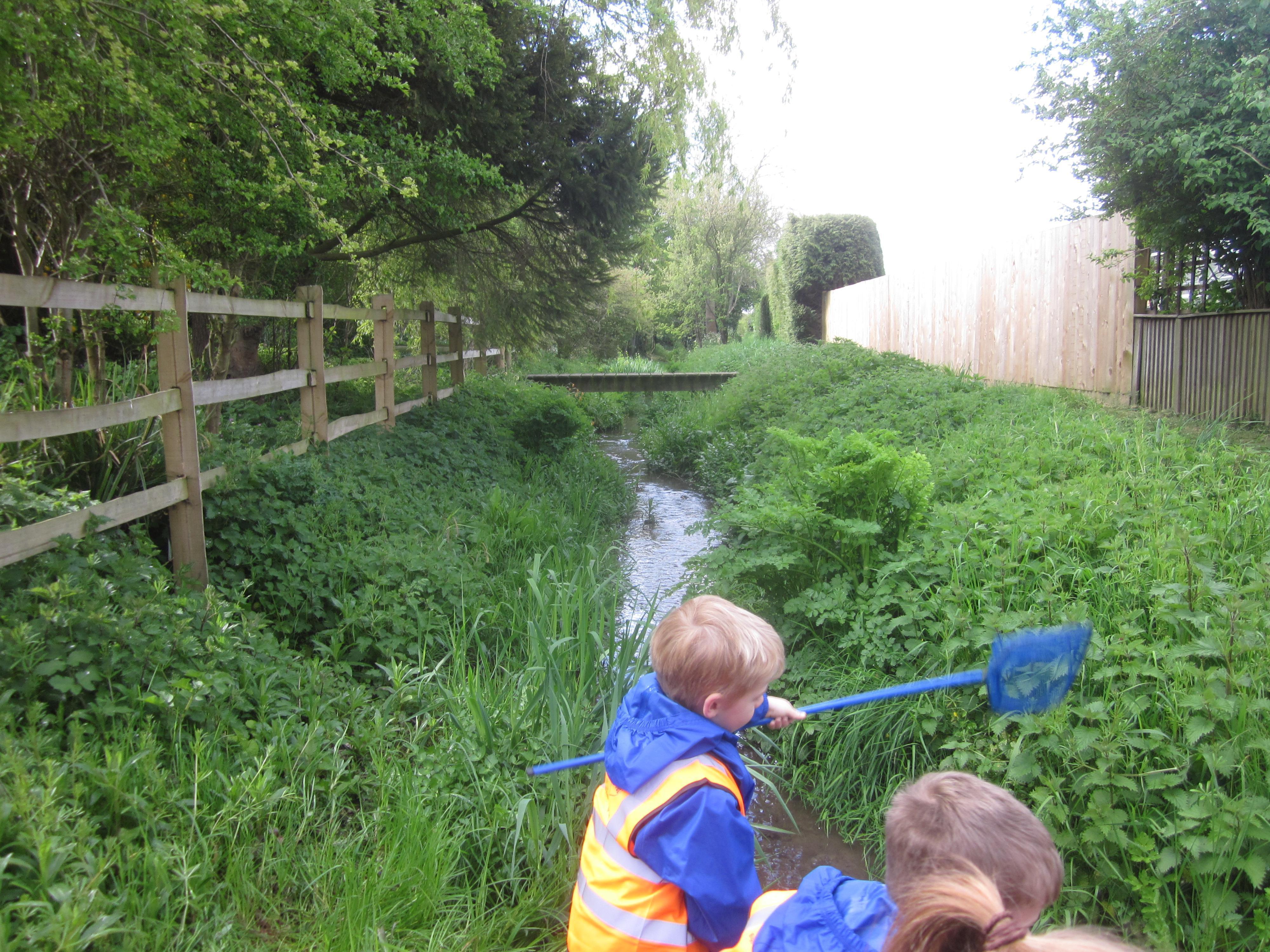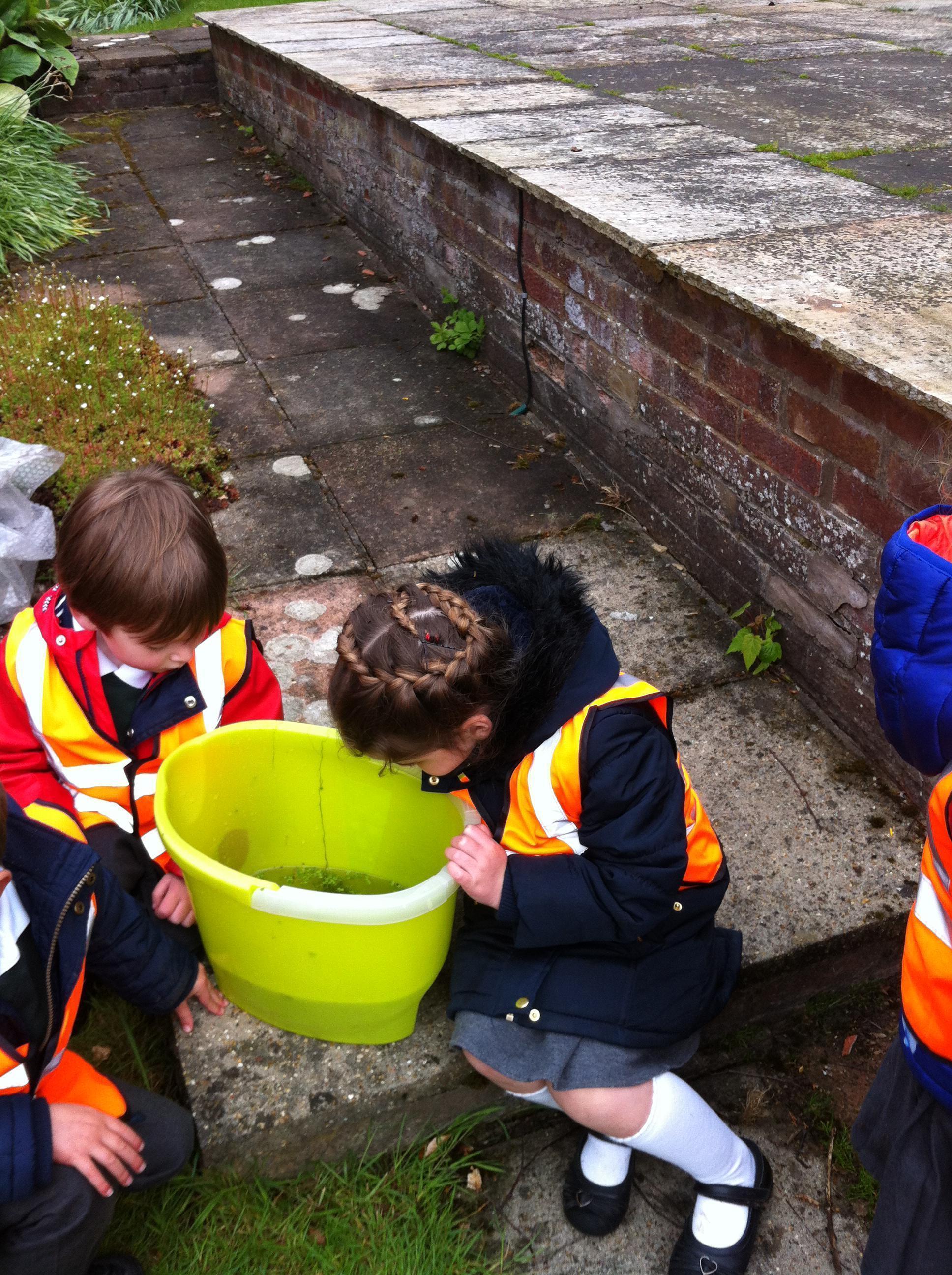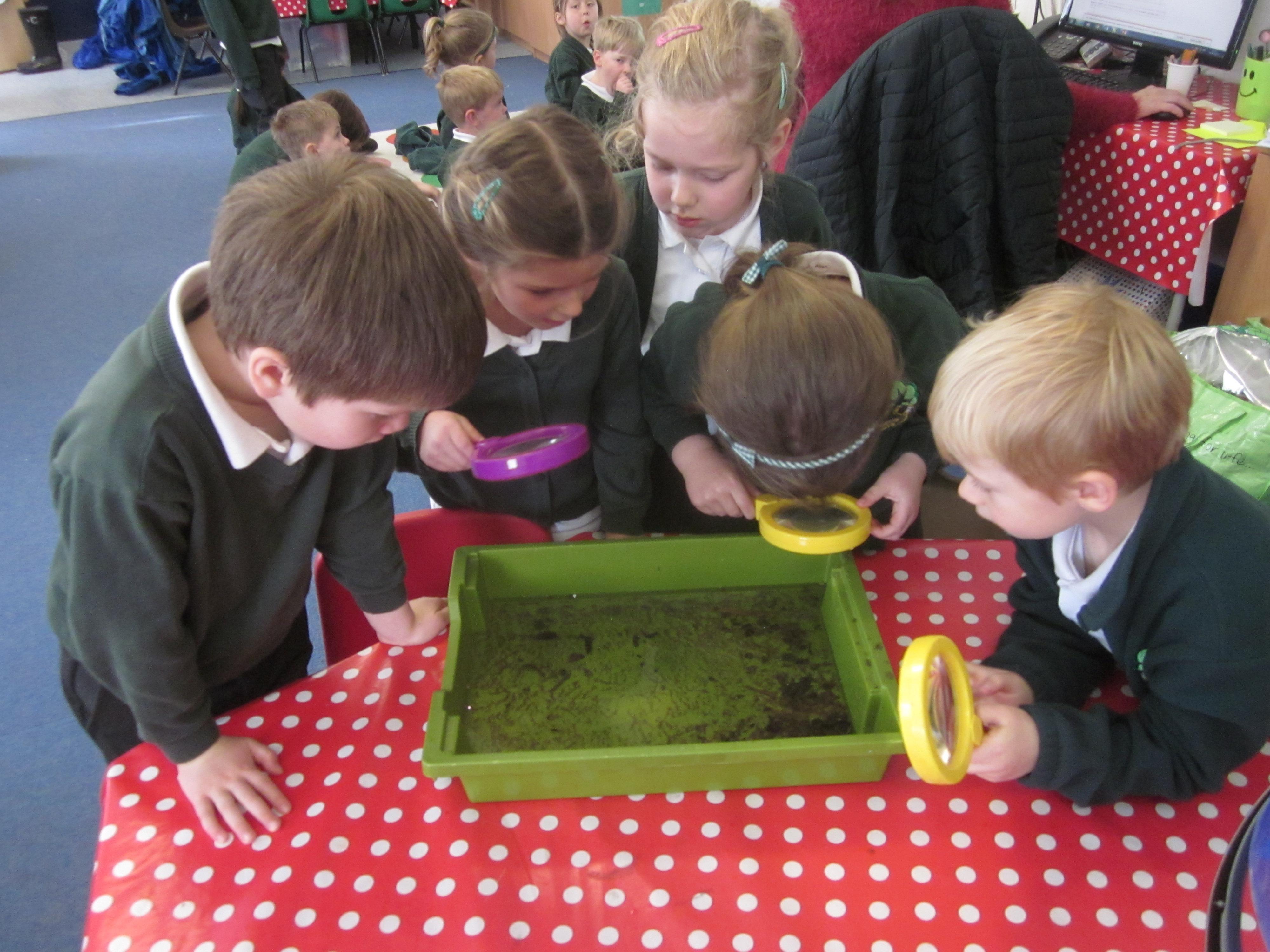 We also went on an expedition to the Nailbourne, a stream which runs along the Elham Valley. We saw where frogs might like to live, and did some fishing with our nets. We didn’t find any tadpoles but we did find some shrimps. We used magnifying glasses to look closely at them.