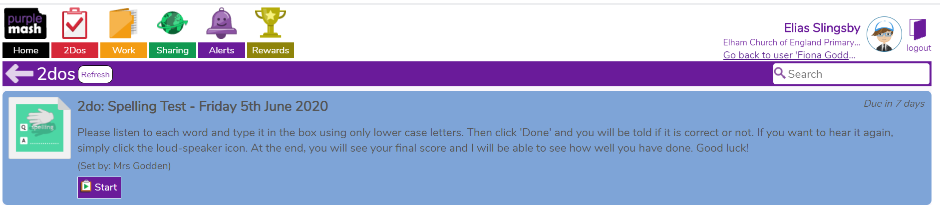 To access this week's test, please log in to Purple Mash at https://www.purplemash.com/sch/elham. Click on 2Dos at the top of the page and you should see this week's spelling test at the top - there is a screenshot below to show you what it looks like.