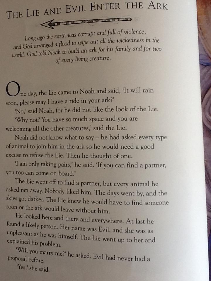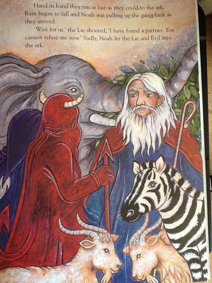 Today you are going to read (or listen to) the Jewish version of the story. It is called The Lie and Evil enter the Ark. When you have finished, answer the questions below. Then draw a picture of the Lie and Evil!