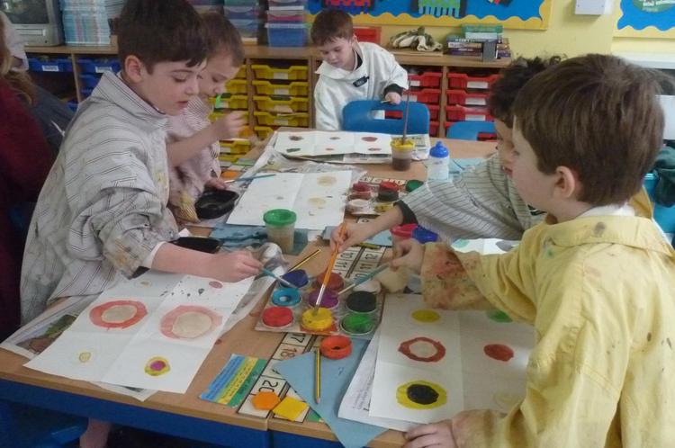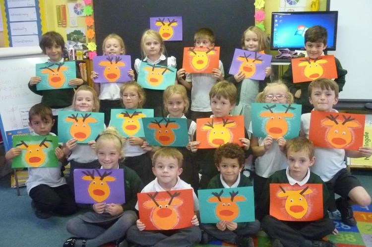 'We made pictures for our Harvest assembly, by sponge printing bright colours onto black paper.'